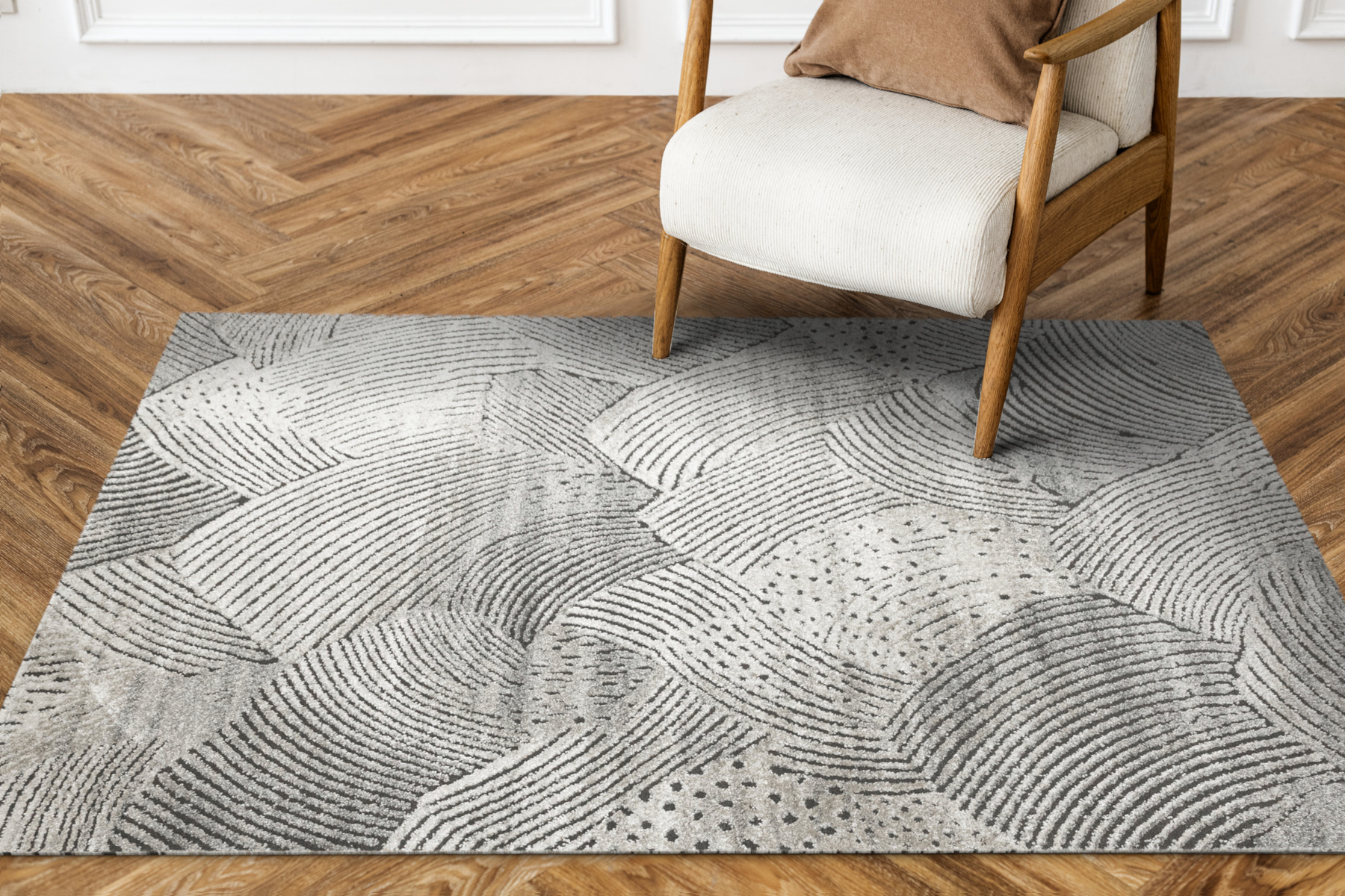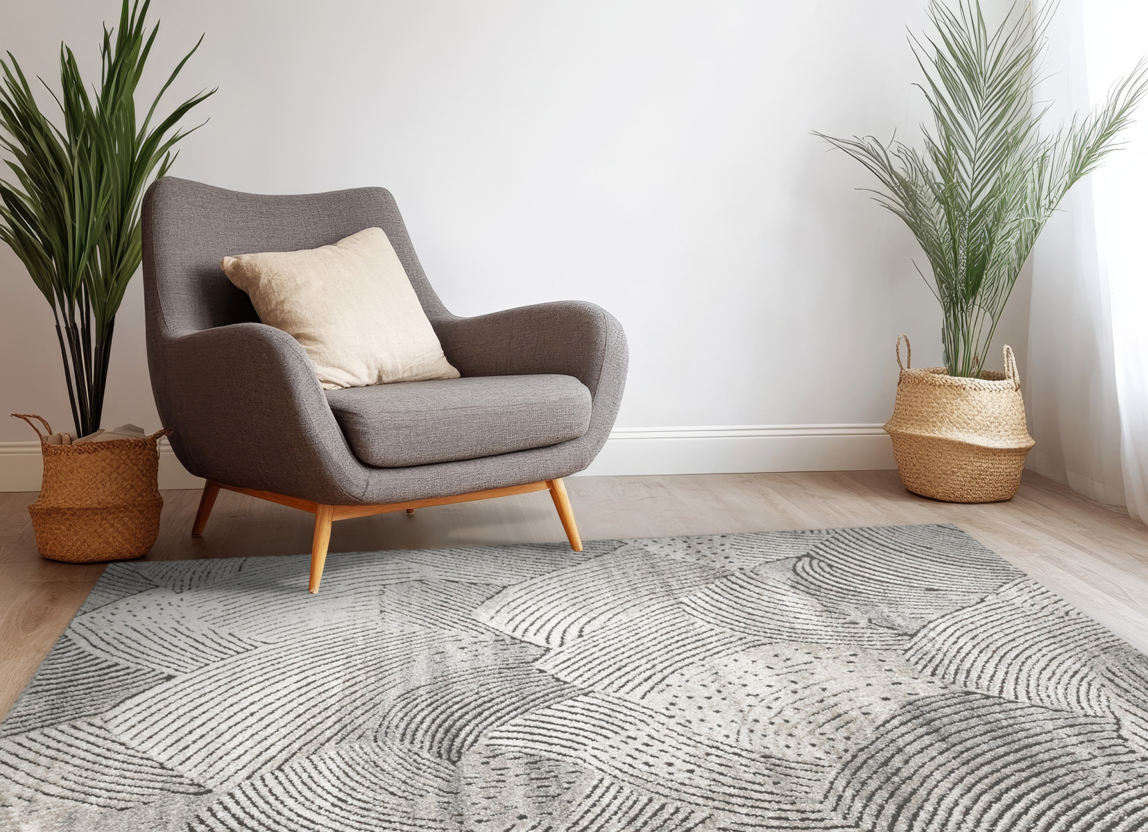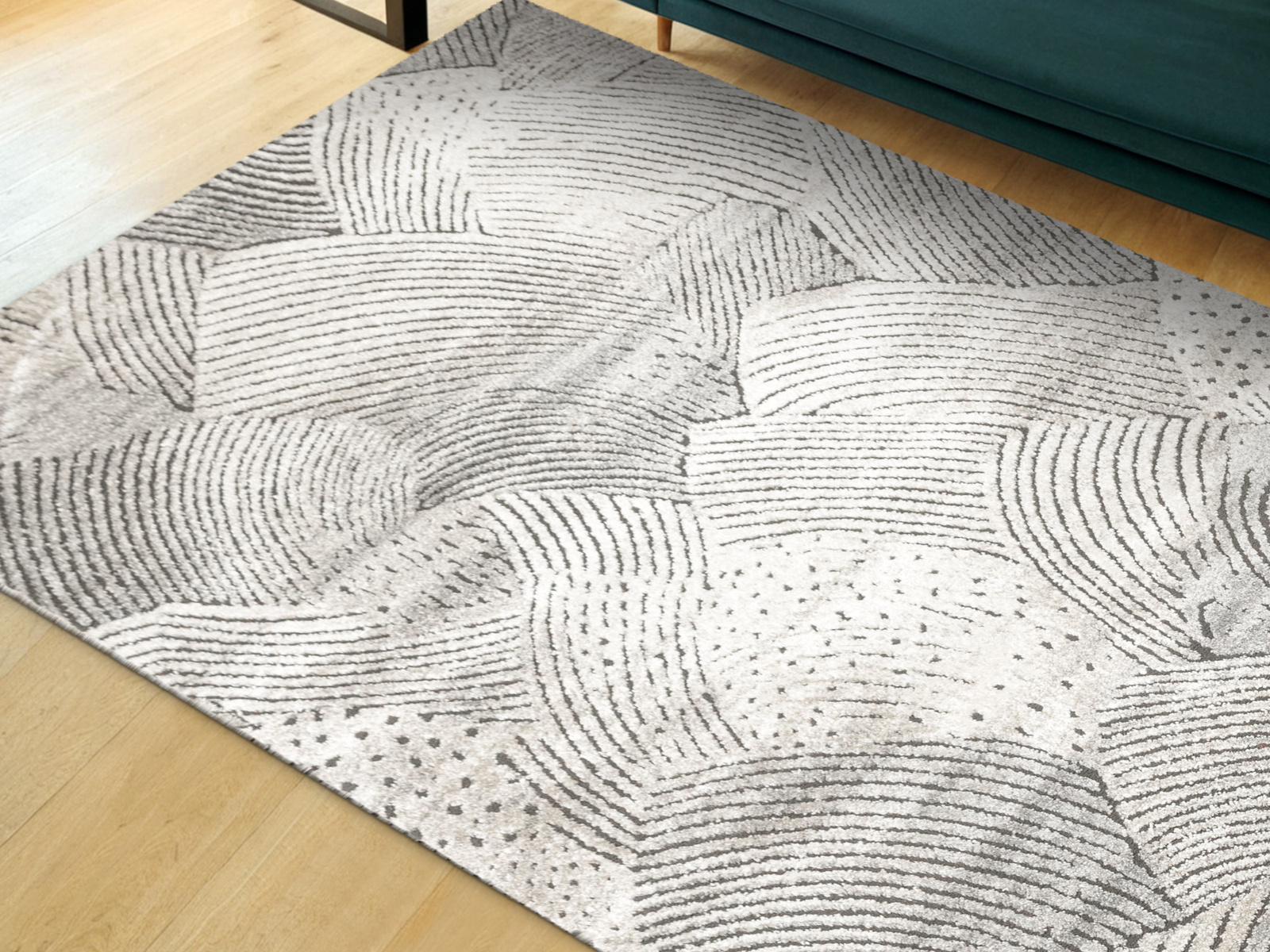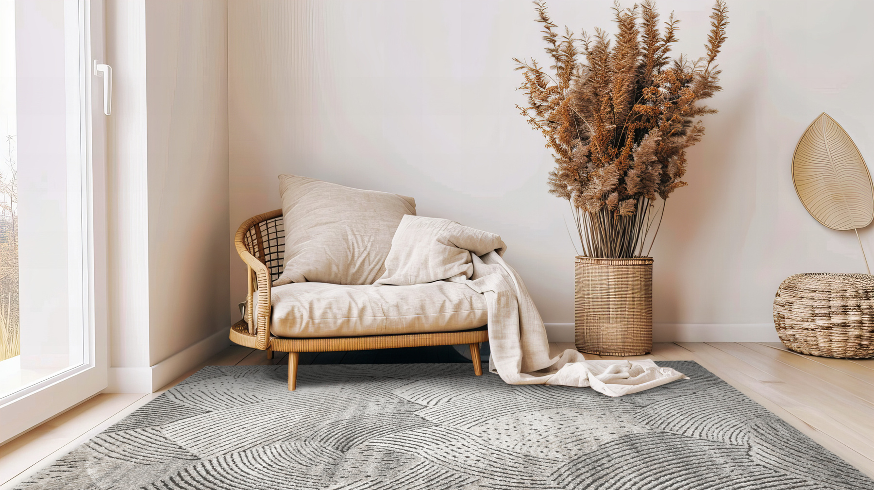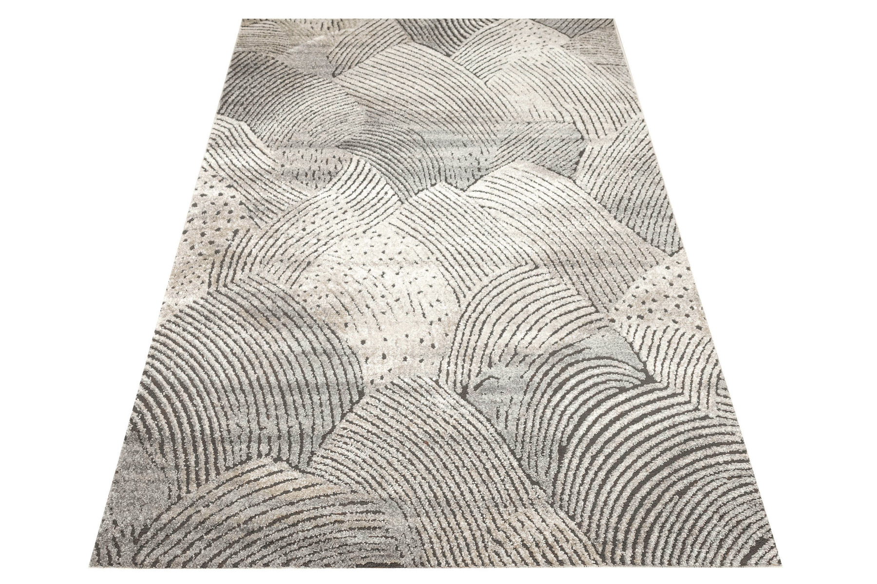 - Miękki i przyjemny w dotyku dywan Matara o dwupoziomowym runie ozdobionym inspirowanym naturą wzorem w kremach, beżach, szarościach i w czerni. Spód dywanu wykończony jutą.