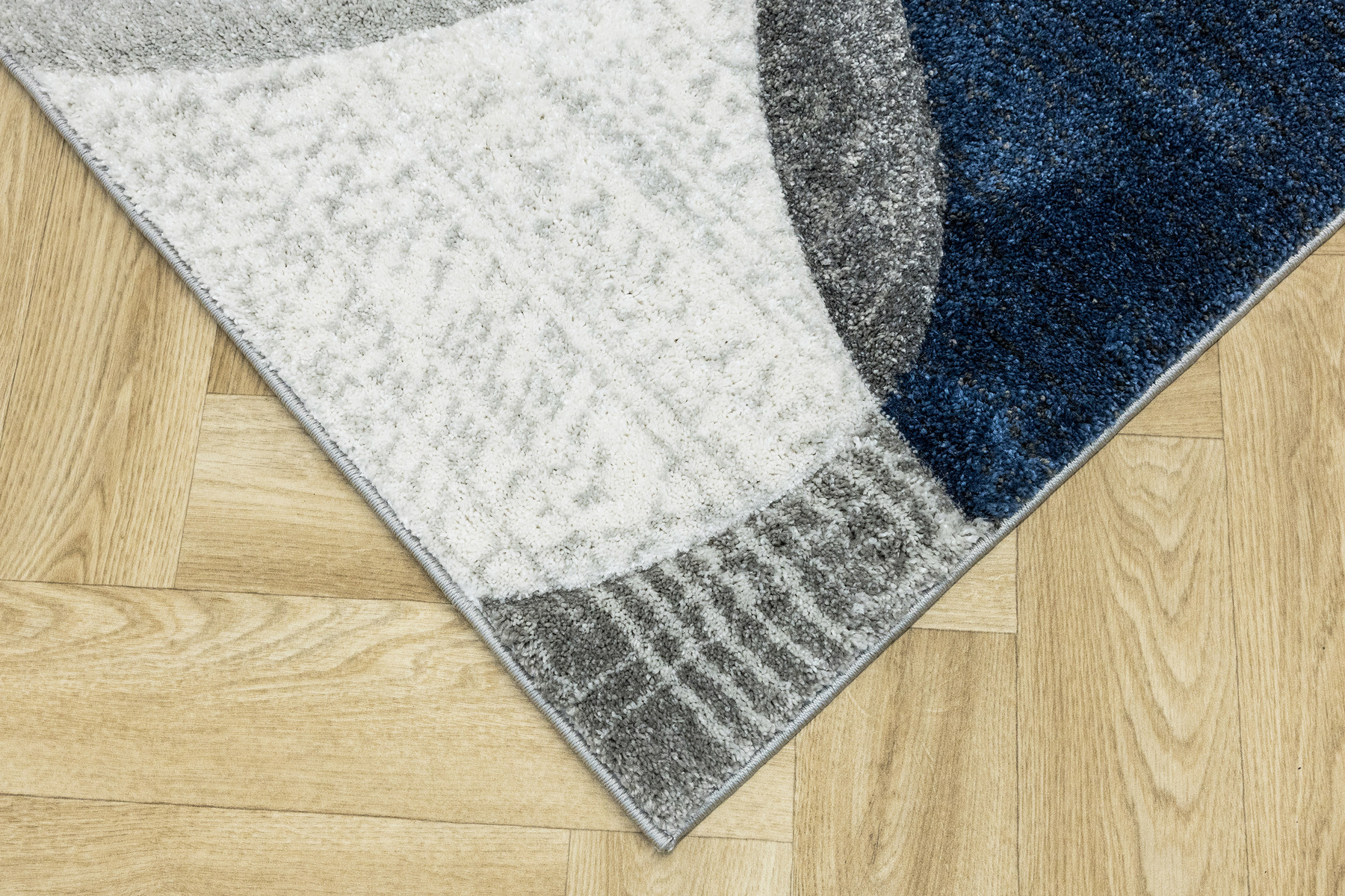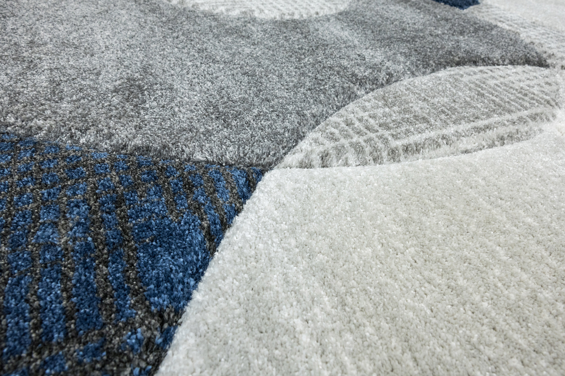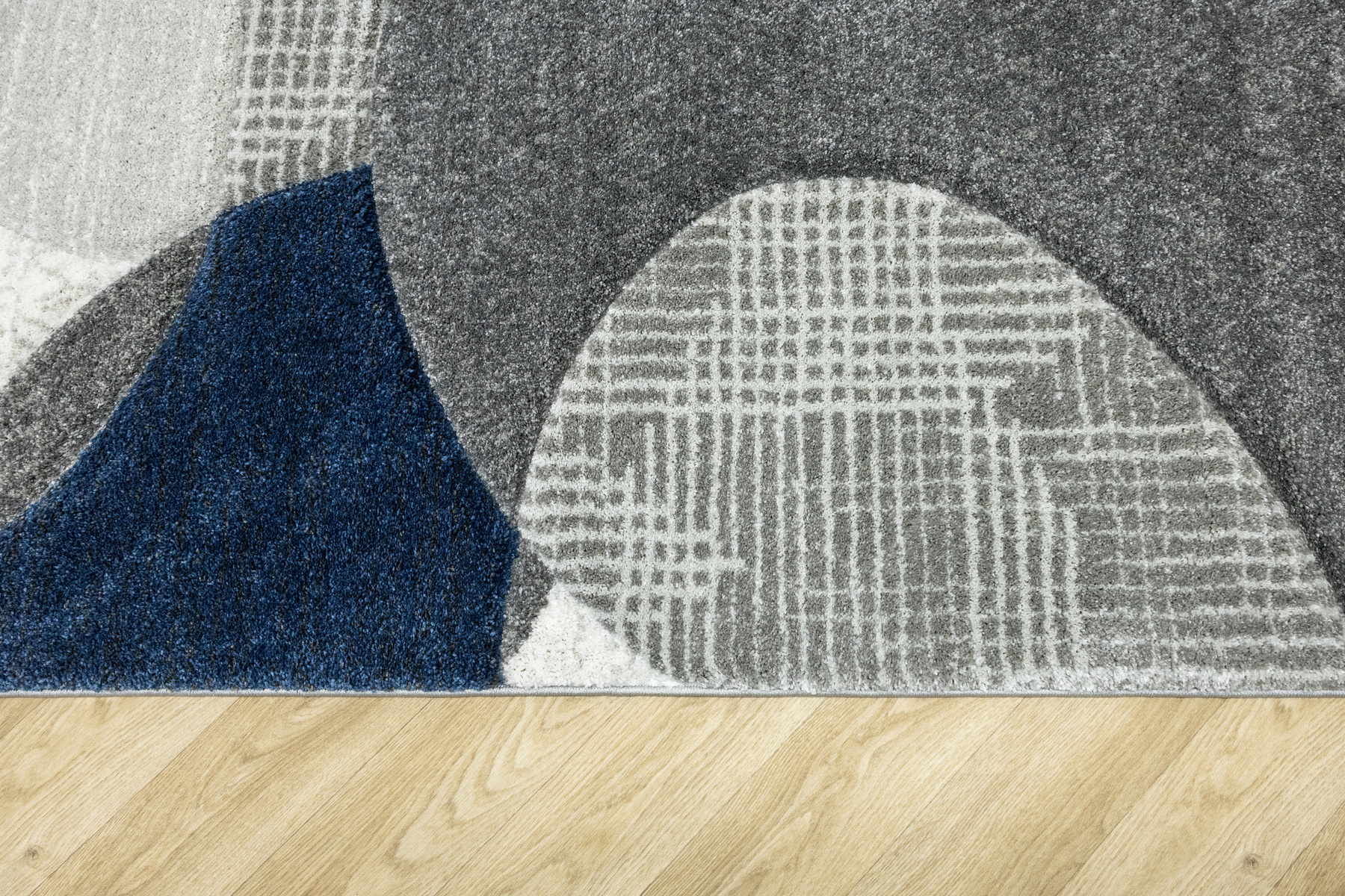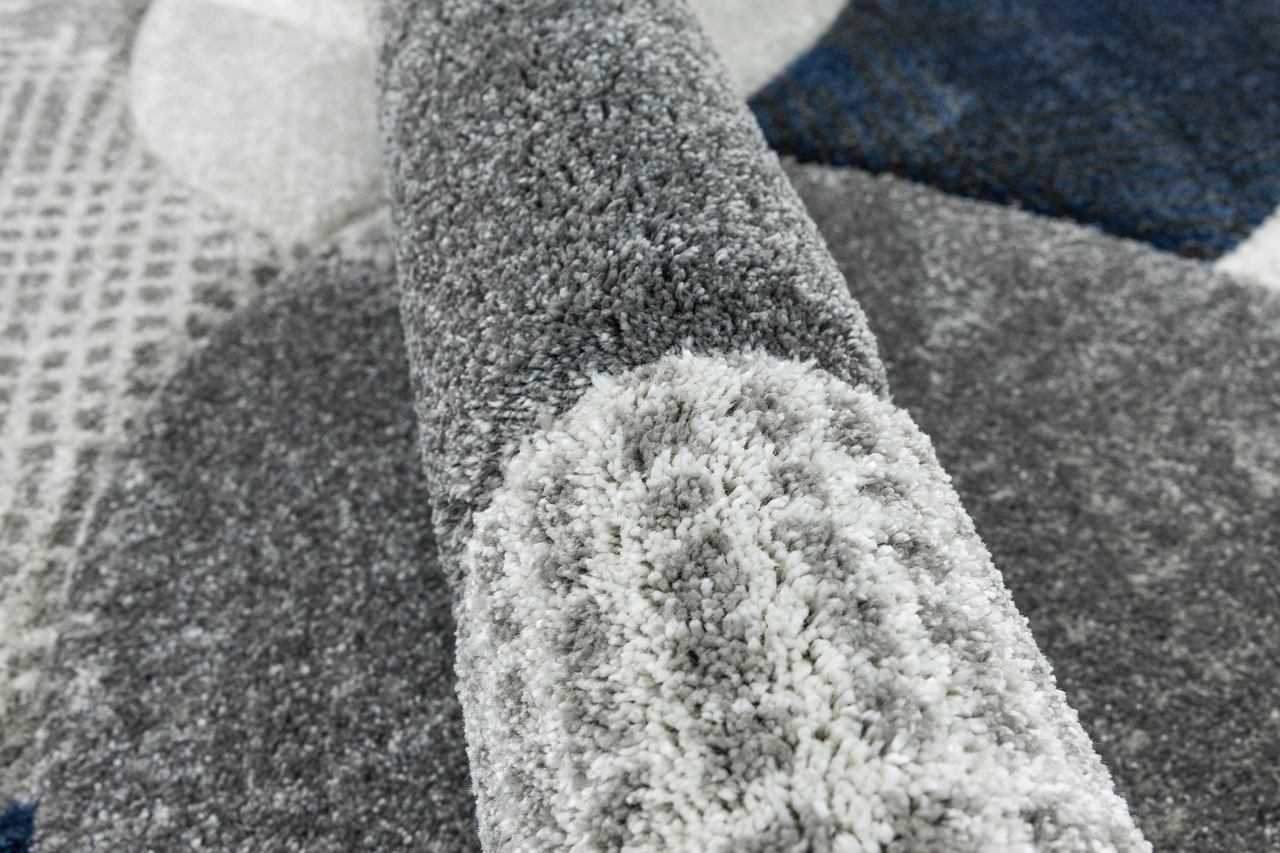 - Miękki i przyjemny w dotyku dywan Kandy o grubym, wycinanym runie ozdobionym nowoczesnym, abstrakcyjnym wzorem geometrycznym z motywem owali w odcieniach szarości, granatu, grafitu i kremu oraz spodem wykończonym jutą.
