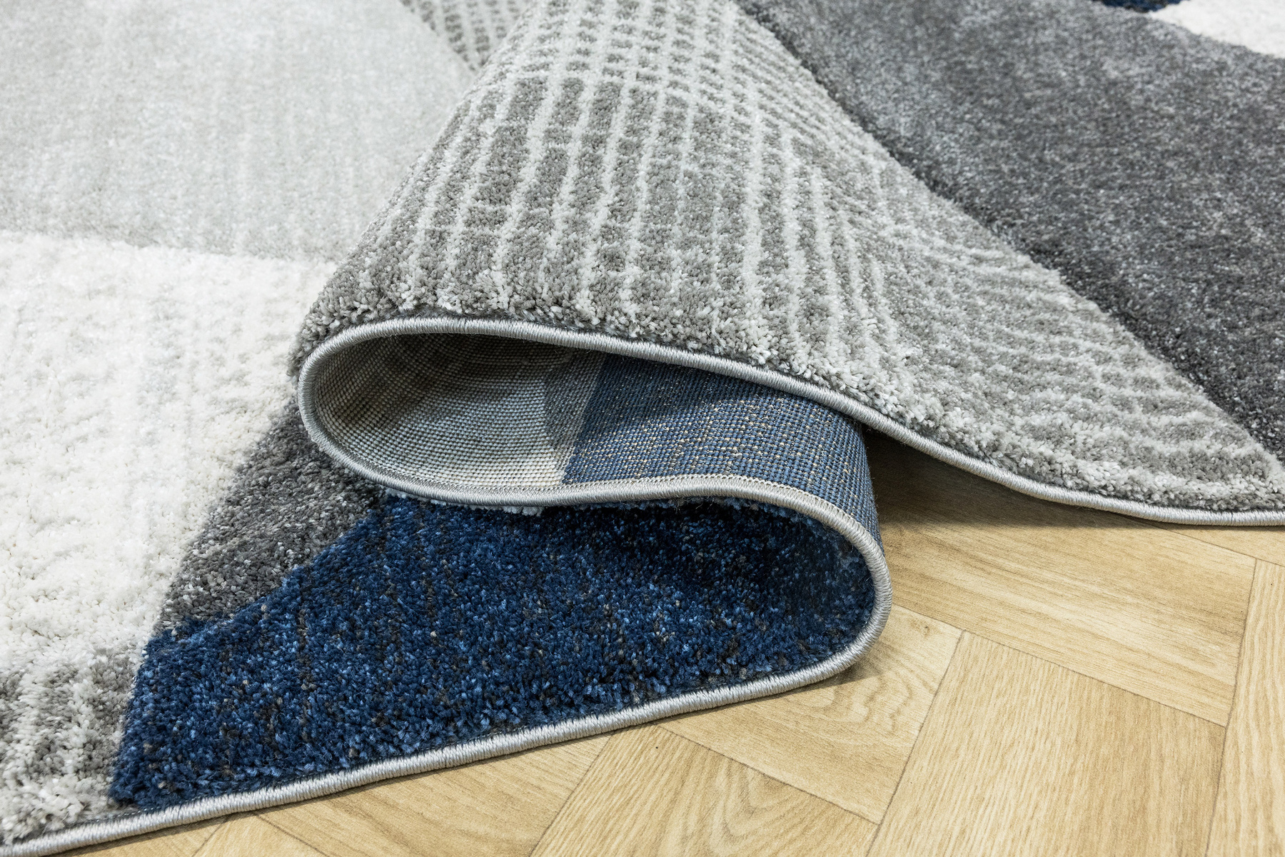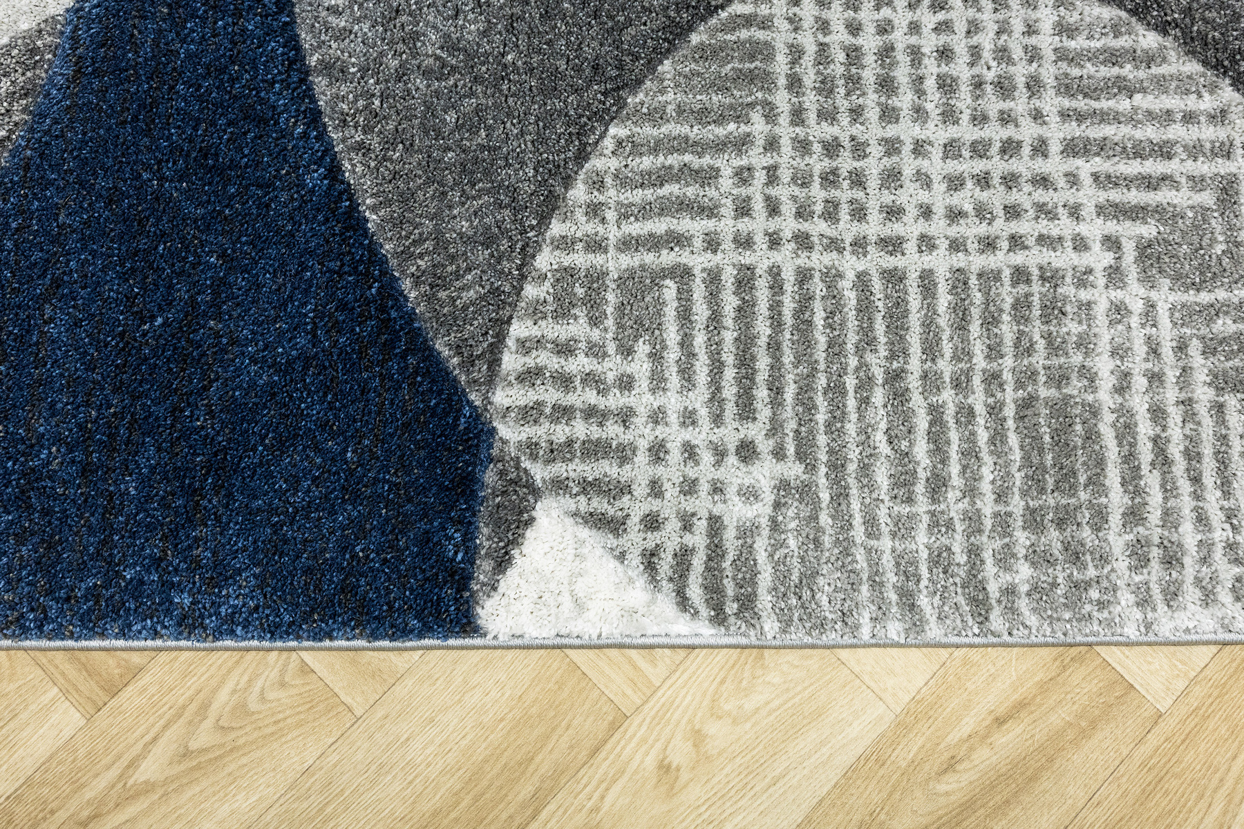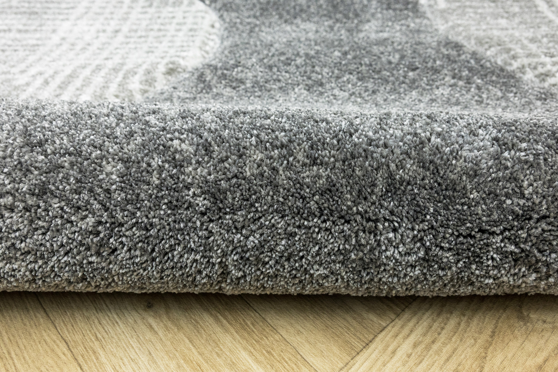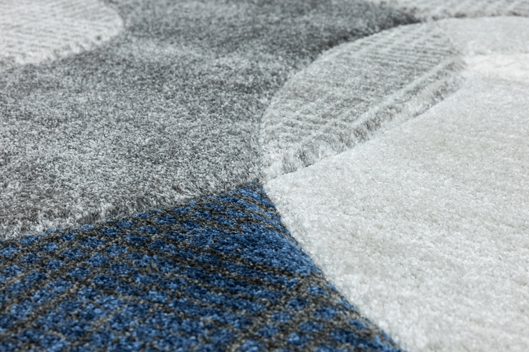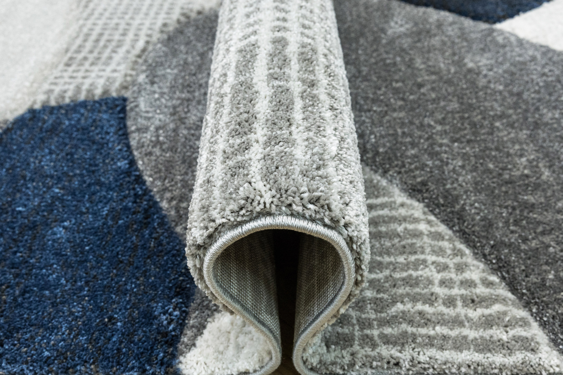 - Miękki i przyjemny w dotyku dywan Kandy o grubym, wycinanym runie ozdobionym nowoczesnym, abstrakcyjnym wzorem geometrycznym z motywem owali w odcieniach szarości, granatu, grafitu i kremu oraz spodem wykończonym jutą.