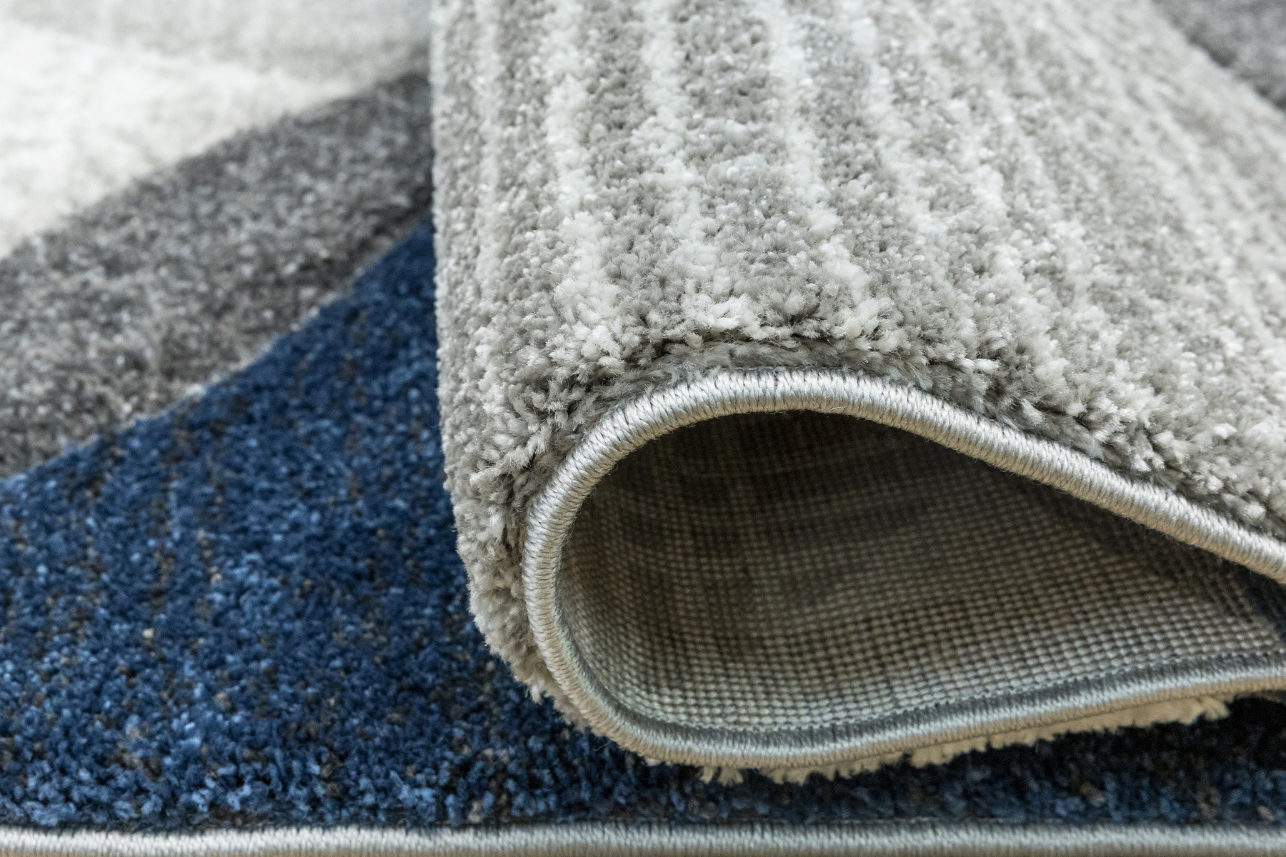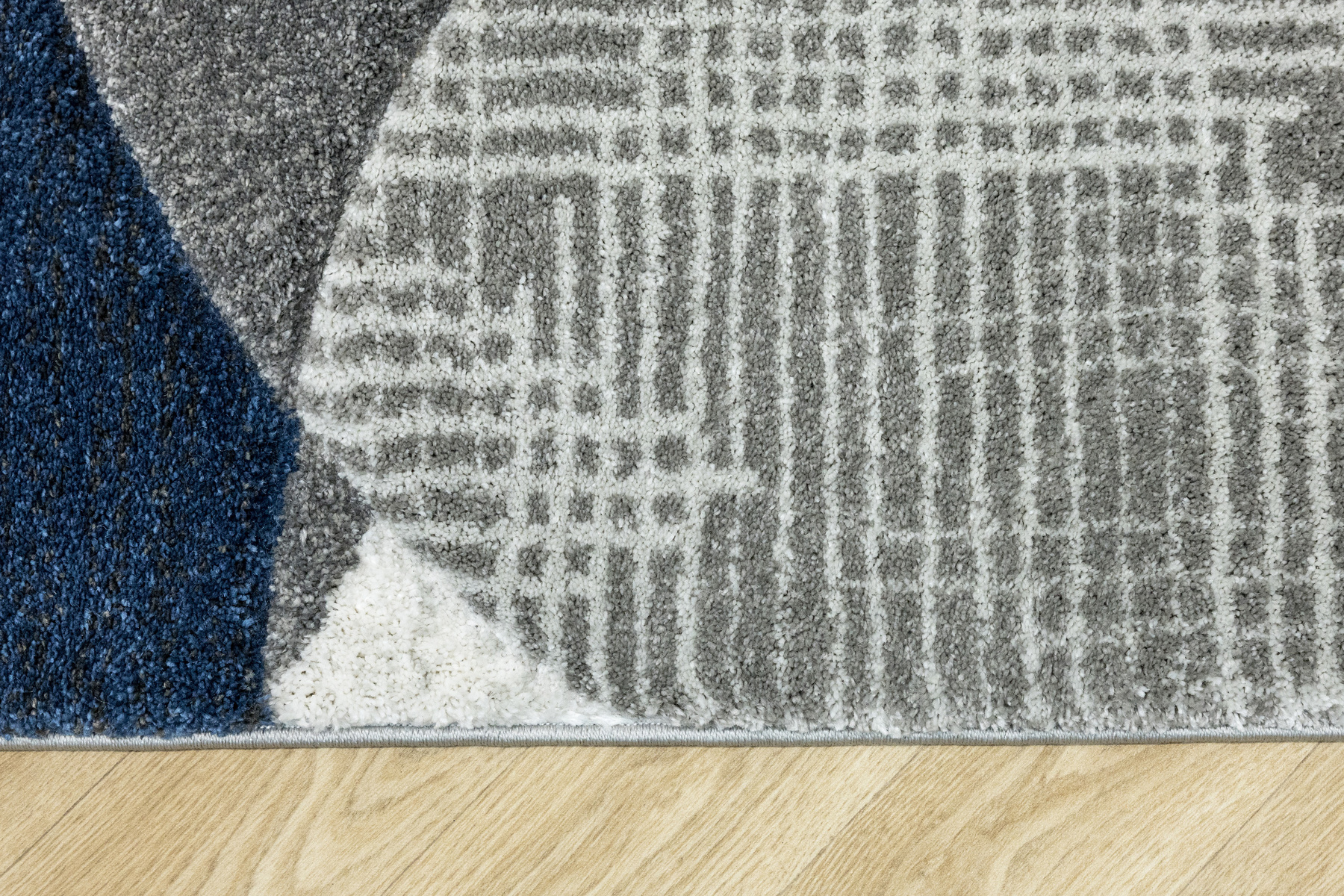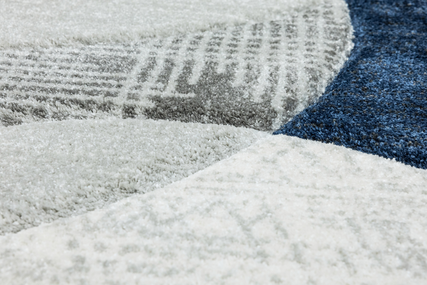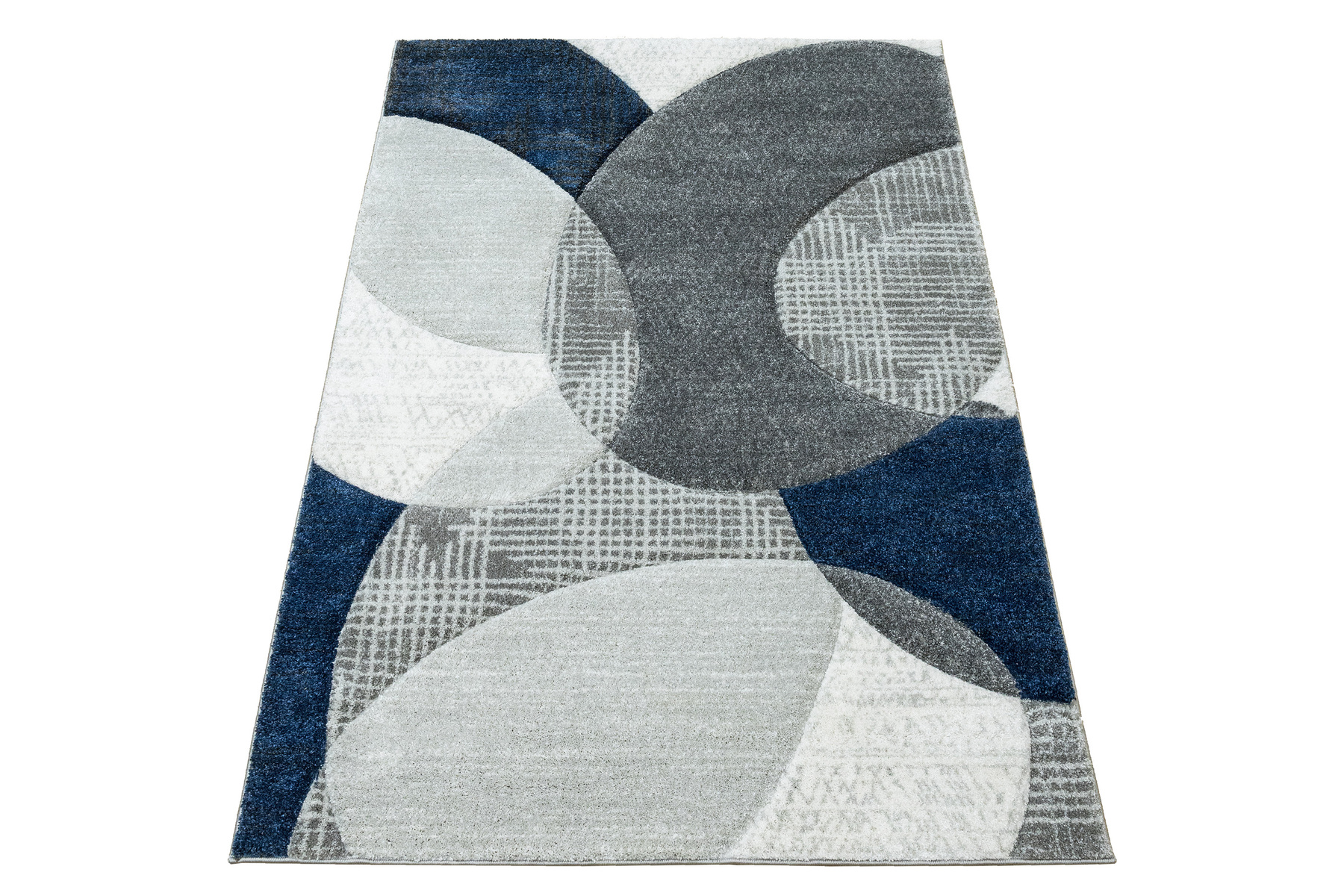 - Miękki i przyjemny w dotyku dywan Kandy o grubym, wycinanym runie ozdobionym nowoczesnym, abstrakcyjnym wzorem geometrycznym z motywem owali w odcieniach szarości, granatu, grafitu i kremu oraz spodem wykończonym jutą.