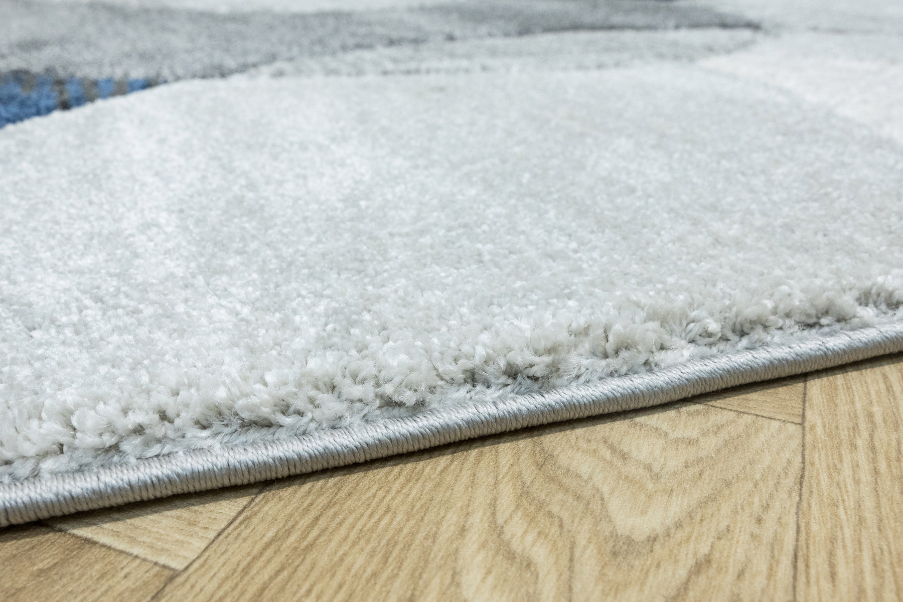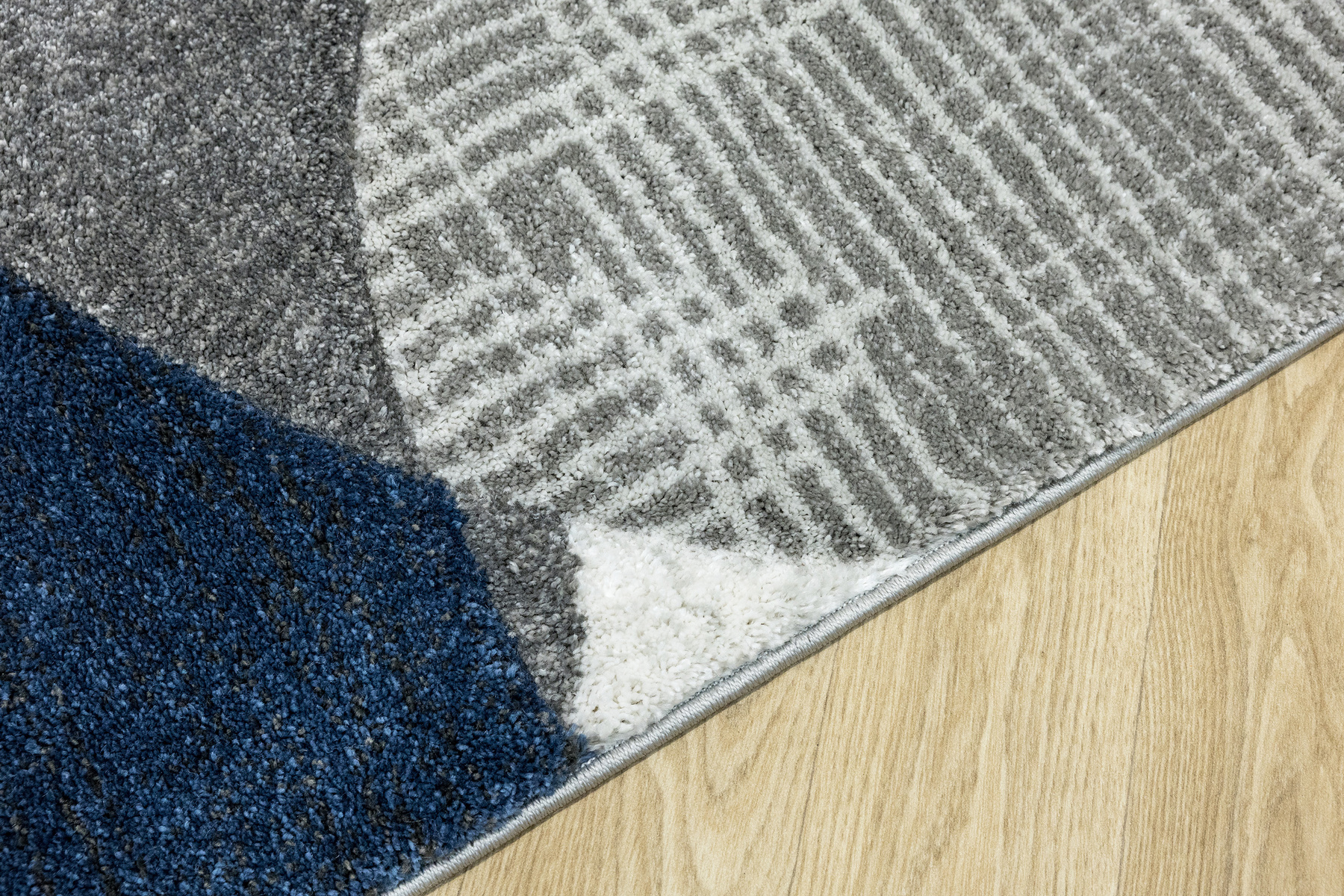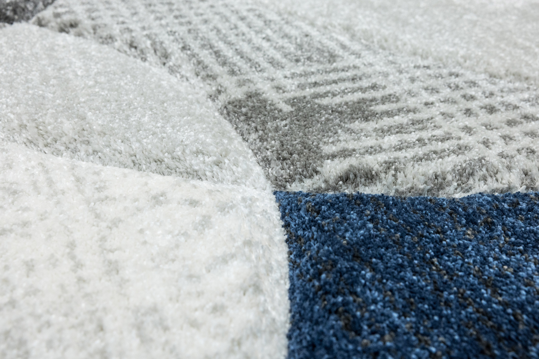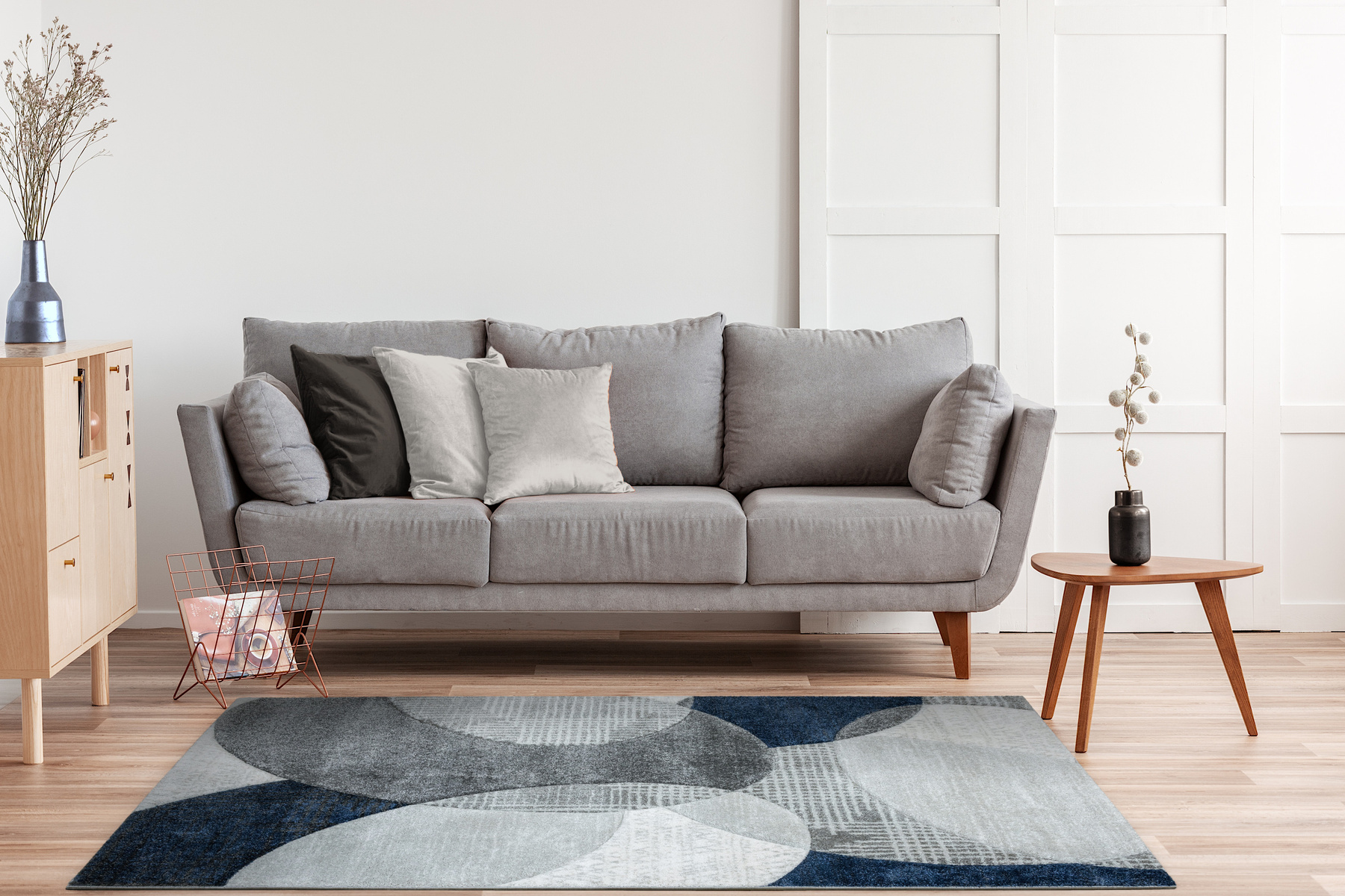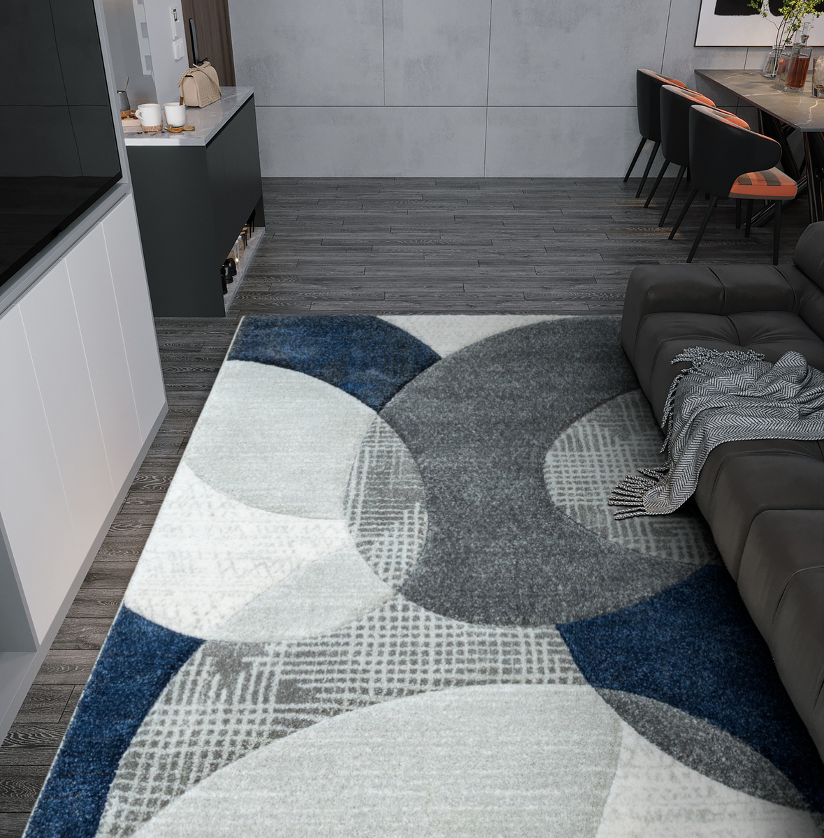 - Miękki i przyjemny w dotyku dywan Kandy o grubym, wycinanym runie ozdobionym nowoczesnym, abstrakcyjnym wzorem geometrycznym z motywem owali w odcieniach szarości, granatu, grafitu i kremu oraz spodem wykończonym jutą.