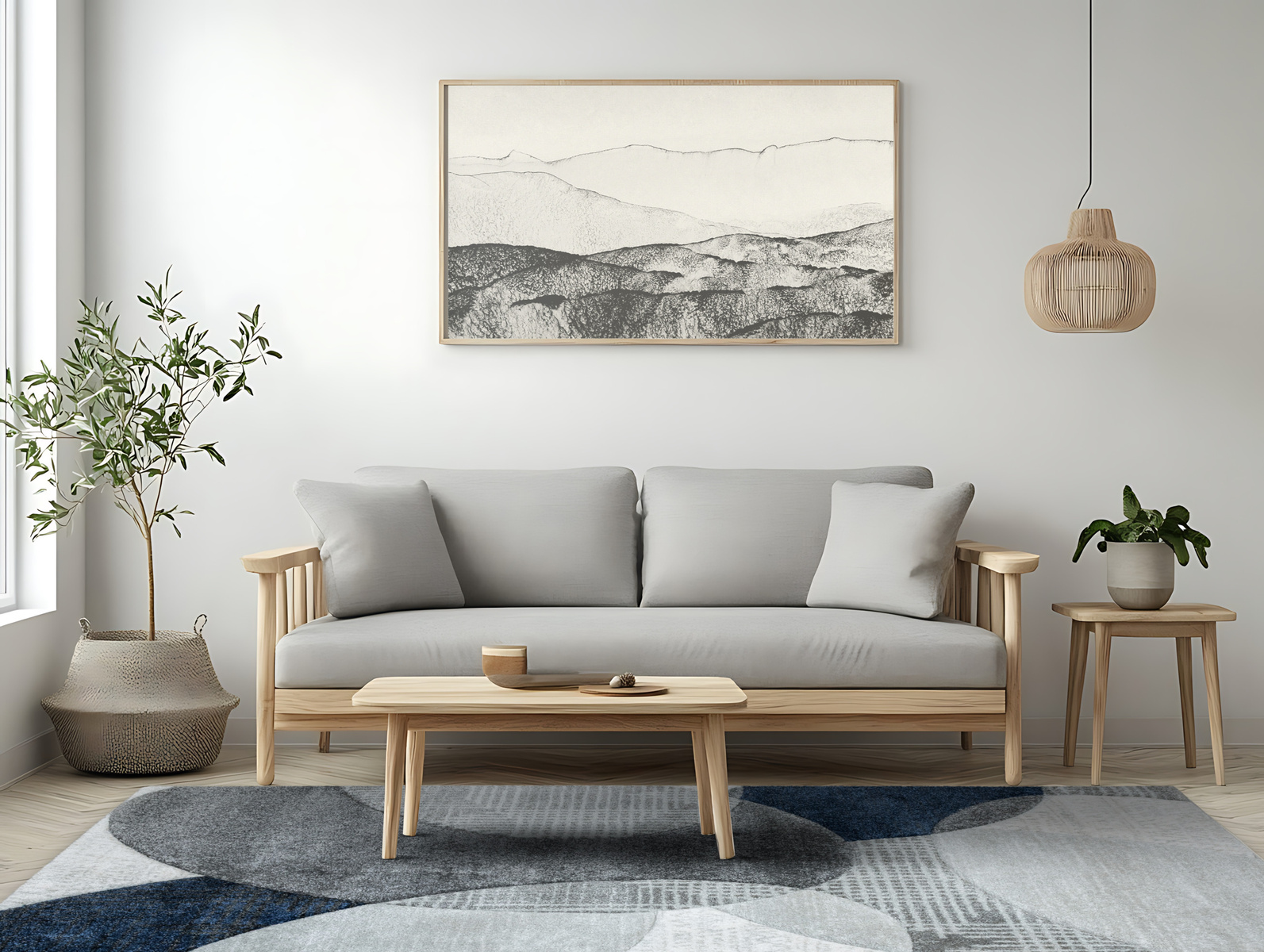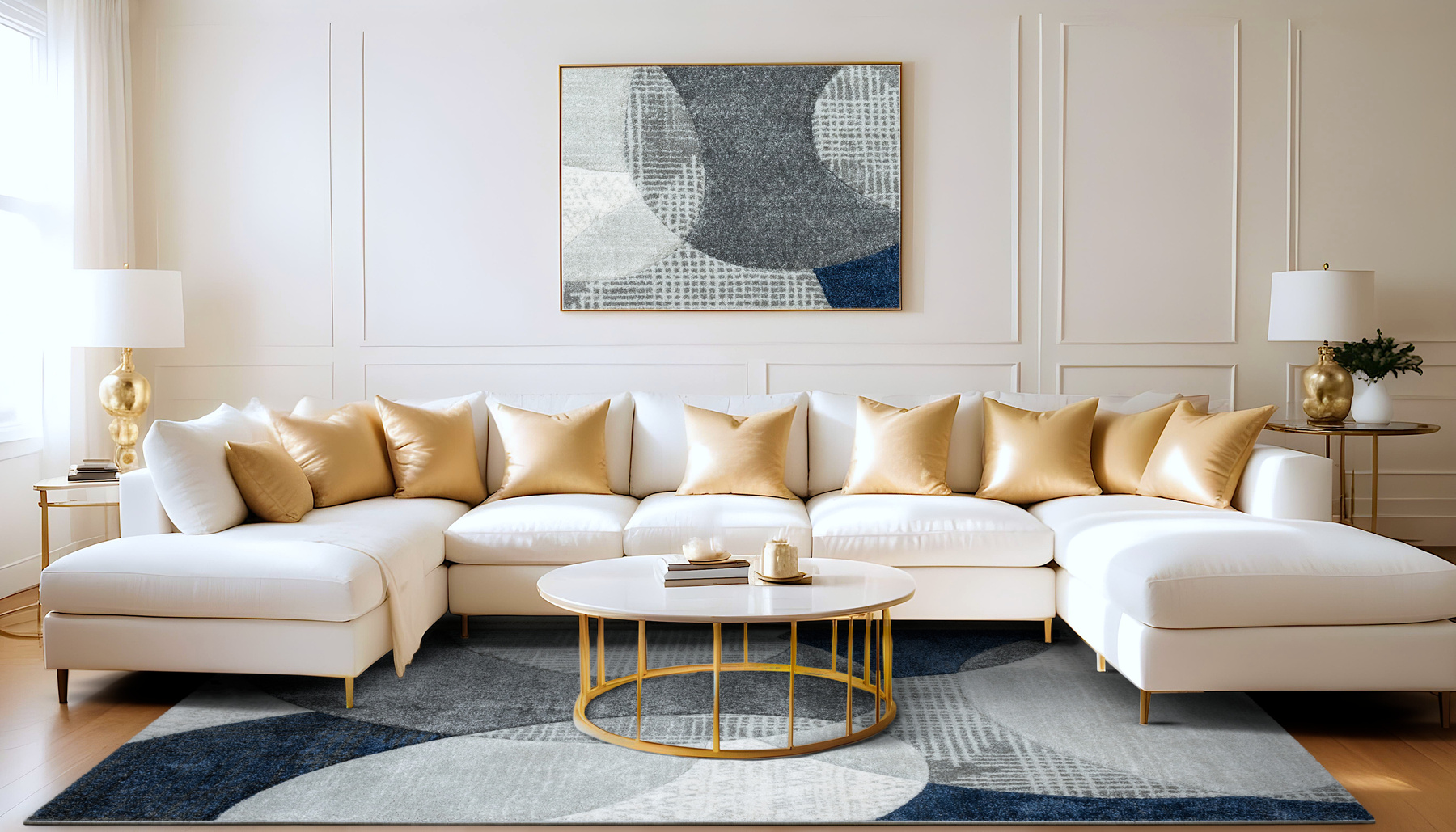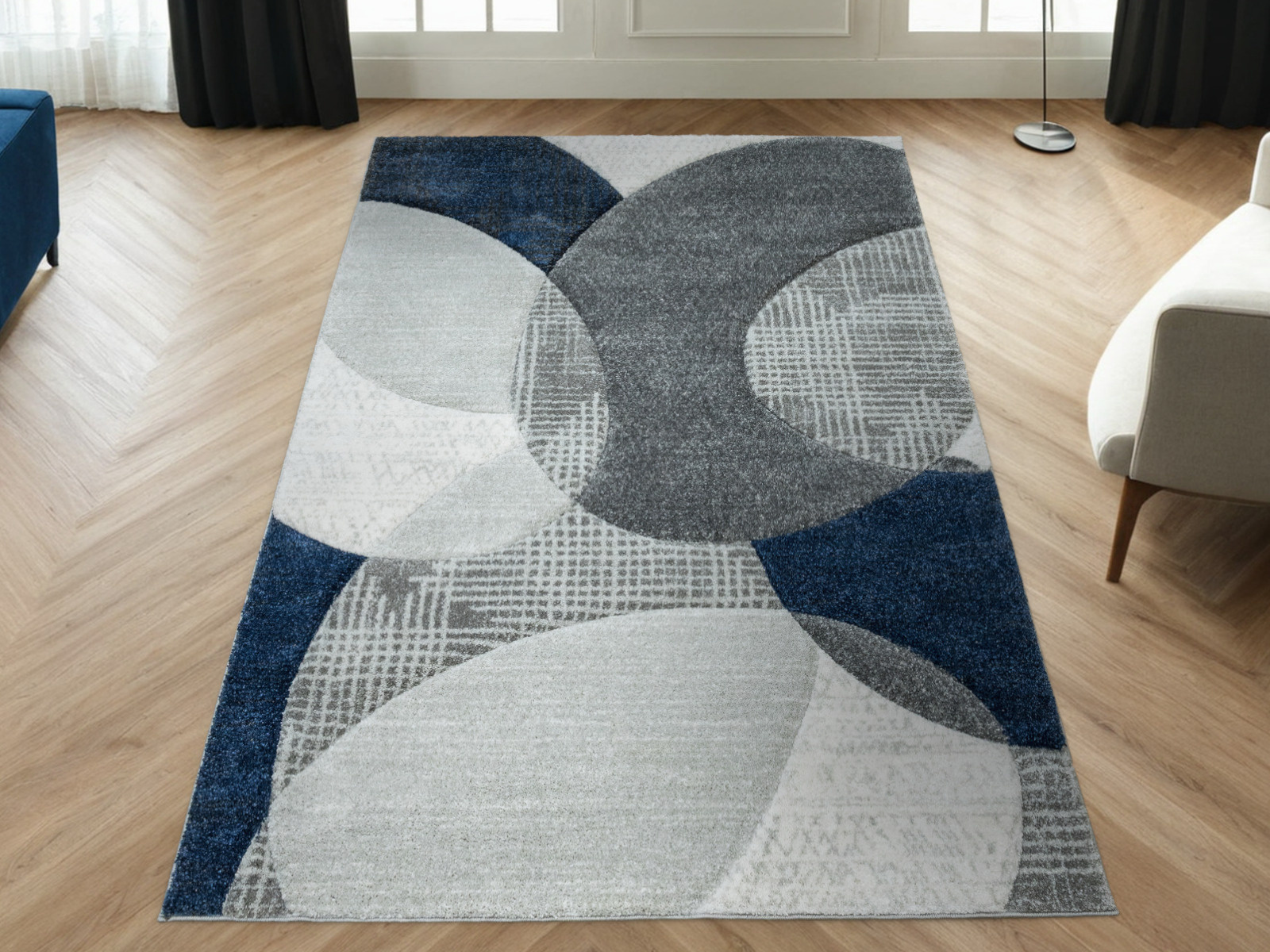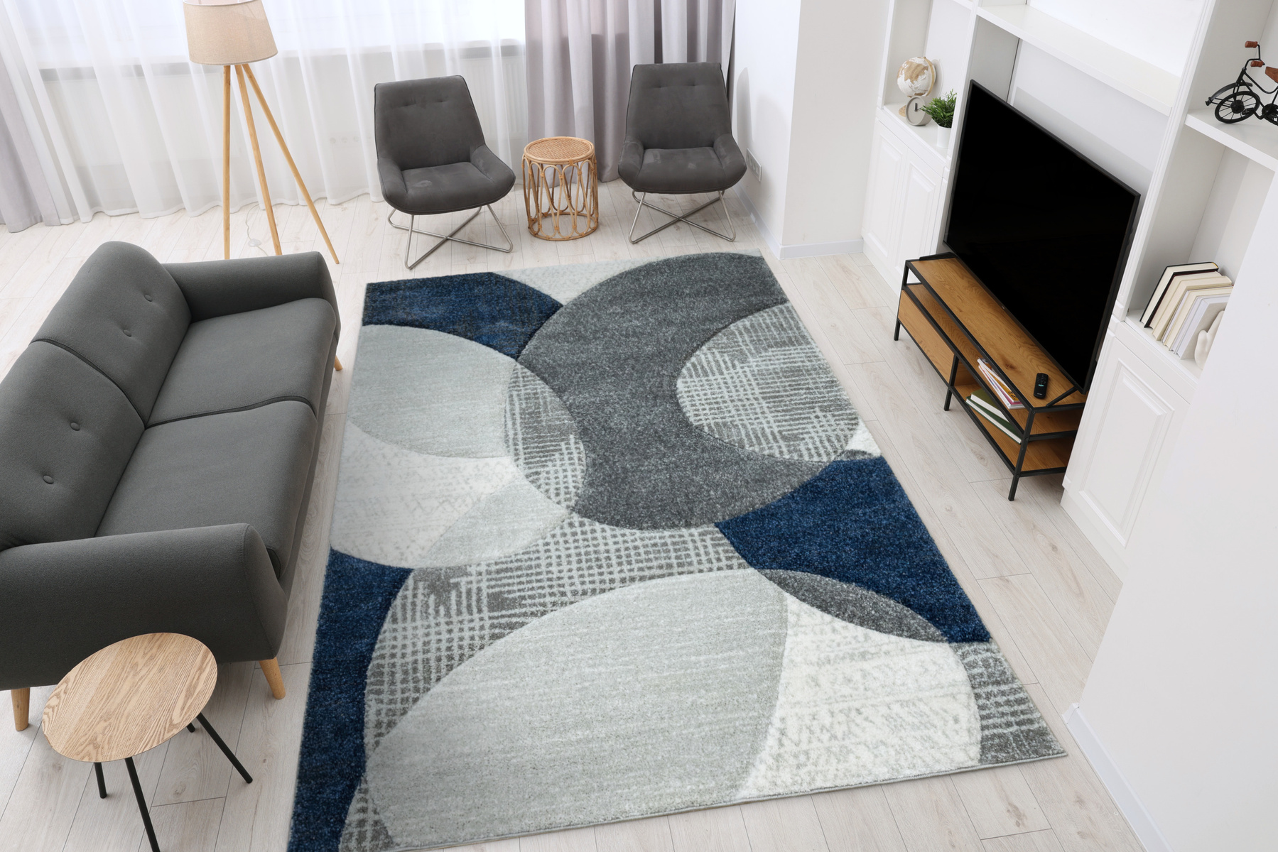 - Miękki i przyjemny w dotyku dywan Kandy o grubym, wycinanym runie ozdobionym nowoczesnym, abstrakcyjnym wzorem geometrycznym z motywem owali w odcieniach szarości, granatu, grafitu i kremu oraz spodem wykończonym jutą.