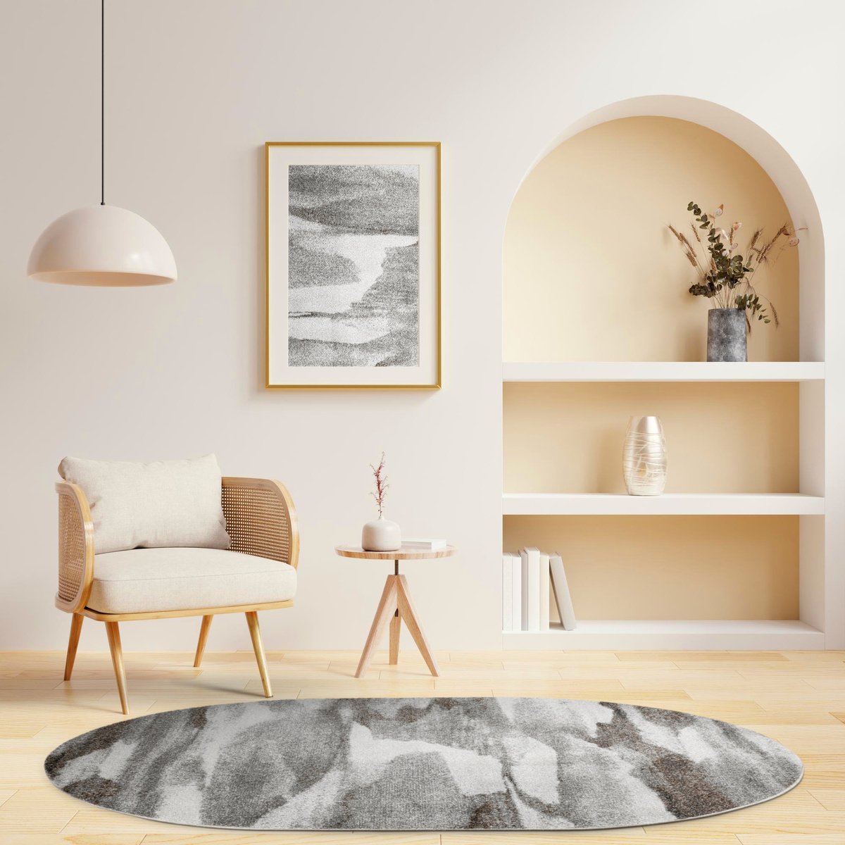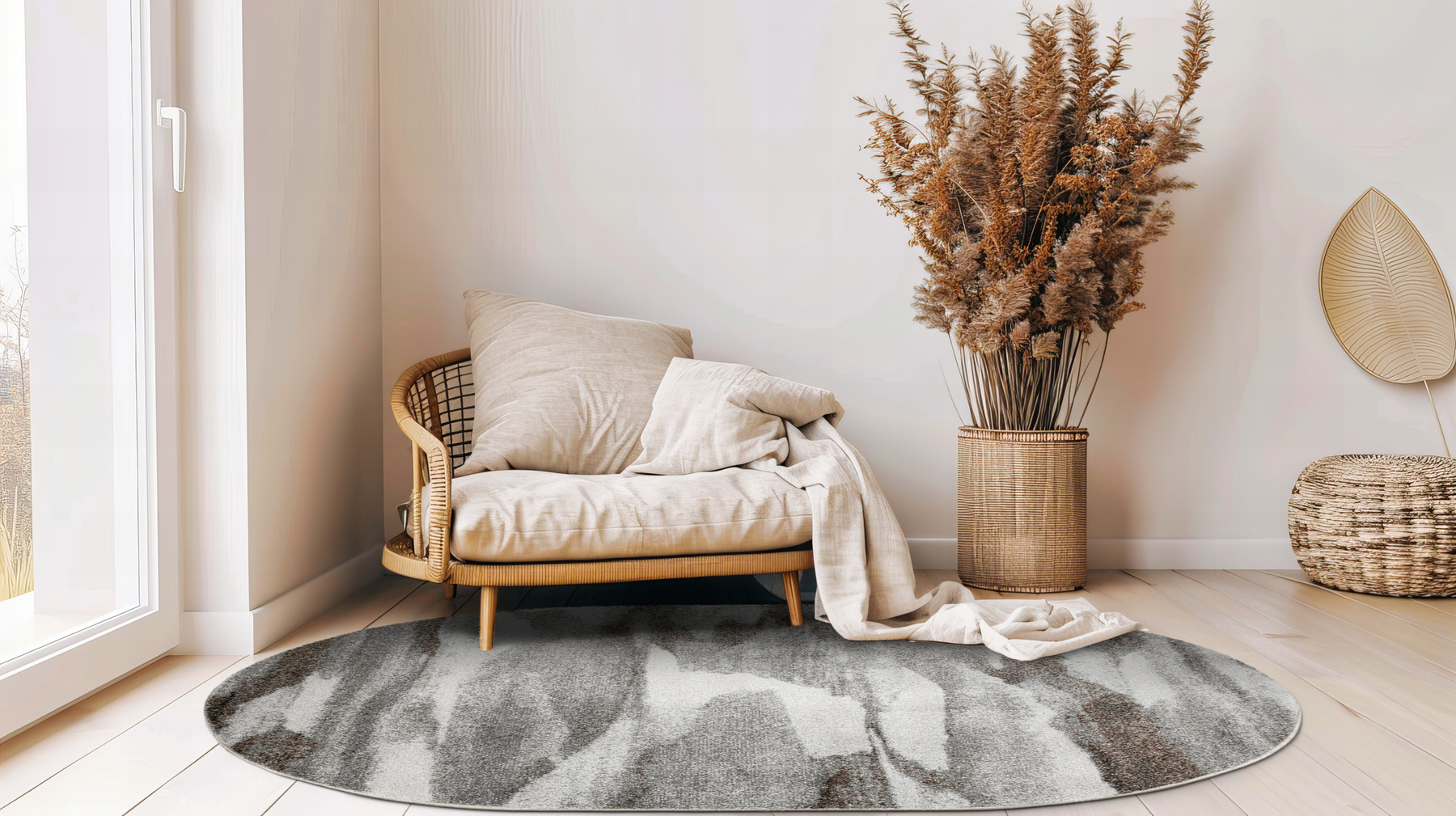 • Miękki i przyjemny w dotyku owalny dywan Ponte o runie ozdobionym nowoczesnym przecieranym wzorem w szarościach z akcentami kremu, srebrnego, beżu, brązu i czerni. Spód wykończony jutą.