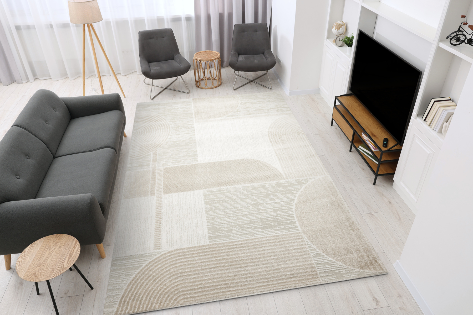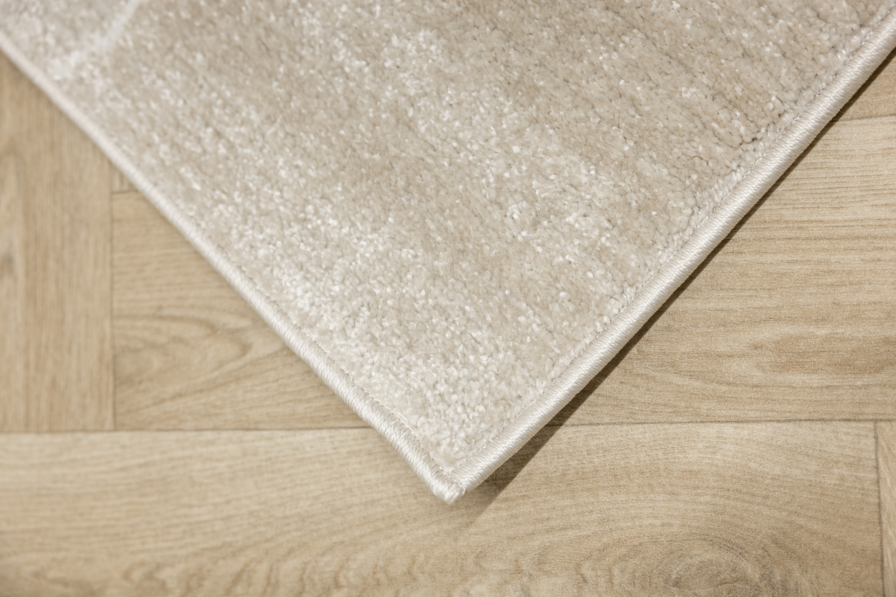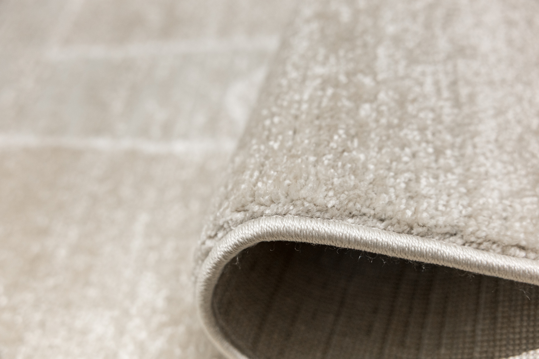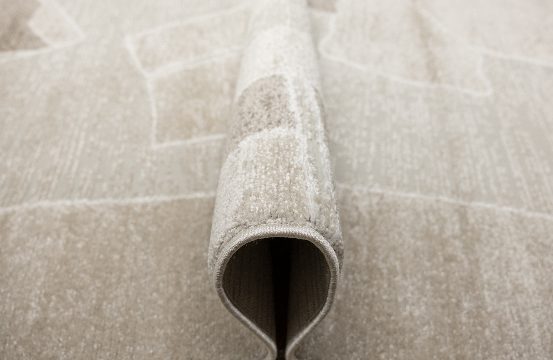 - Miękki i przyjemny w dotyku dywan Matara o dwupoziomowym runie ozdobionym wzorem abstrakcyjnym w półkola w kaszmirowych beżach i kremie. Spód wykończony jutą.