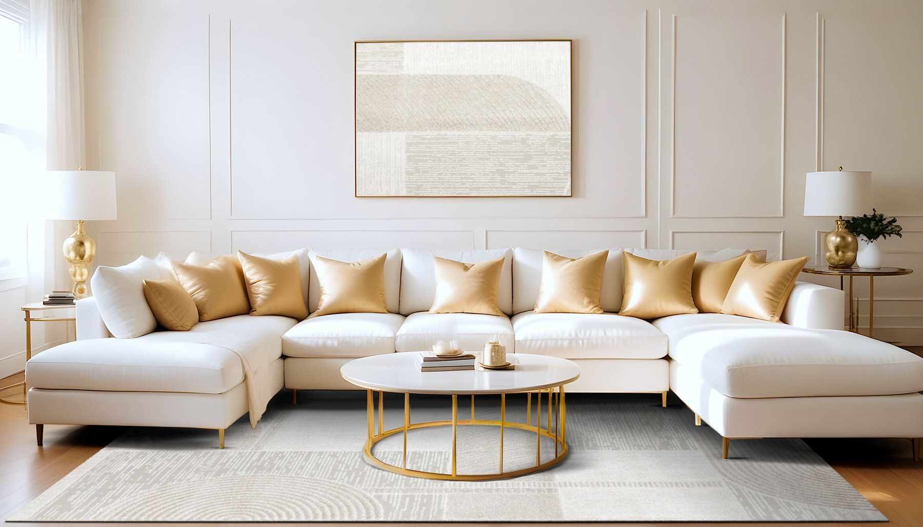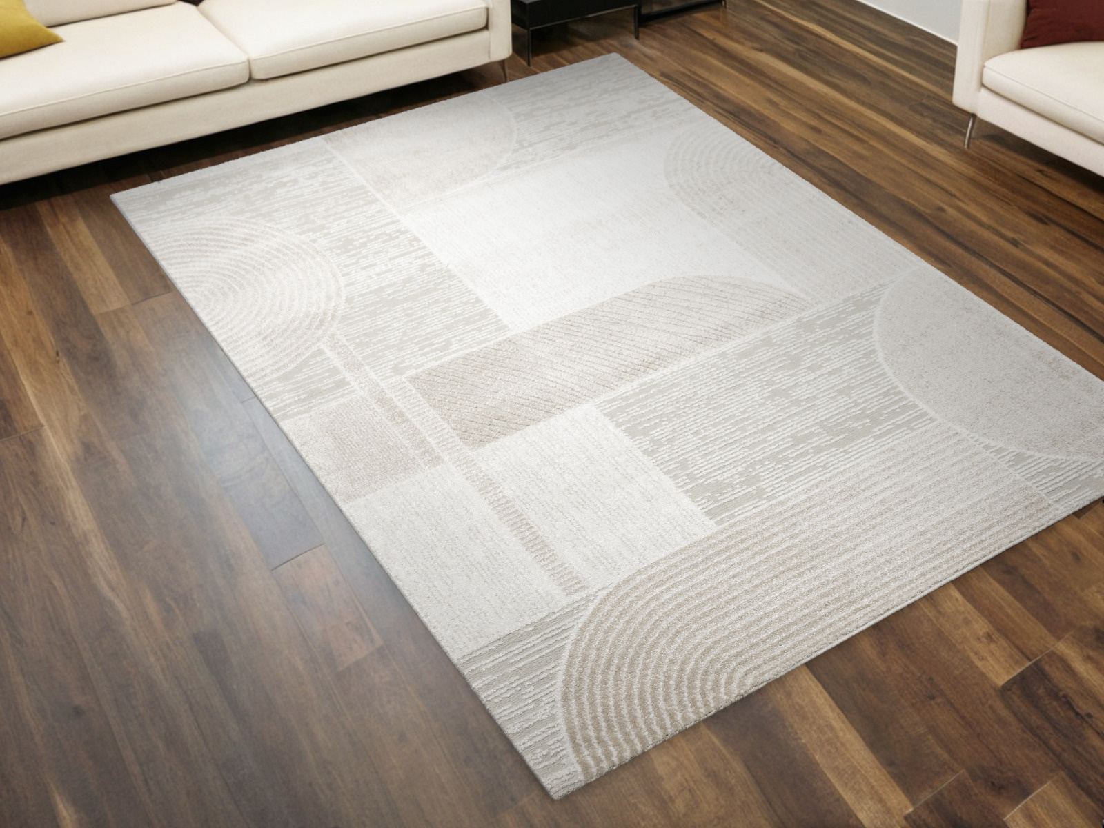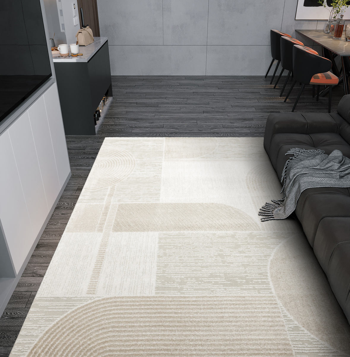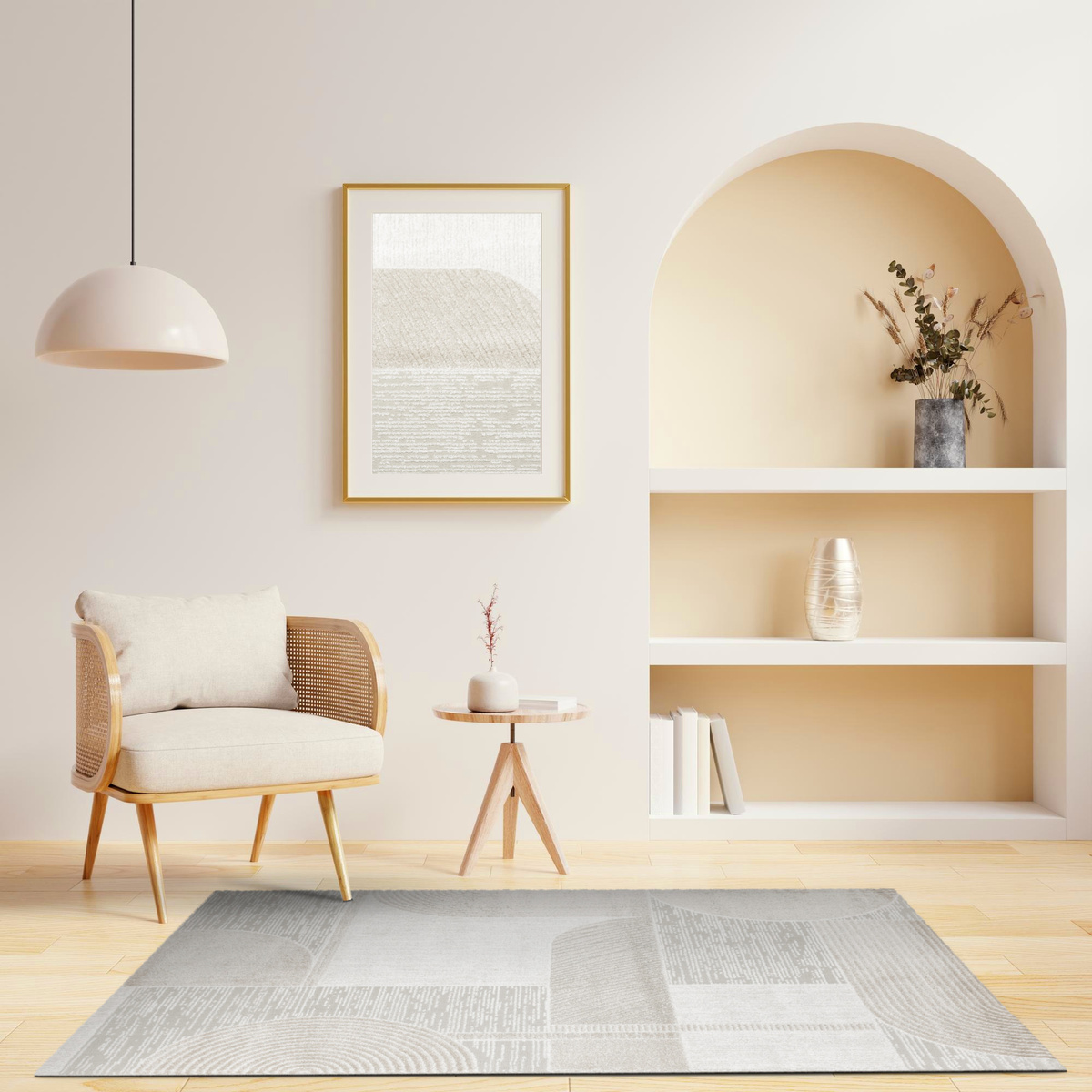 - Miękki i przyjemny w dotyku dywan Matara o dwupoziomowym runie ozdobionym wzorem abstrakcyjnym w półkola w kaszmirowych beżach i kremie. Spód wykończony jutą.