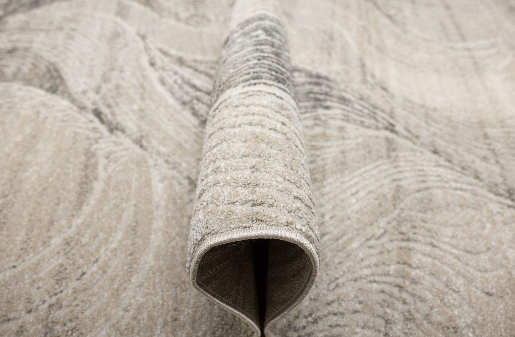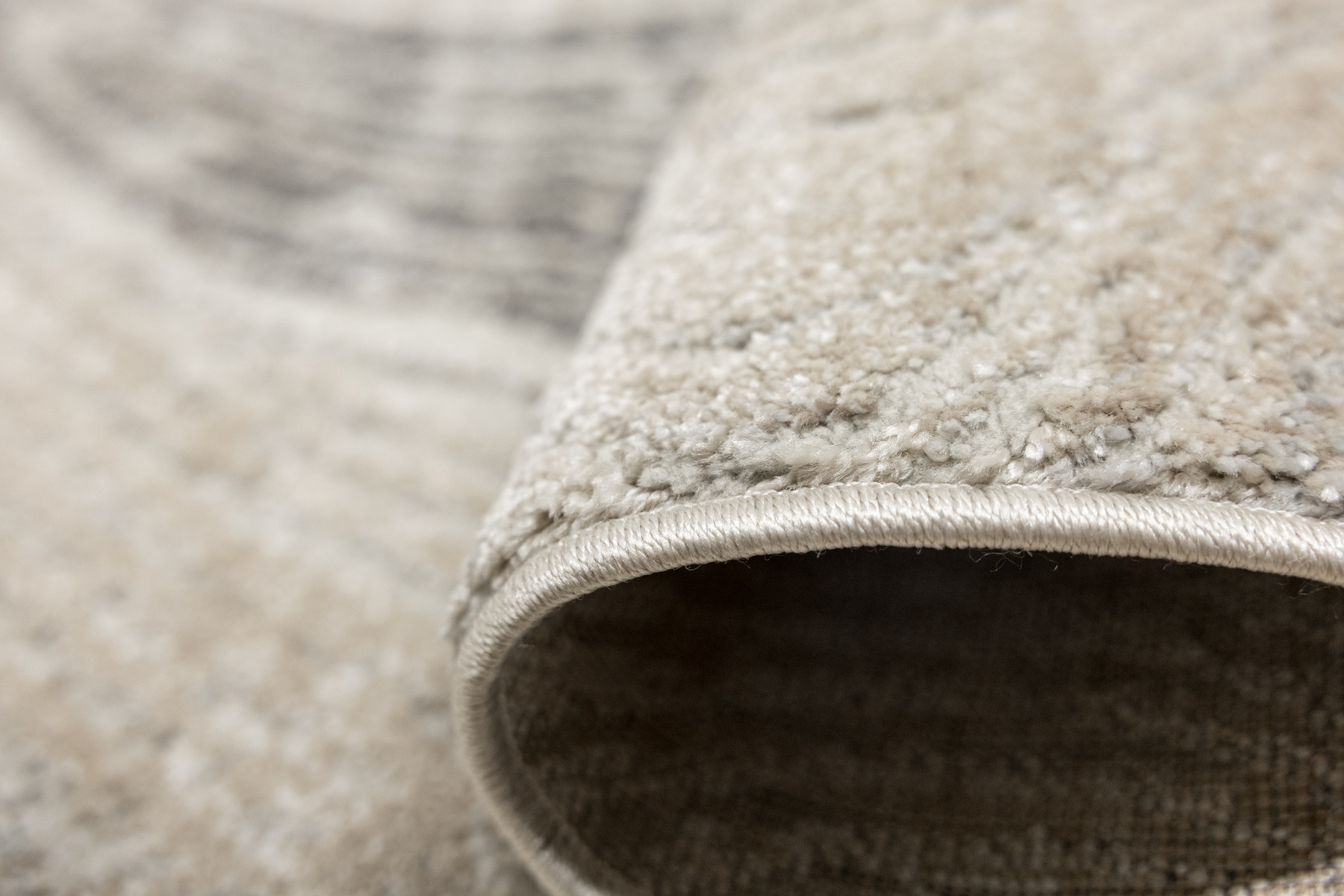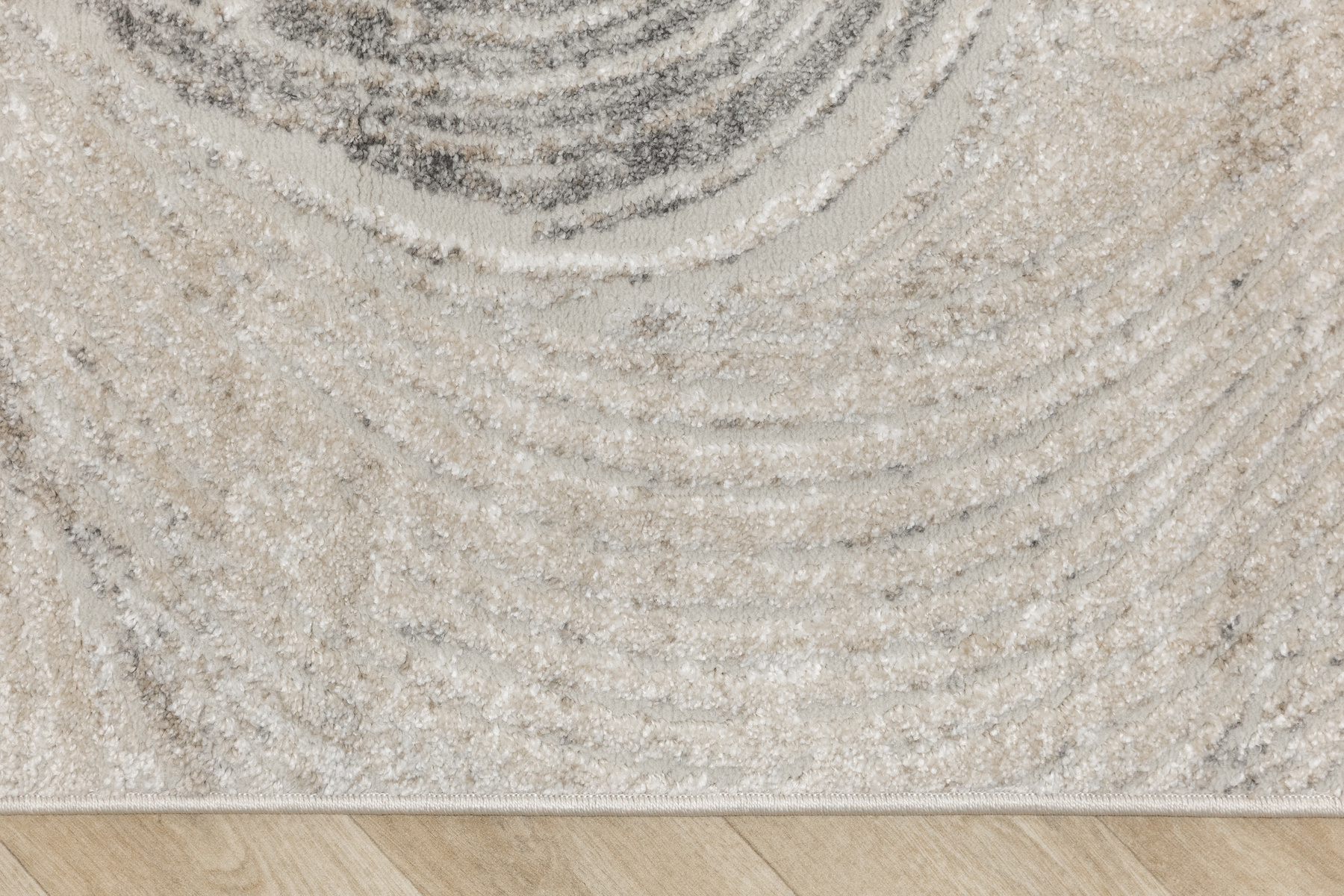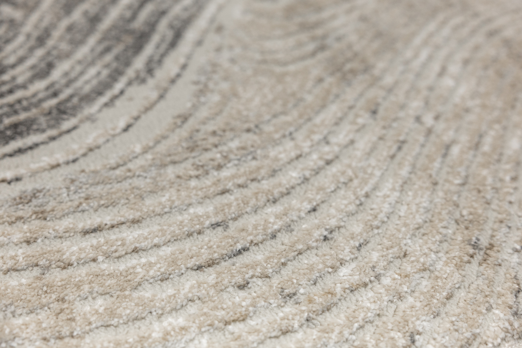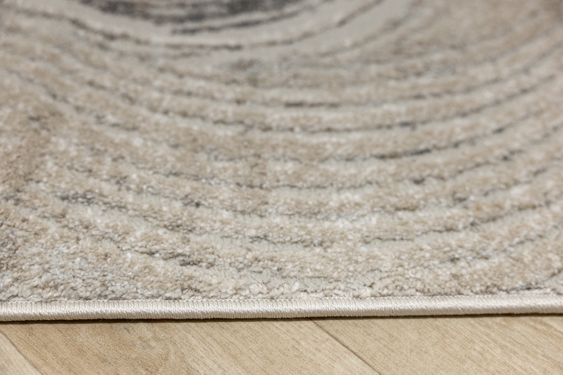 - Miękki i przyjemny w dotyku dywan Matara o dwupoziomowym runie ozdobionym wzorem abstrakcyjnym w półkola w kaszmirowych beżach i kremie. Spód wykończony jutą.