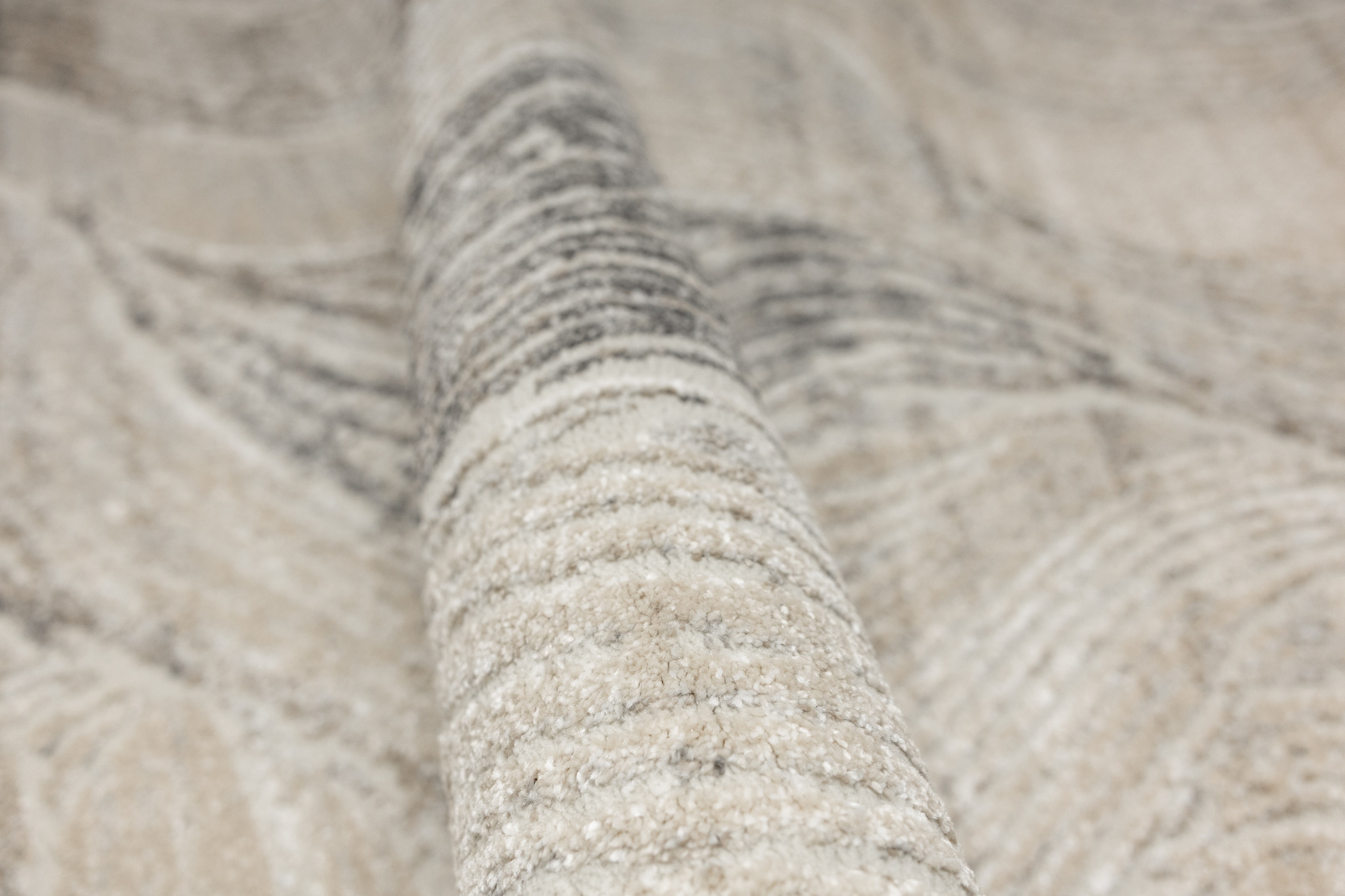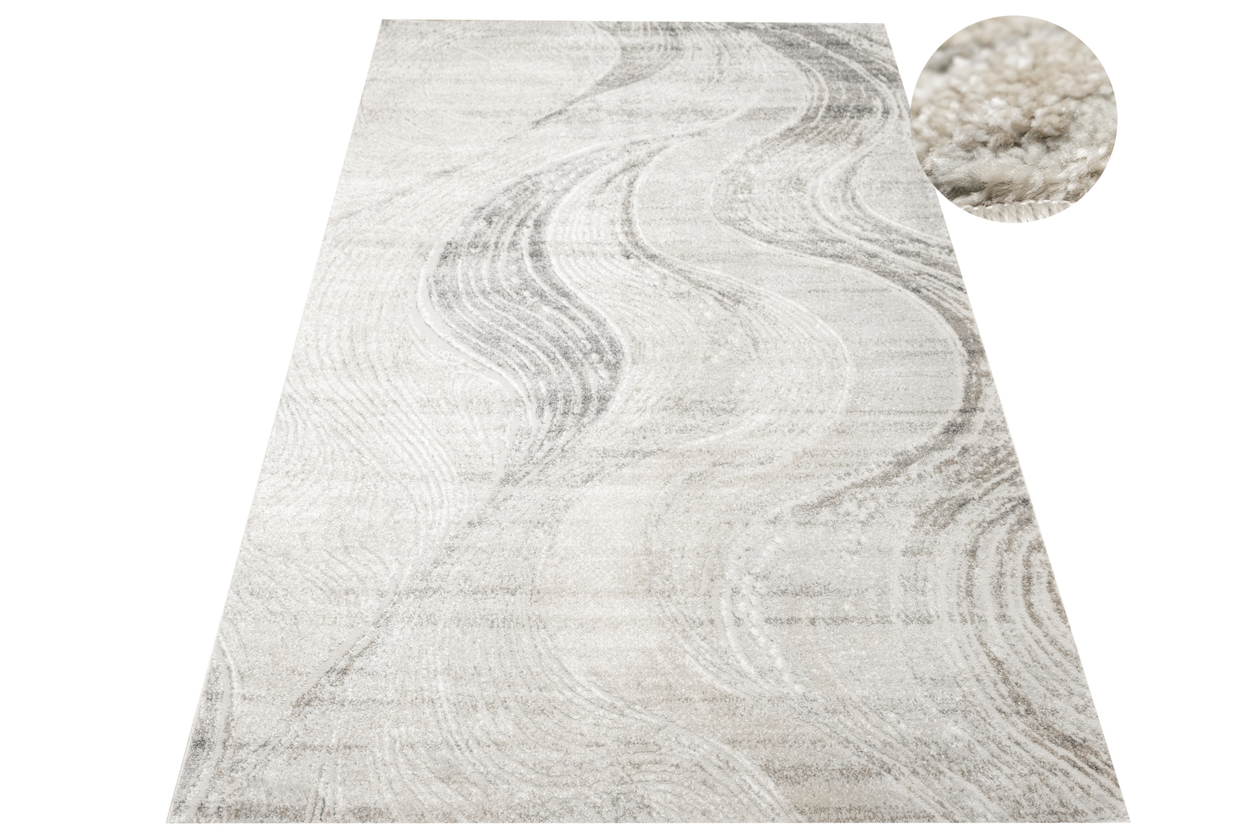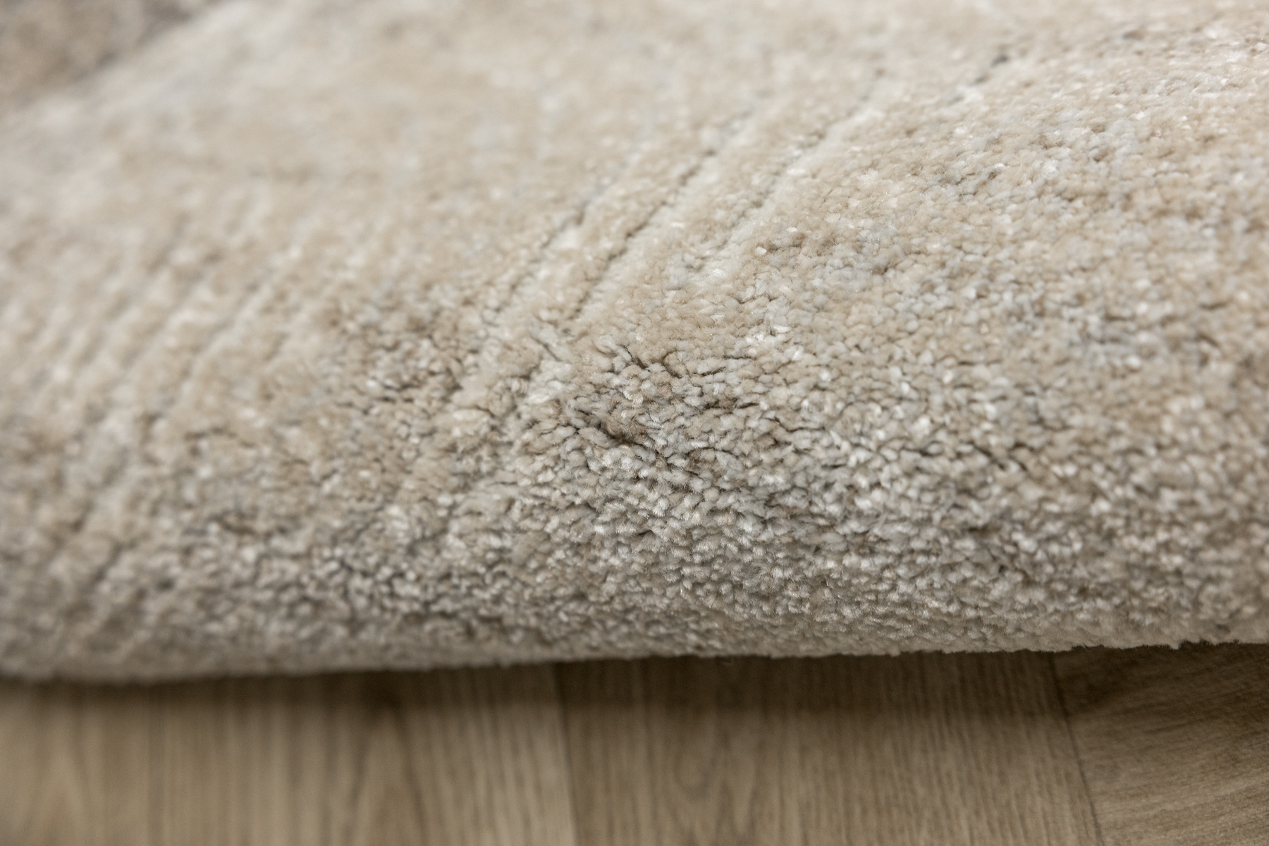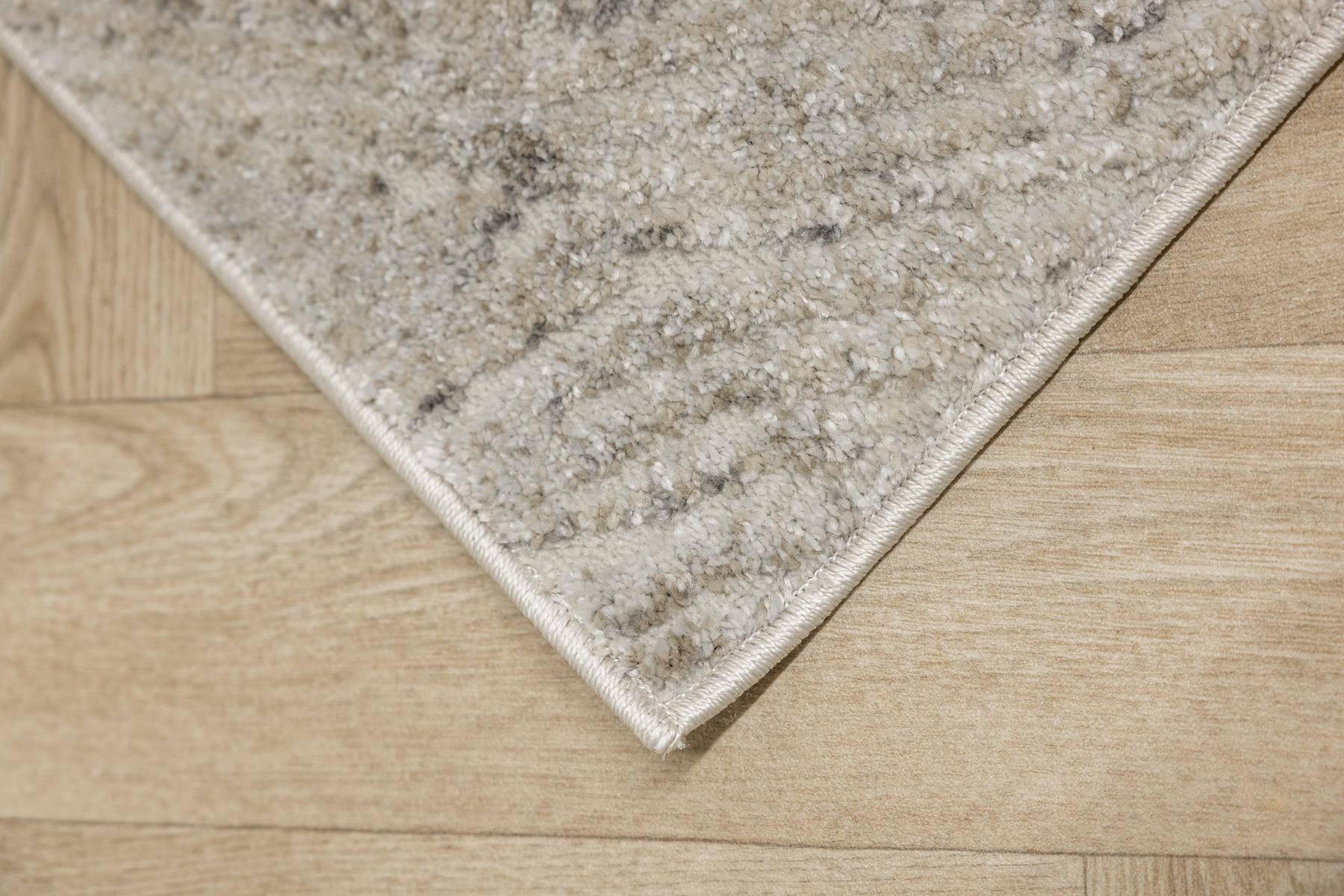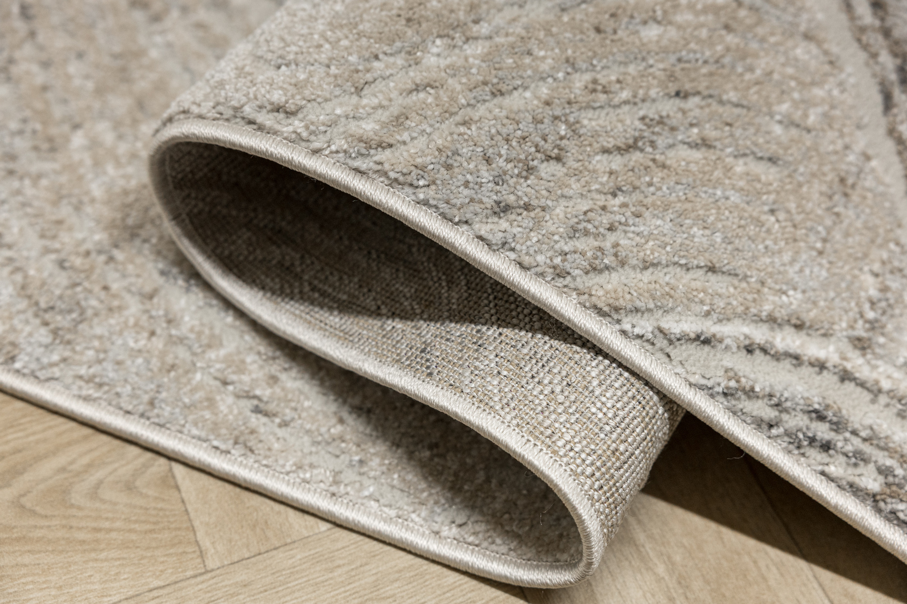 - Miękki i przyjemny w dotyku dywan Matara o dwupoziomowym runie ozdobionym wzorem abstrakcyjnym w półkola w kaszmirowych beżach i kremie. Spód wykończony jutą.