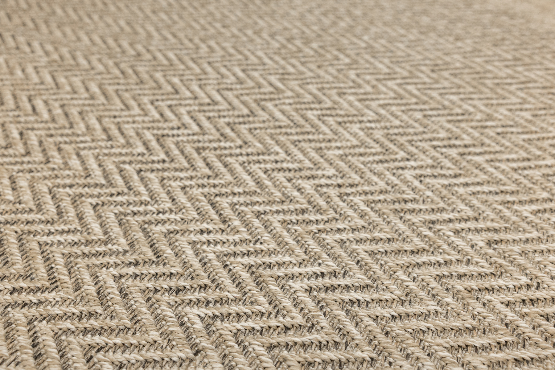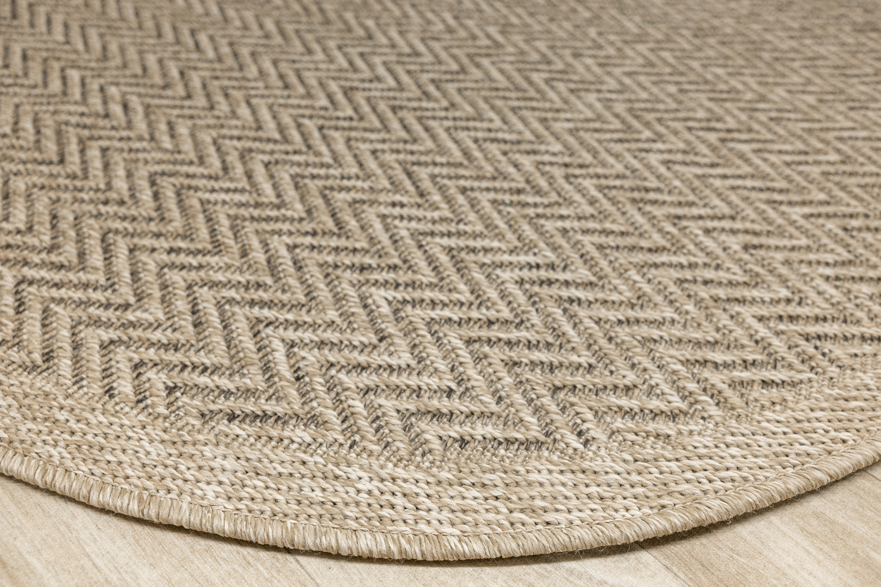 • Okrągły dywan sznurkowy Patio z modnym geometrycznym wzorem w jodełkę, w odcieniach beżu i brązu który może być stosowany zarówno wewnątrz jak i na zewnątrz.