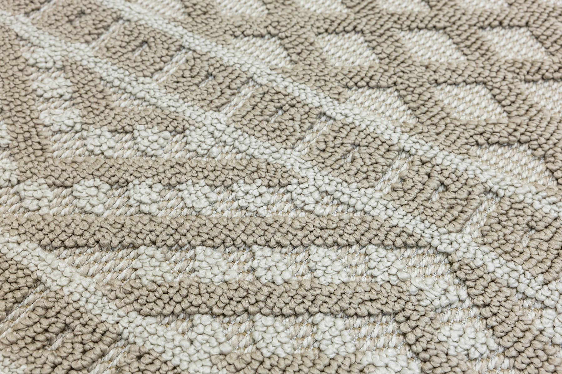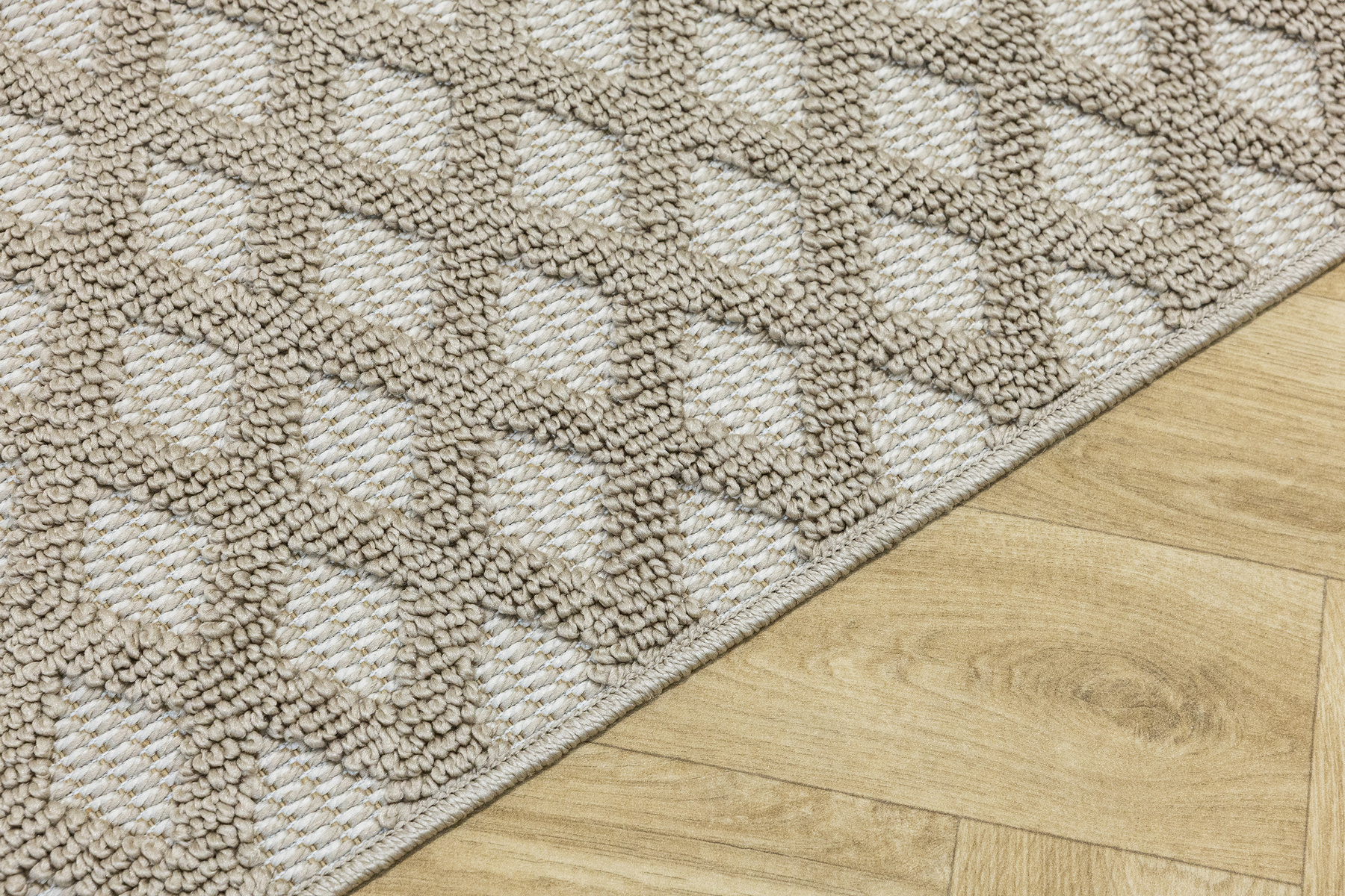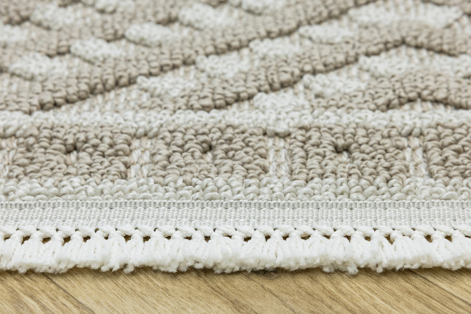 • Dywan Milano z runem o dwóch poziomach będących efektownym połączeniem splotu sznurkowego i pętelkowego, ze wzorem w romby i zygzaki w kaszmirowych beżach i kremach z krańcami zakończonymi frędzelkami.