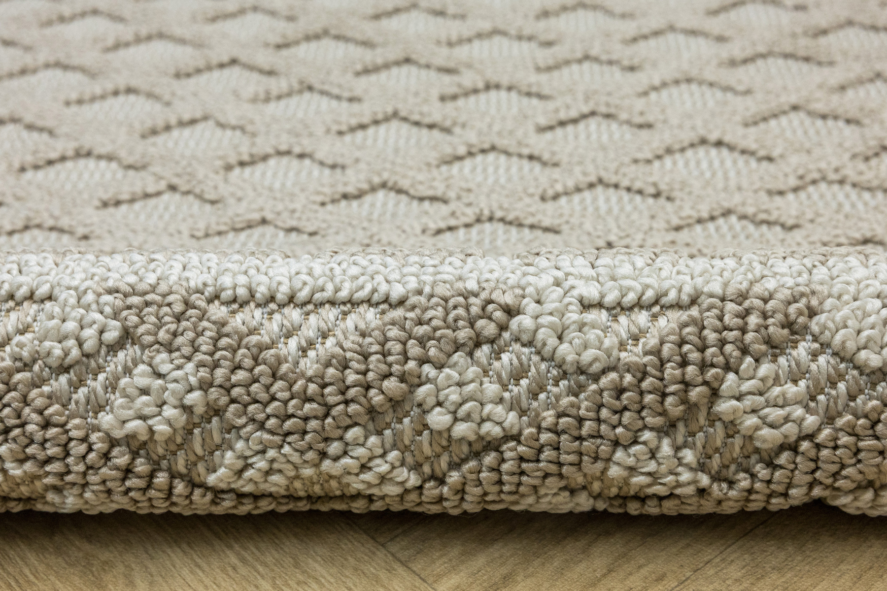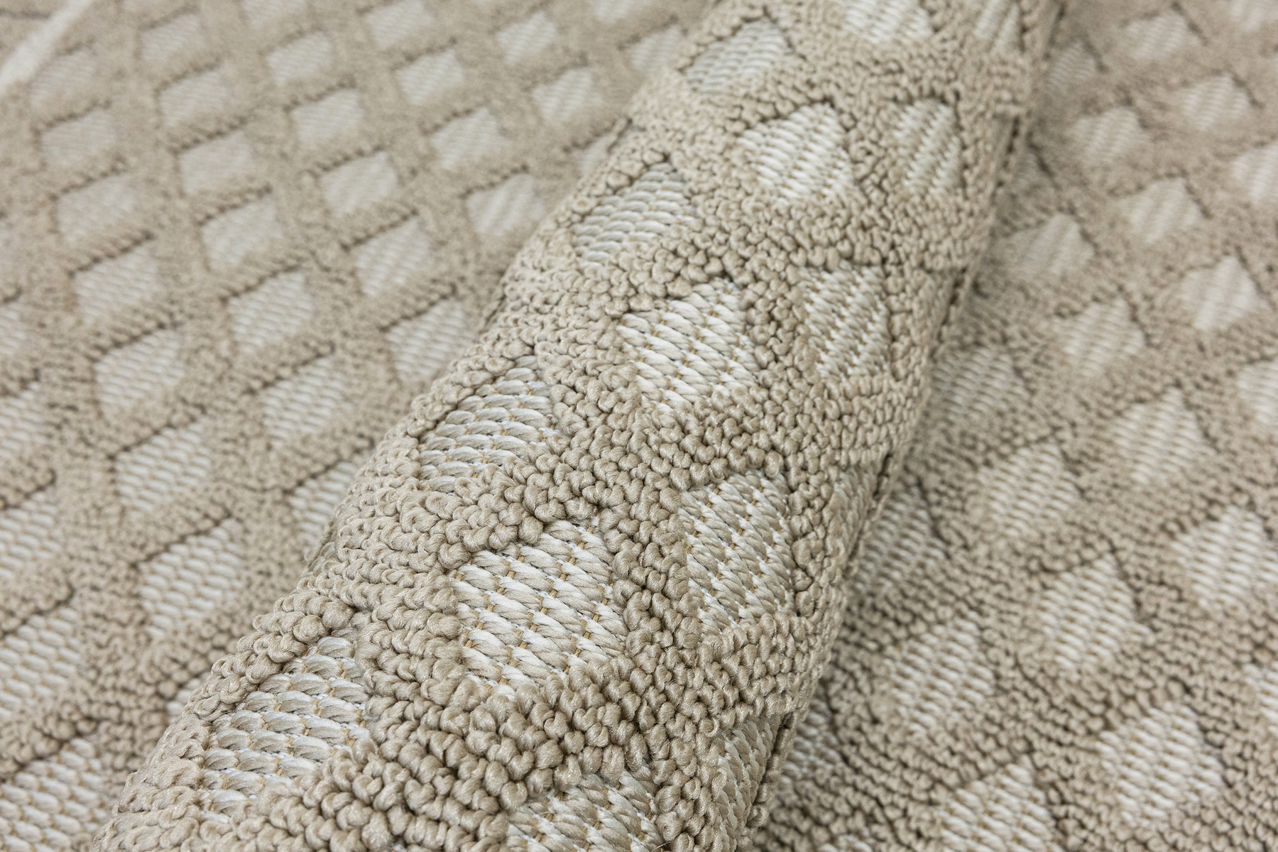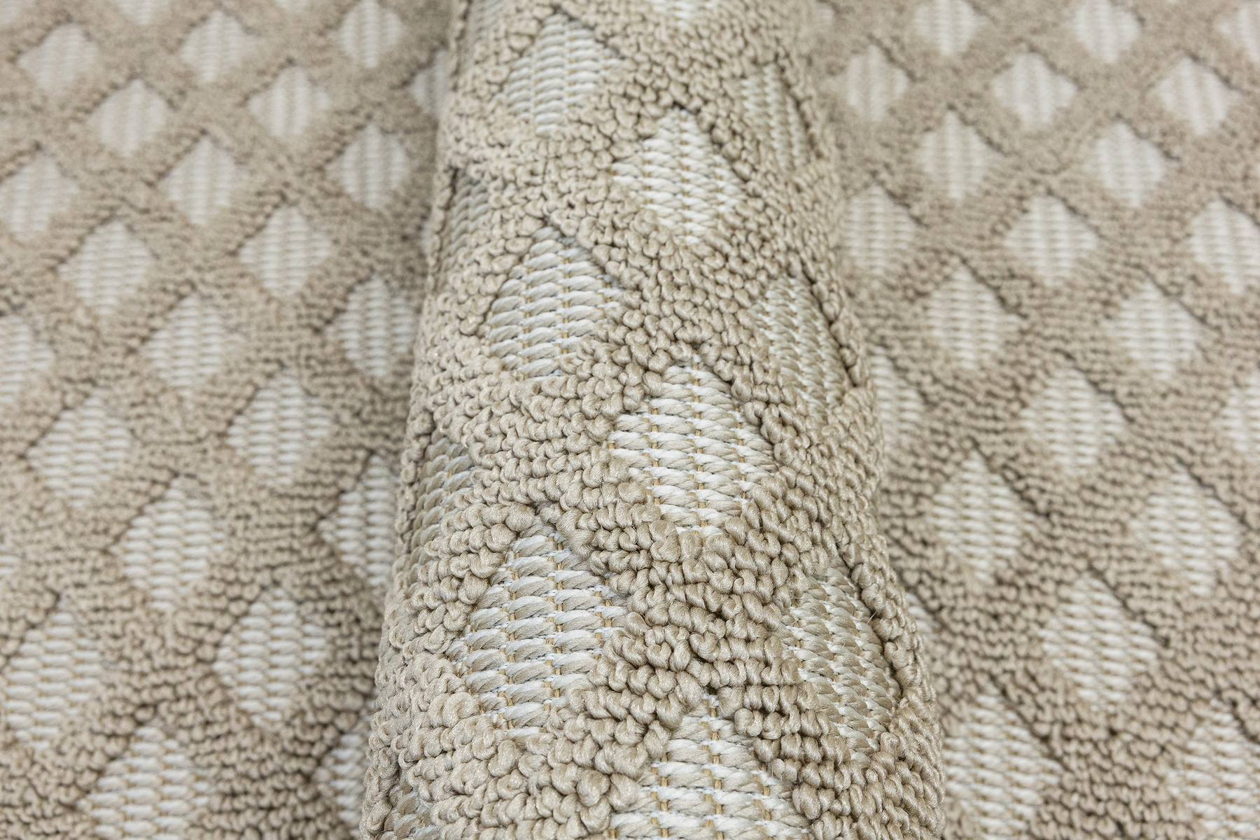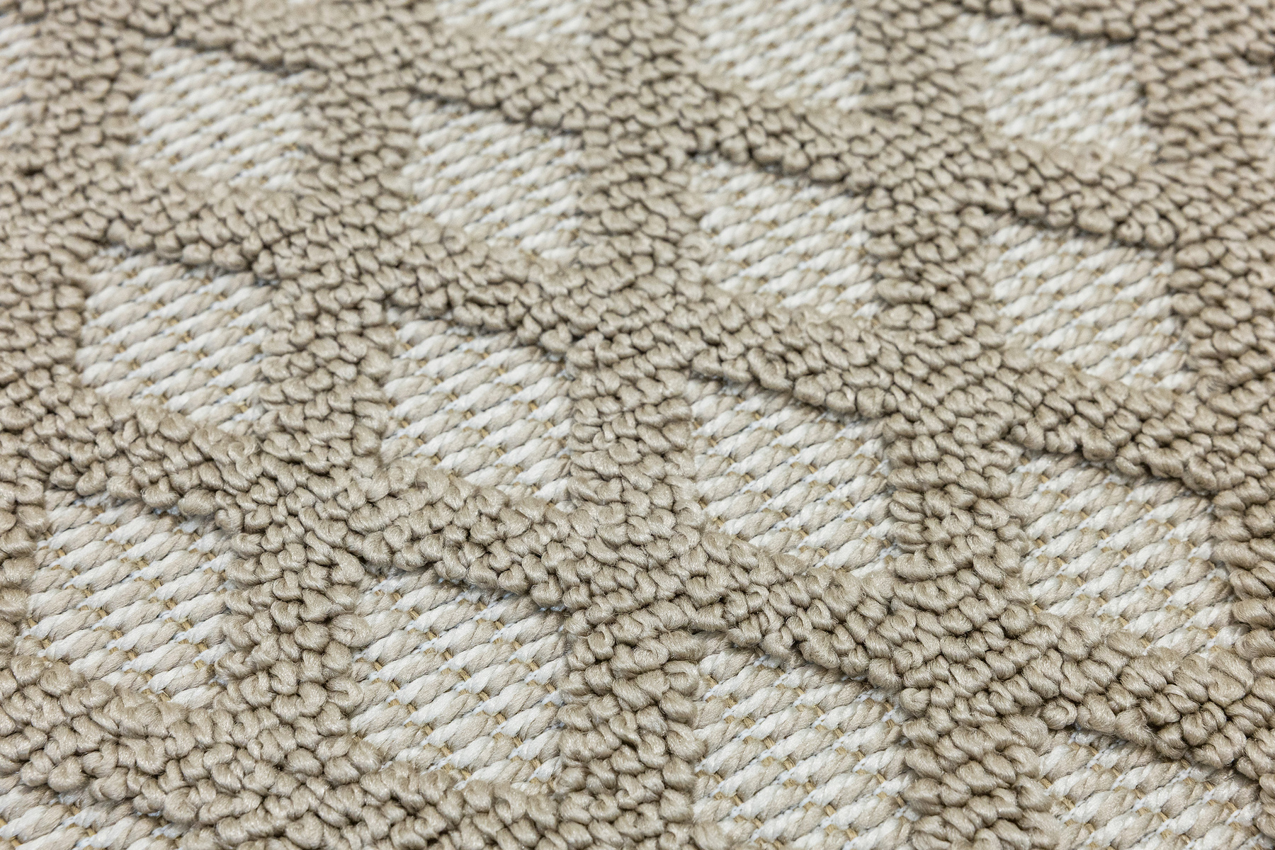 • Dywan Milano z runem o dwóch poziomach będących efektownym połączeniem splotu sznurkowego i pętelkowego, ze wzorem w romby i zygzaki w kaszmirowych beżach i kremach z krańcami zakończonymi frędzelkami.