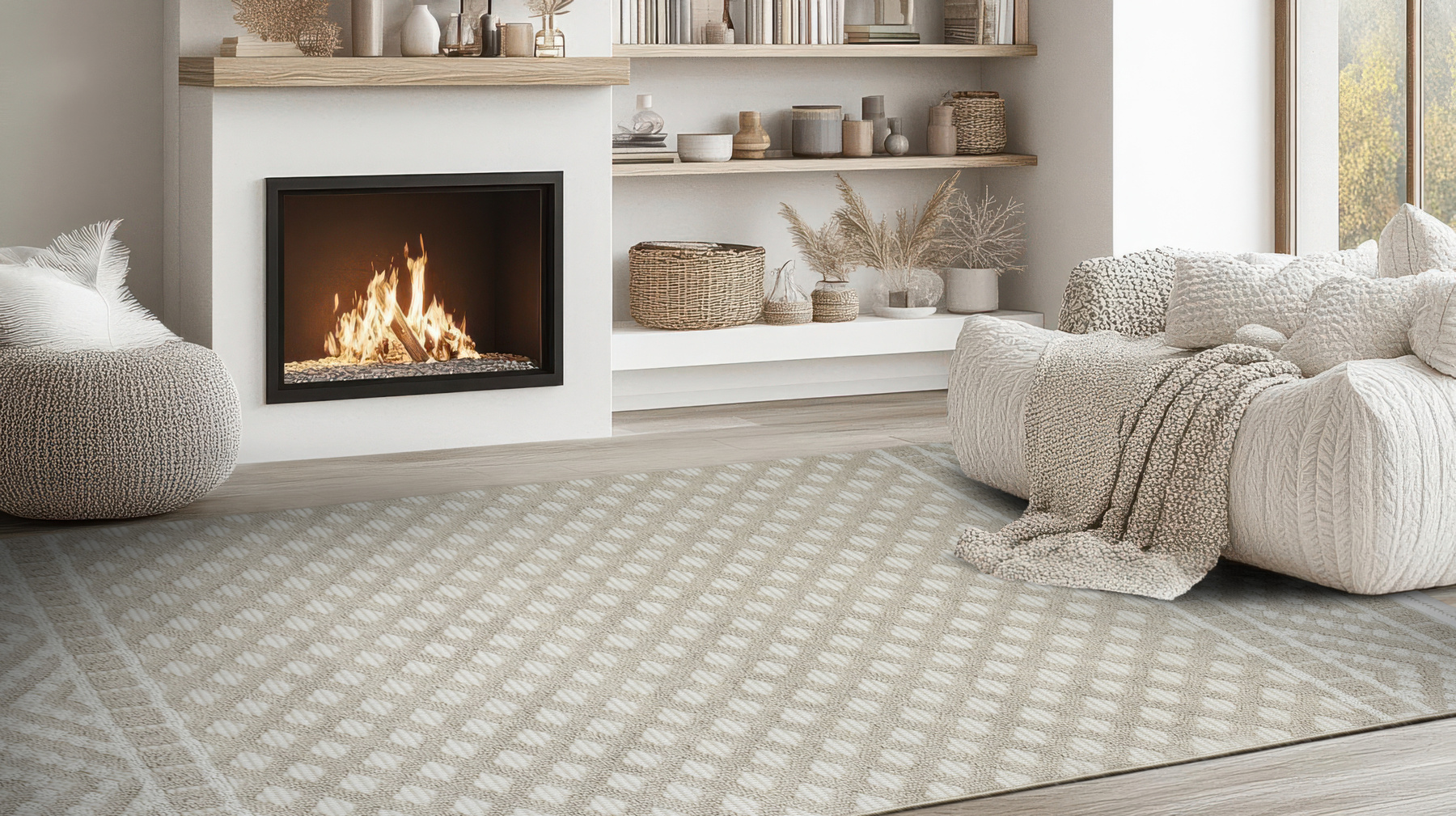 - Dywan Milano z runem o dwóch poziomach będących efektownym połączeniem splotu sznurkowego i pętelkowego, ze wzorem w romby i zygzaki w kaszmirowych beżach i kremach z krańcami zakończonymi frędzelkami.