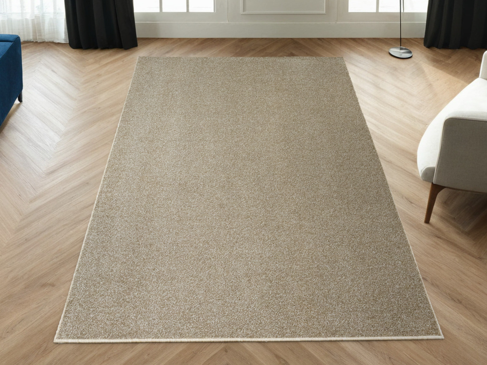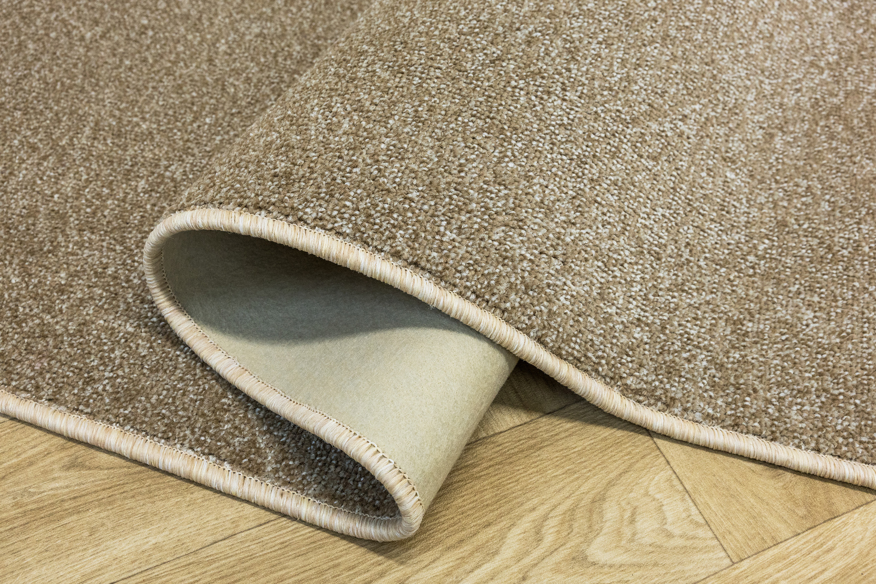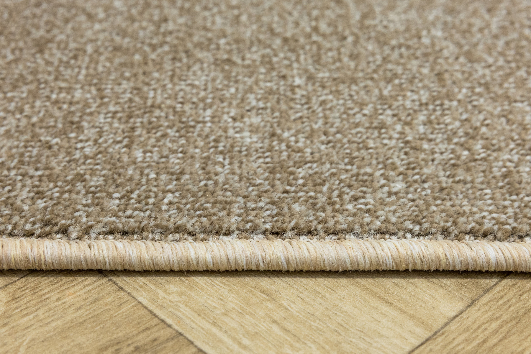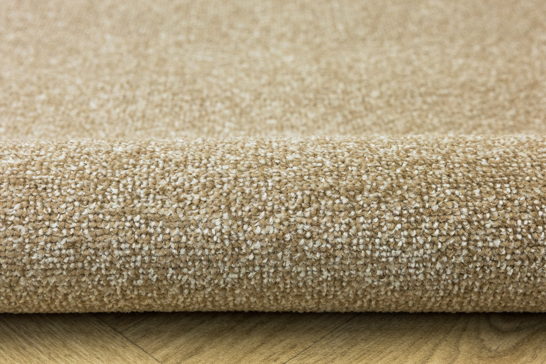- Dywan wykonany z wykładziny Lyon w melanżu odcieni beżu z miękkim runem ciętym typu saxon i spodem wykończonym filcem.