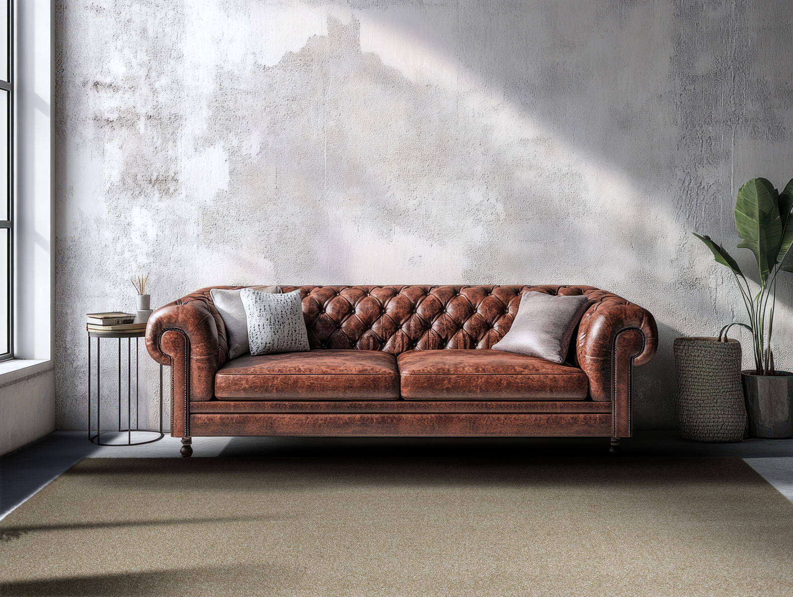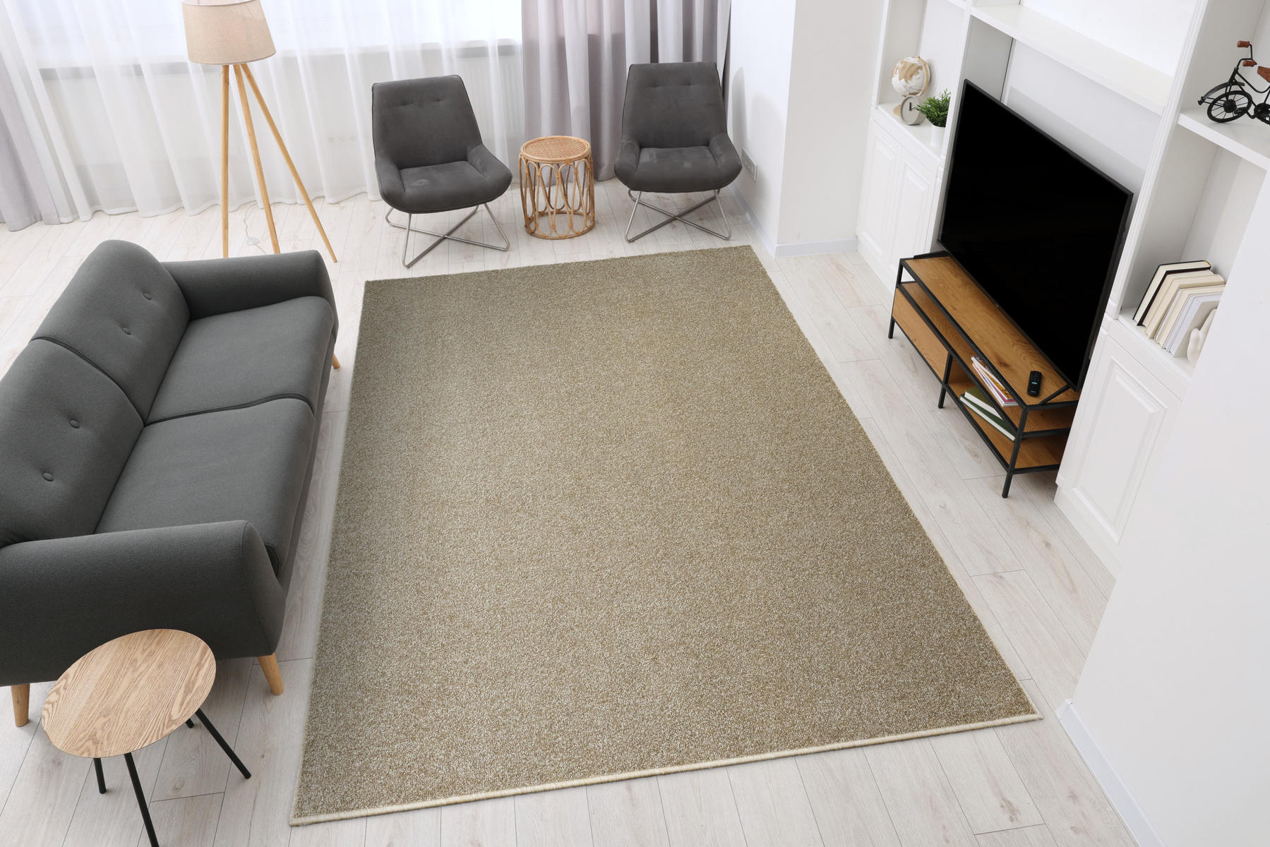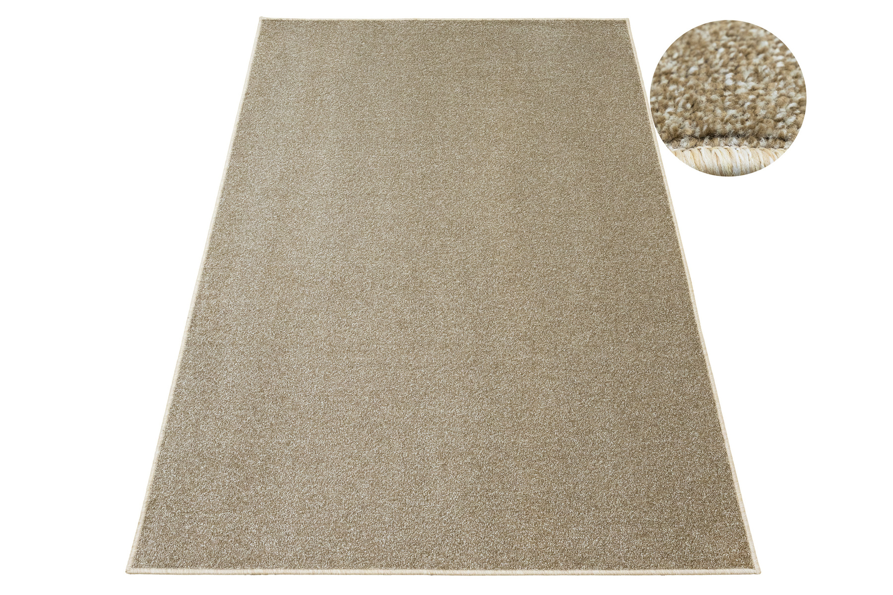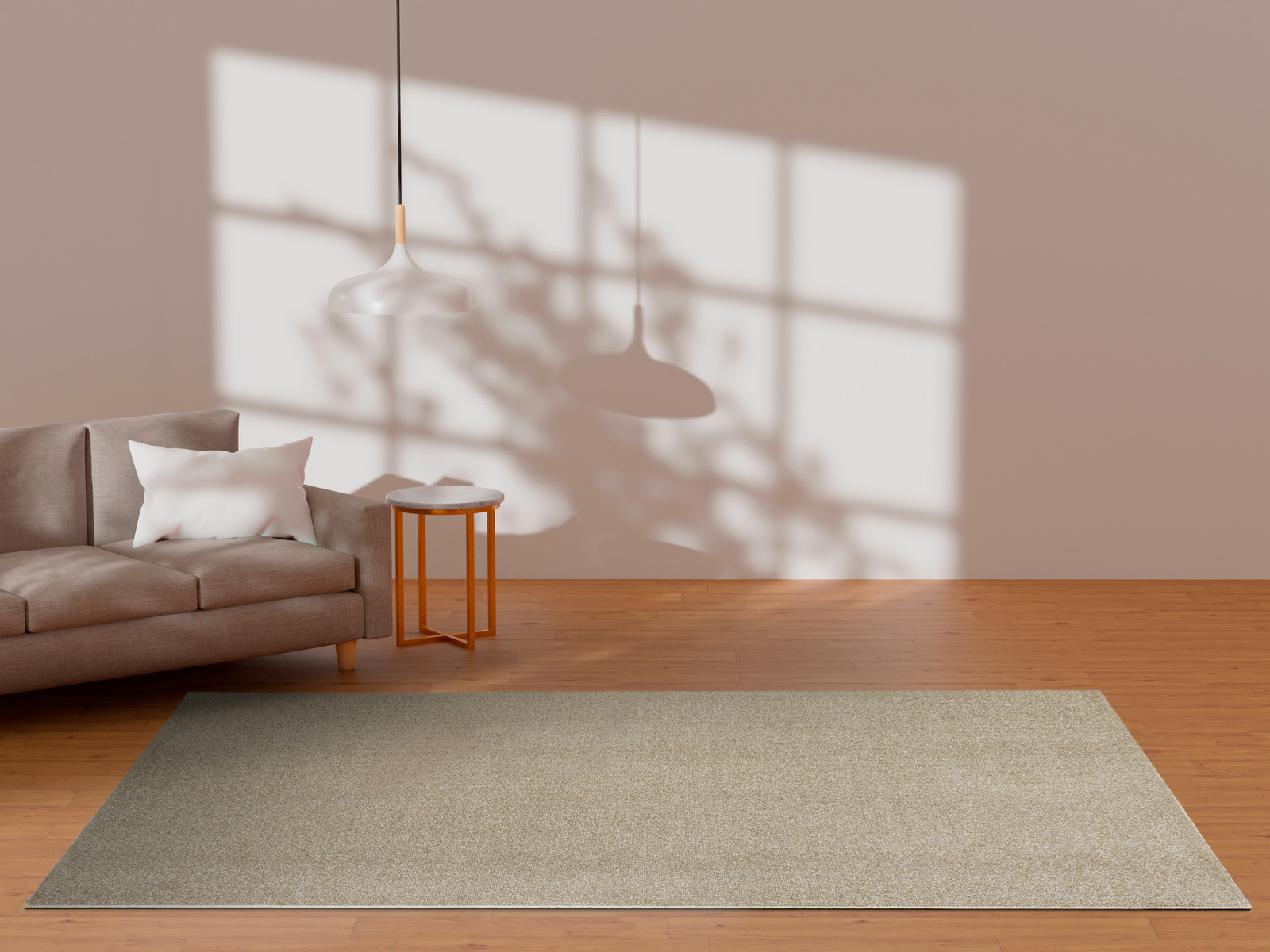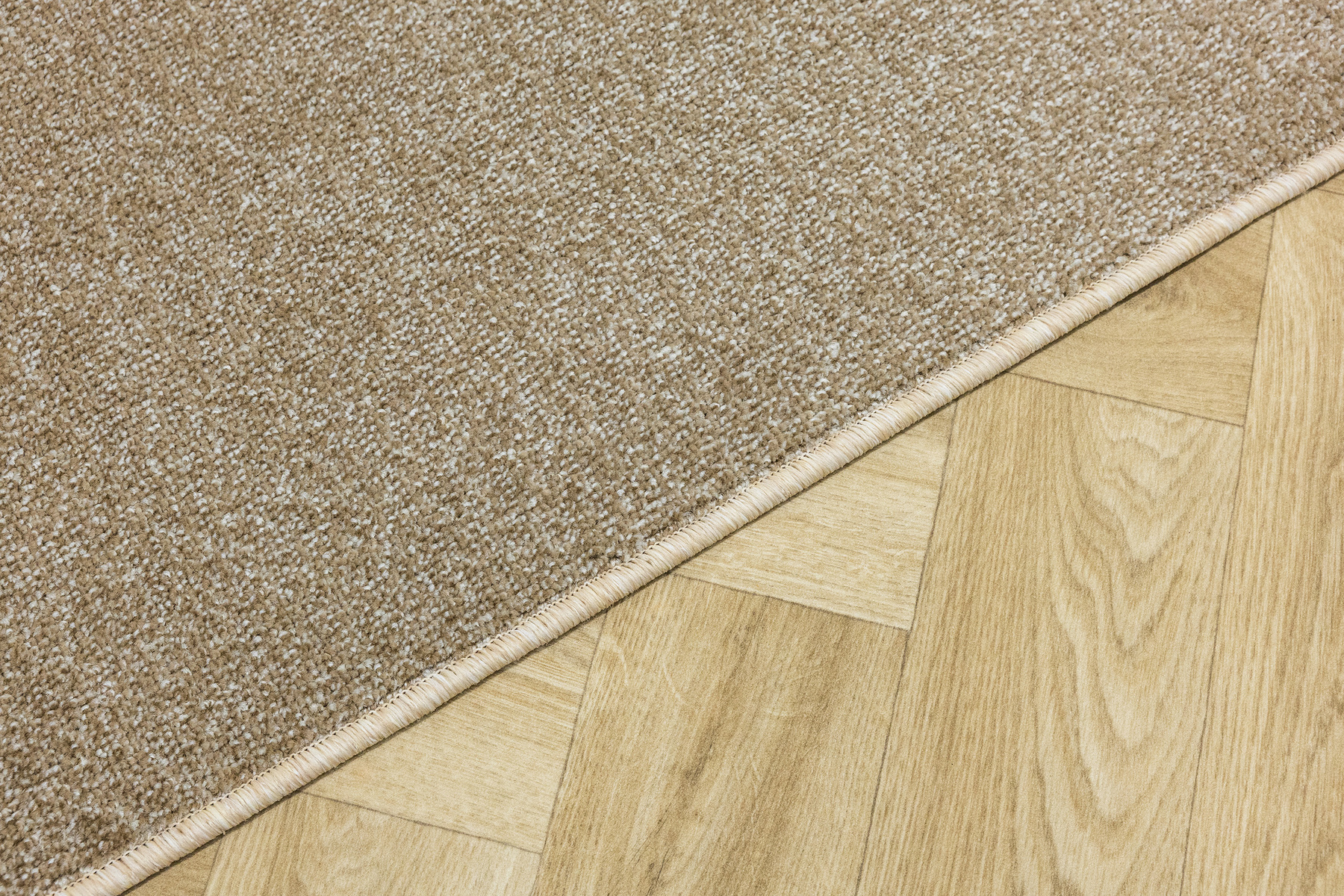 - Dywan wykonany z wykładziny Lyon w melanżu odcieni beżu z miękkim runem ciętym typu saxon i spodem wykończonym filcem.