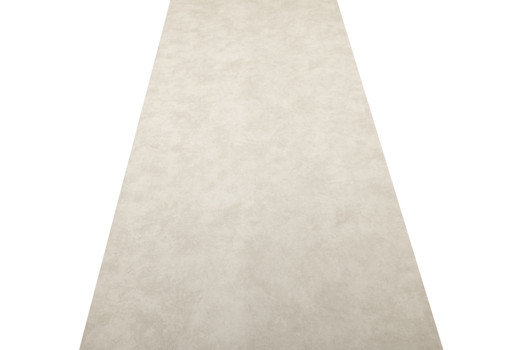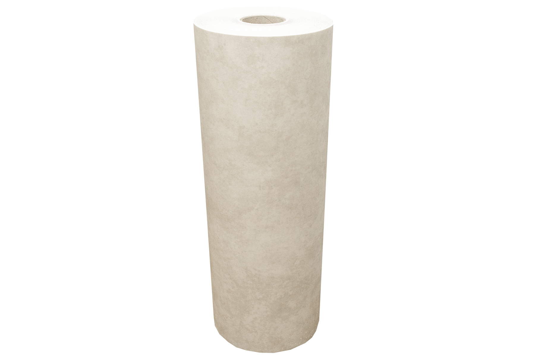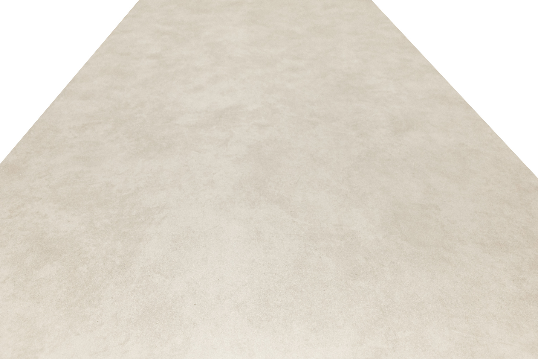 - Elastyczna wykładzina podłogowa PCV z wzorem imitującym podłogę betonową lub kamienną w odcieniach szarości zmieszanej z beżem i kremem, ze spodem wykończonym filcem.