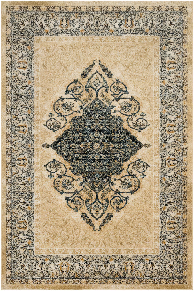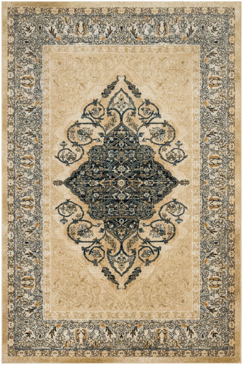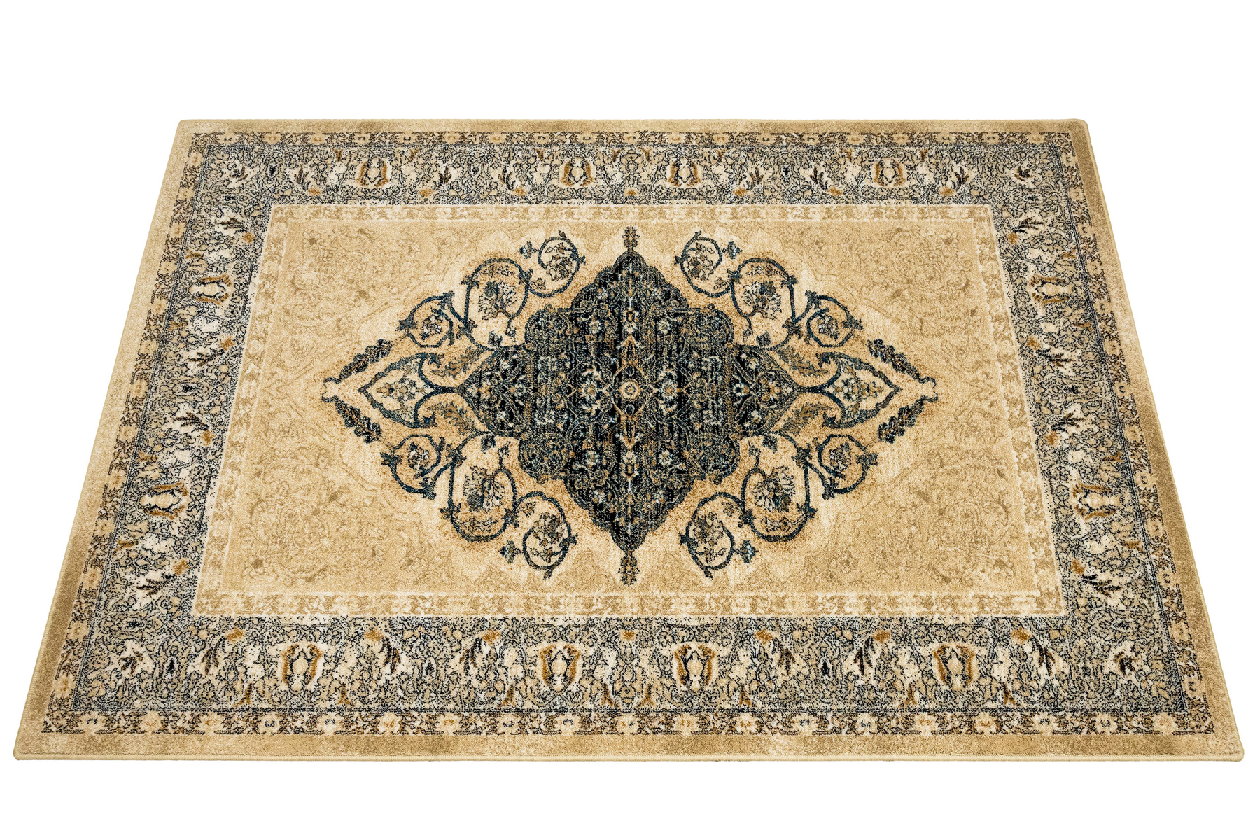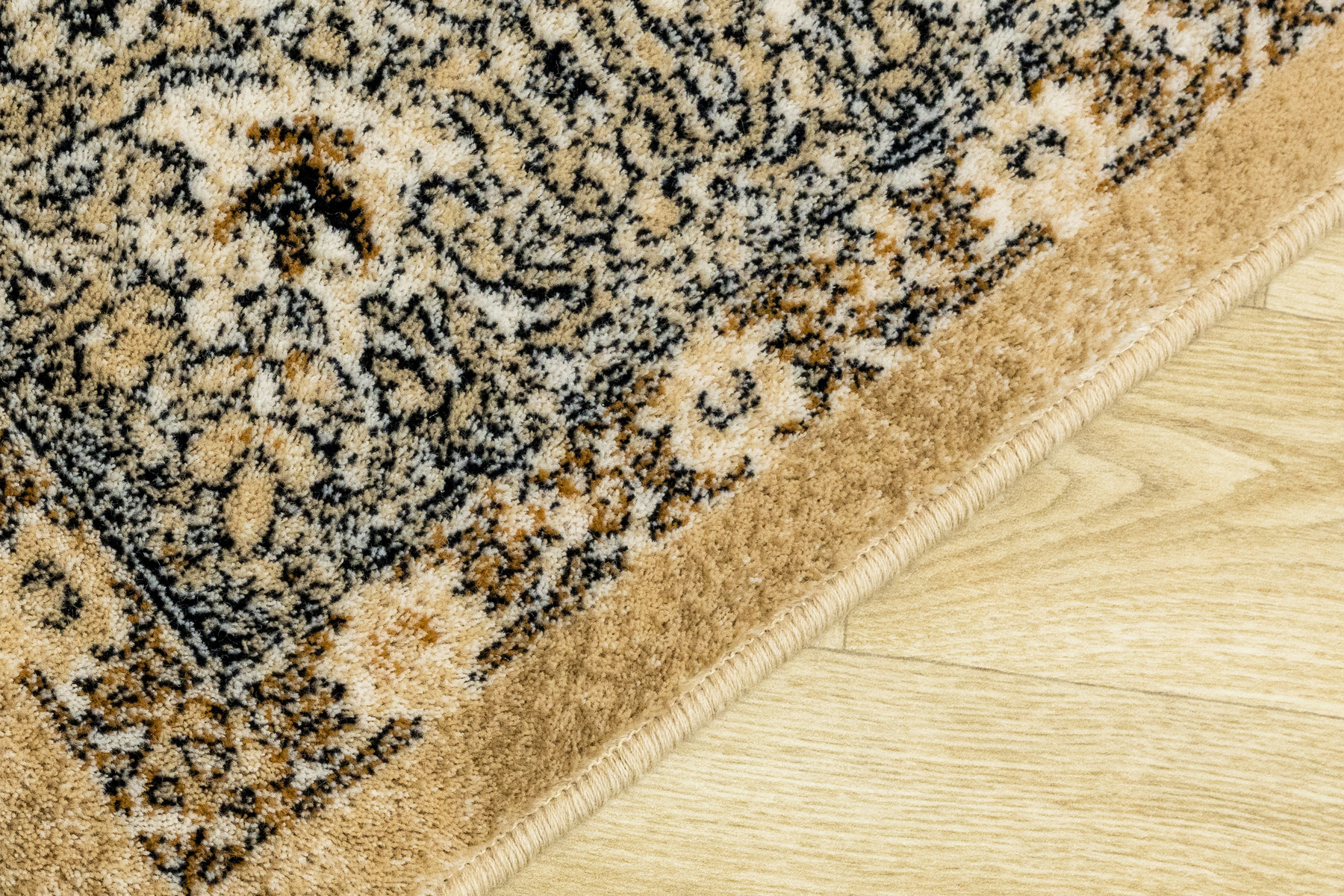 - Piękny, bogato zdobiony, wełniany dywan Agnella Isfahan Brenda inspirowany ornamentowym wzornictwem wschodnim w odcieniach beżu, kremu z elementami w butelkowej zieleni i czerni.