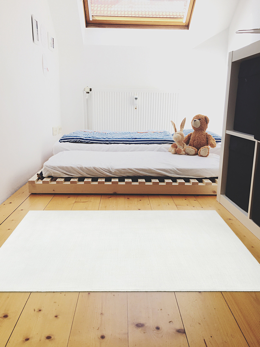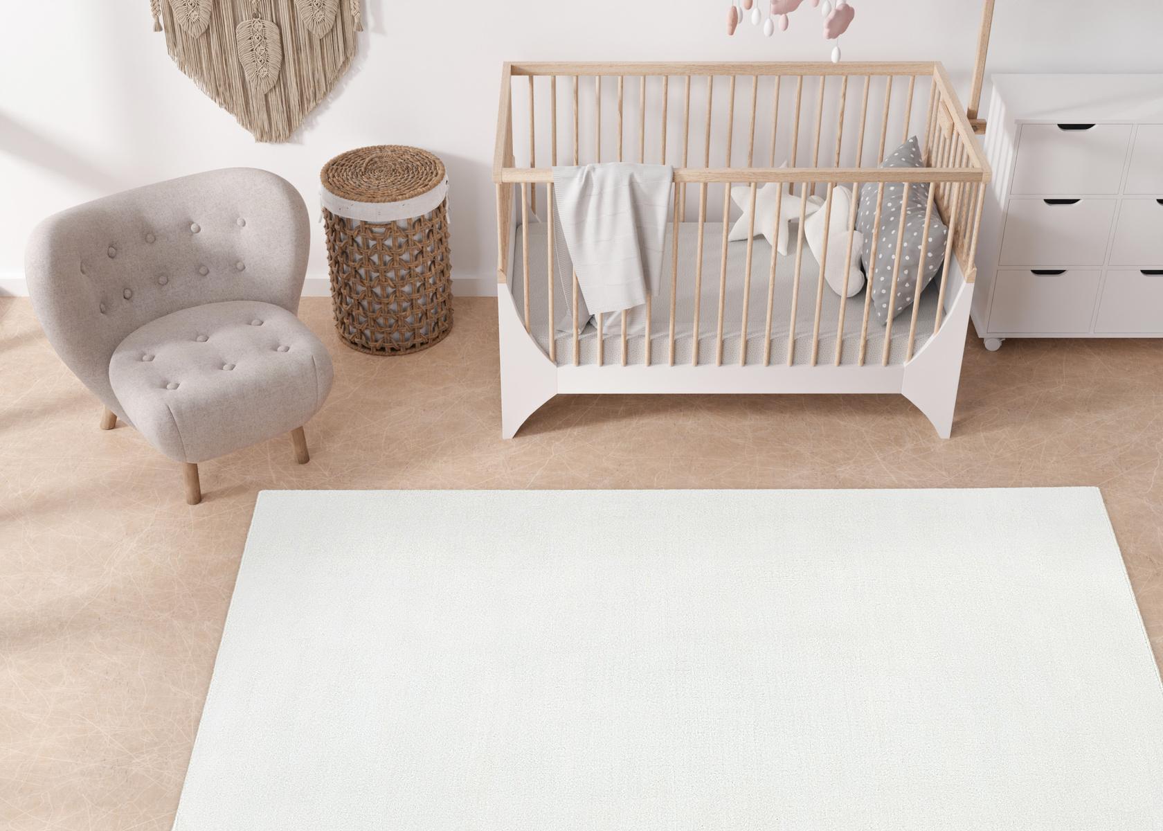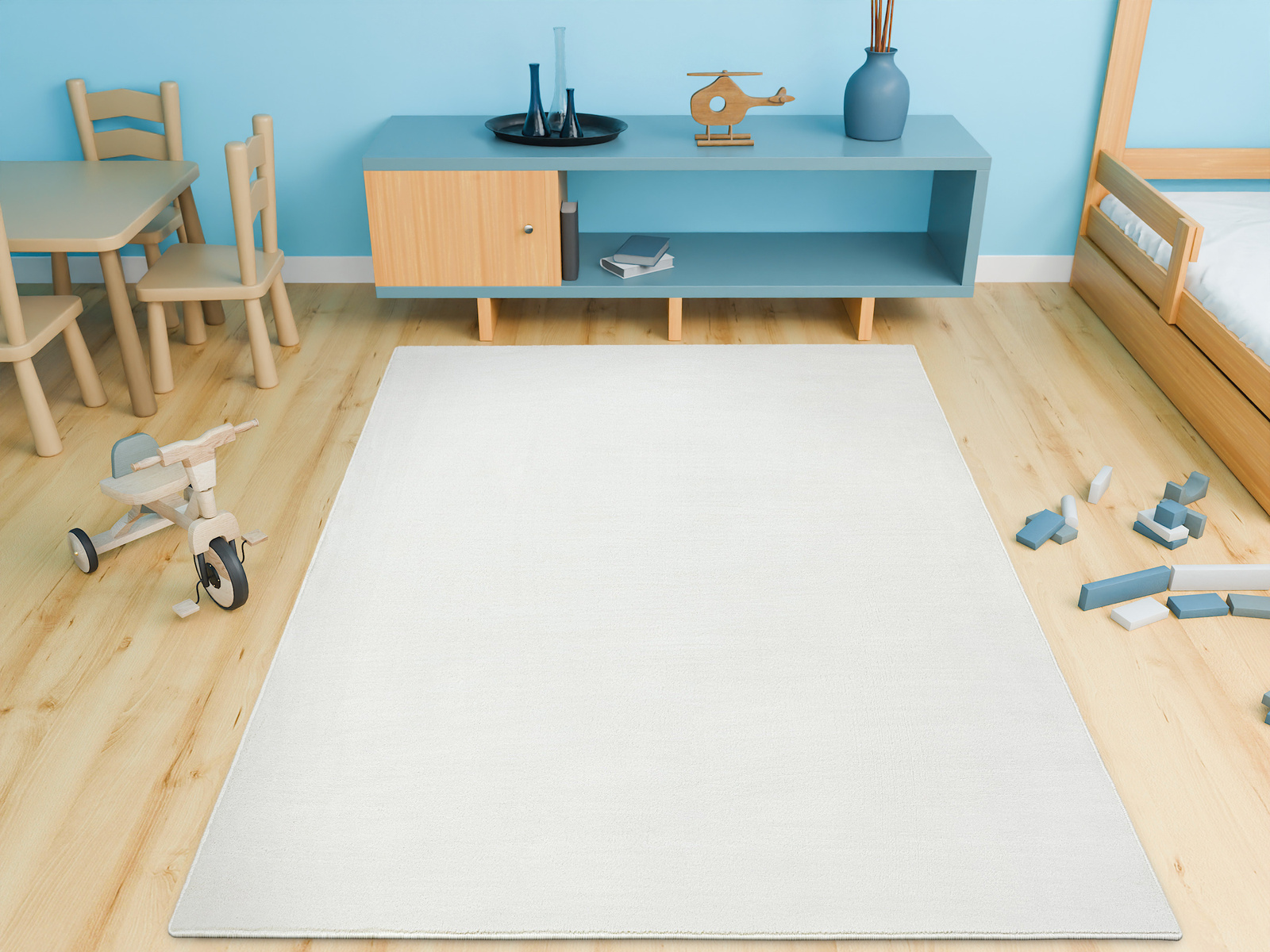 - Mięciutki dywan Plush o puszystym, gęstym, lśniącym runie imitującym królicze futerko w odcieniu kremu i z antypoślizgowym spodem.