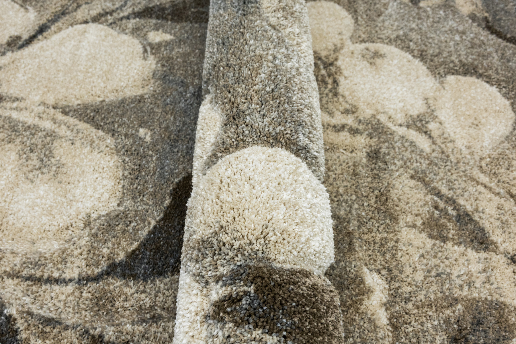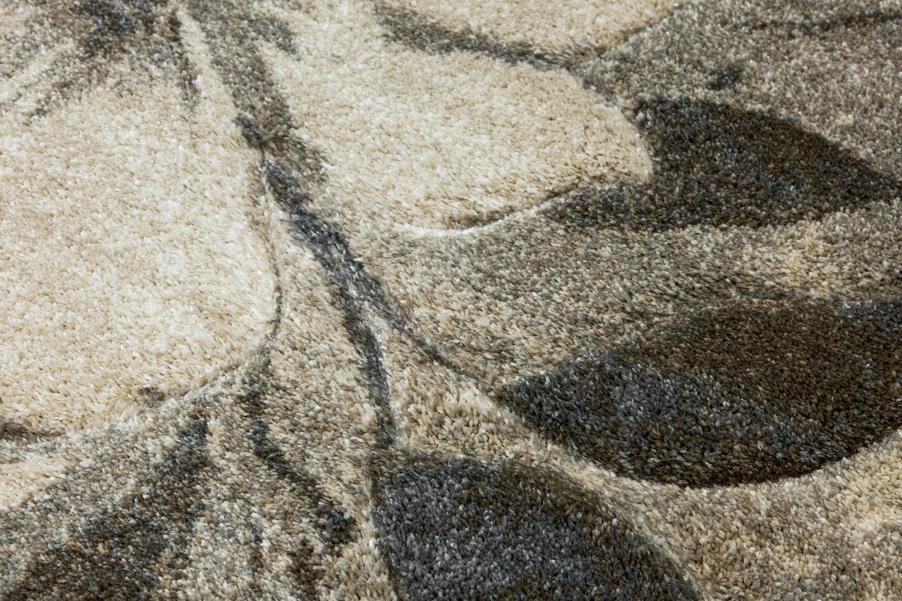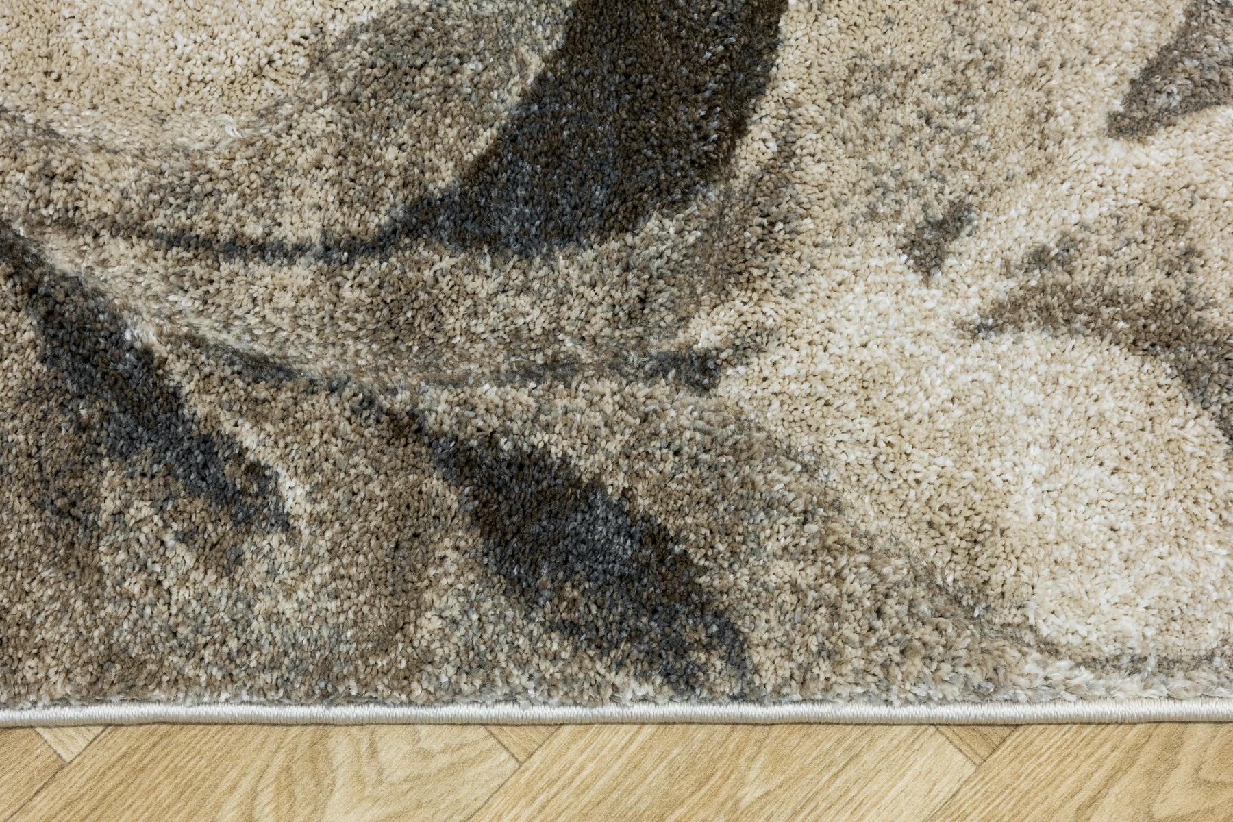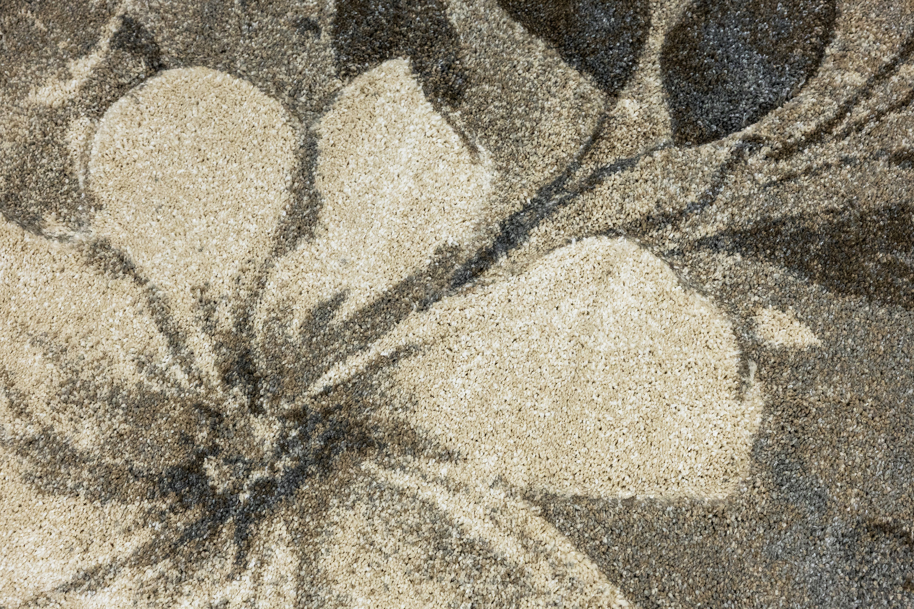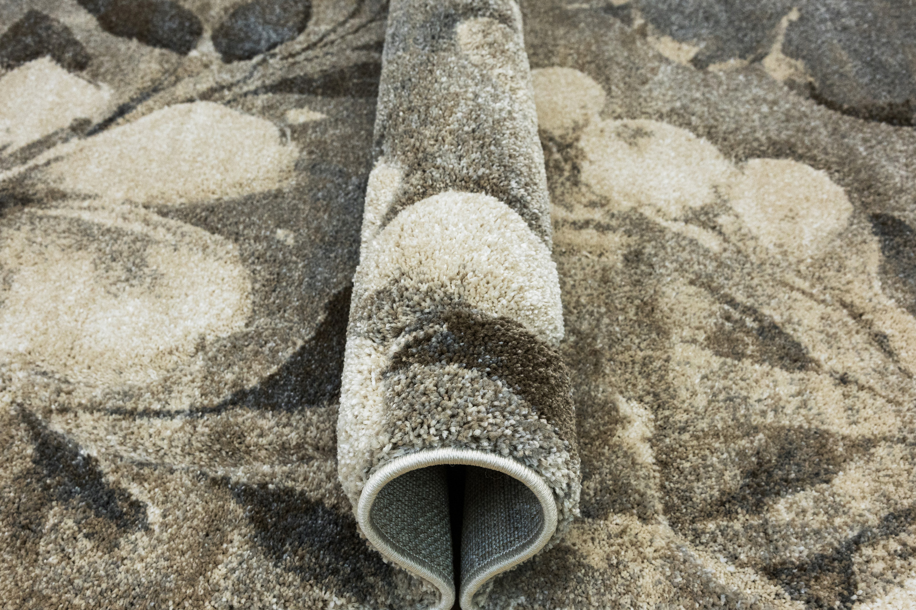 • Miękki i przyjemny w dotyku dywan Kandy o grubym, wycinanym runie ozdobionym nowoczesnym, naturalnym wzorem florystycznym w szarościach, beżach, brązach z dodatkiem kaszmirowego kremu oraz spodem wykończonym jutą.