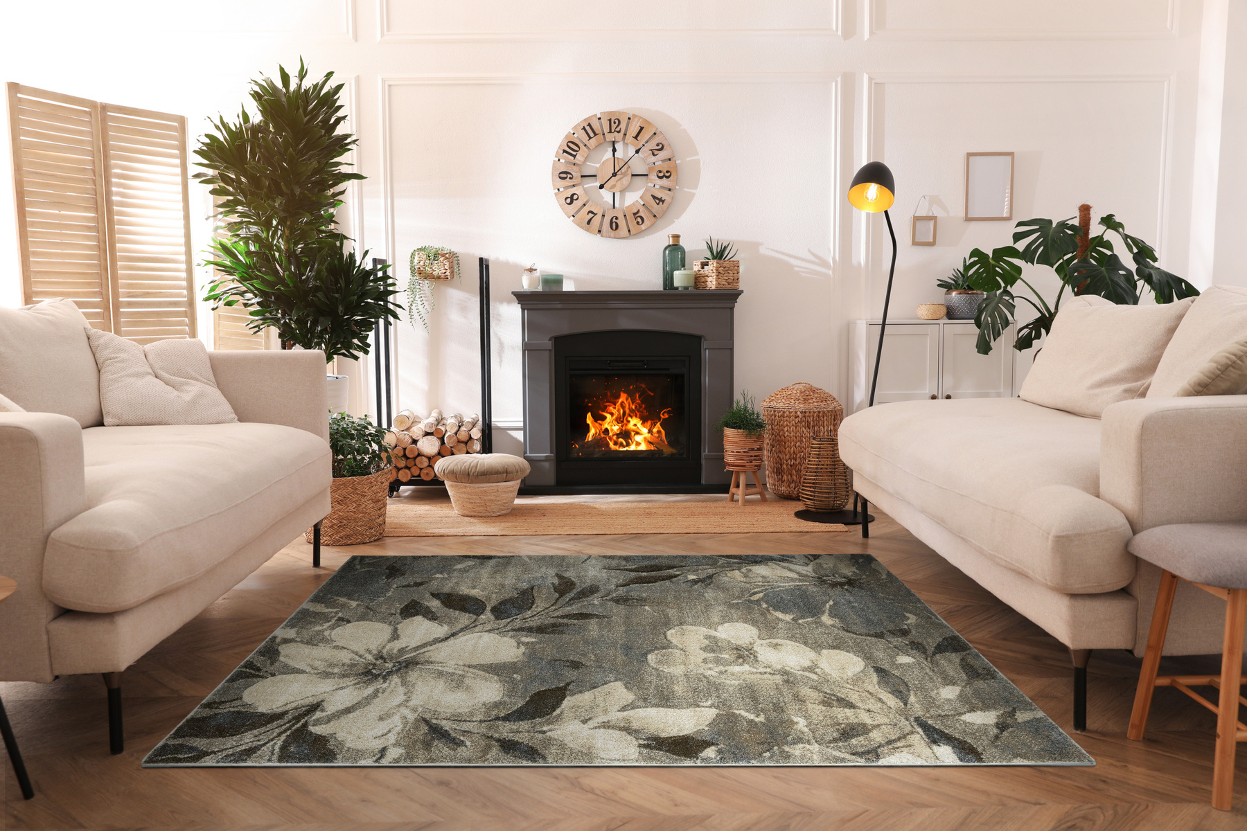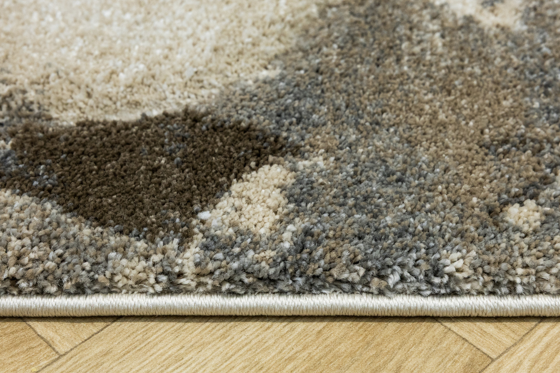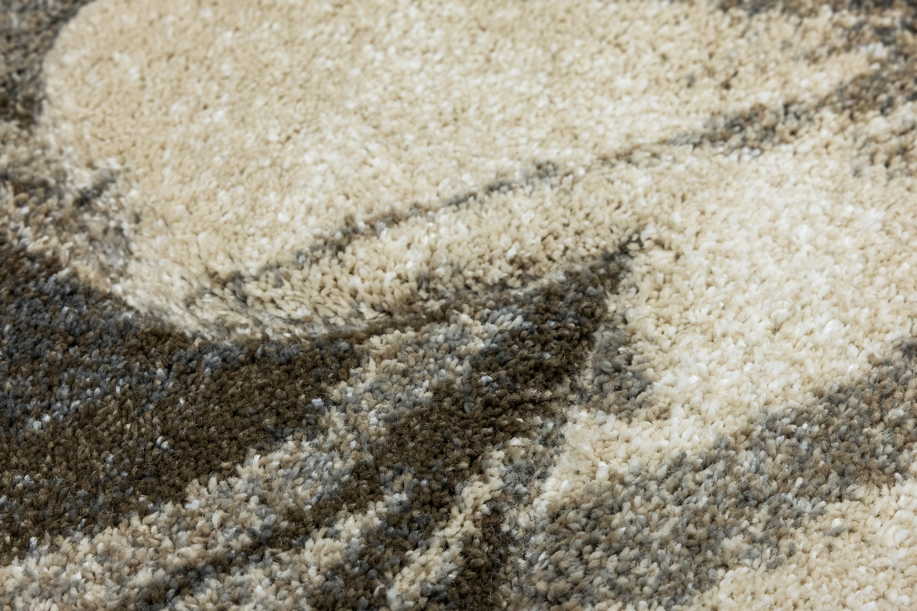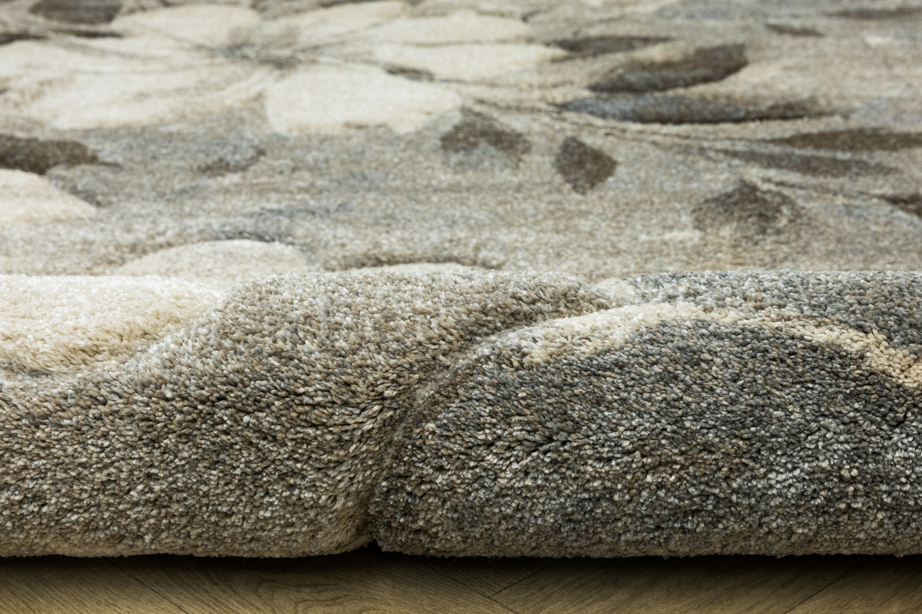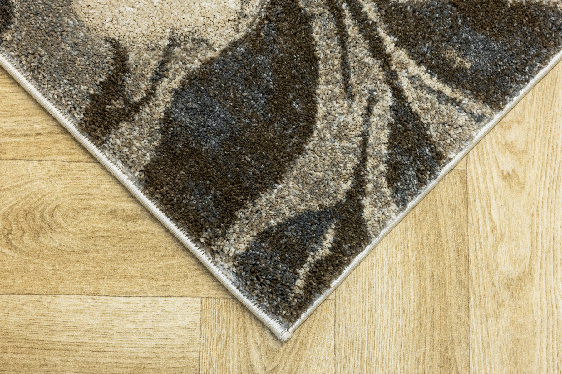 • Miękki i przyjemny w dotyku dywan Kandy o grubym, wycinanym runie ozdobionym nowoczesnym, naturalnym wzorem florystycznym w szarościach, beżach, brązach z dodatkiem kaszmirowego kremu oraz spodem wykończonym jutą.