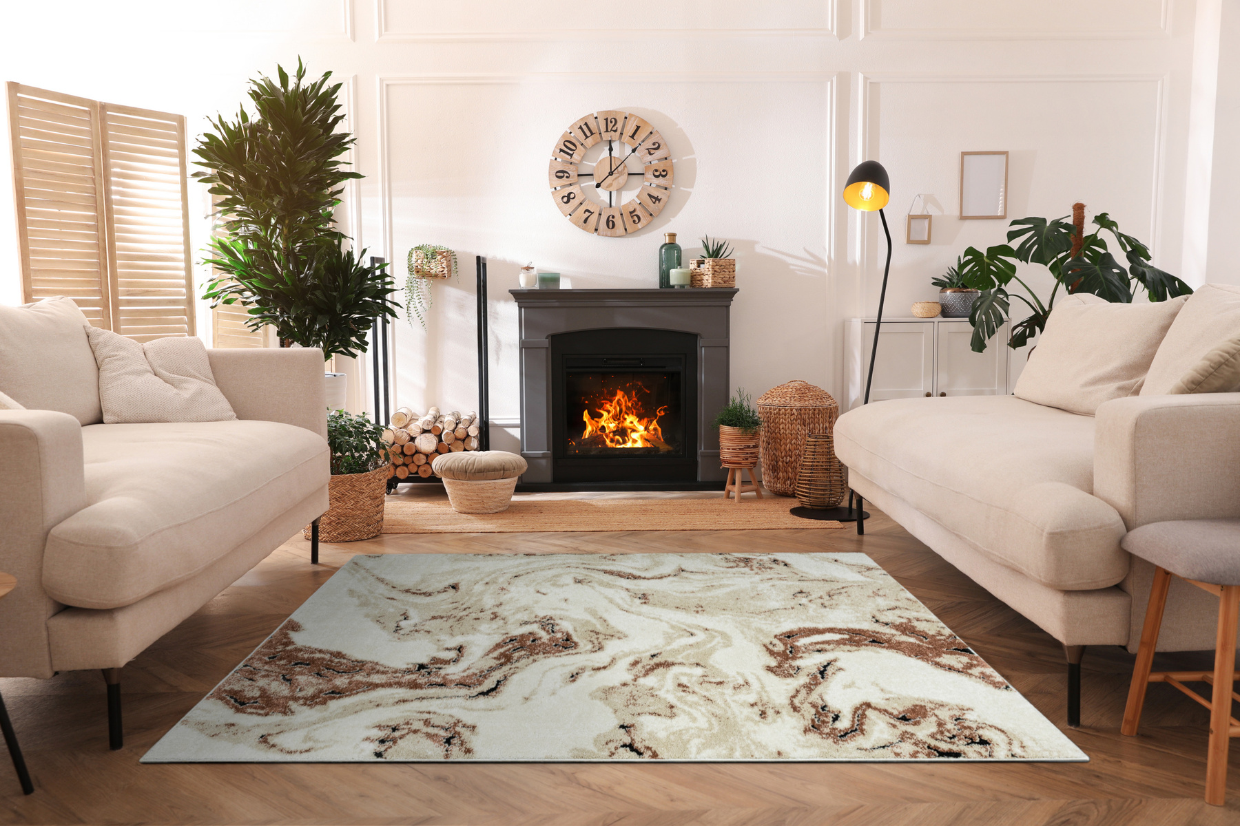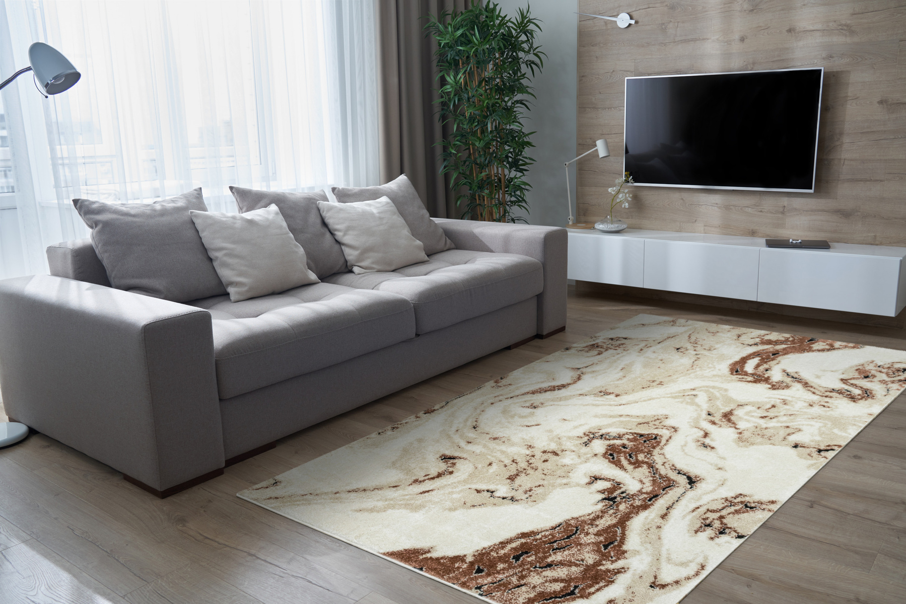 • Mięciutki i przyjemny w dotyku dywan Bosa o grubym dwupoziomowym runie z abstrakcyjnym wzorem w odcieniach kremu, kaszmirowego beżu z akcentem miedzi i antracytu oraz spodem wykończonym jutą.