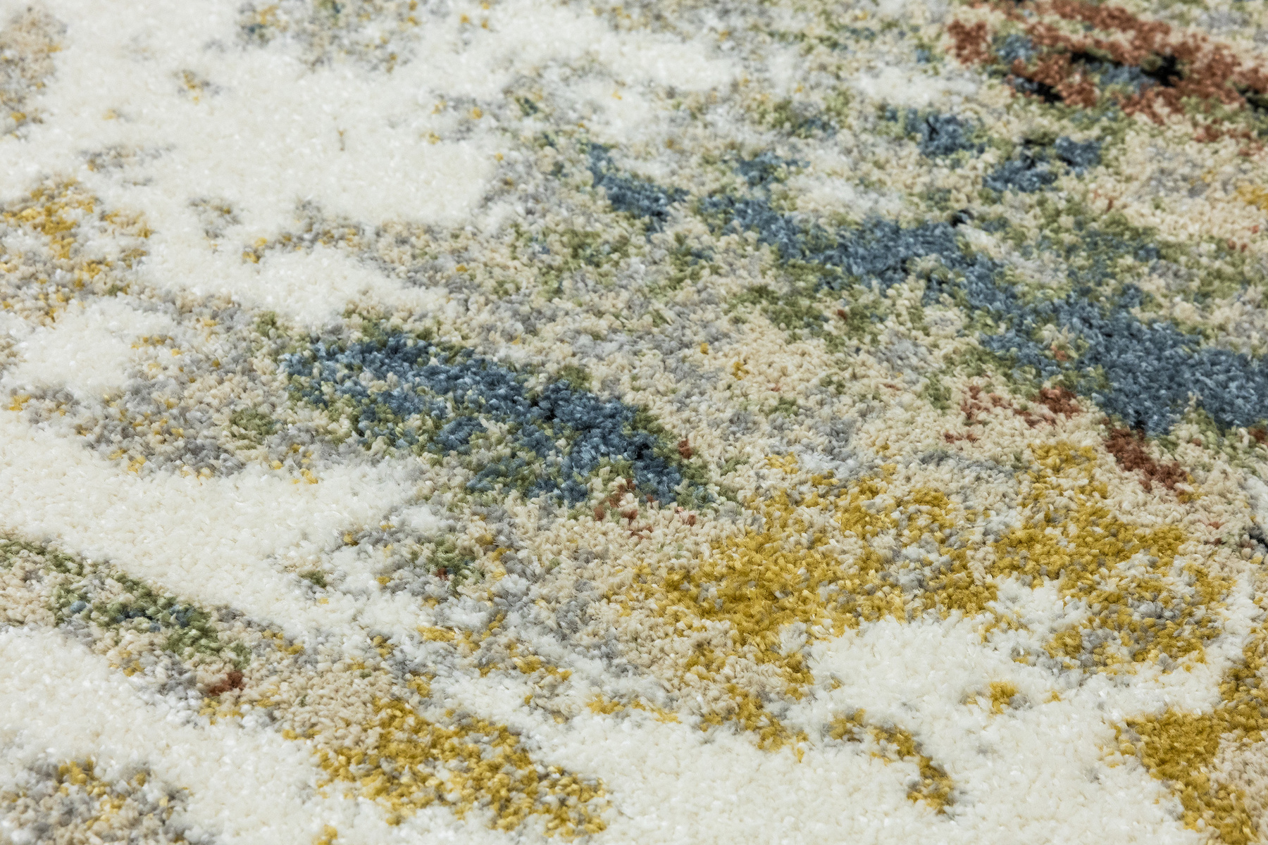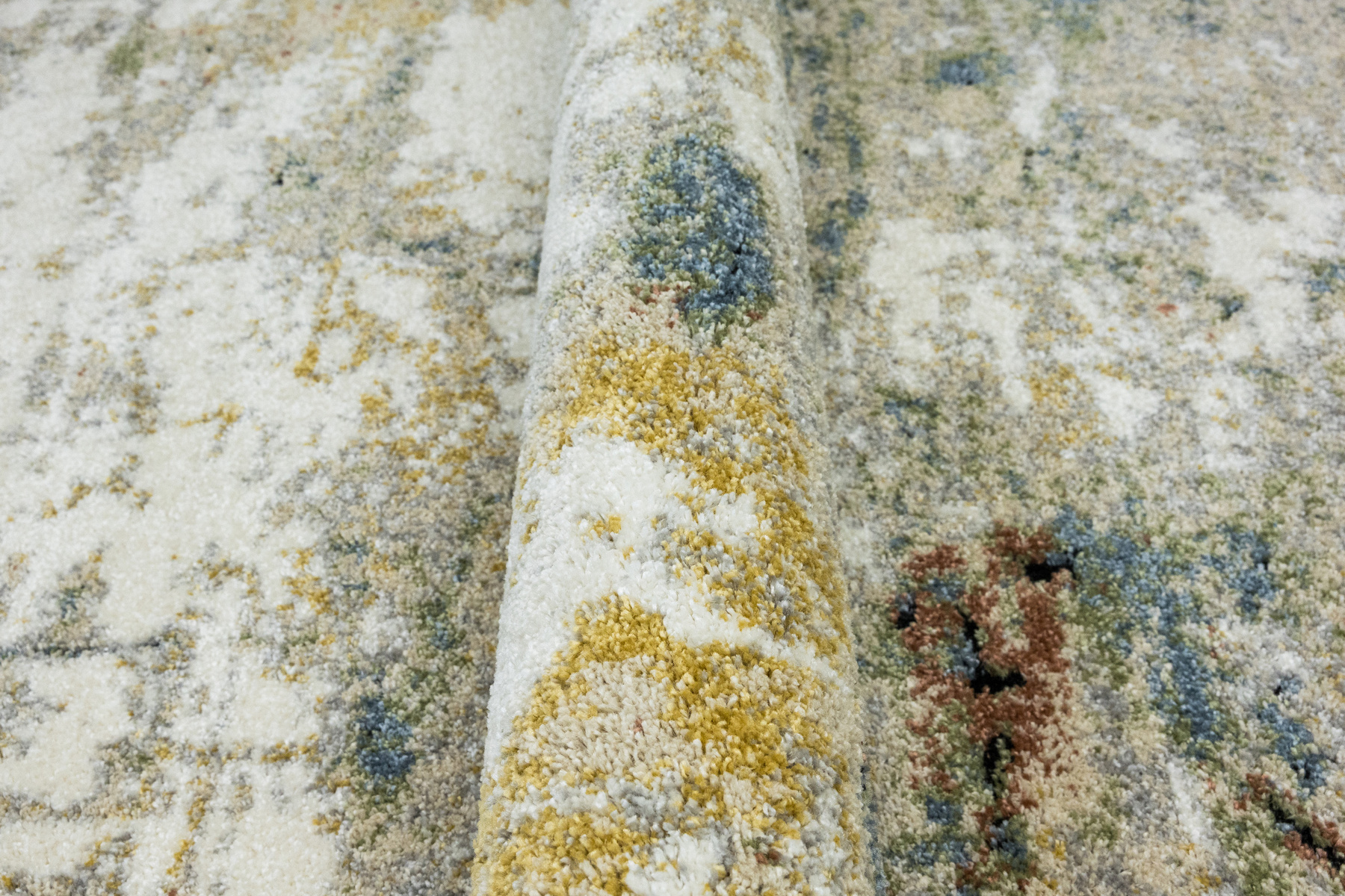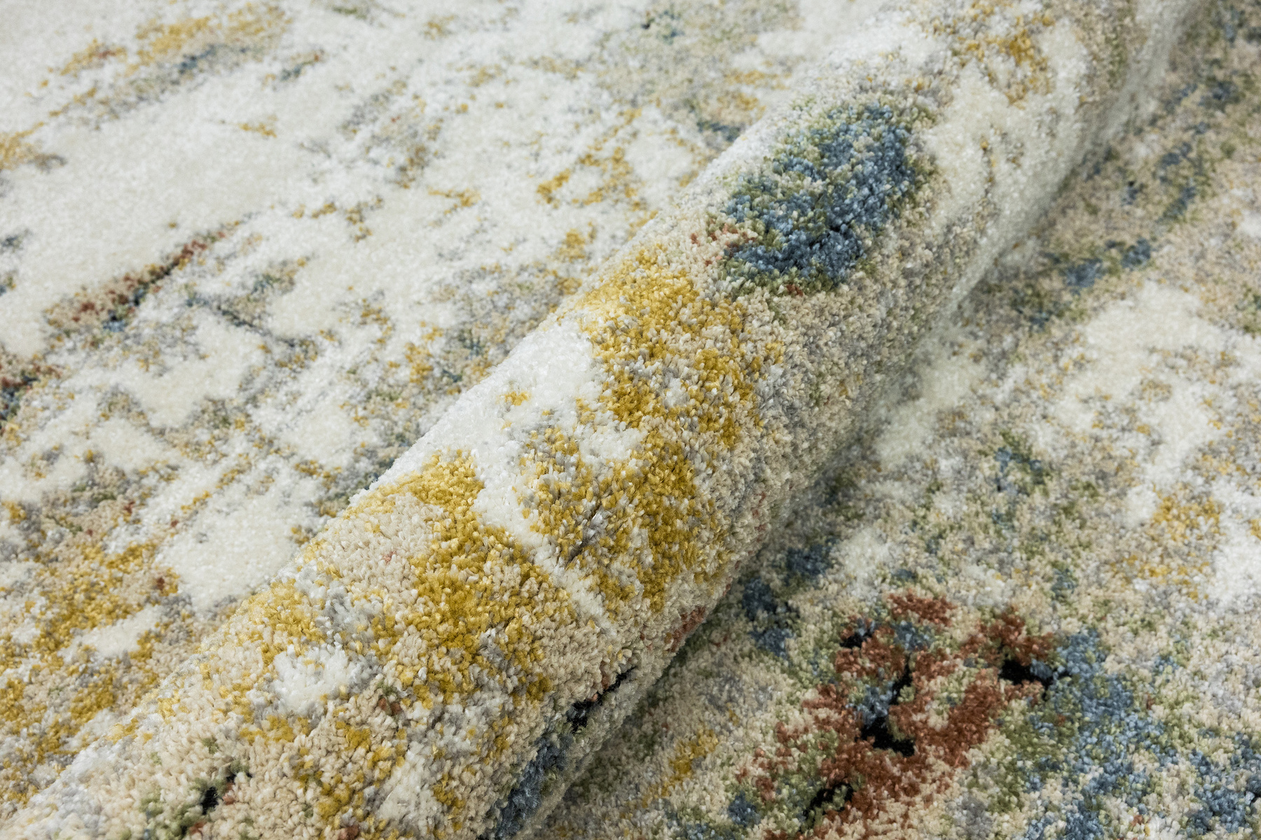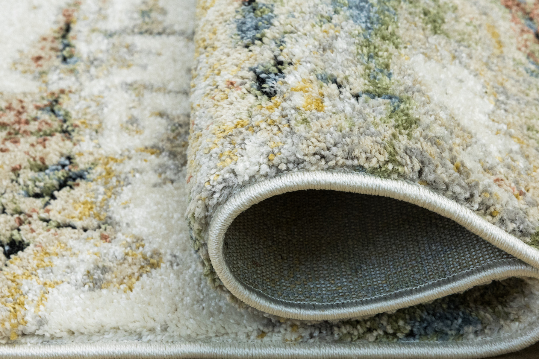 • Mięciutki i przyjemny w dotyku dywan Bosa o grubym dwupoziomowym runie z abstrakcyjnym wzorem w odcieniach kremu, kaszmirowego beżu z akcentem miedzi, niebieskiego, żółtego, oliwkowej zieleni i antracytu oraz spodem wykończonym jutą.