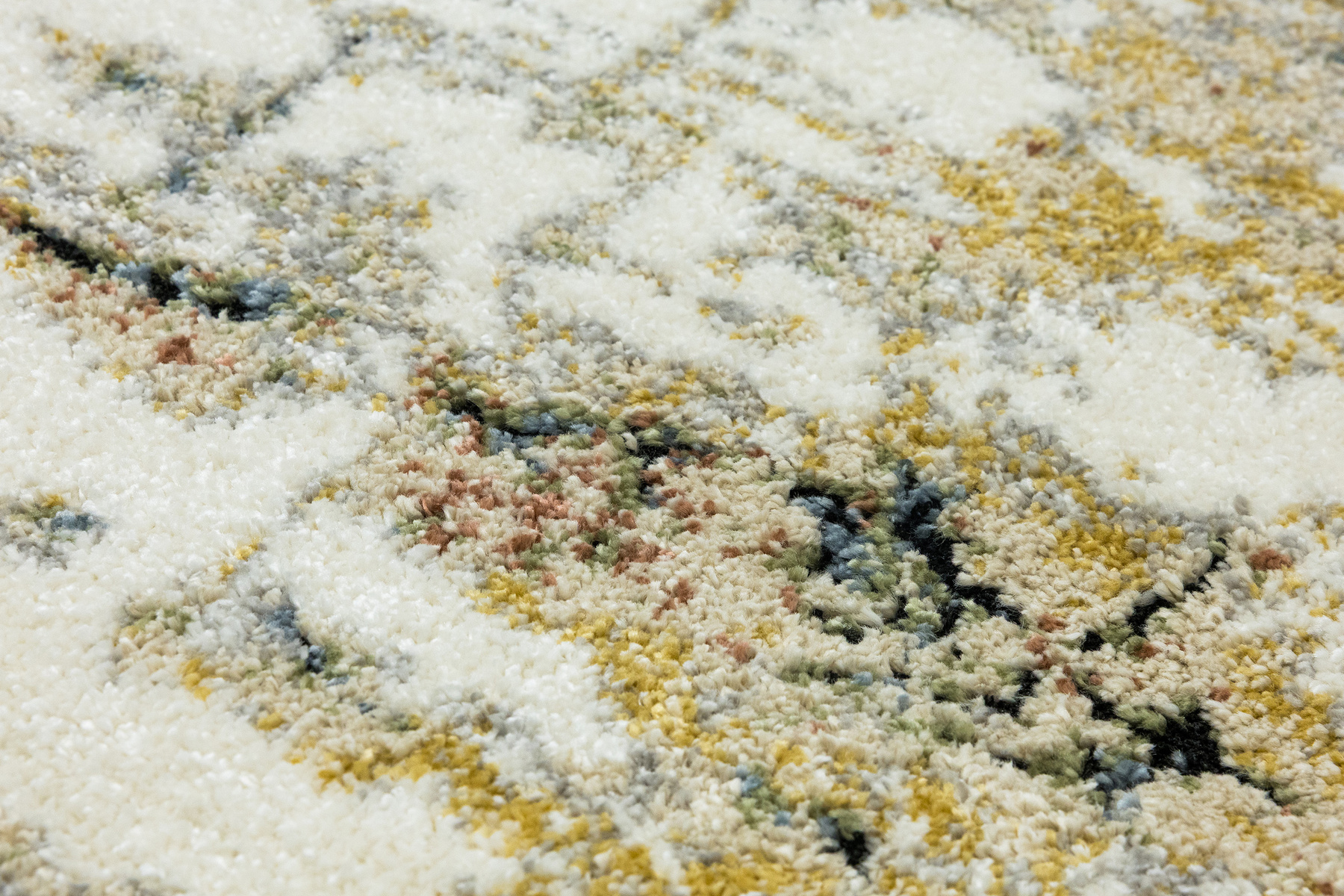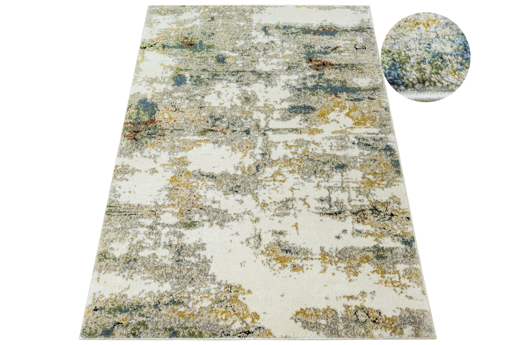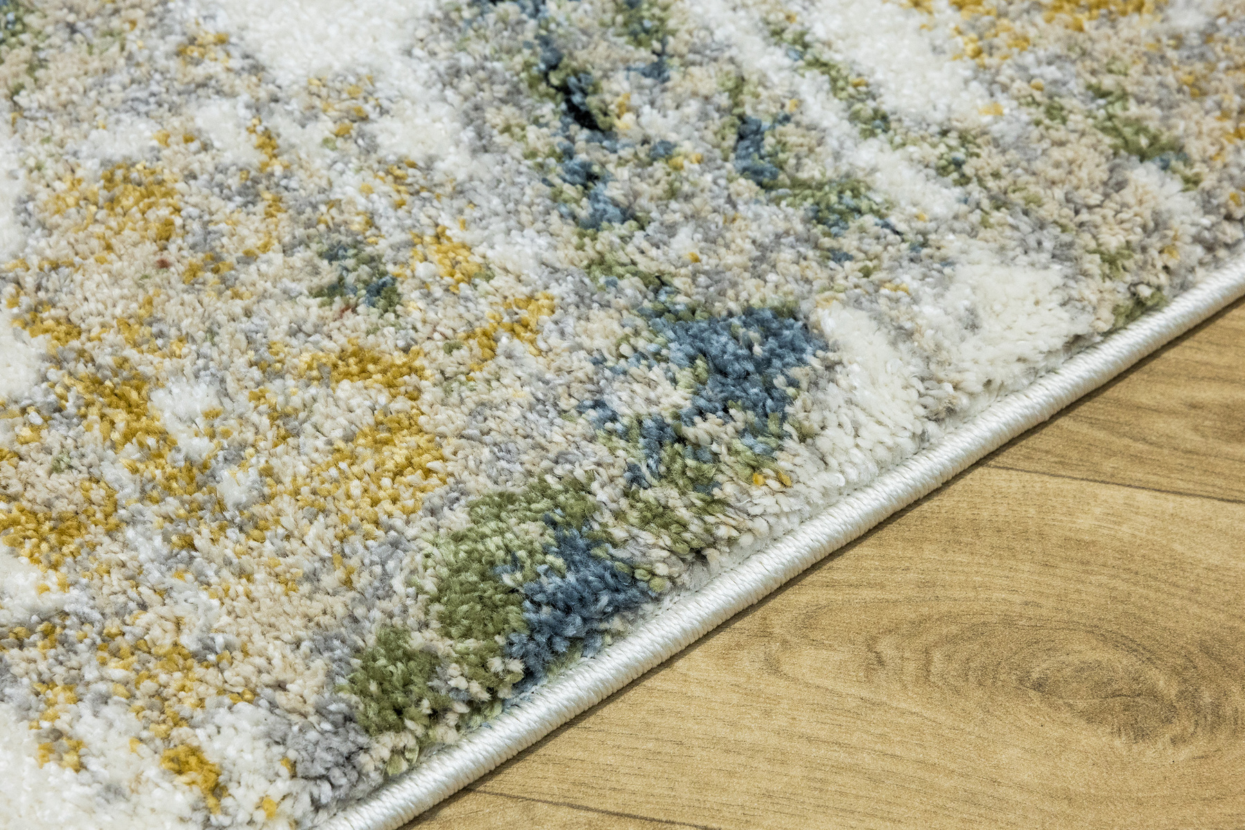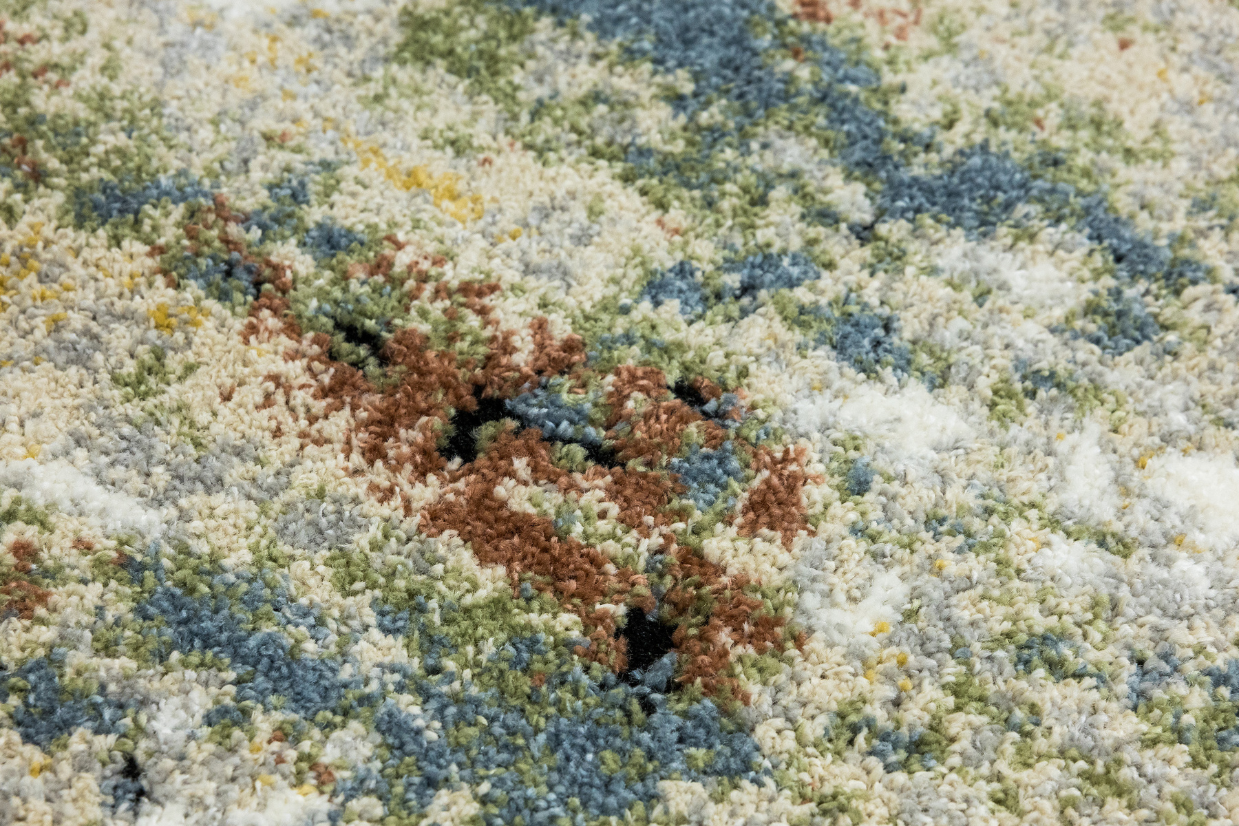 • Mięciutki i przyjemny w dotyku dywan Bosa o grubym dwupoziomowym runie z abstrakcyjnym wzorem w odcieniach kremu, kaszmirowego beżu z akcentem miedzi, niebieskiego, żółtego, oliwkowej zieleni i antracytu oraz spodem wykończonym jutą.