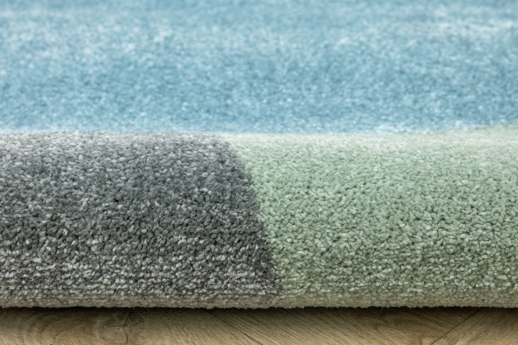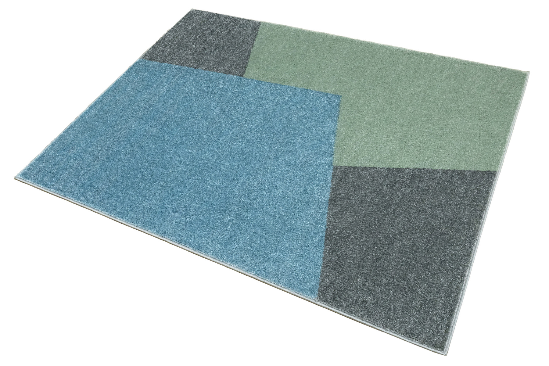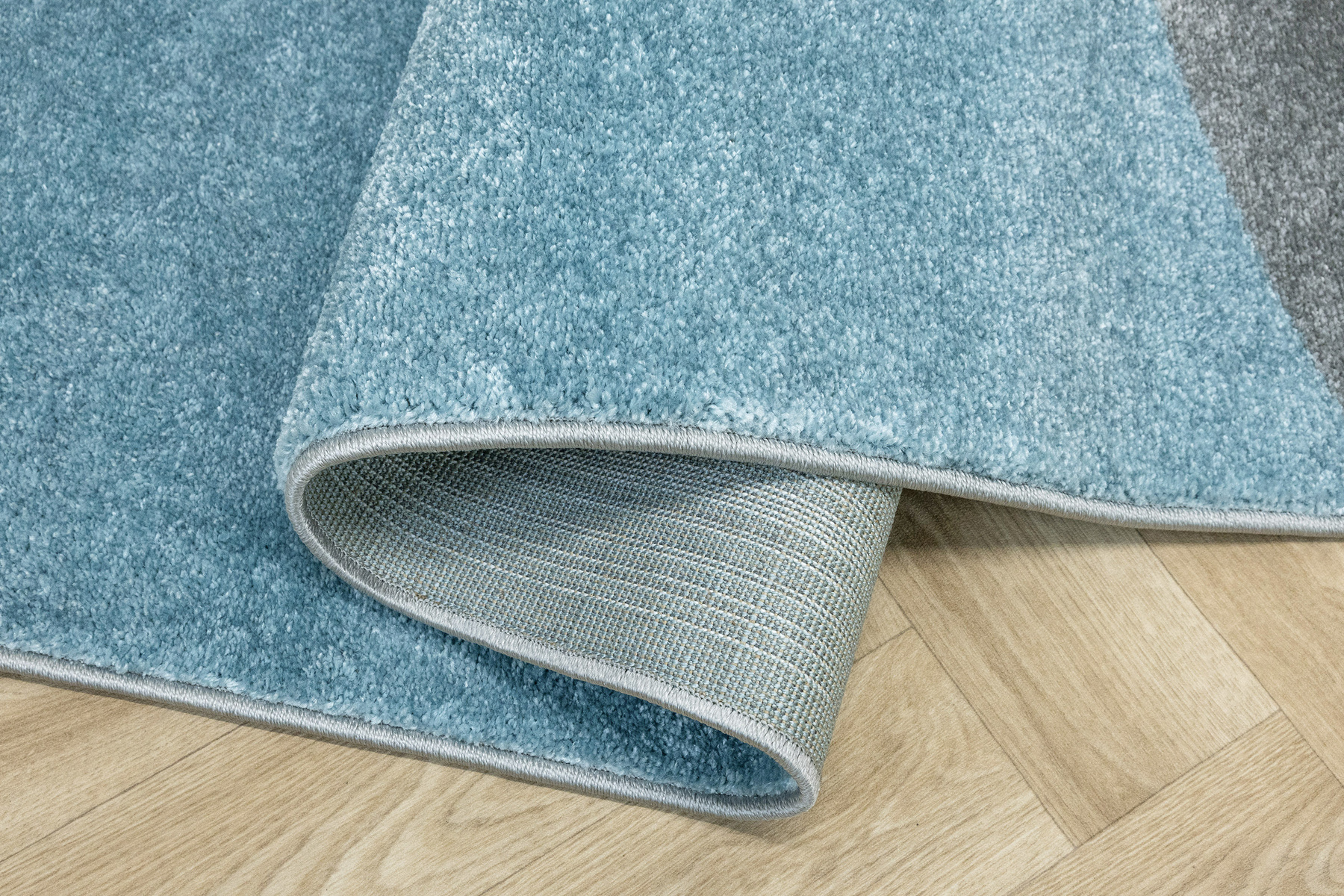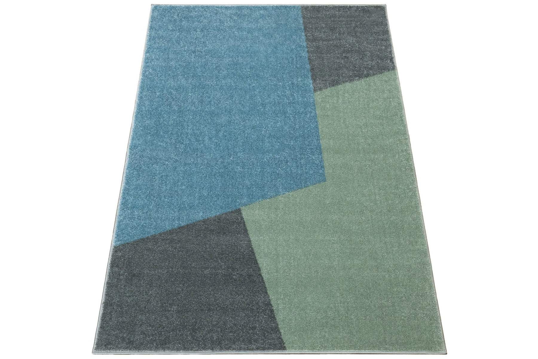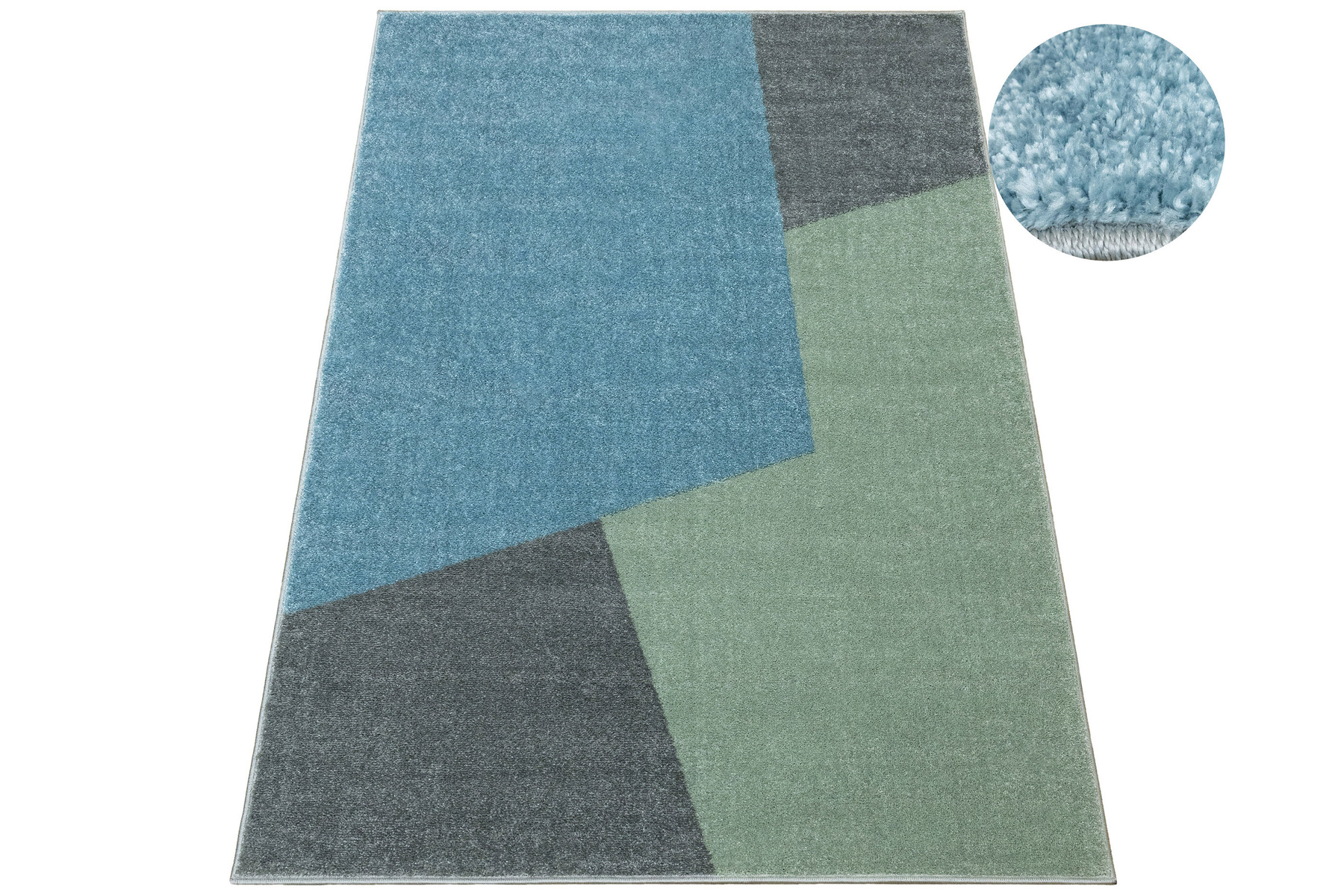 - Dywan dziecięcy Lima z wzorem geometrycznym w pastelowych odcieniach zieleni, szarości i niebieskiego, ze spodem wykończonym jutą.