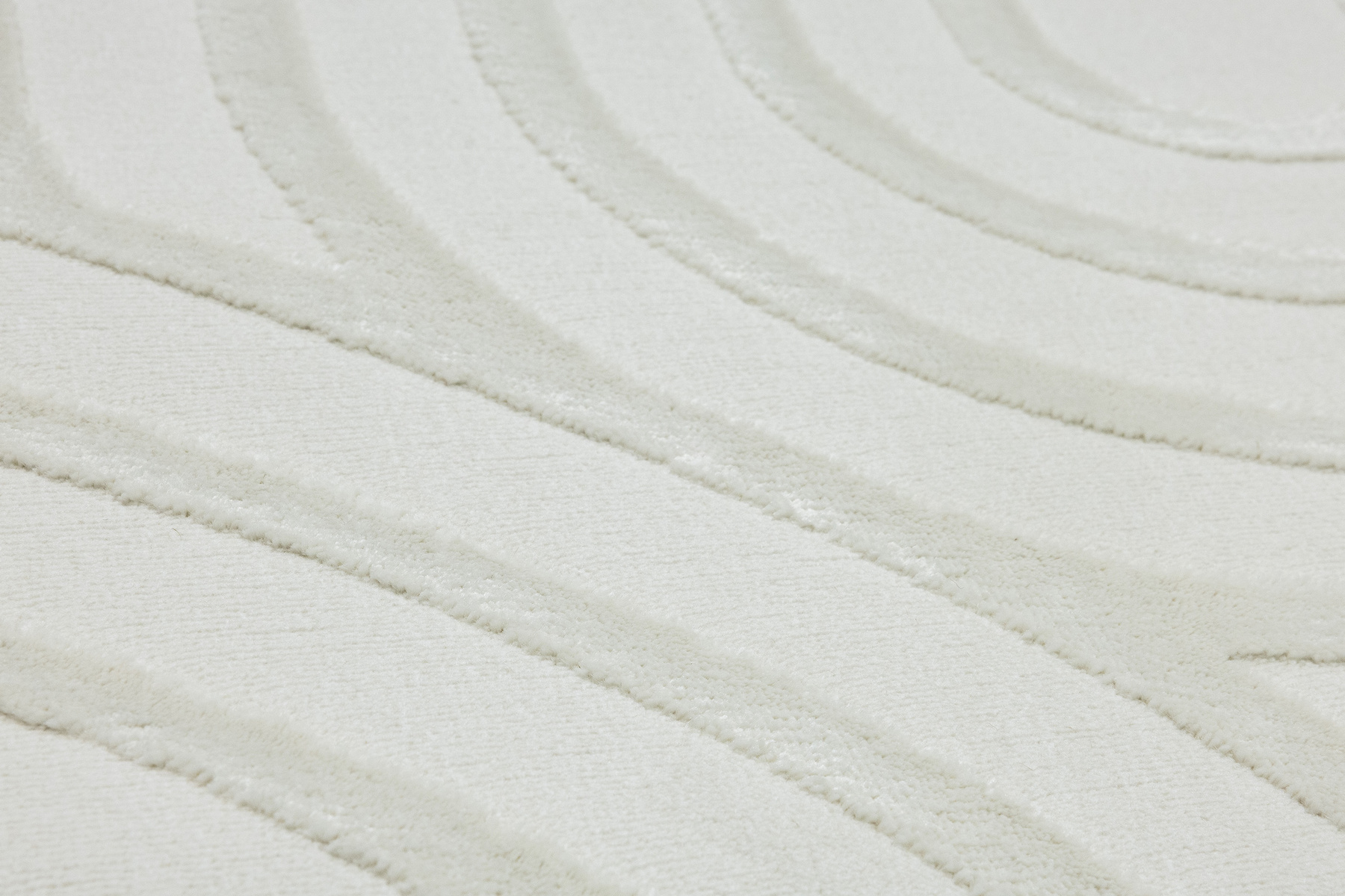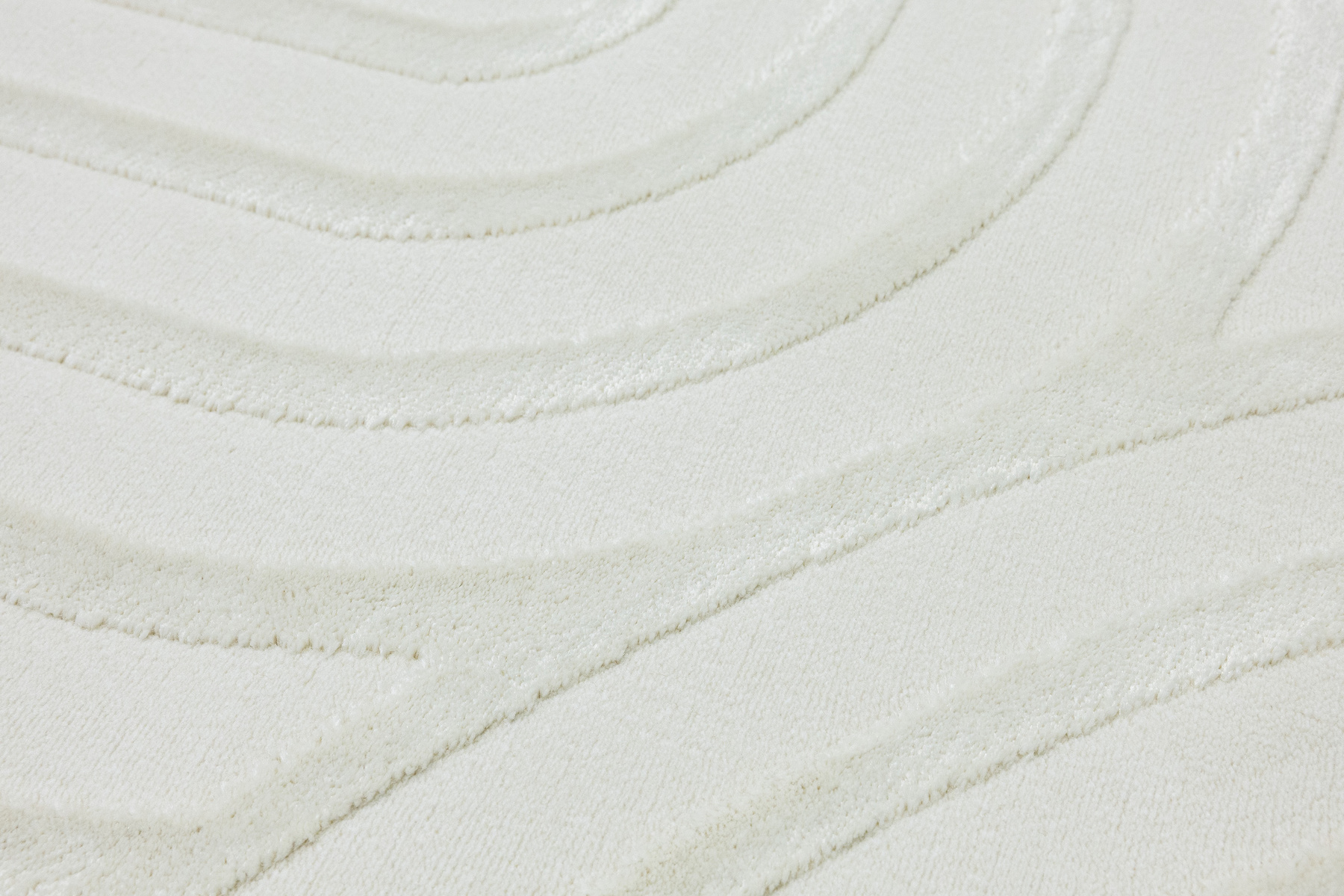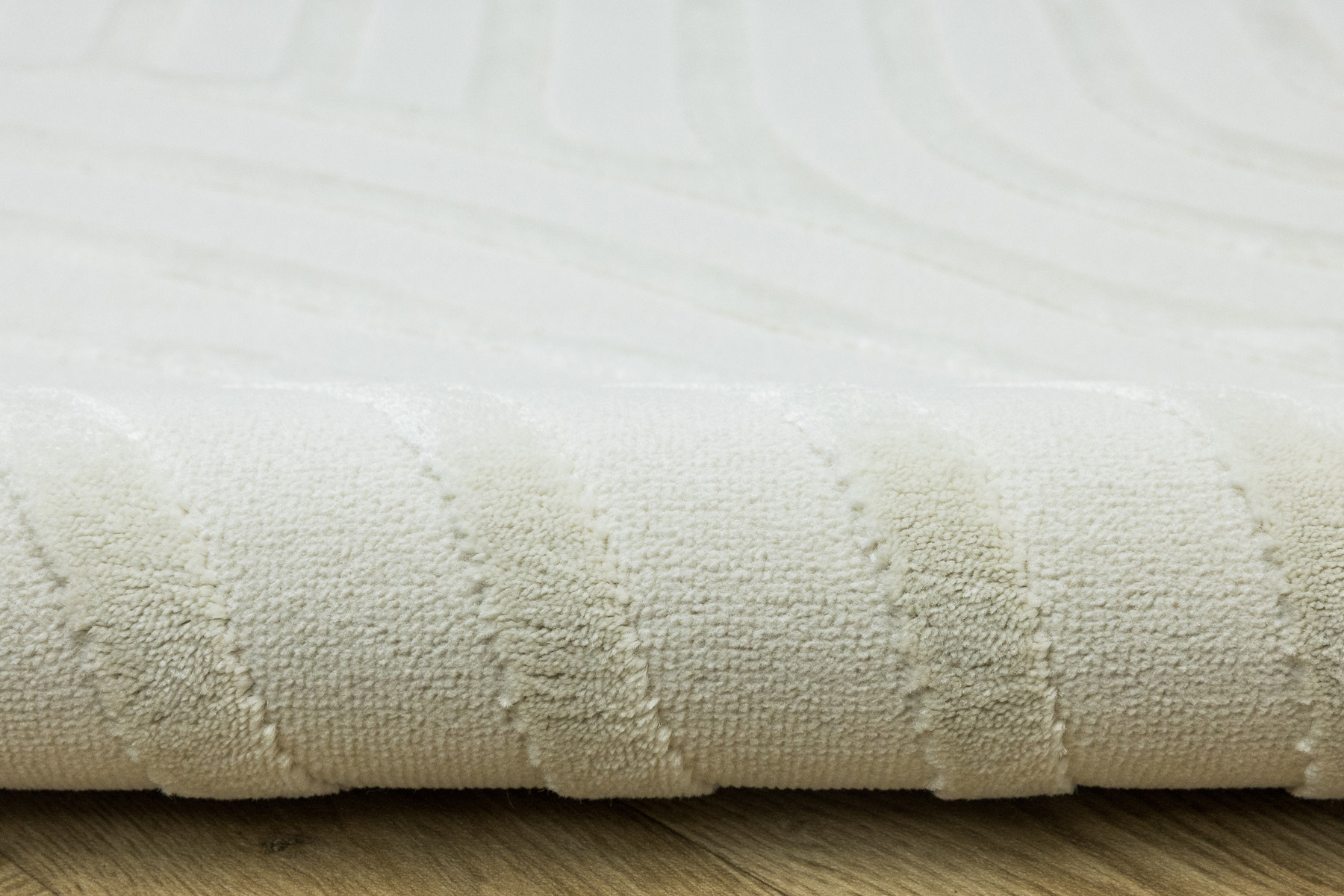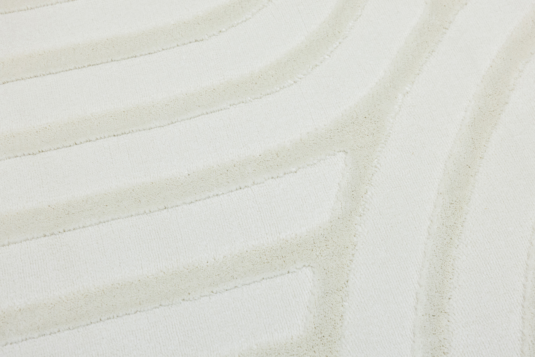 • Miękki i przyjemny w dotyku dywan Misha o lśniącym dwupoziomowym runie w kremie z geometrycznym wzorem i spodem wykończonym jutą