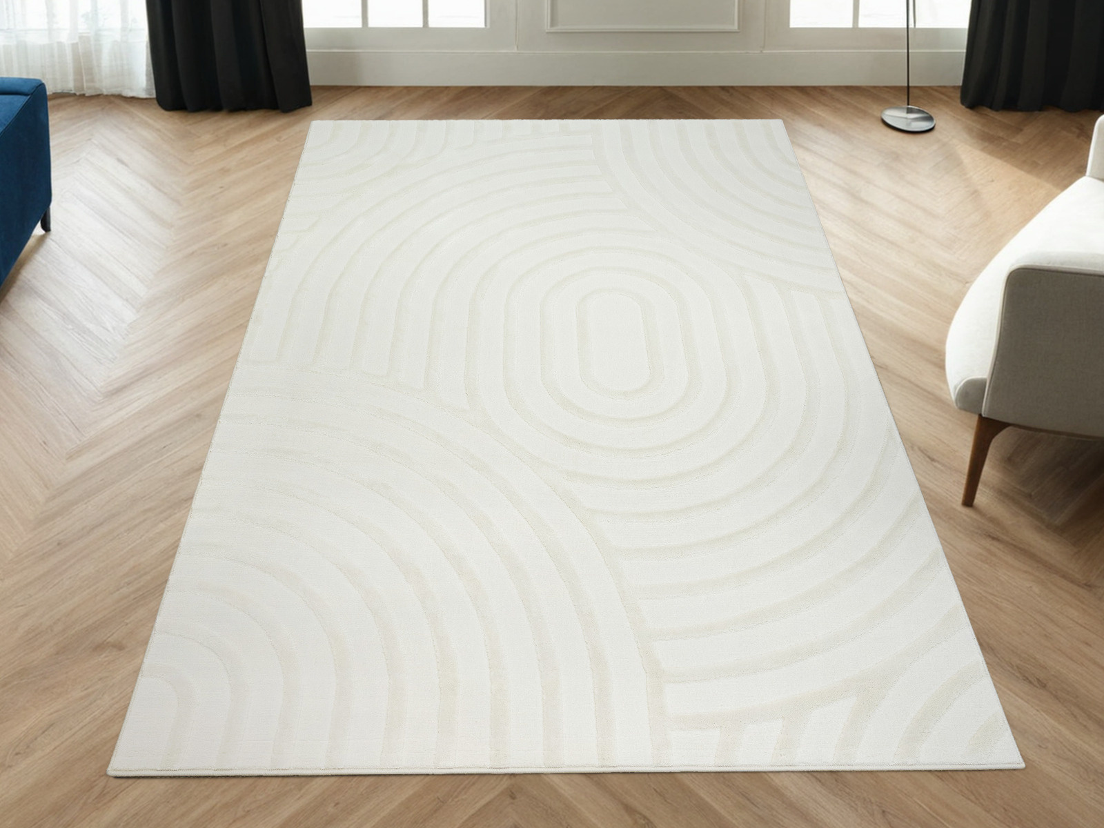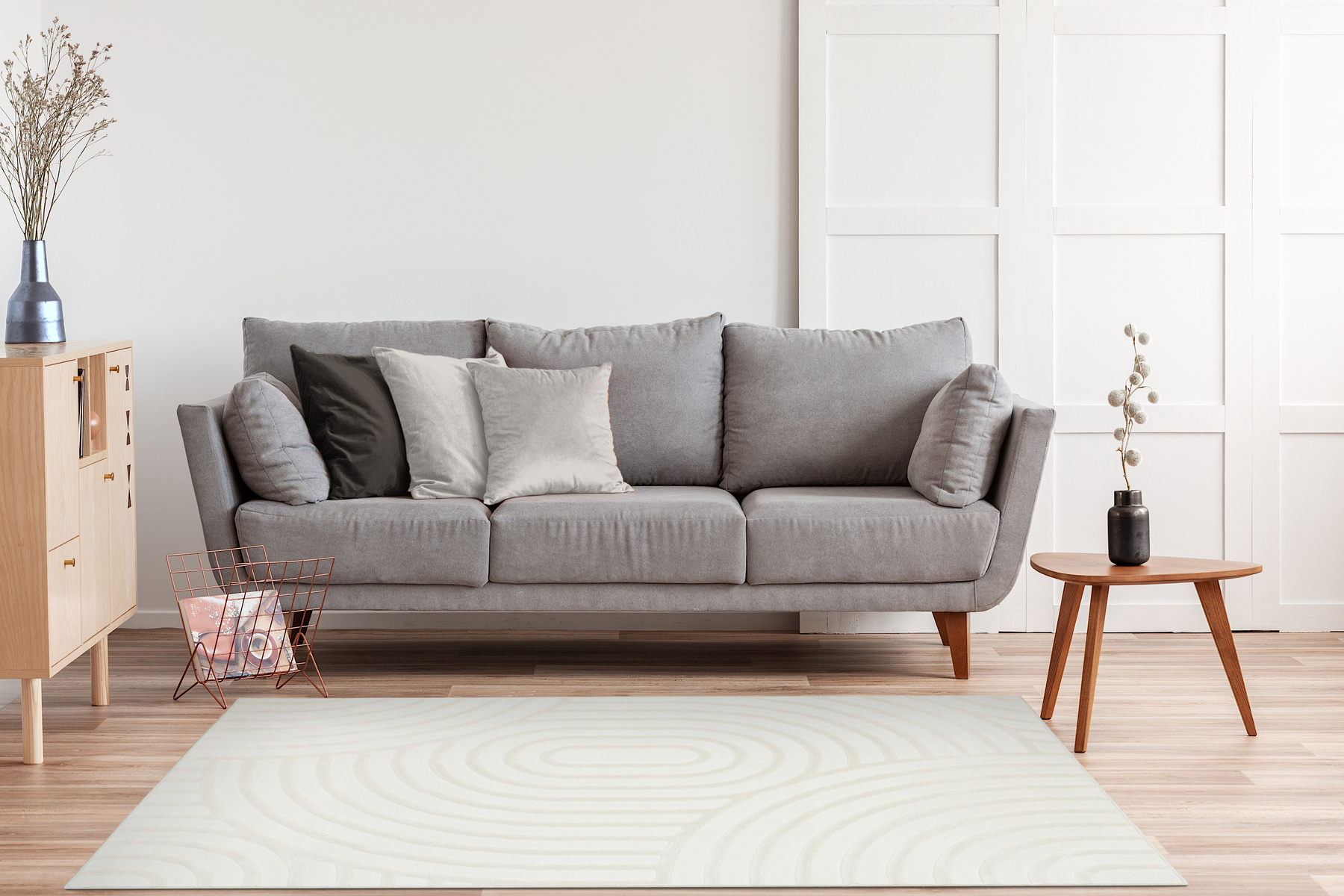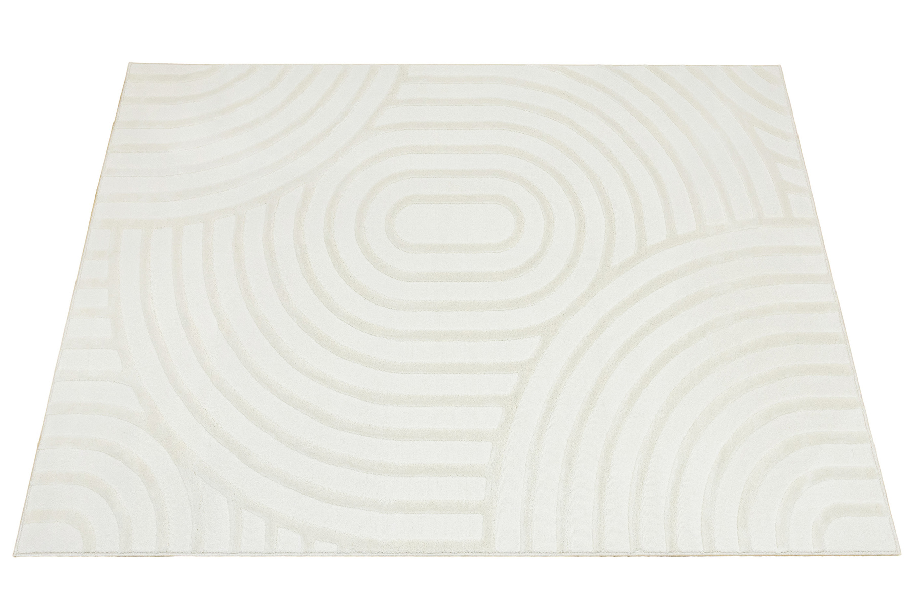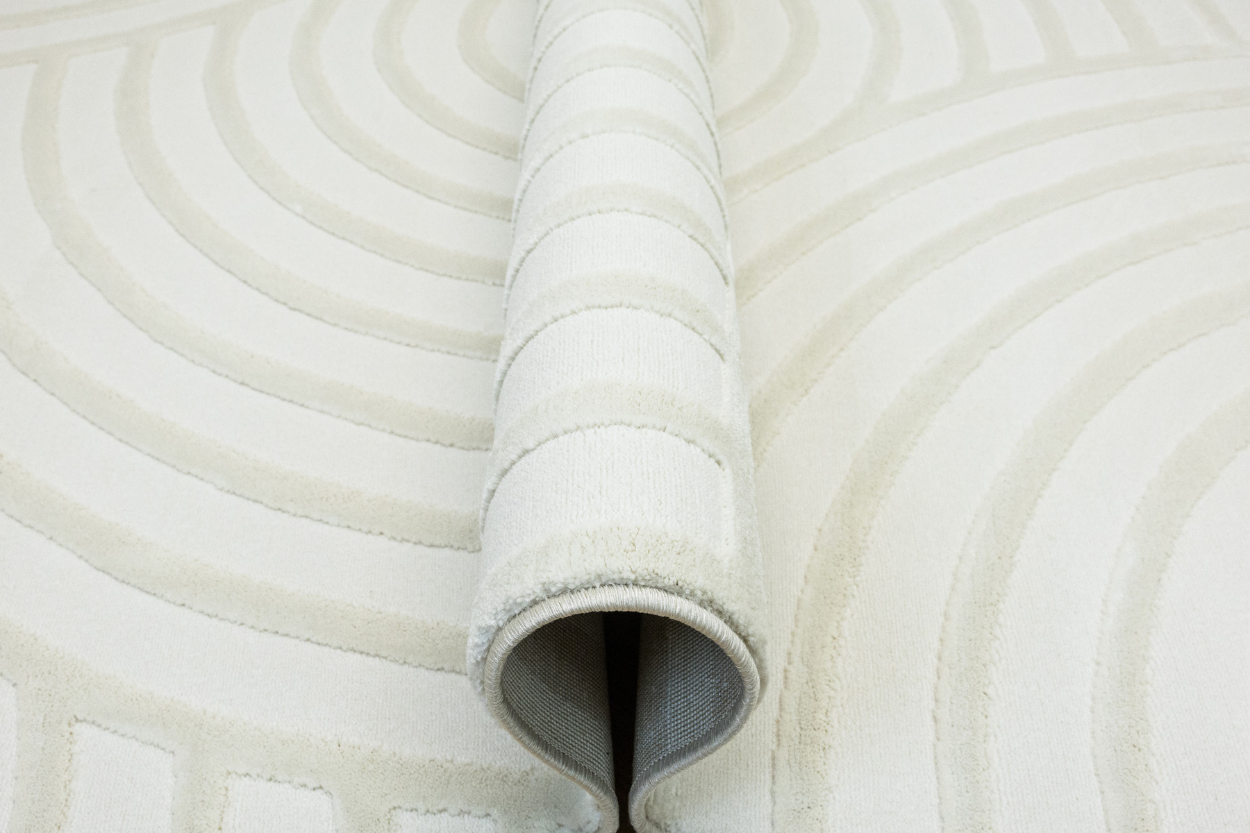 • Miękki i przyjemny w dotyku dywan Misha o lśniącym dwupoziomowym runie w kremie z geometrycznym wzorem i spodem wykończonym jutą