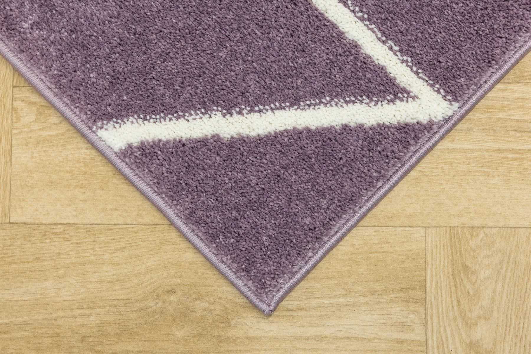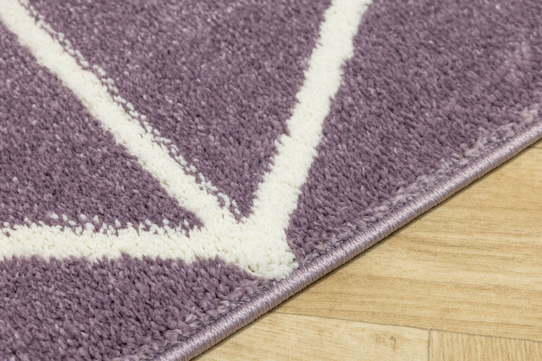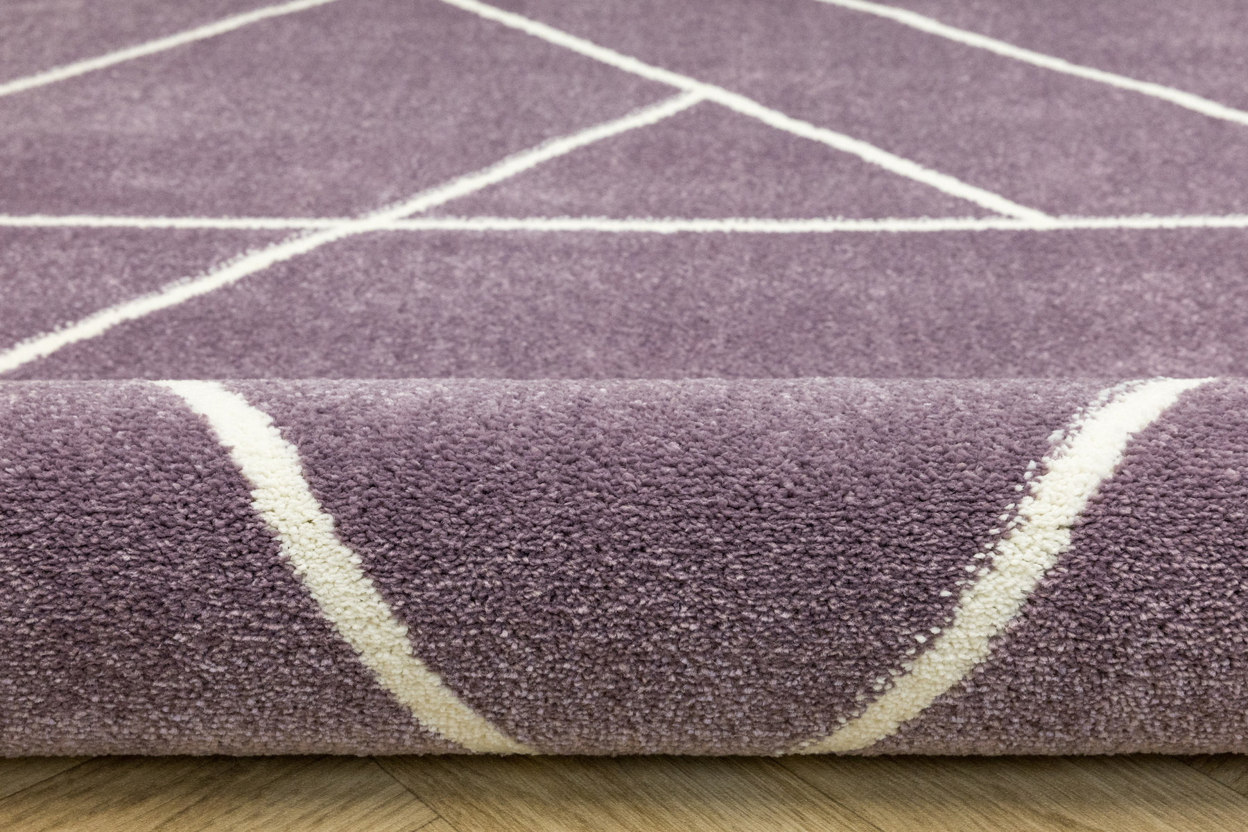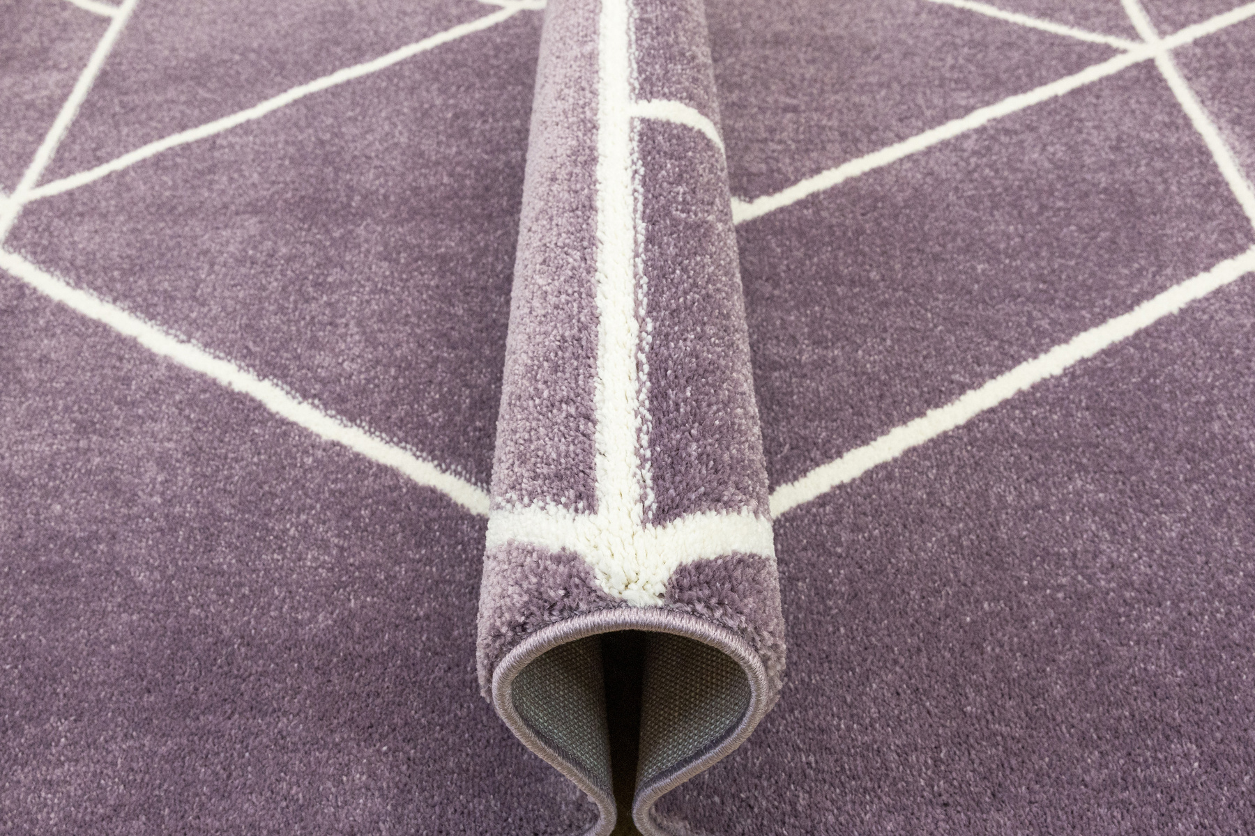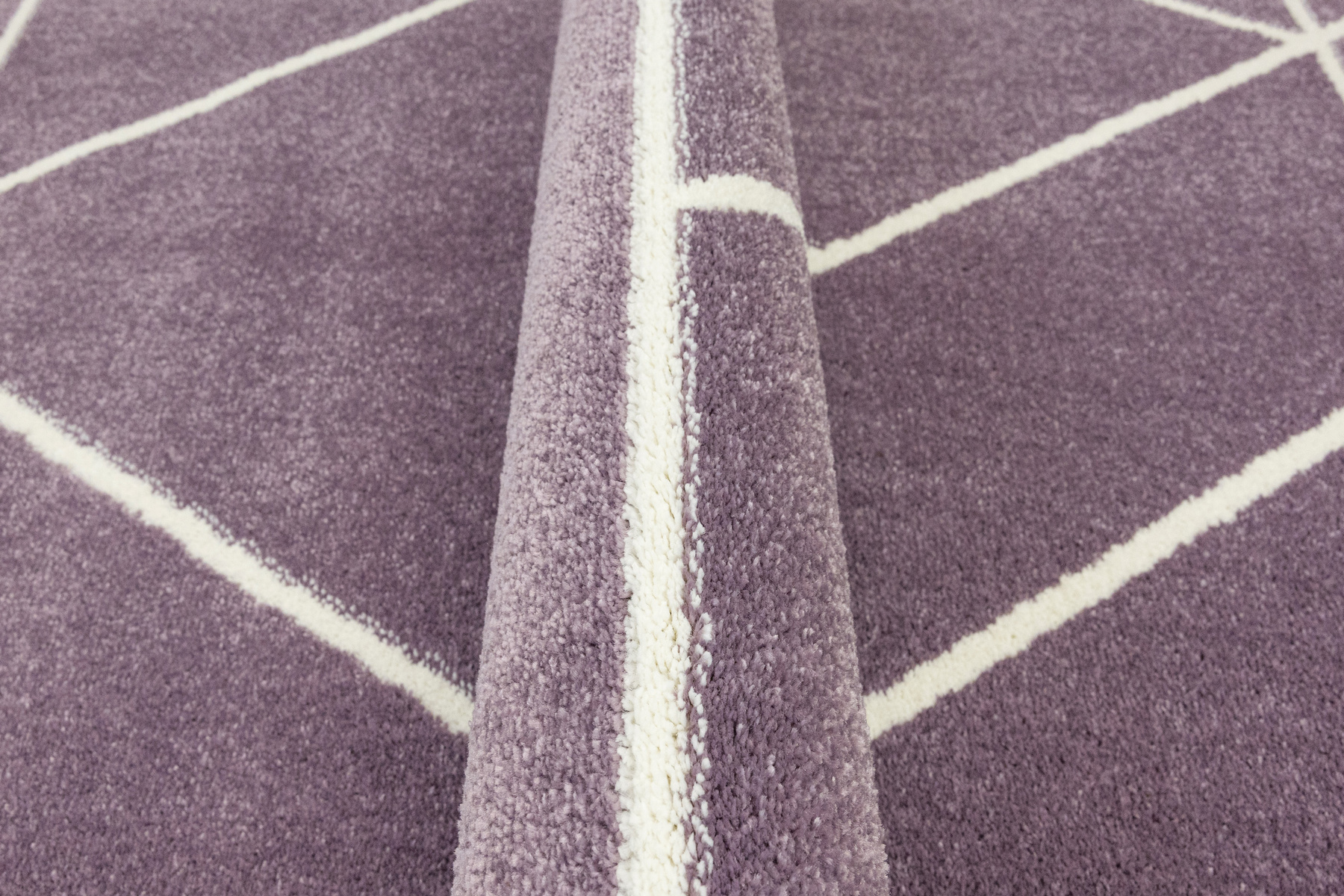 - Nowoczesny dywan Lima o mięciutkim, lśniącym, runie z geometrycznym wzorem w odcieniach fioletu i kremu, ze spodem wykończonym jutą.