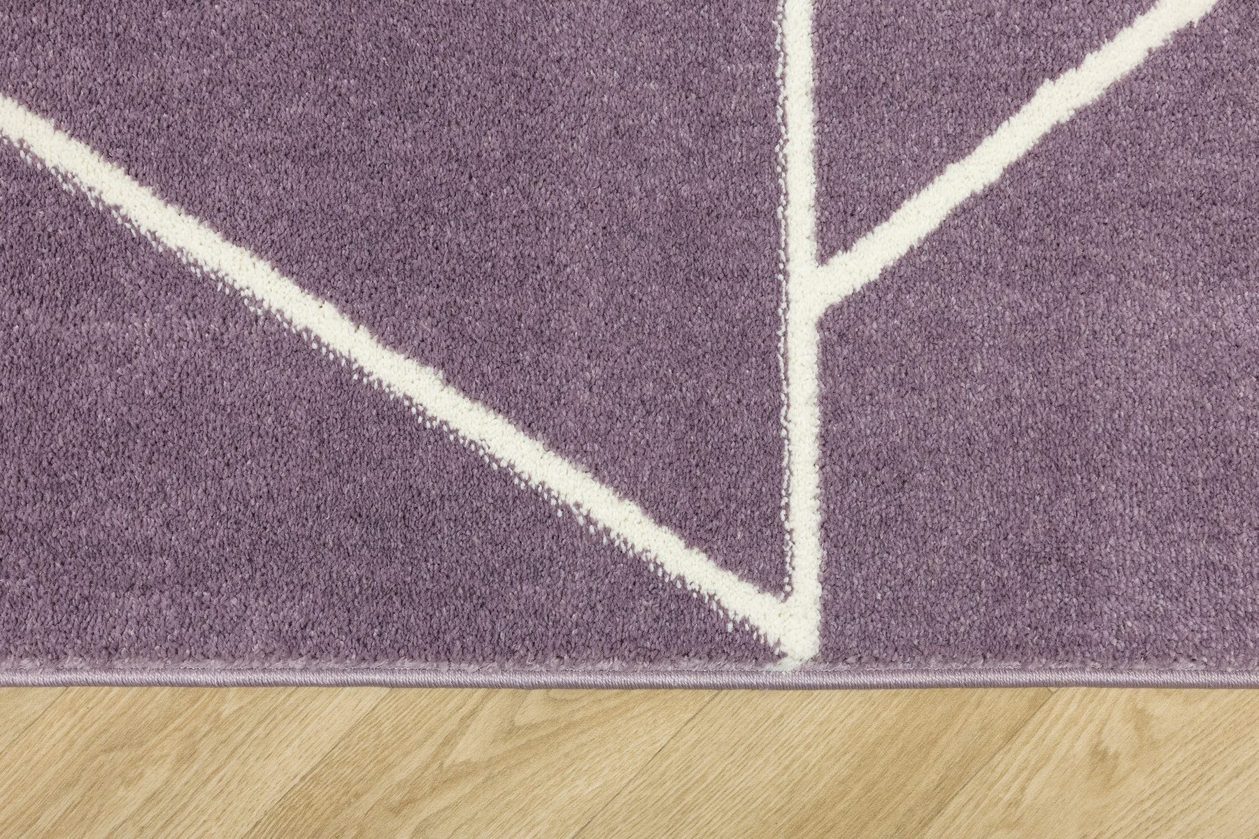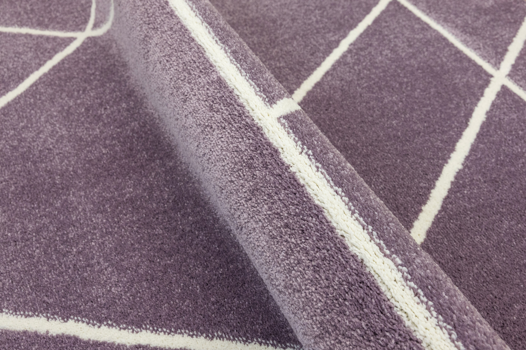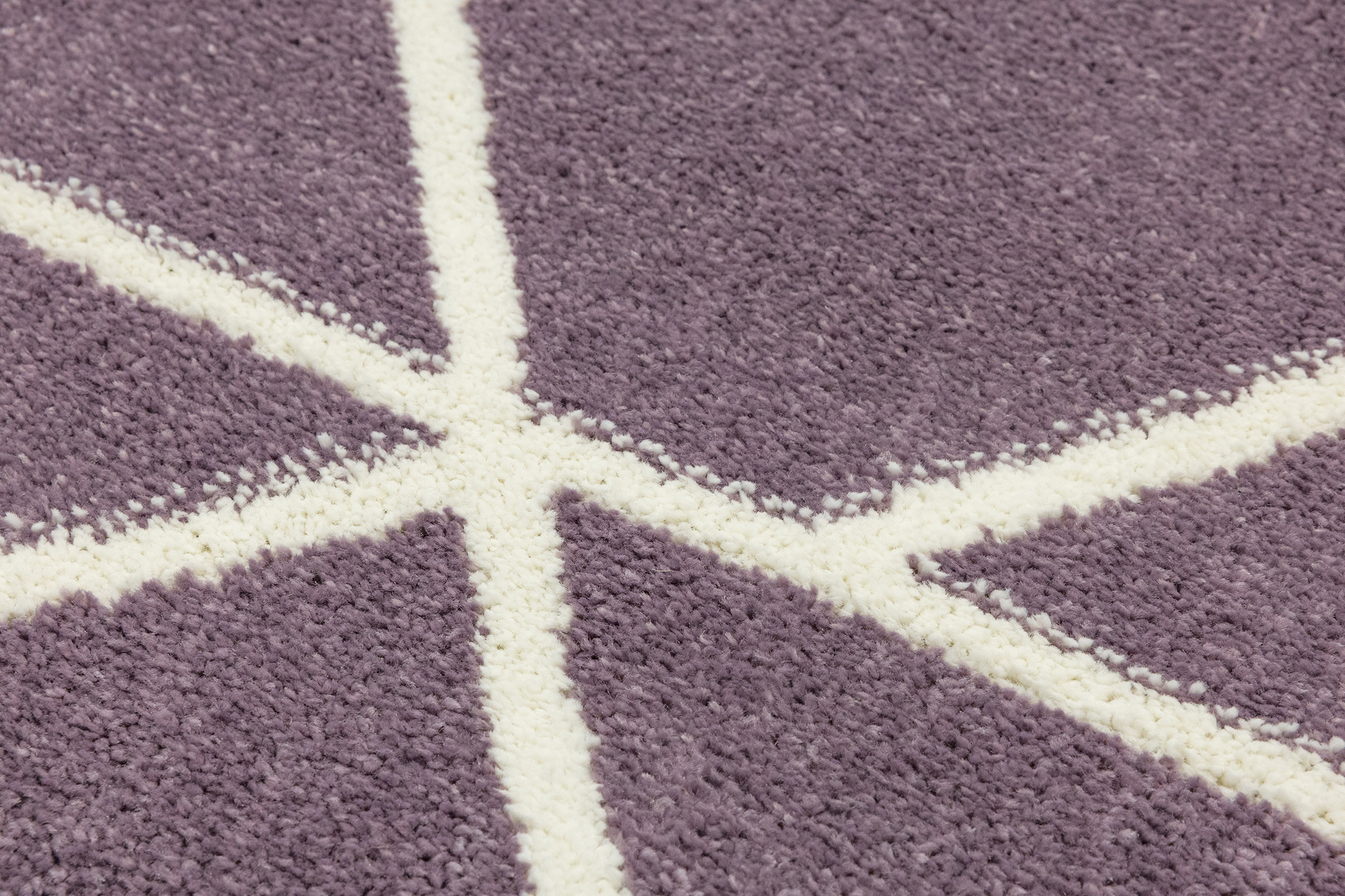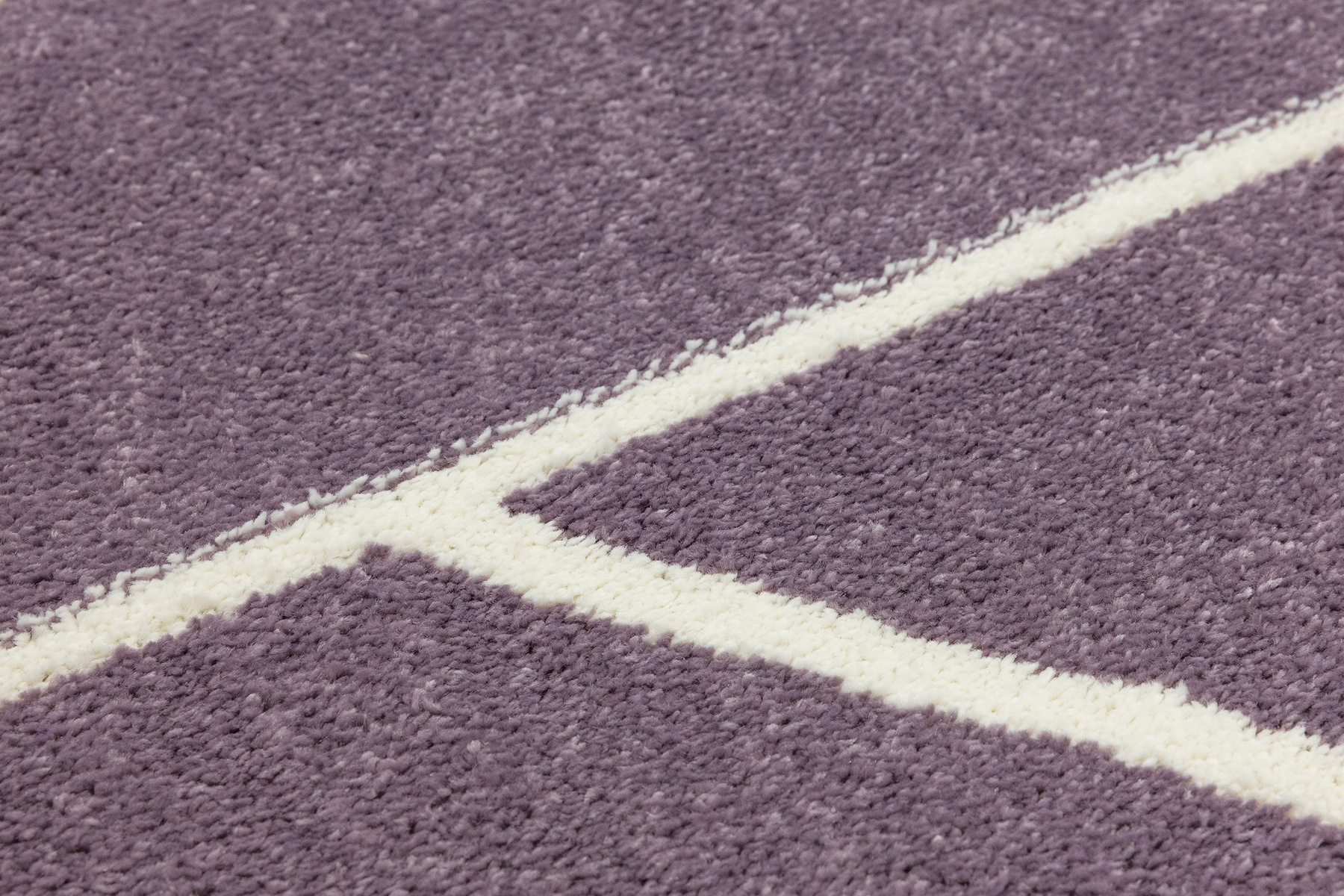 - Nowoczesny dywan Lima o mięciutkim, lśniącym, runie z geometrycznym wzorem w odcieniach fioletu i kremu, ze spodem wykończonym jutą.