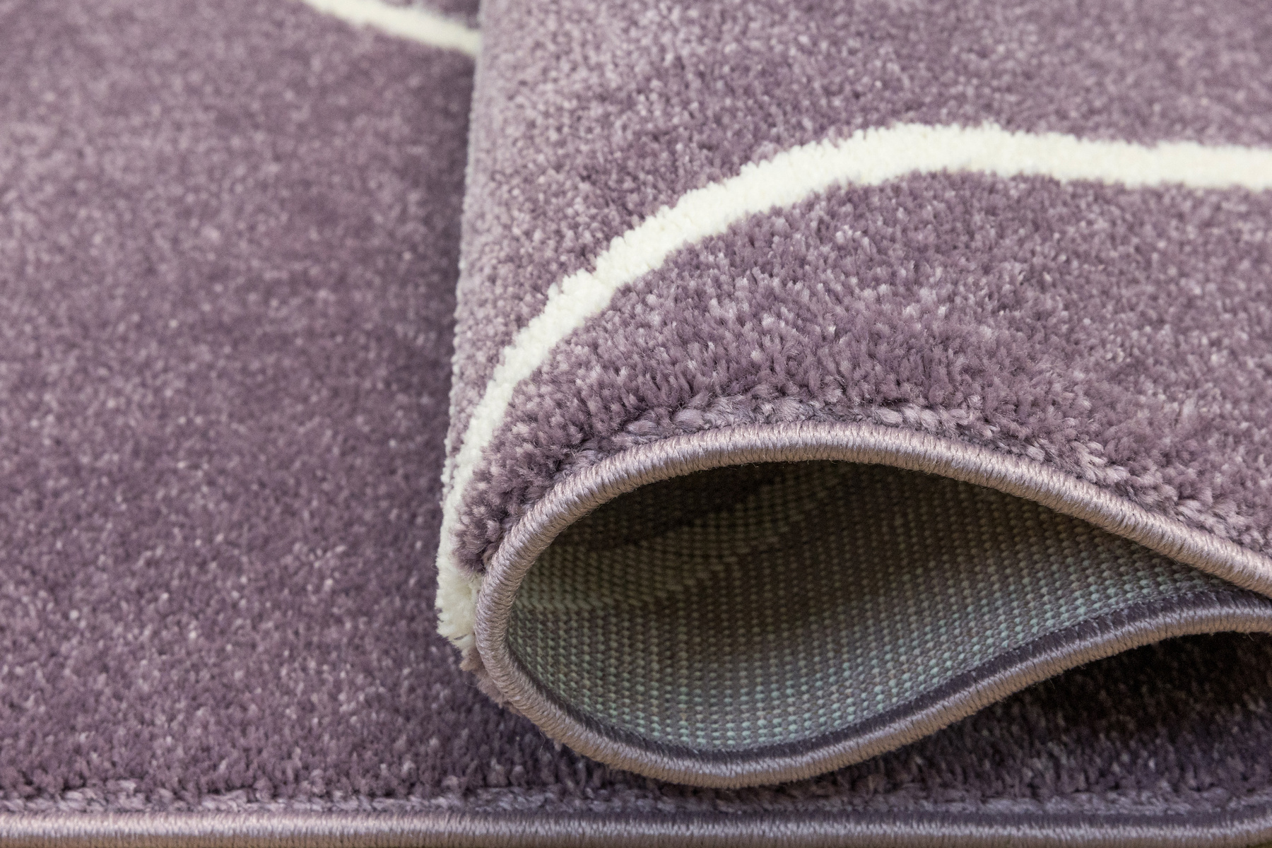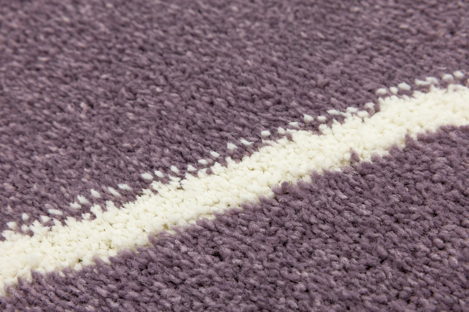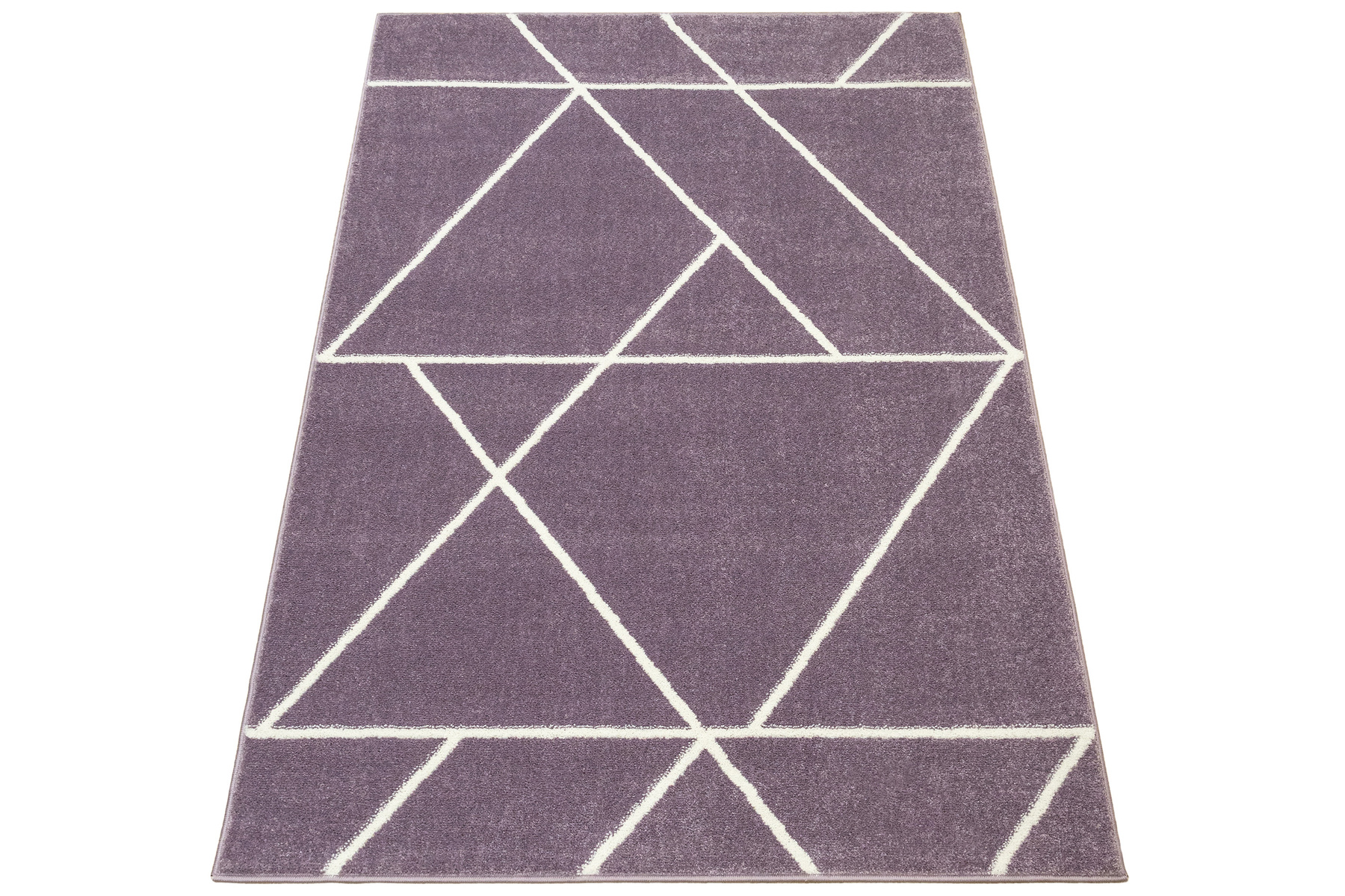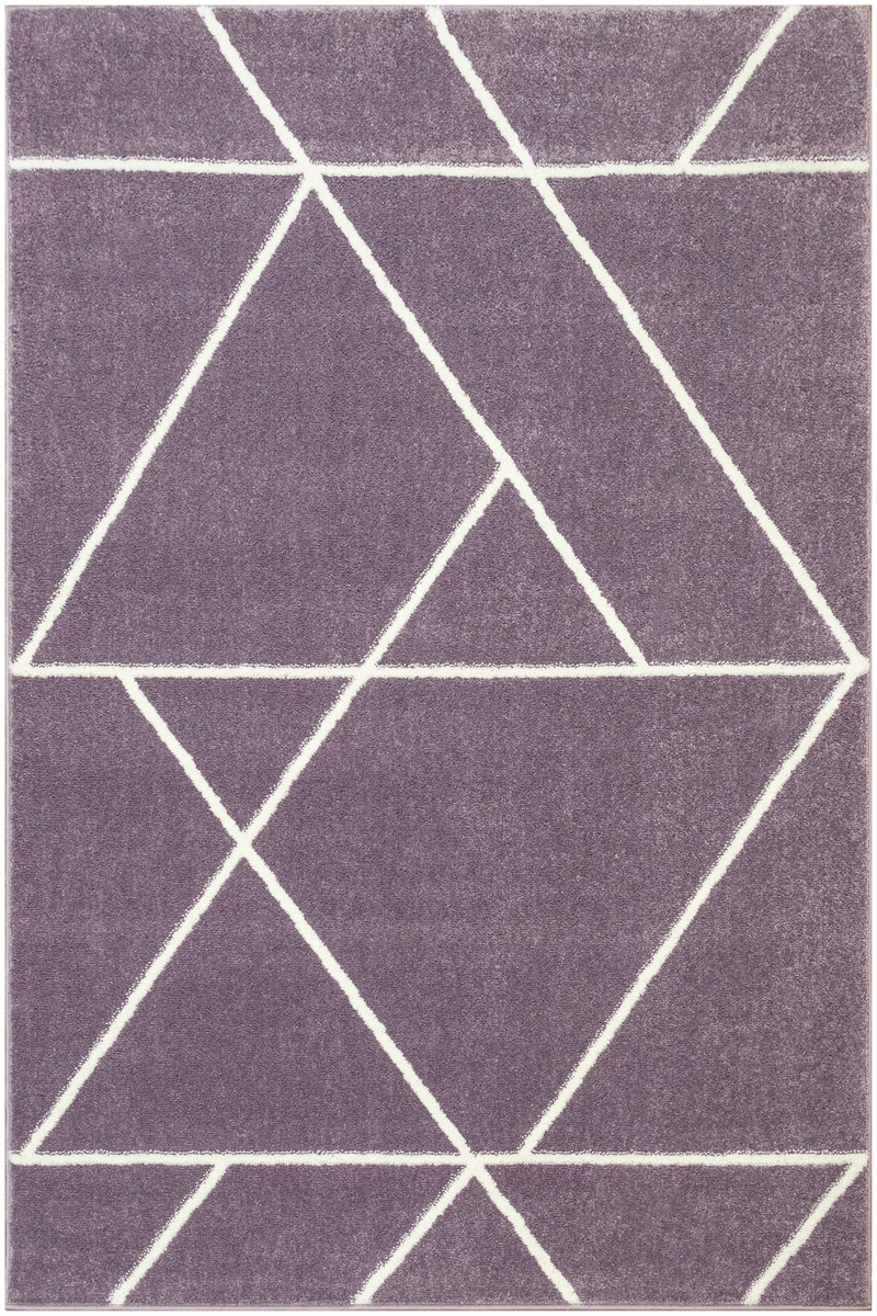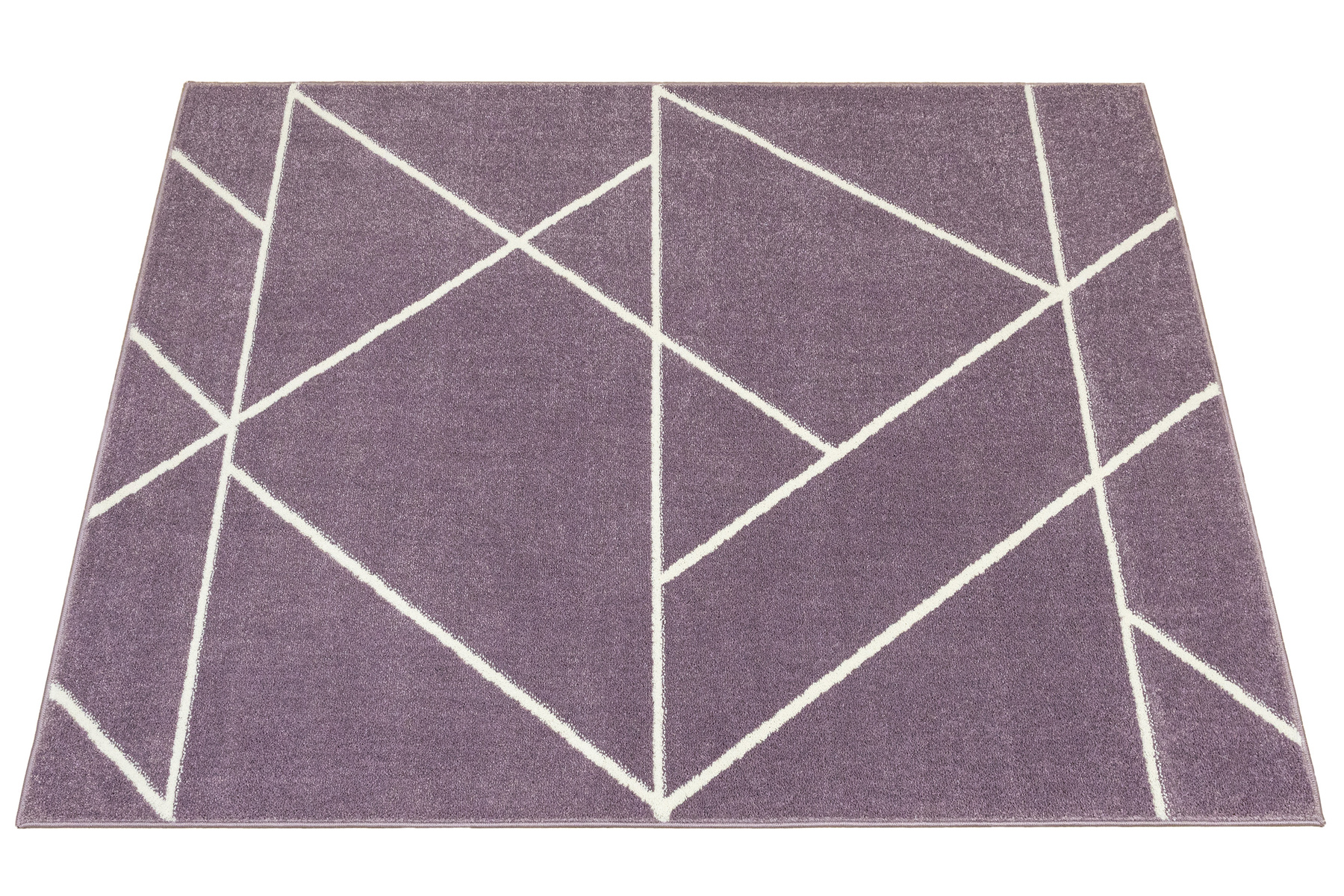 - Nowoczesny dywan Lima o mięciutkim, lśniącym, runie z geometrycznym wzorem w odcieniach fioletu i kremu, ze spodem wykończonym jutą.