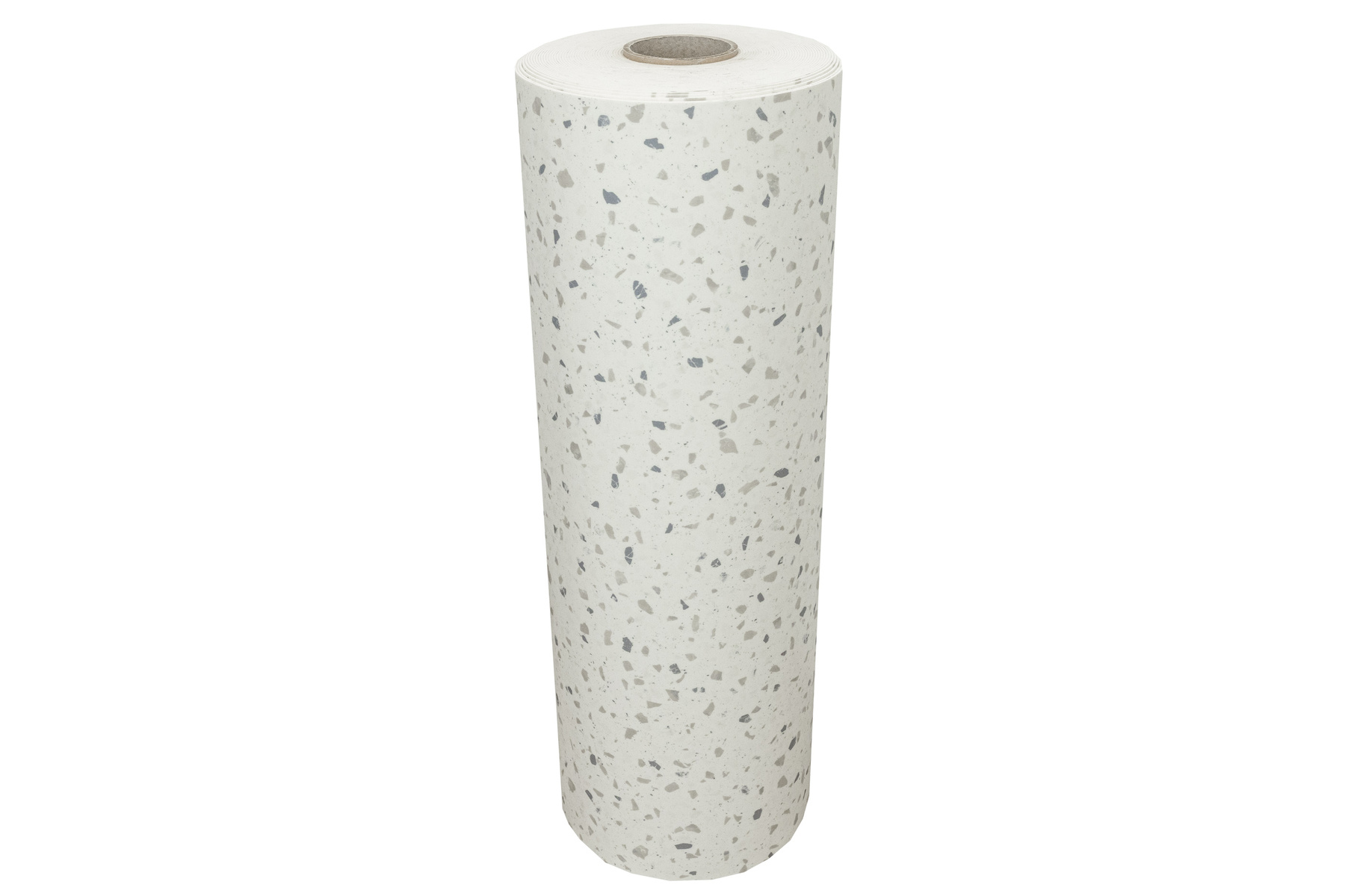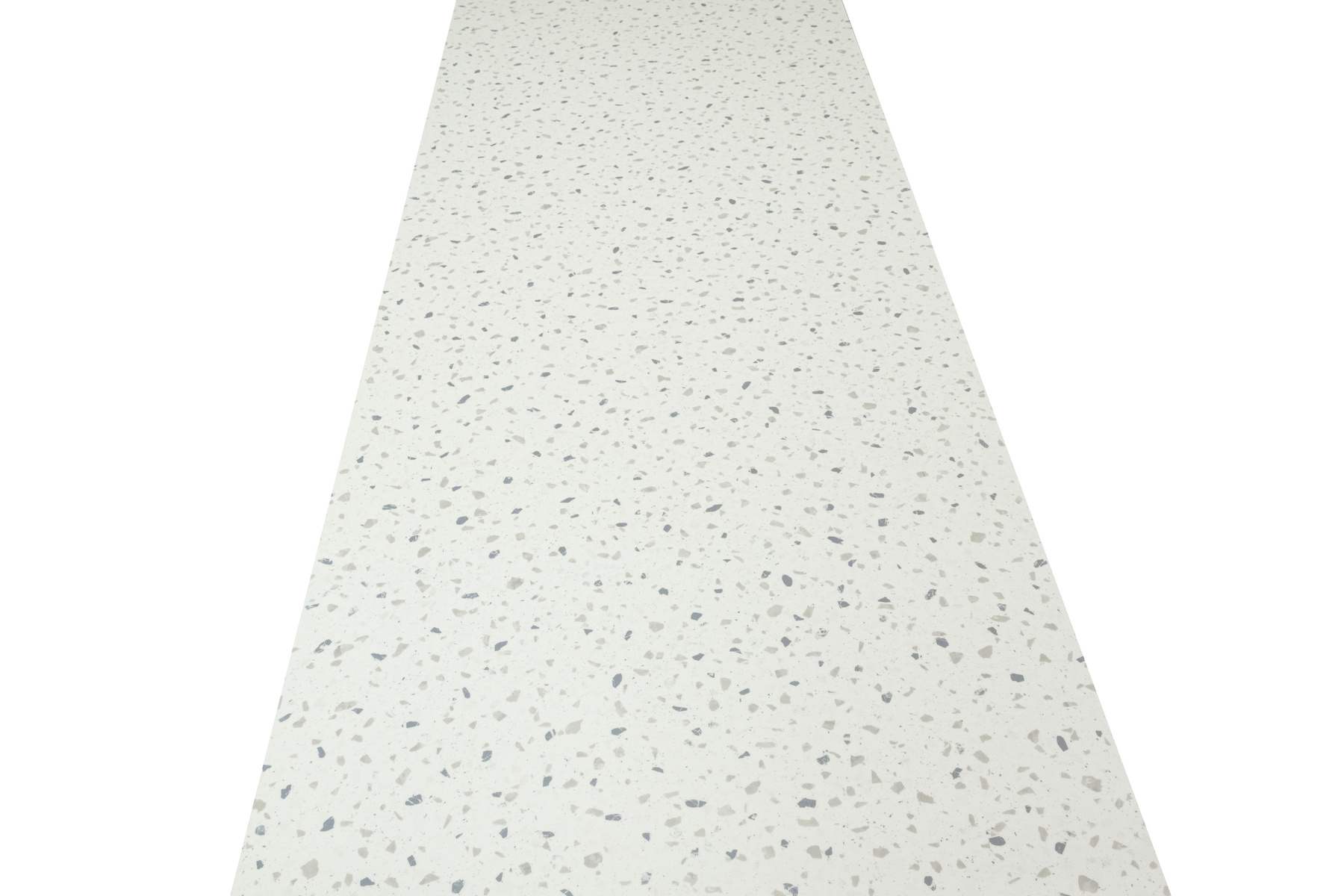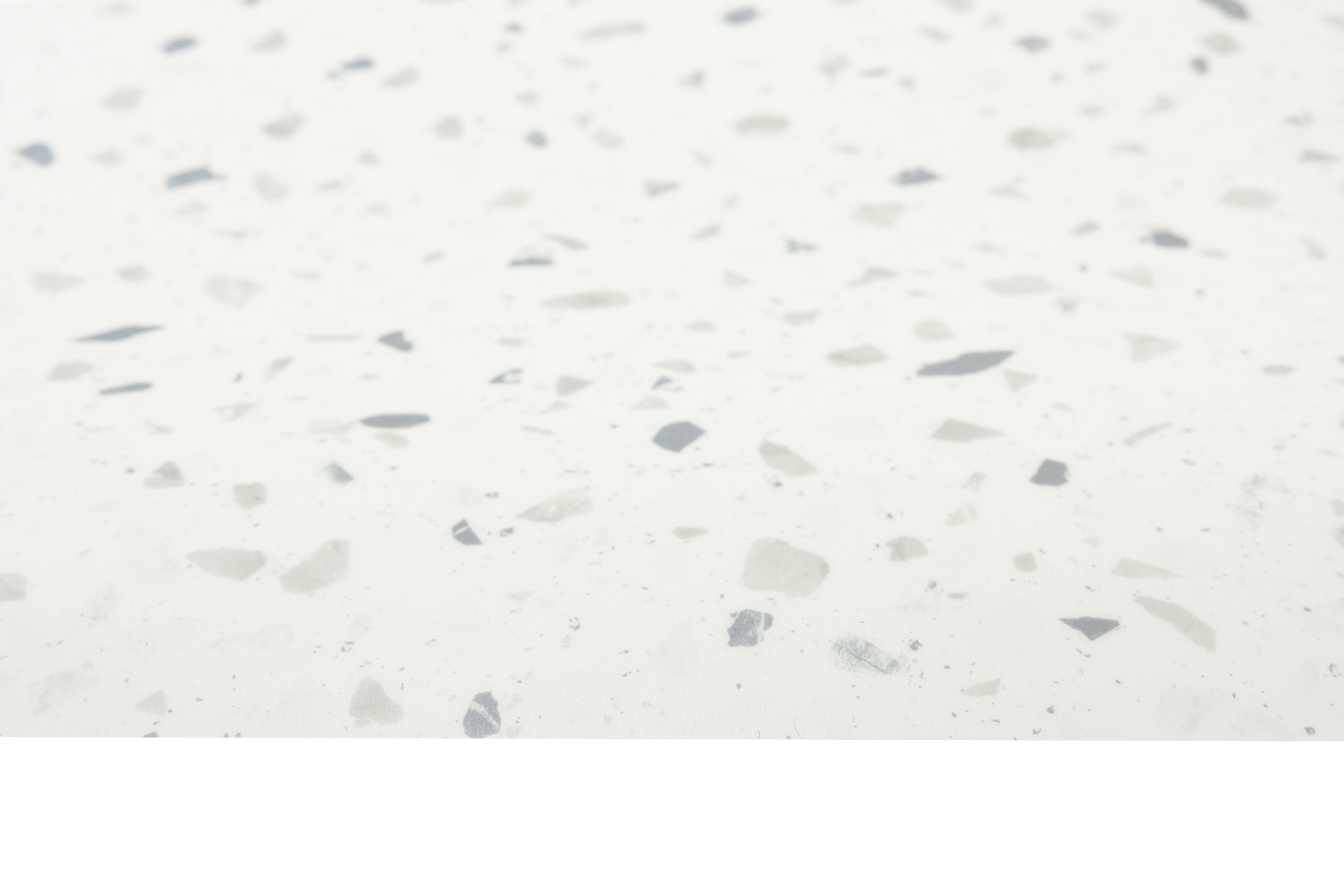- Wykładzina PCV Vigan Marmette ze wzorem imitującym lastryko z kamyczkami w odcieniach beżu, kremu, szarości.