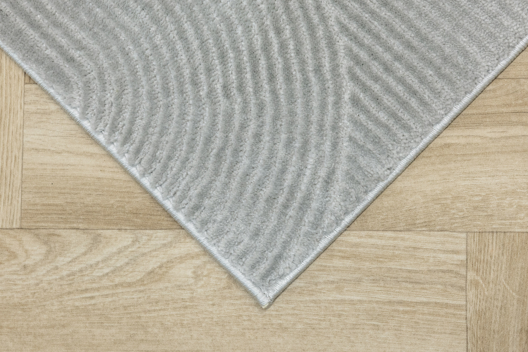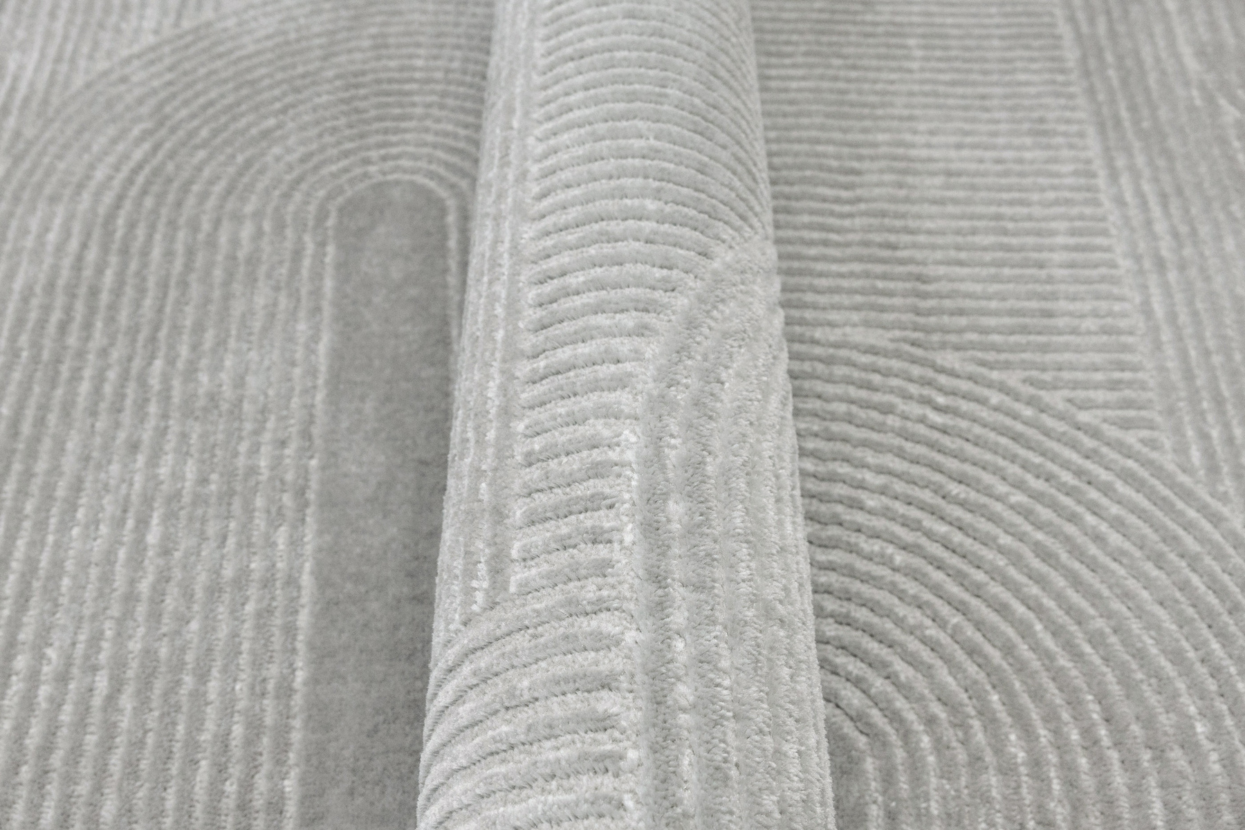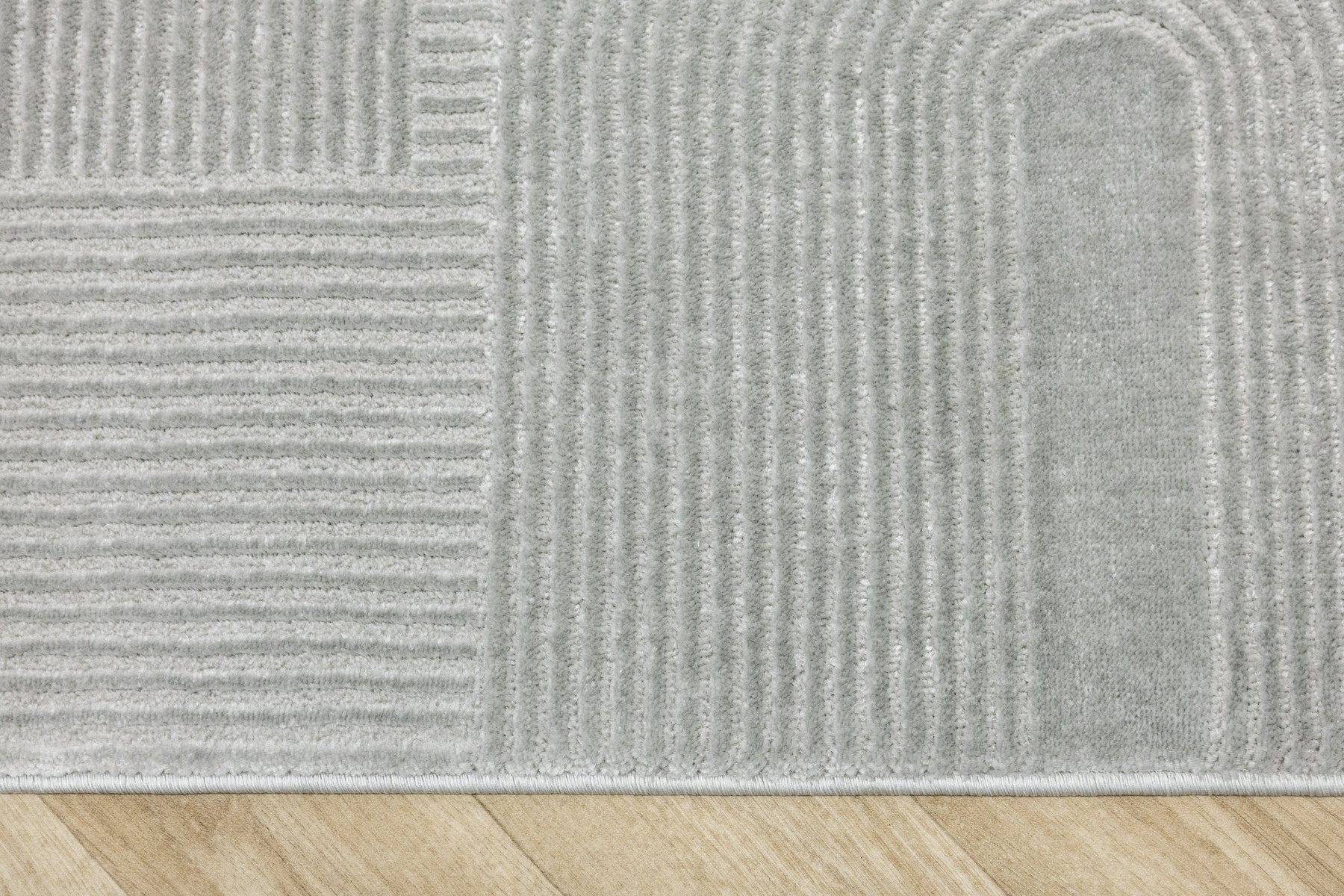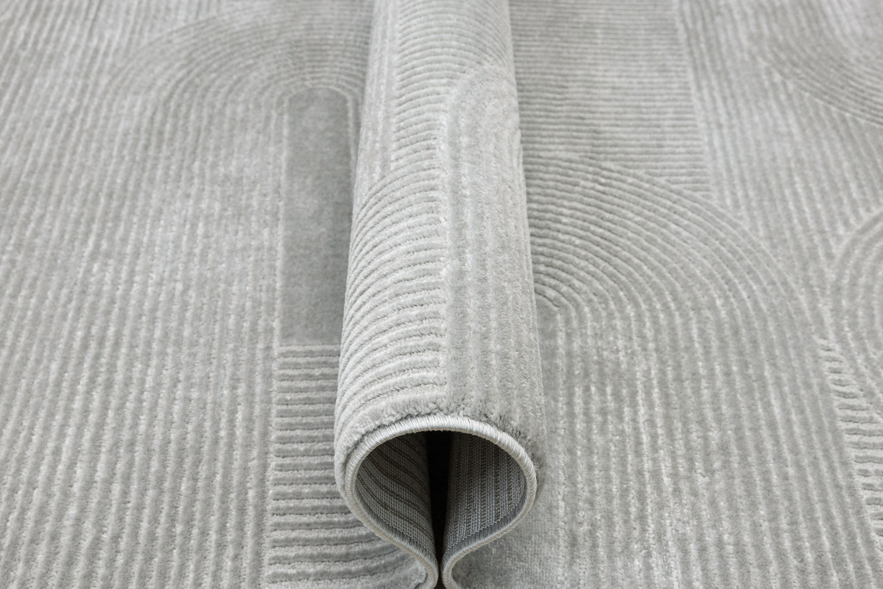 - Miękki i przyjemny w dotyku dywan Misha o lśniącym dwupoziomowym runie w szarości z geometrycznym, nowoczesnym wzorem w linie, półkola i spodem wykończonym jutą.