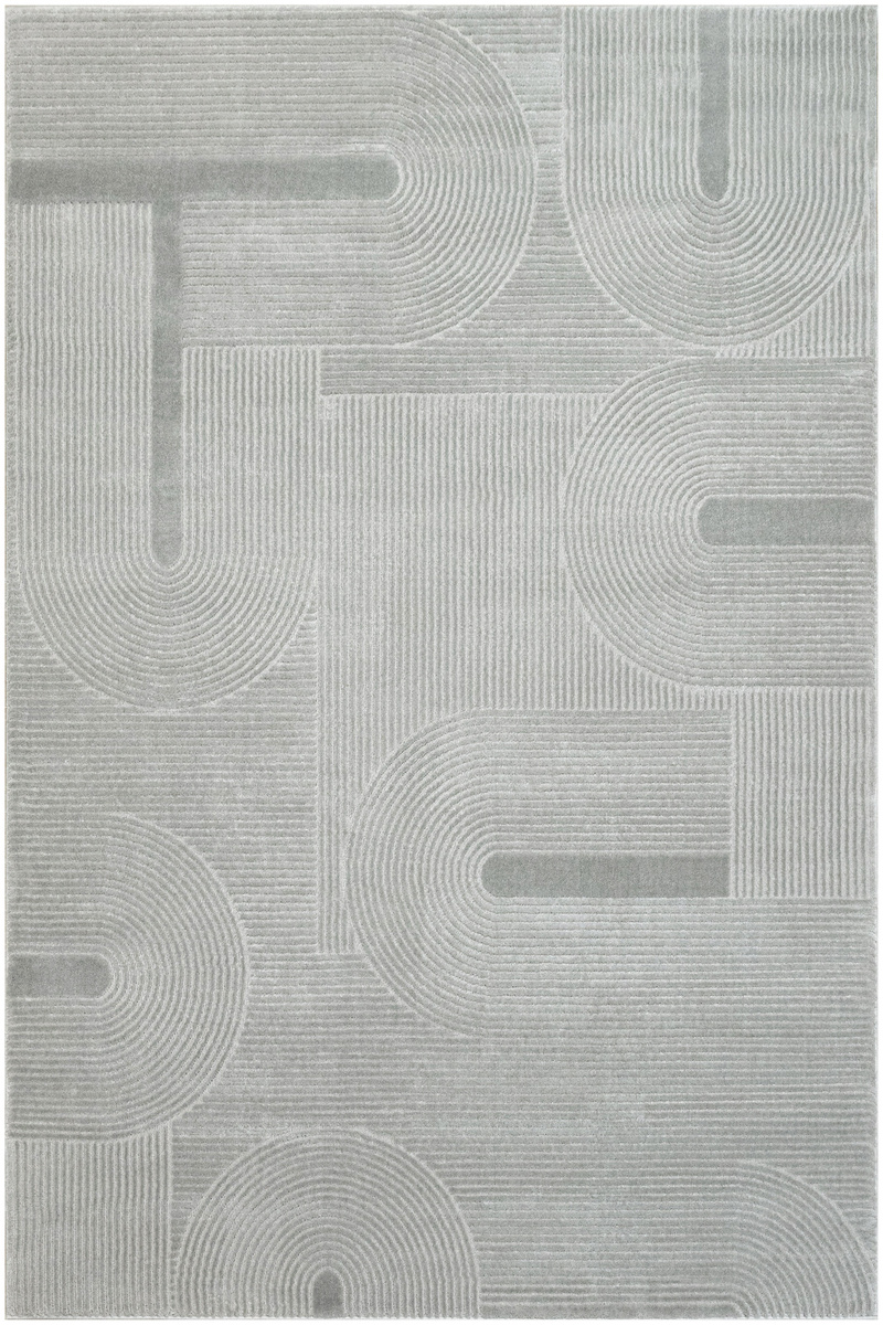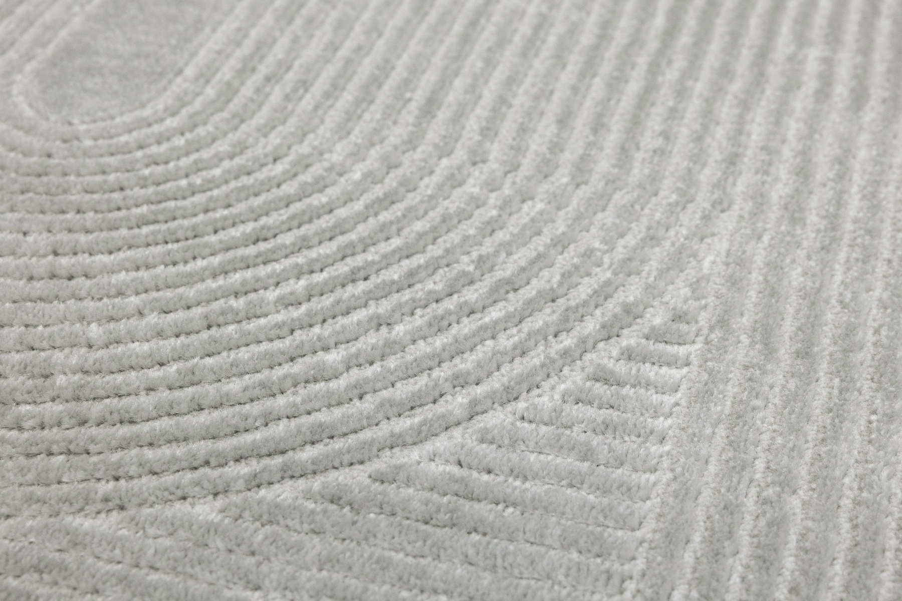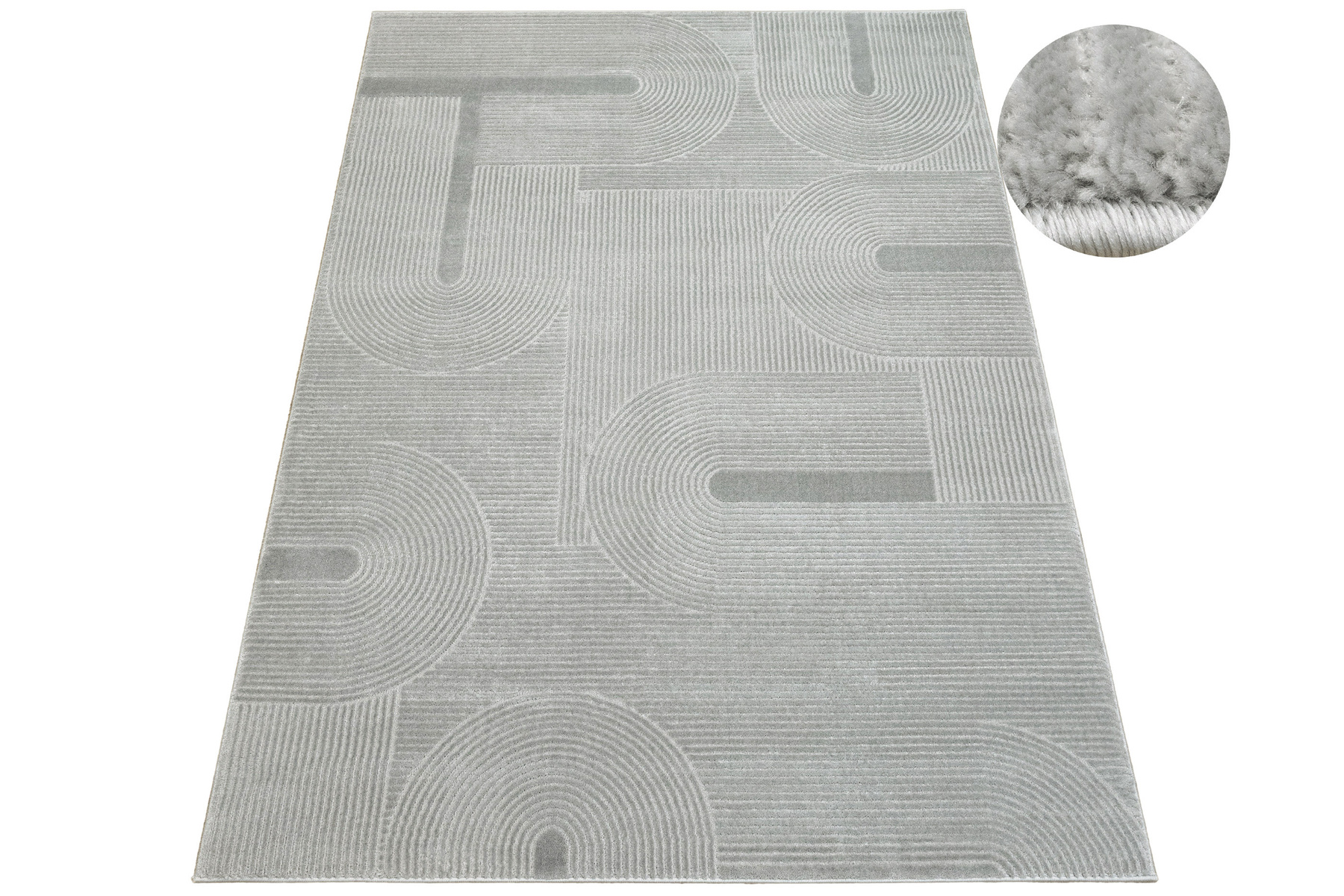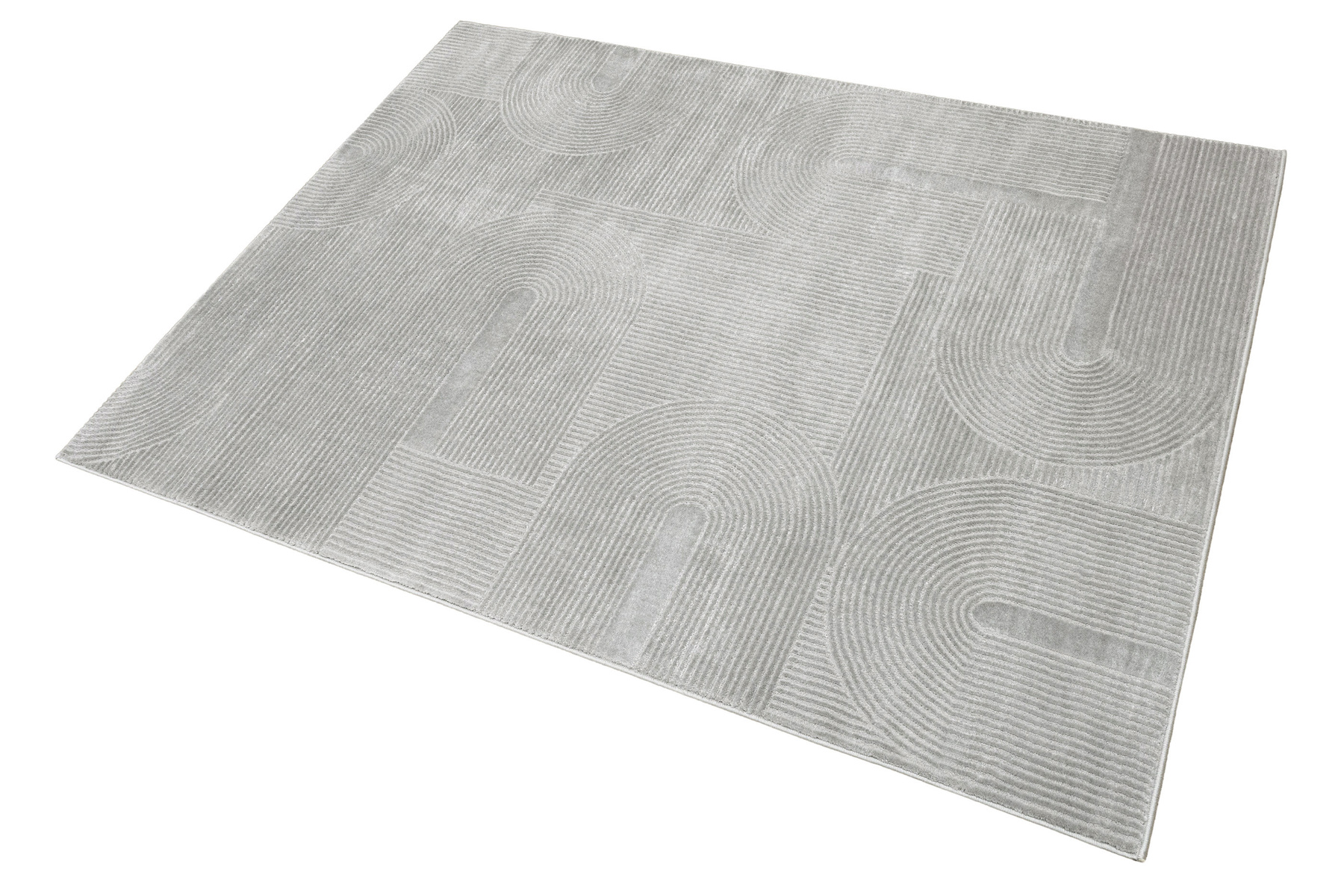 - Miękki i przyjemny w dotyku dywan Misha o lśniącym dwupoziomowym runie w szarości z geometrycznym, nowoczesnym wzorem w linie, półkola i spodem wykończonym jutą.