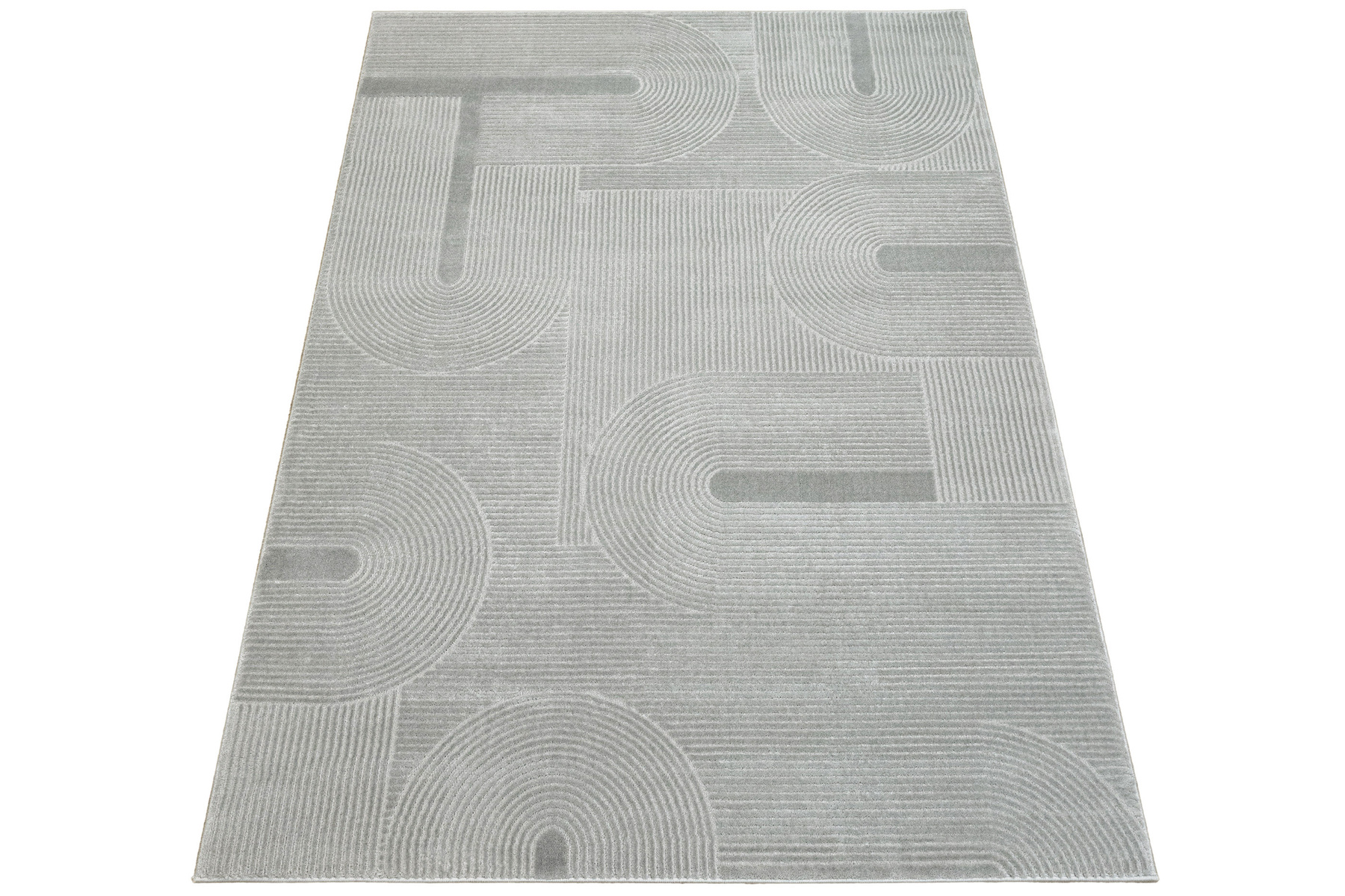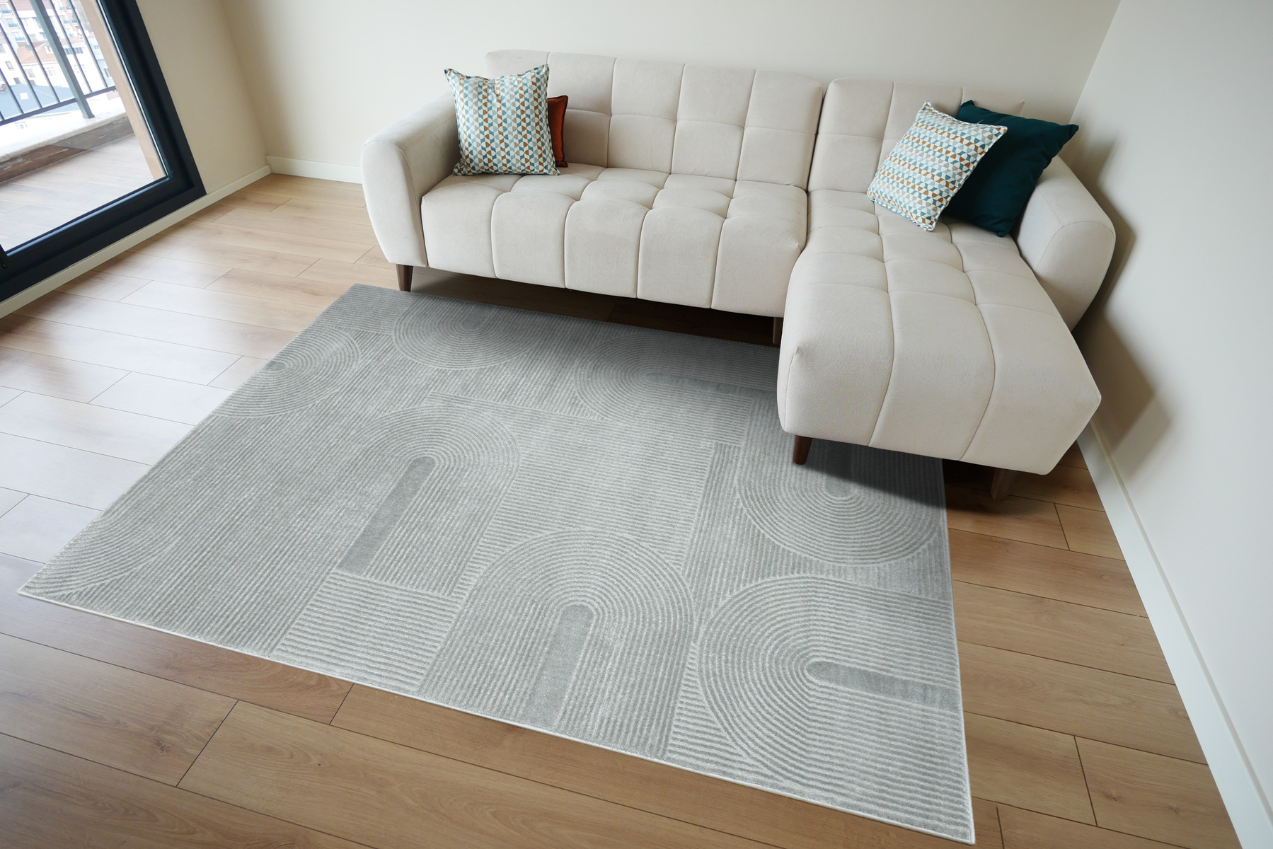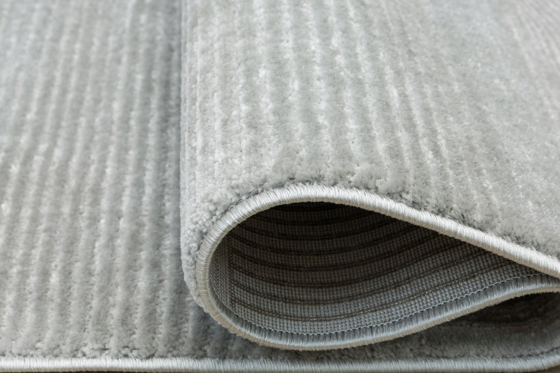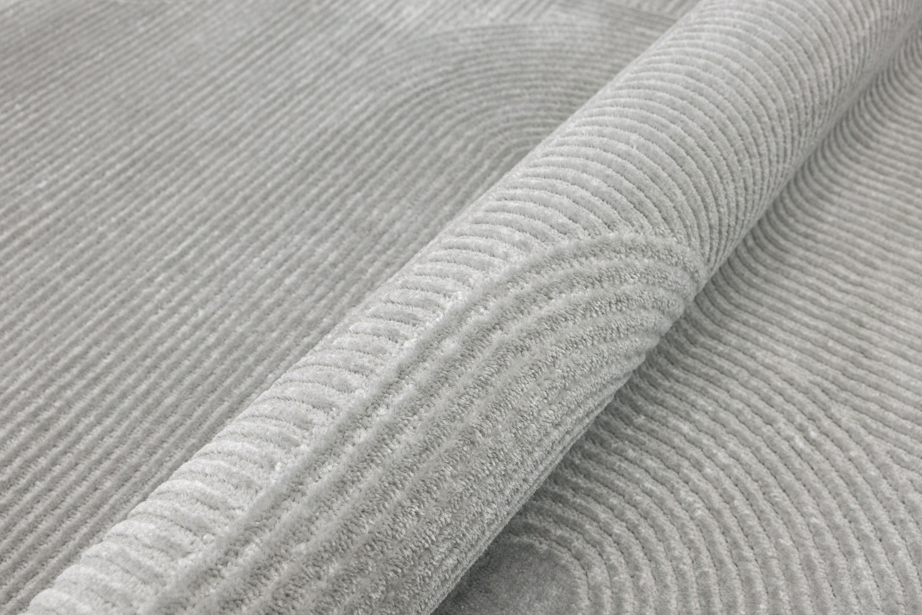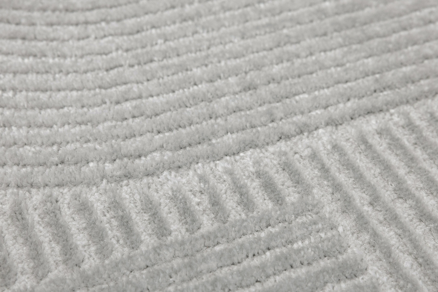 - Miękki i przyjemny w dotyku dywan Misha o lśniącym dwupoziomowym runie w szarości z geometrycznym, nowoczesnym wzorem w linie, półkola i spodem wykończonym jutą.