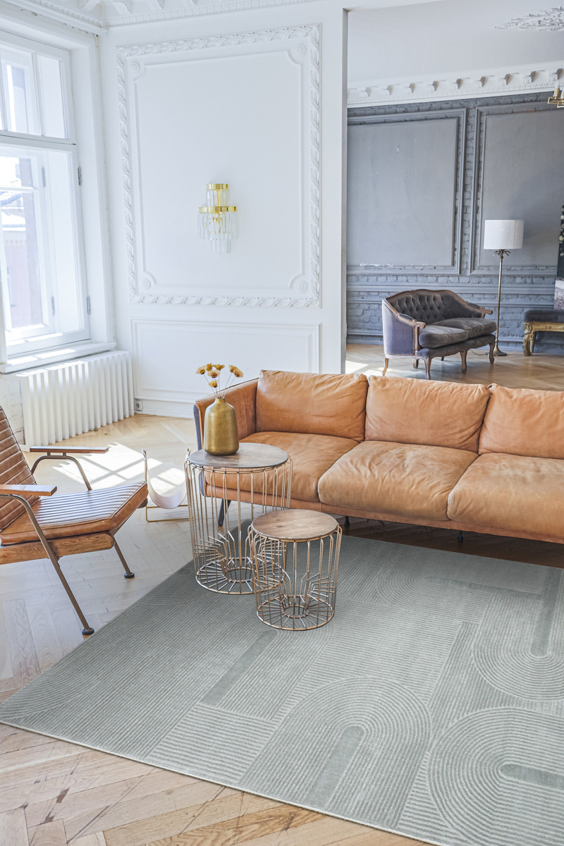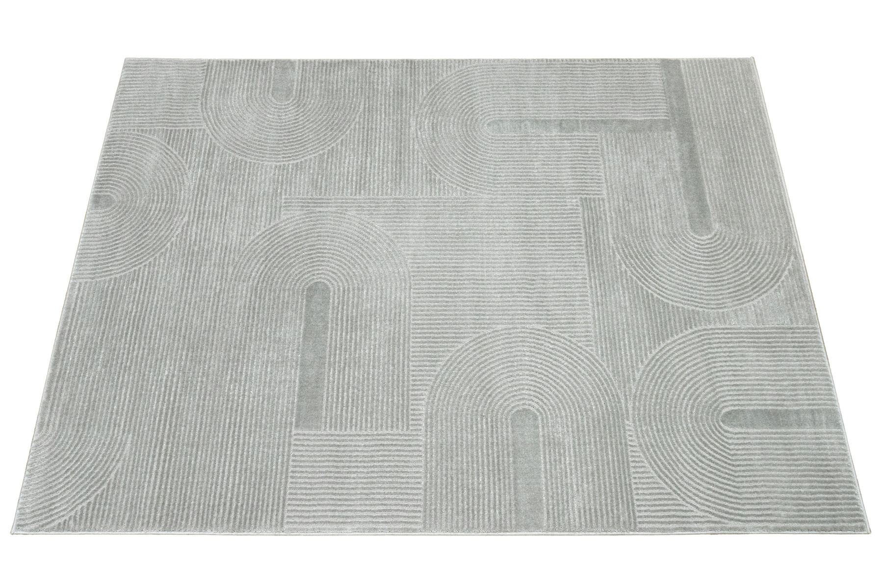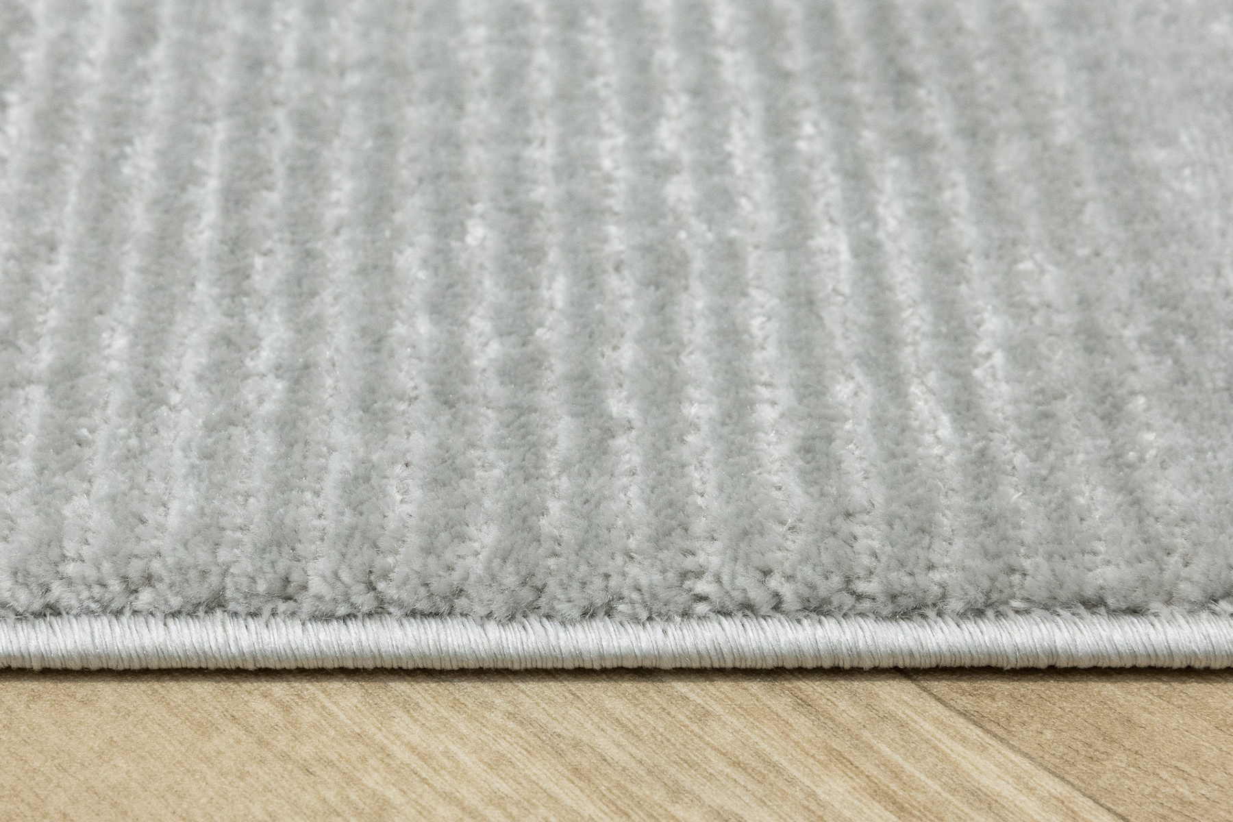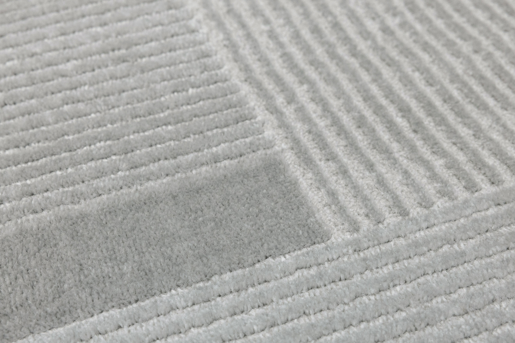 - Miękki i przyjemny w dotyku dywan Misha o lśniącym dwupoziomowym runie w szarości z geometrycznym, nowoczesnym wzorem w linie, półkola i spodem wykończonym jutą.