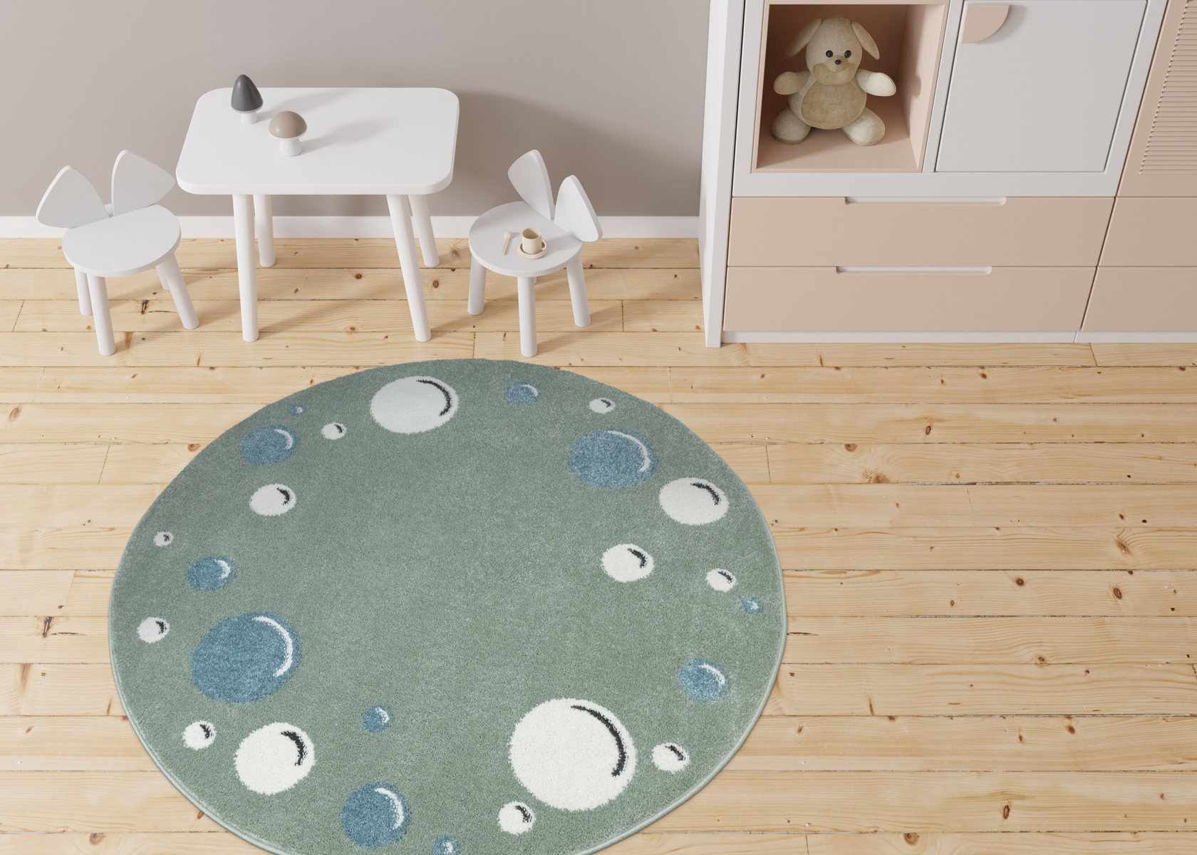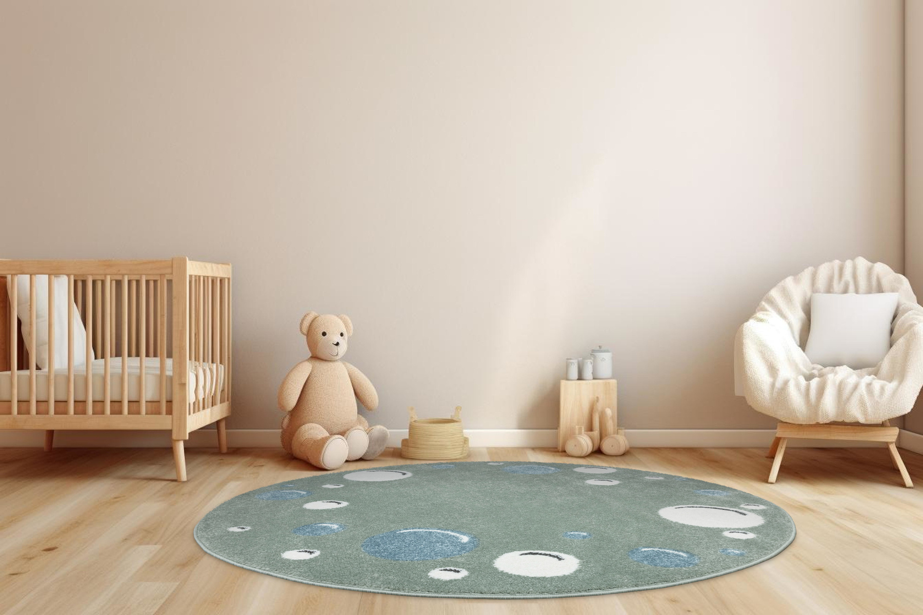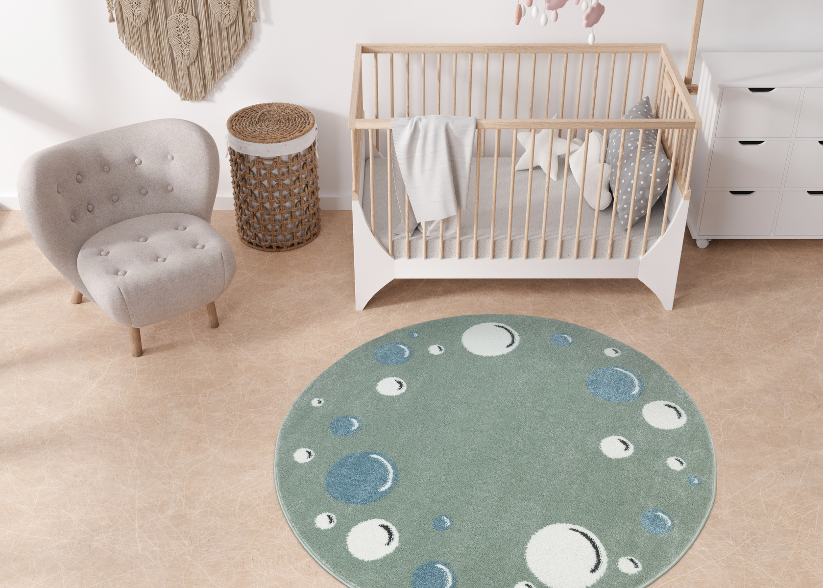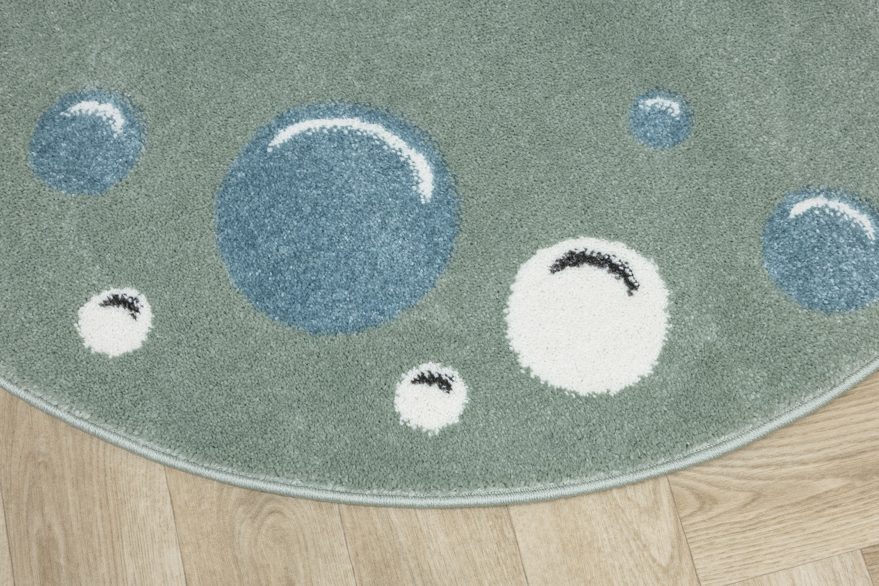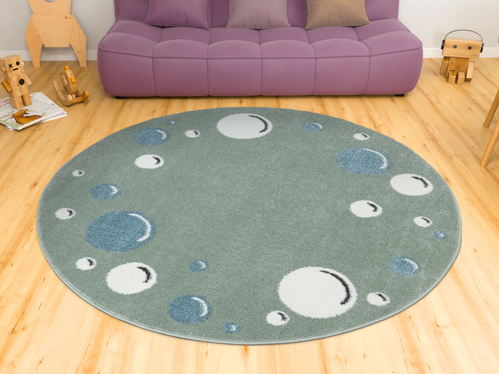 - Okrągły dywan dziecięcy Lima z mięciutkim runem, ze wzorem w mydlane bańki w odcieniach pastelowej zieleni, kremu, grafitowej szarości i niebieskiego.