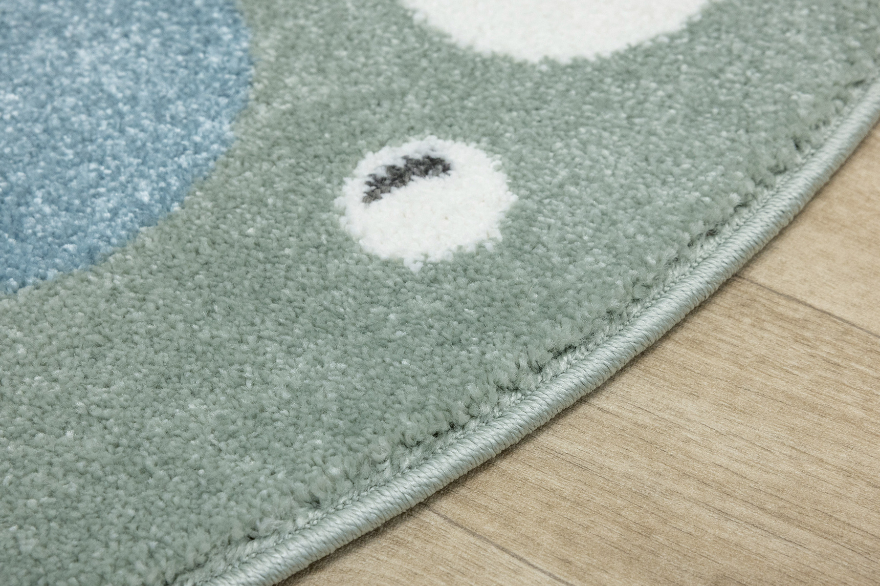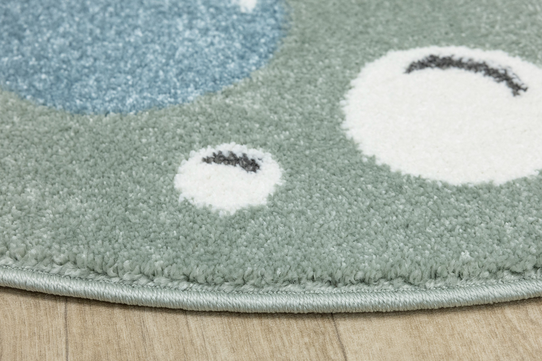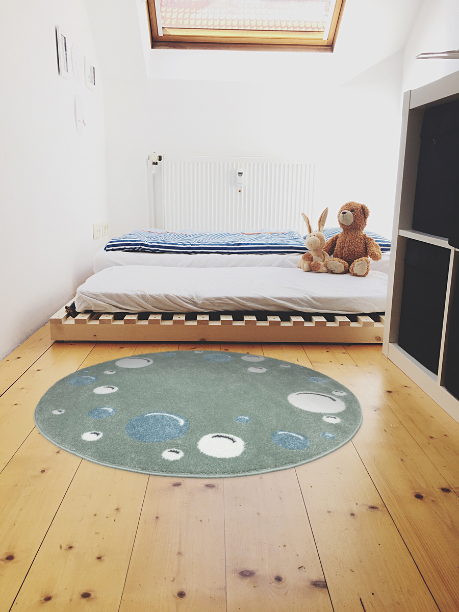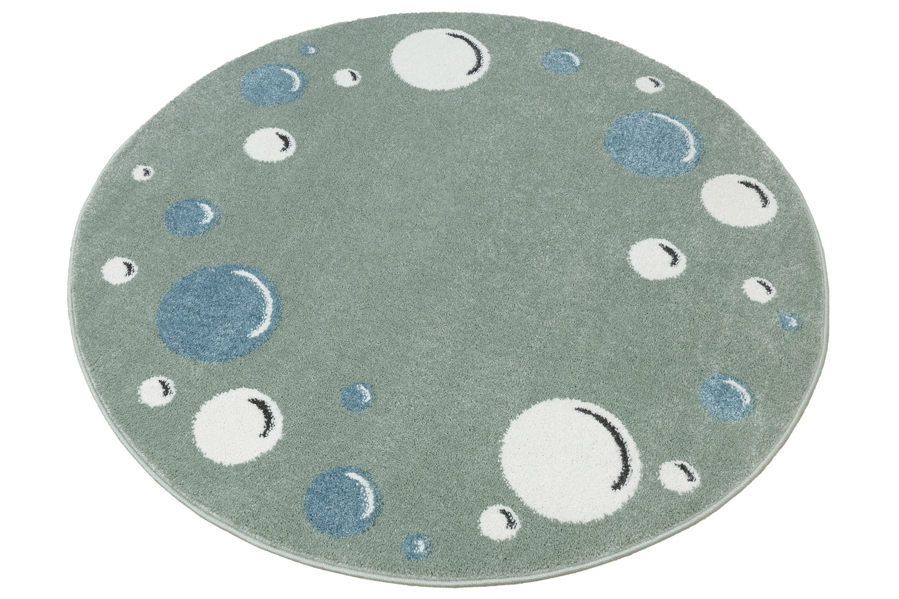 - Okrągły dywan dziecięcy Lima z mięciutkim runem, ze wzorem w mydlane bańki w odcieniach pastelowej zieleni, kremu, grafitowej szarości i niebieskiego.