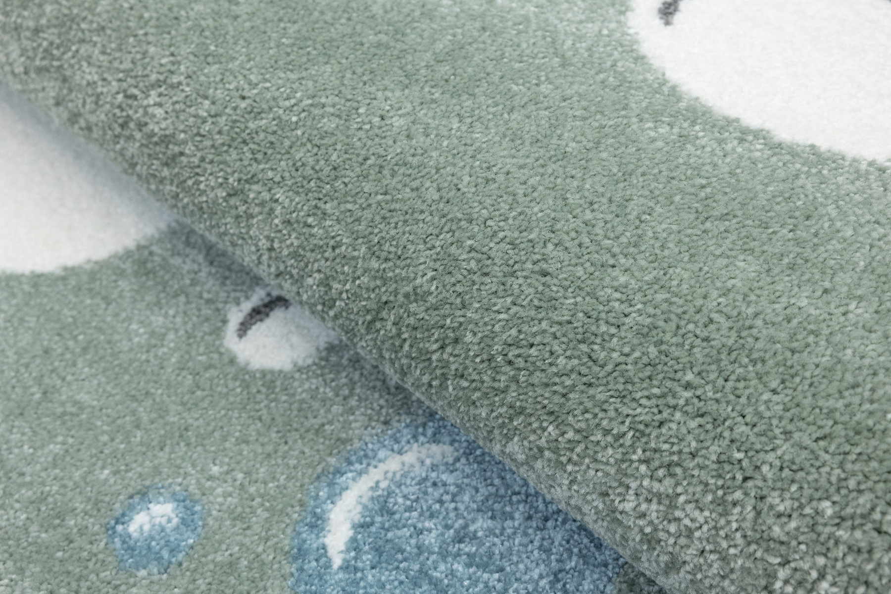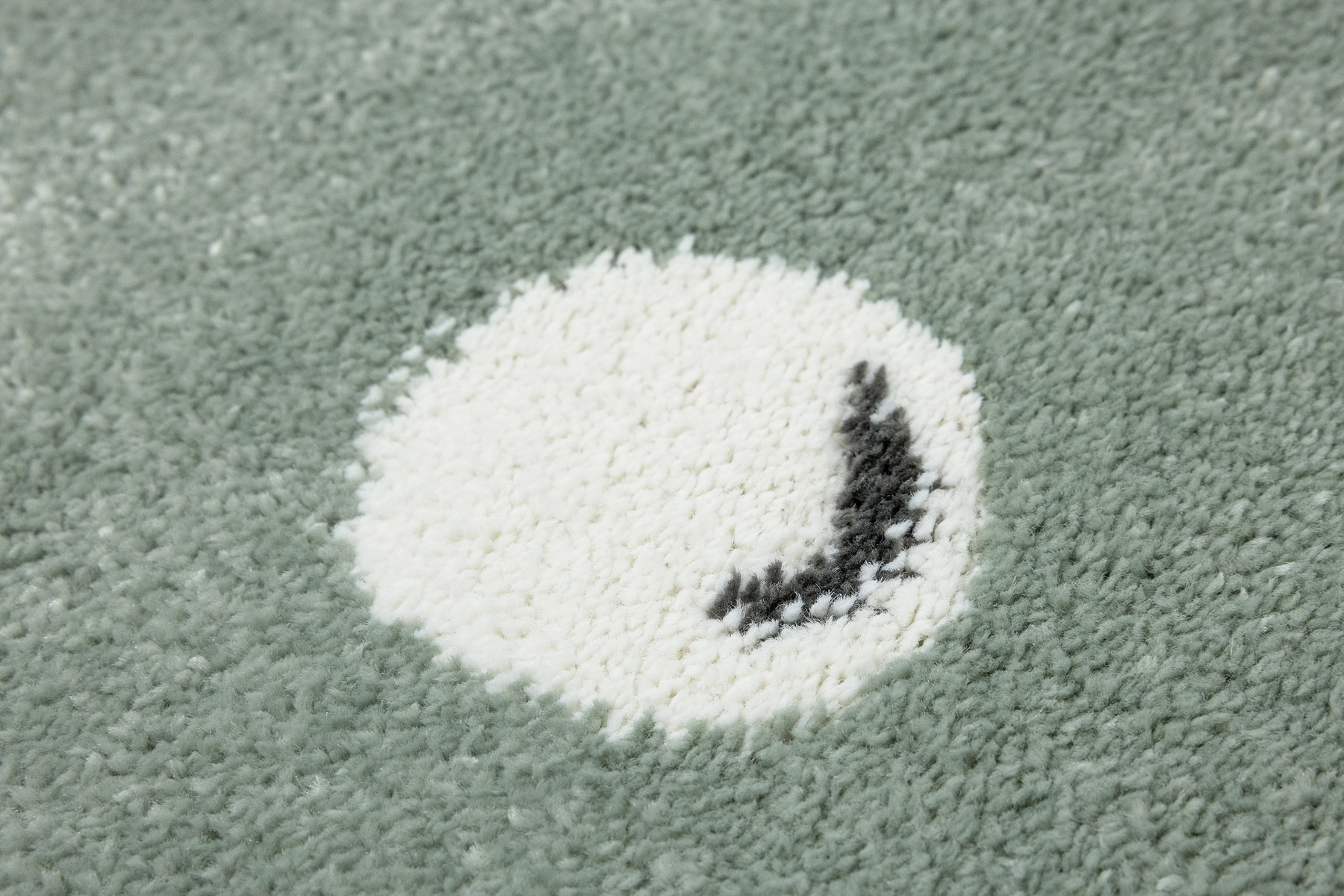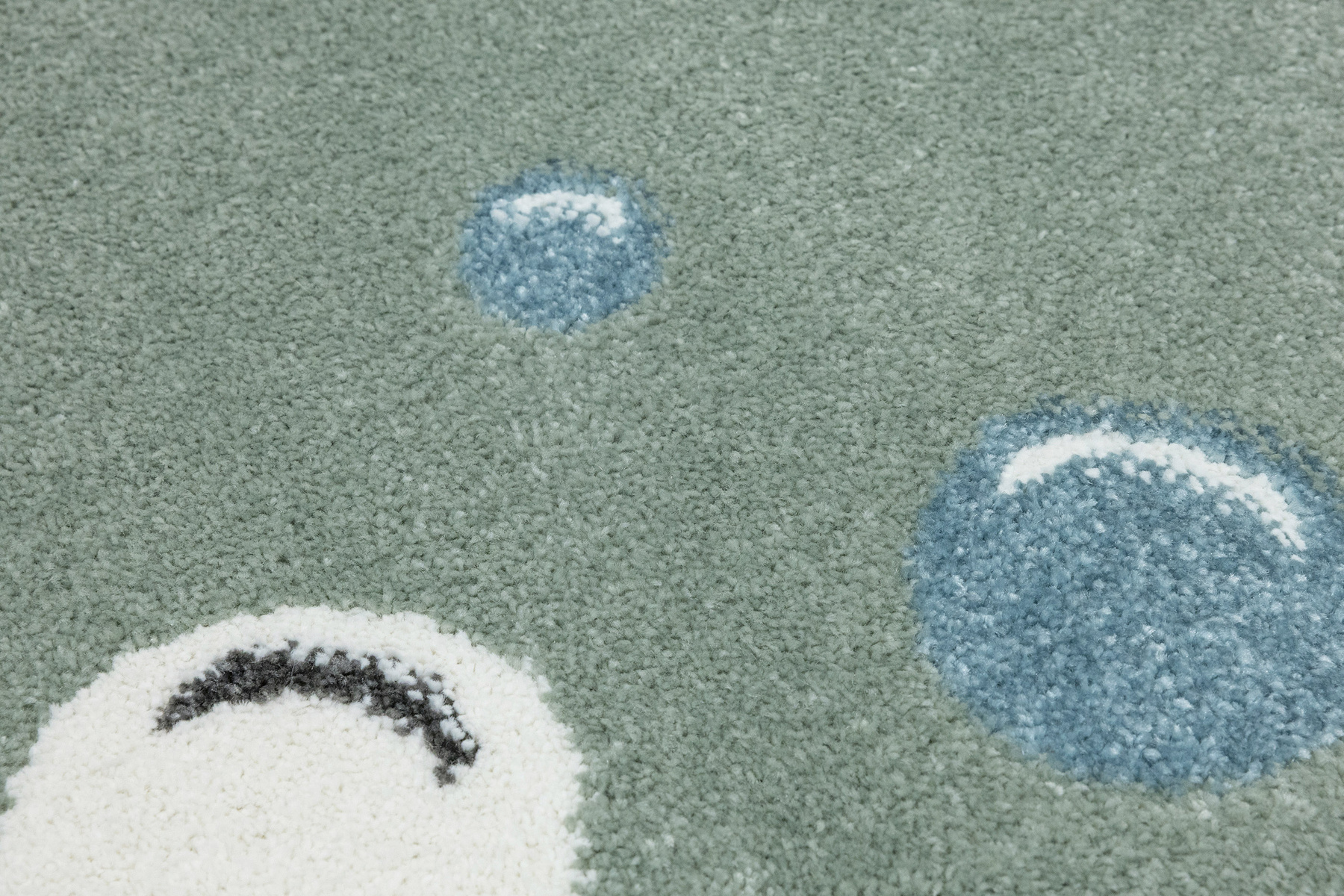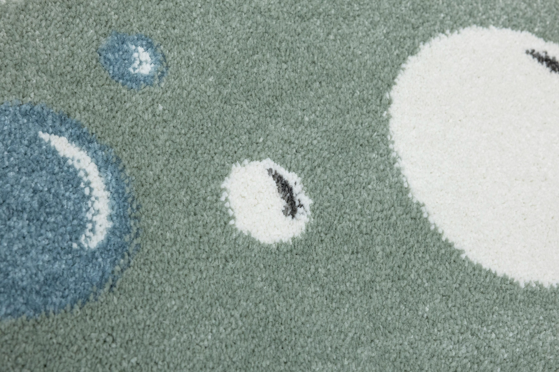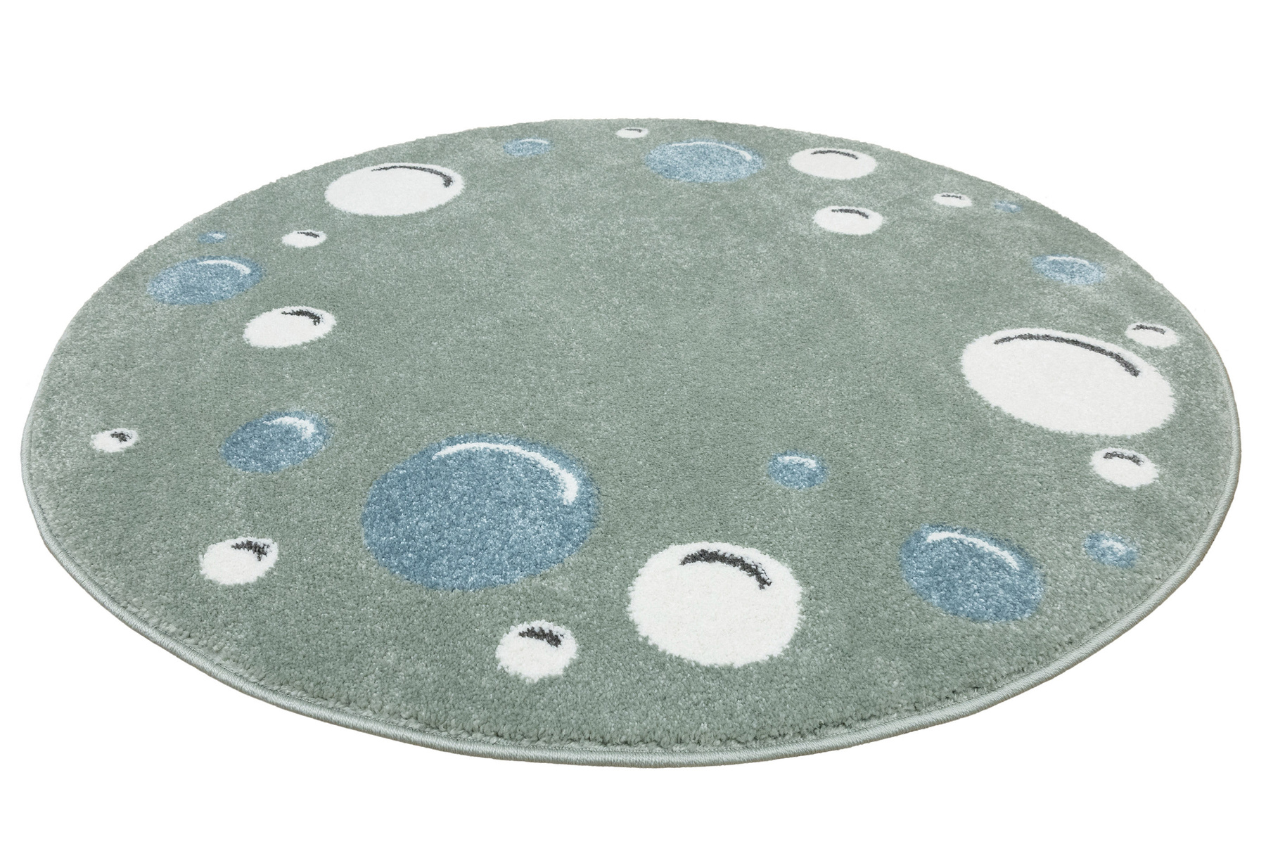- Okrągły dywan dziecięcy Lima z mięciutkim runem, ze wzorem w mydlane bańki w odcieniach pastelowej zieleni, kremu, grafitowej szarości i niebieskiego.