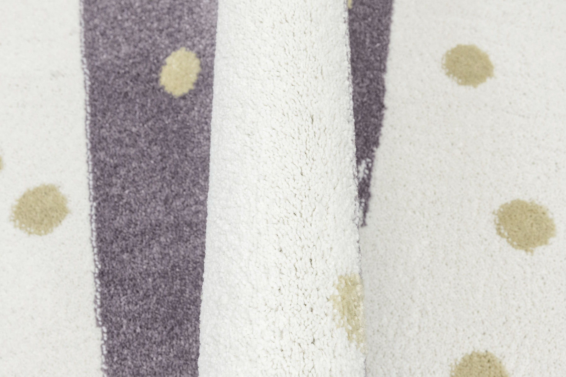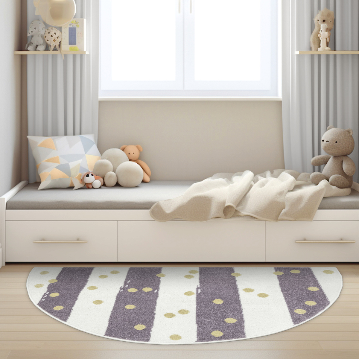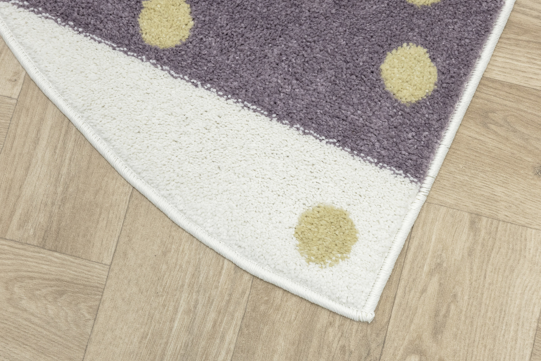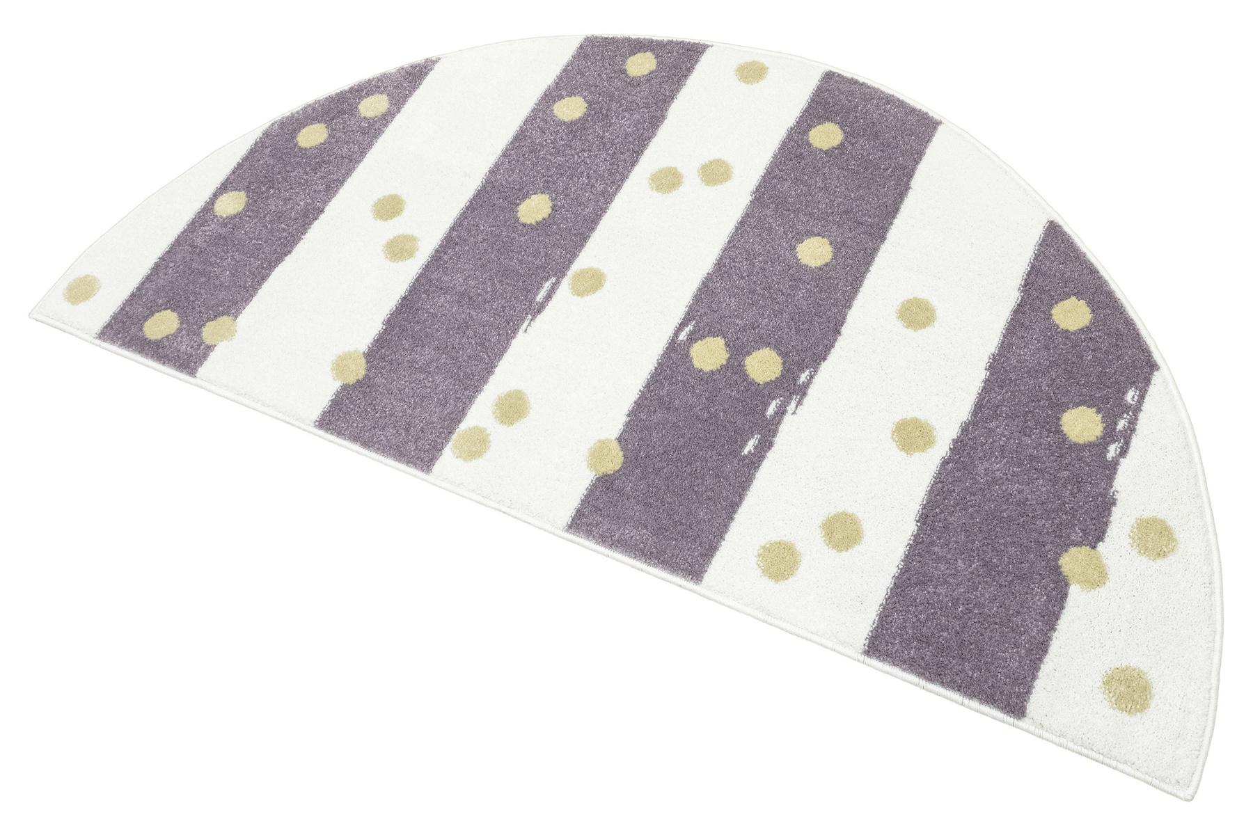 - Półokrągły dywan dziecięcy Lima z wzorem w nieregularne pasy i kropki w odcieniach kremu, pastelowego fioletu i złota, ze spodem wykończonym jutą.
