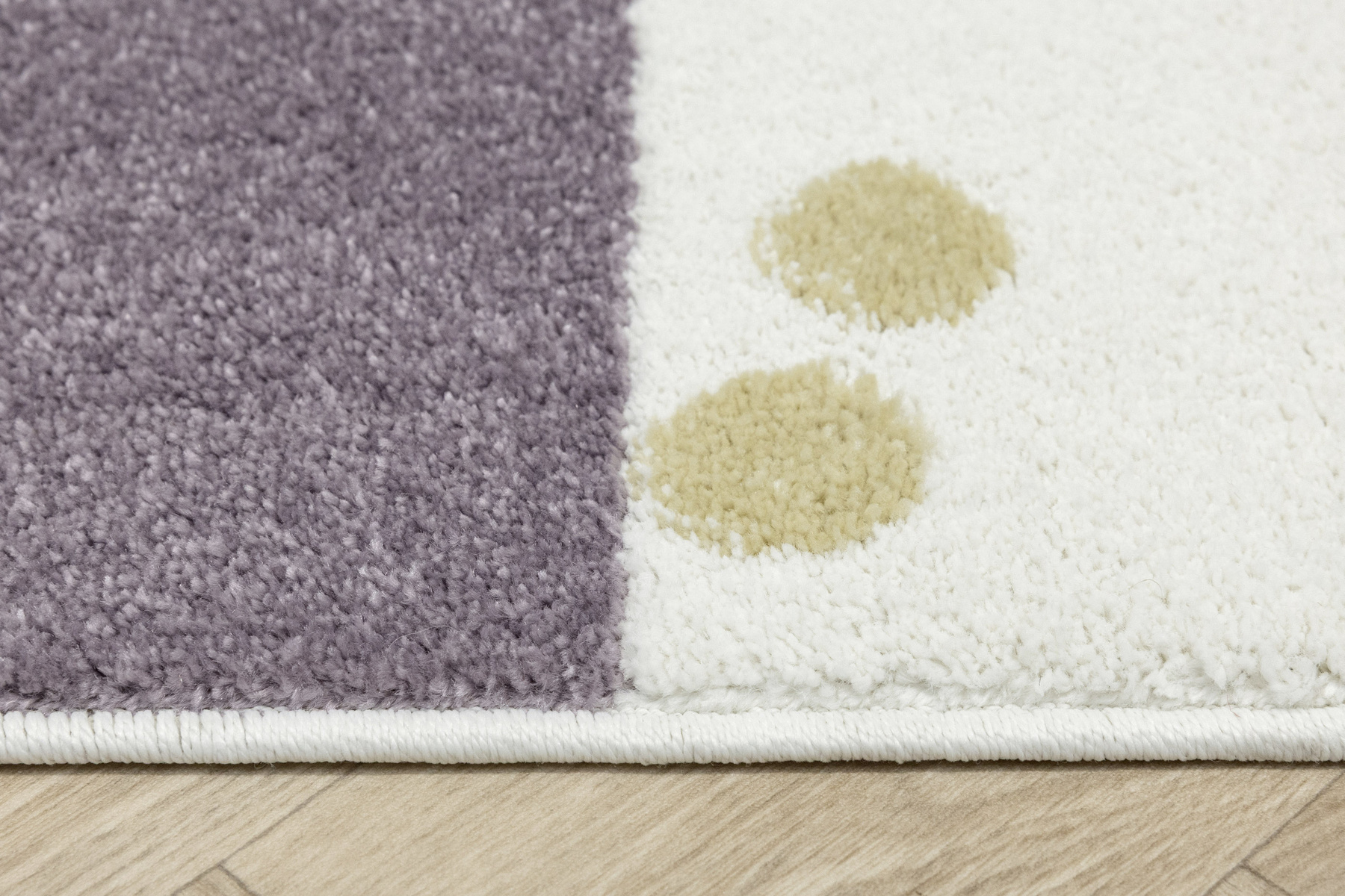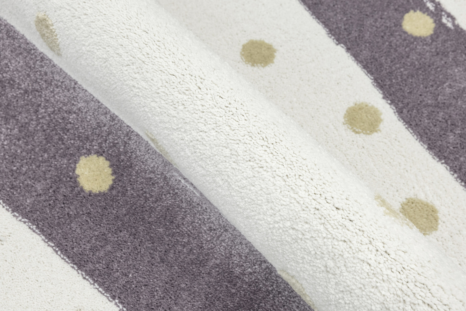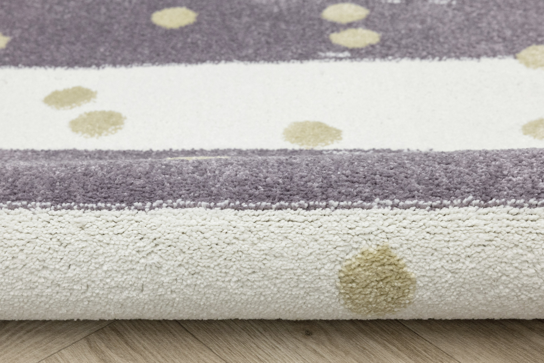 - Półokrągły dywan dziecięcy Lima z wzorem w nieregularne pasy i kropki w odcieniach kremu, pastelowego fioletu i złota, ze spodem wykończonym jutą.