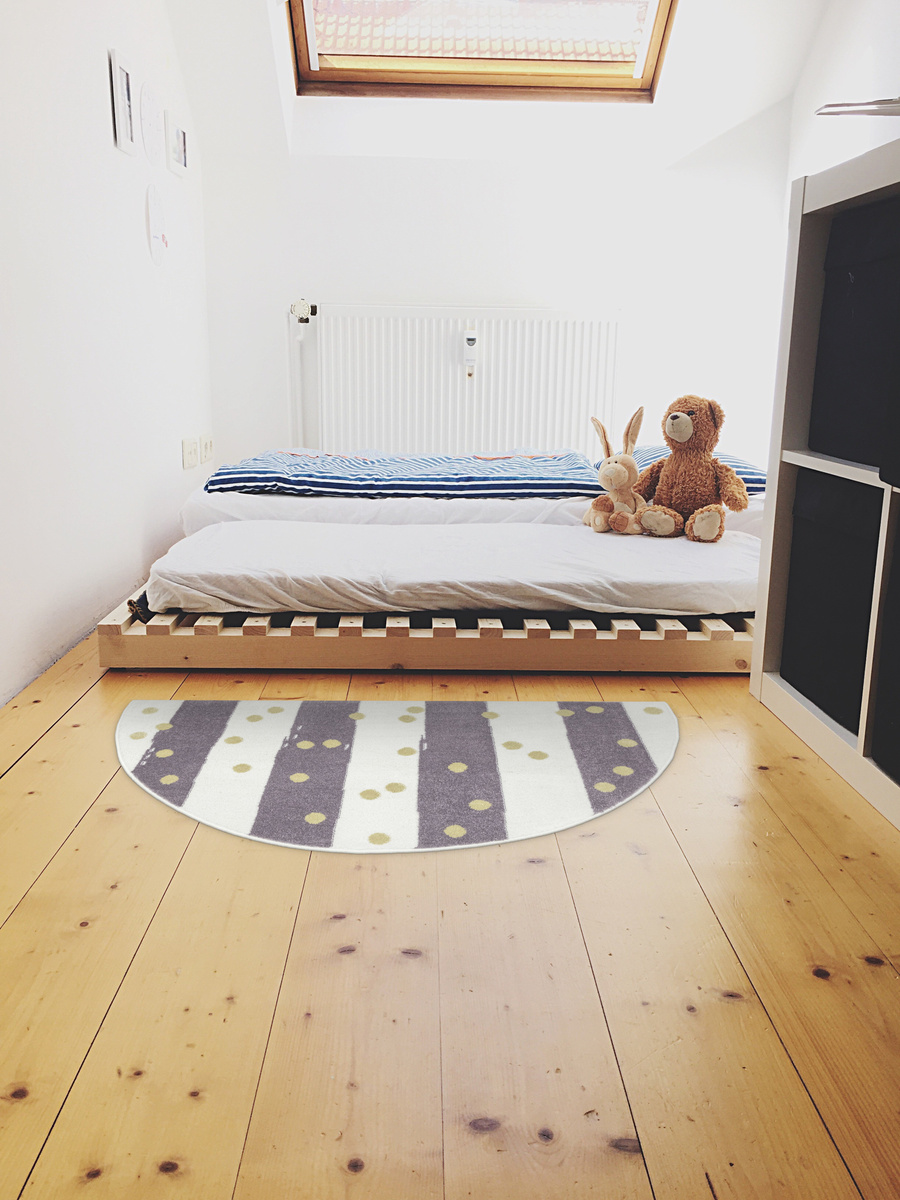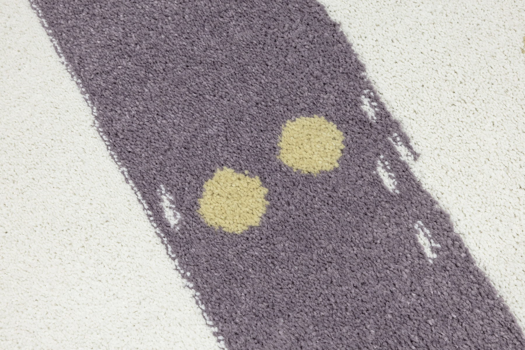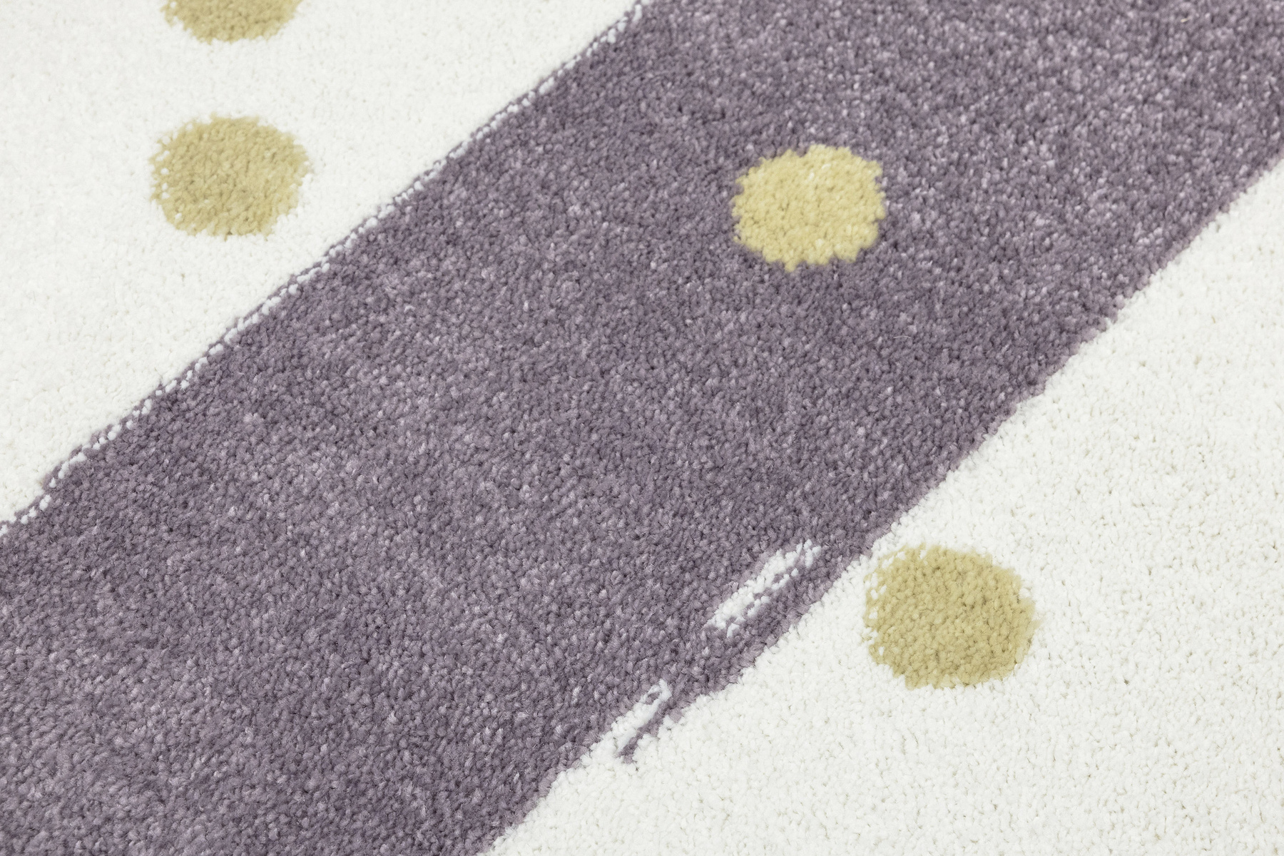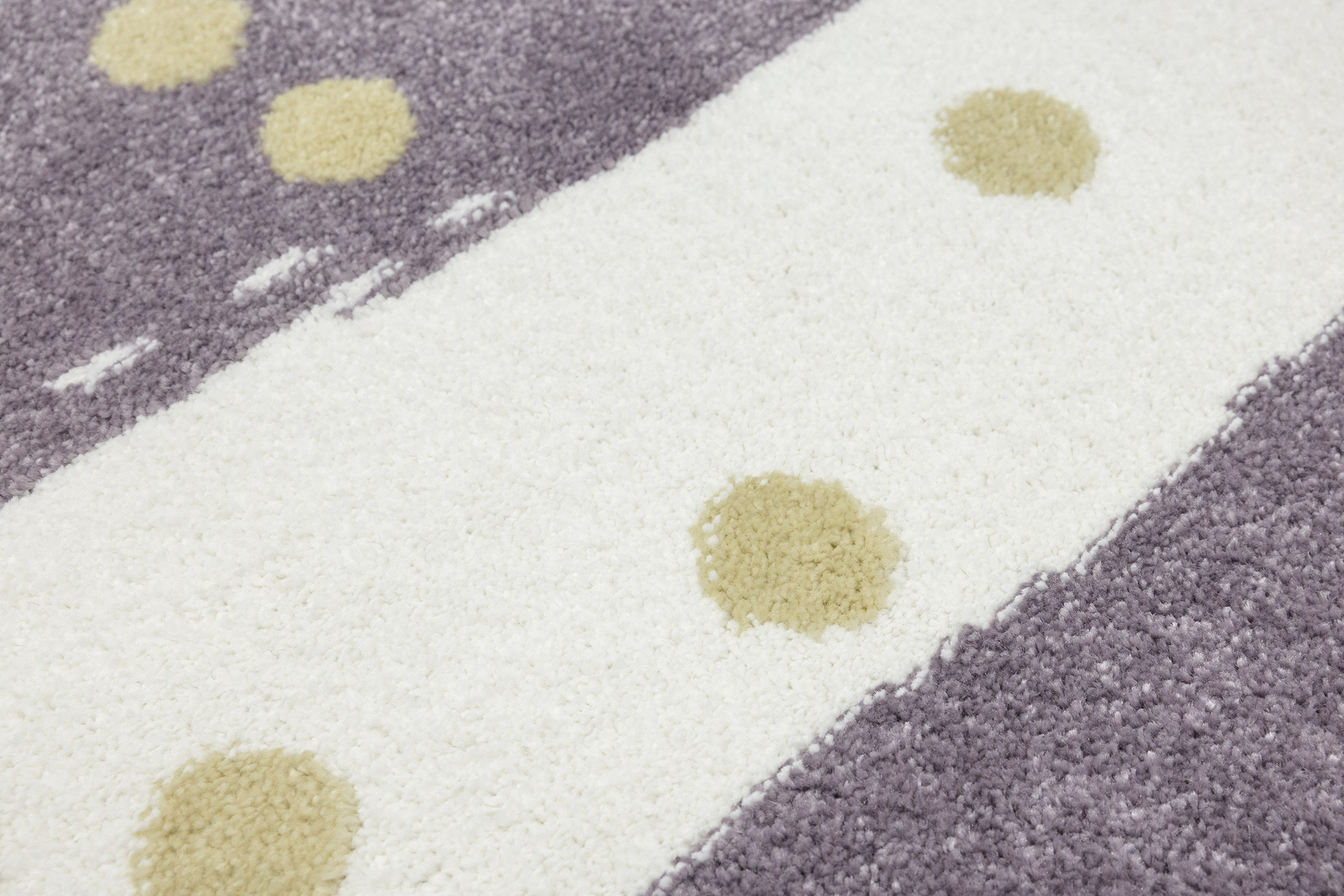 - Półokrągły dywan dziecięcy Lima z wzorem w nieregularne pasy i kropki w odcieniach kremu, pastelowego fioletu i złota, ze spodem wykończonym jutą.