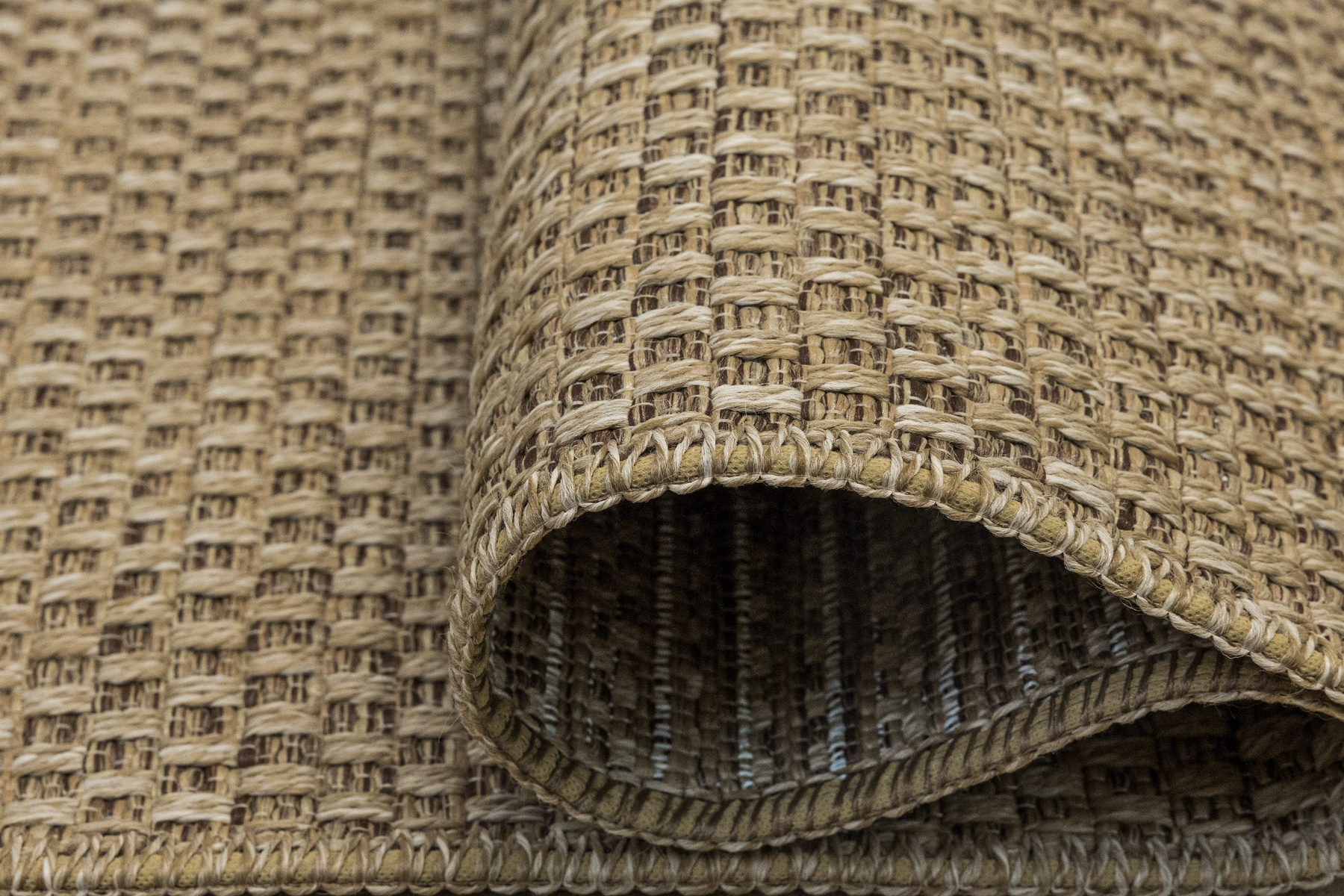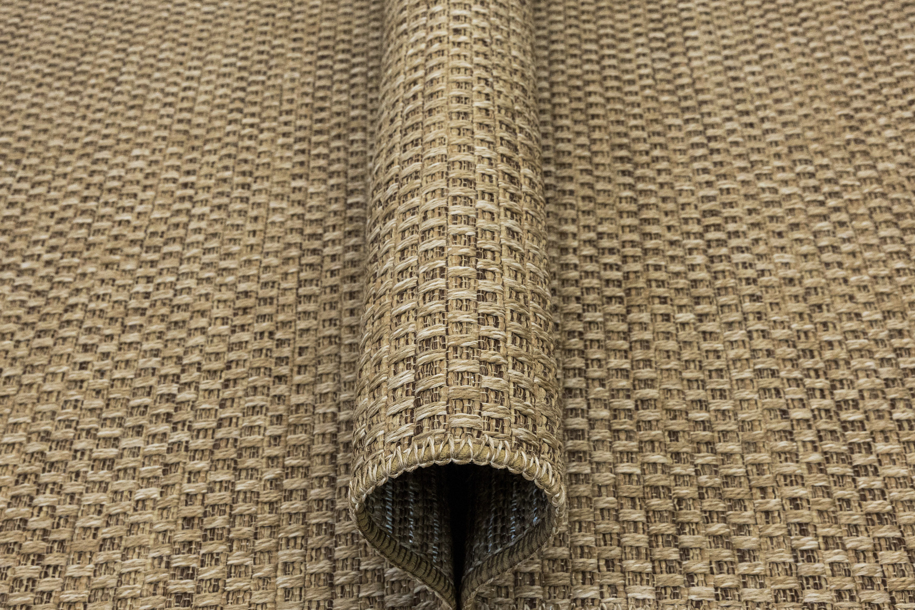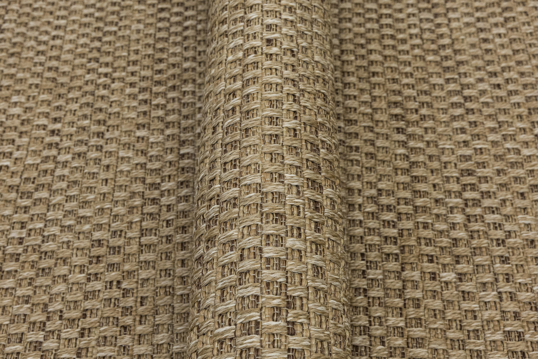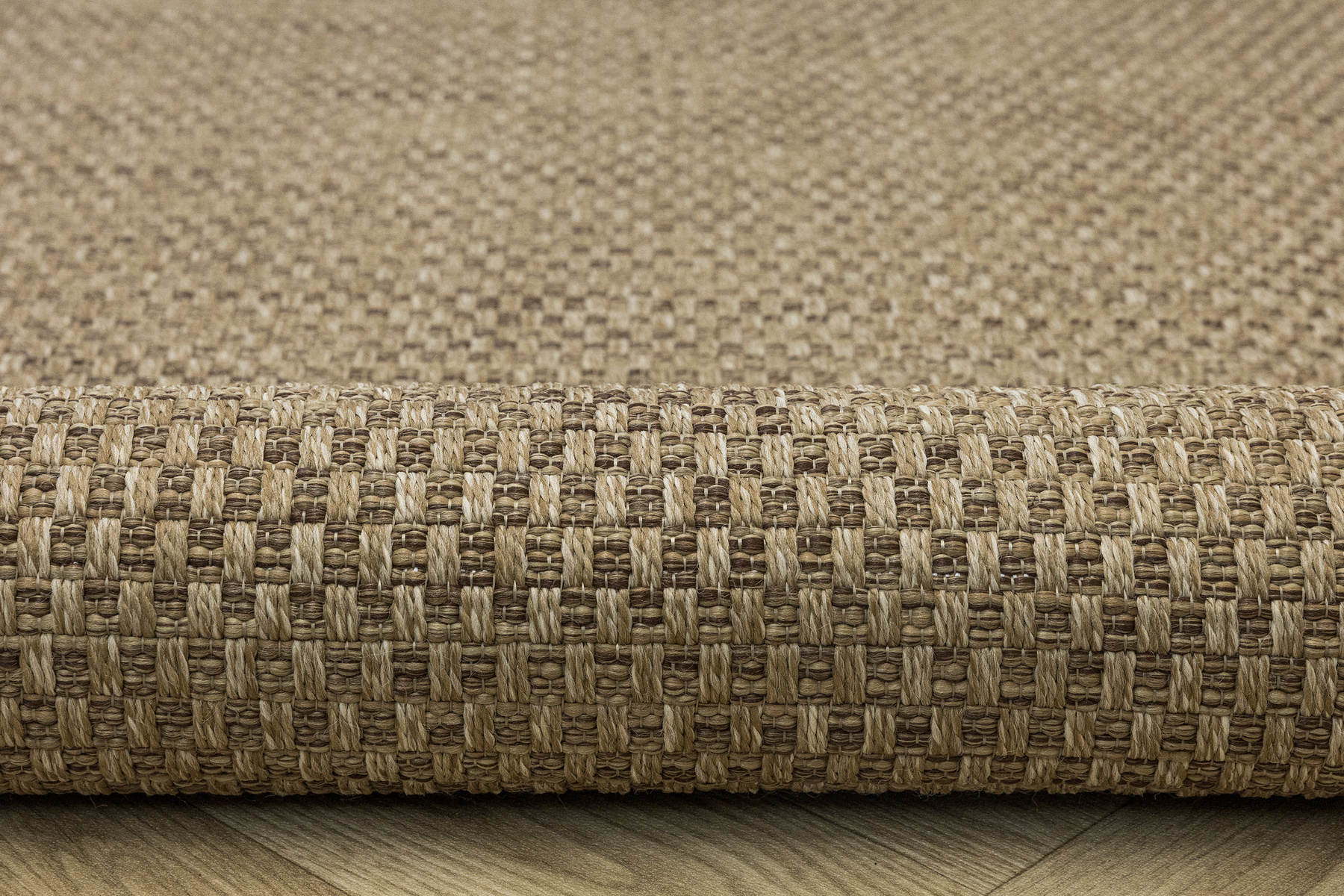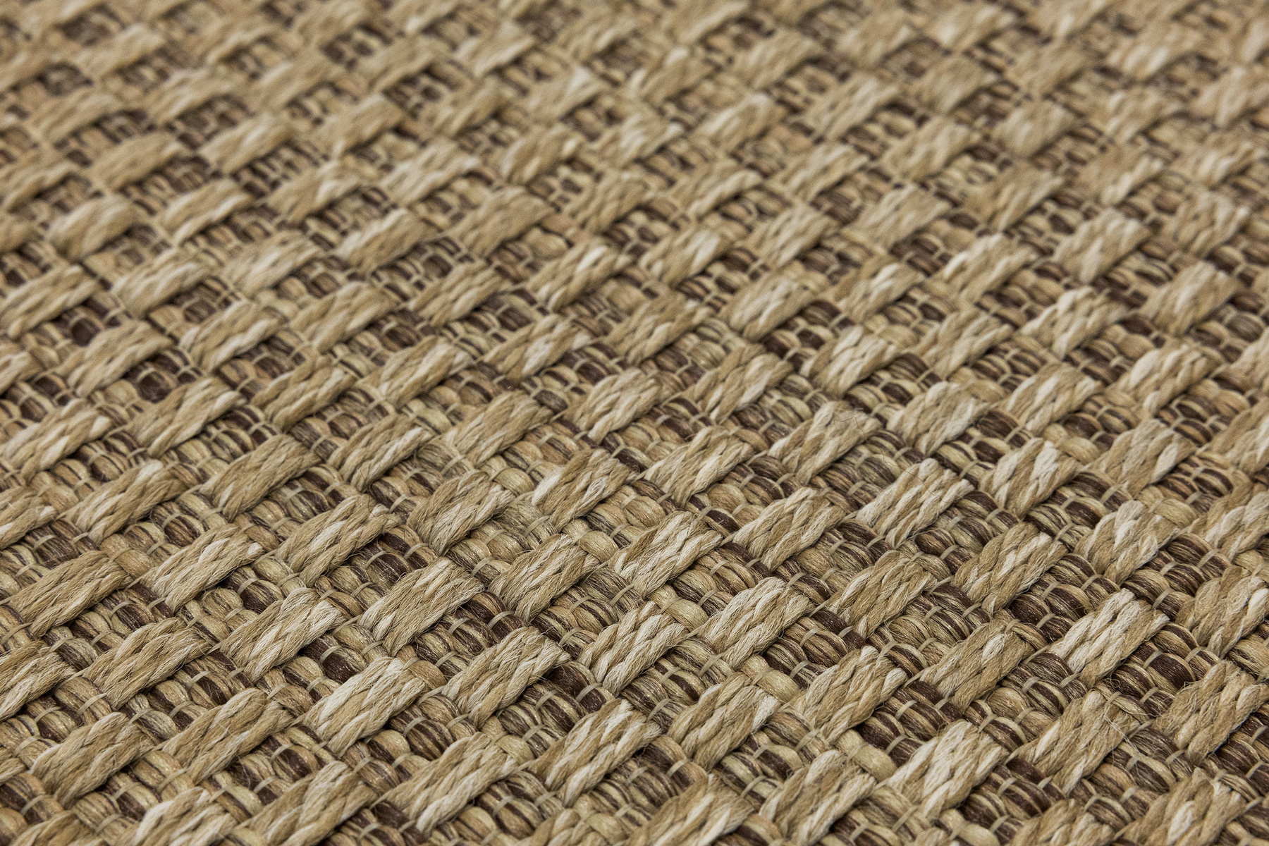 - Dywan sznurkowy Ella z plecionym runem, geometrycznym wzorem w kratkę w odcieniach beżu, brązu i kremu, antypoślizgowym spodem, który może być stosowany zarówno wewnątrz jak i na zewnątrz.