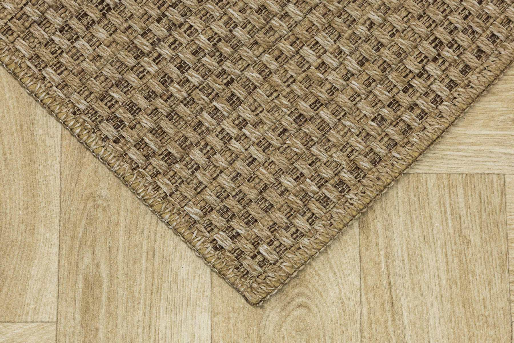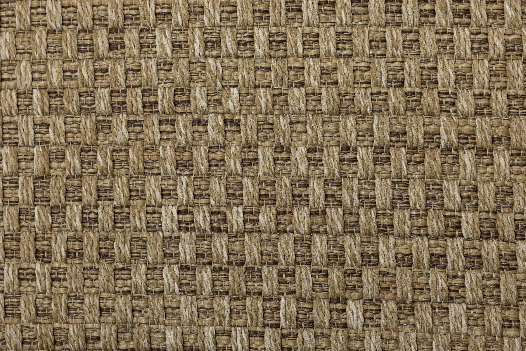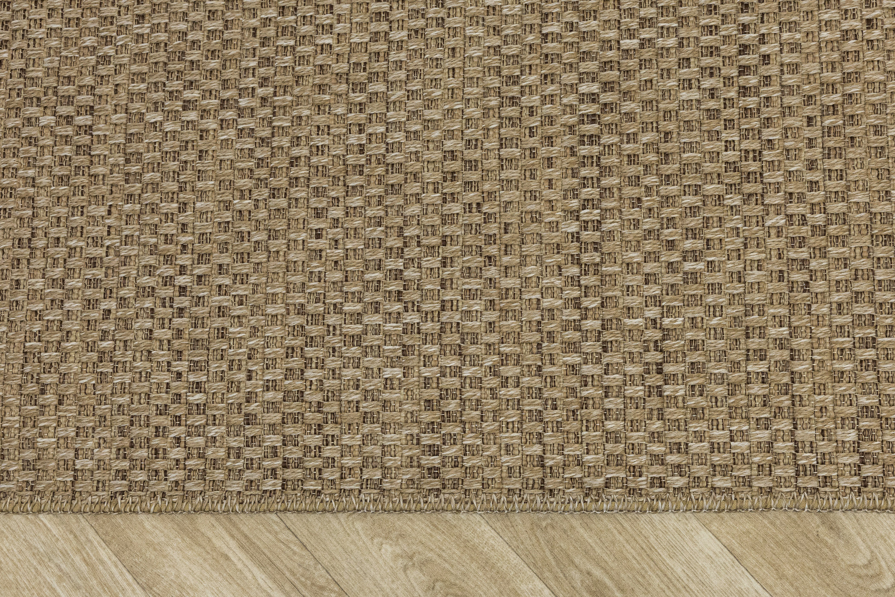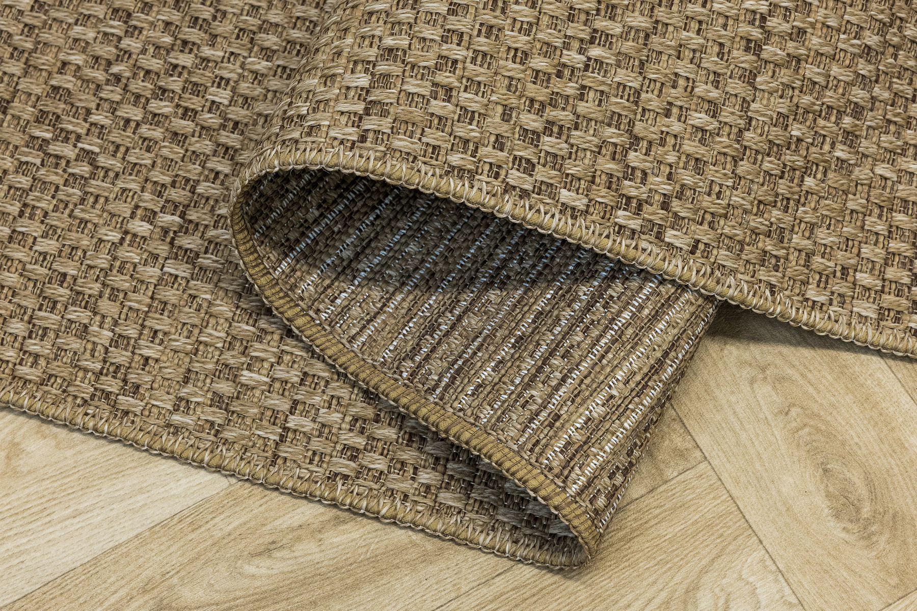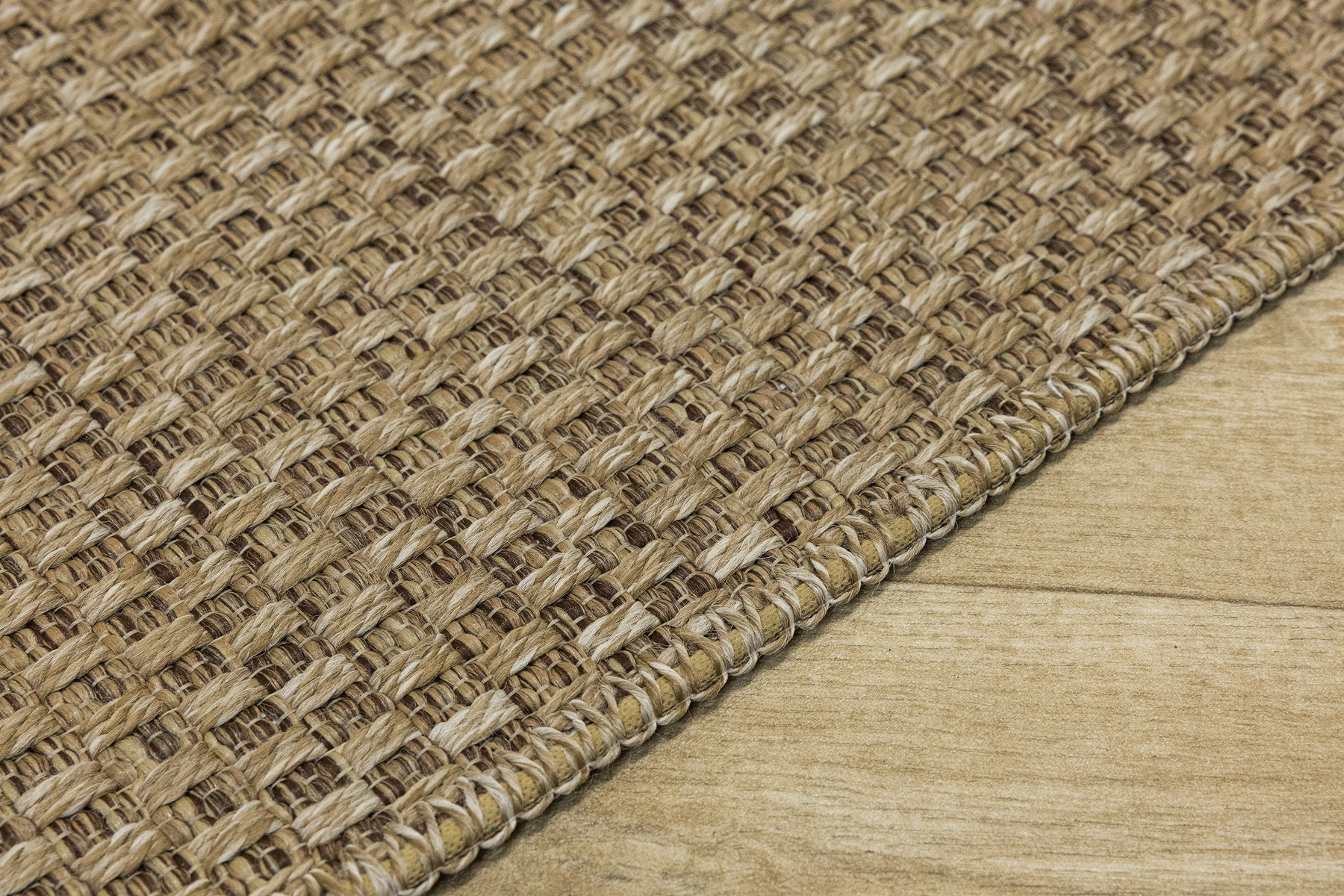 - Dywan sznurkowy Ella z plecionym runem, geometrycznym wzorem w kratkę w odcieniach beżu, brązu i kremu, antypoślizgowym spodem, który może być stosowany zarówno wewnątrz jak i na zewnątrz.
