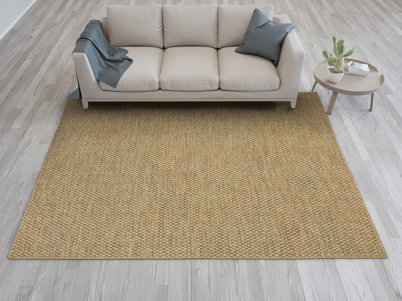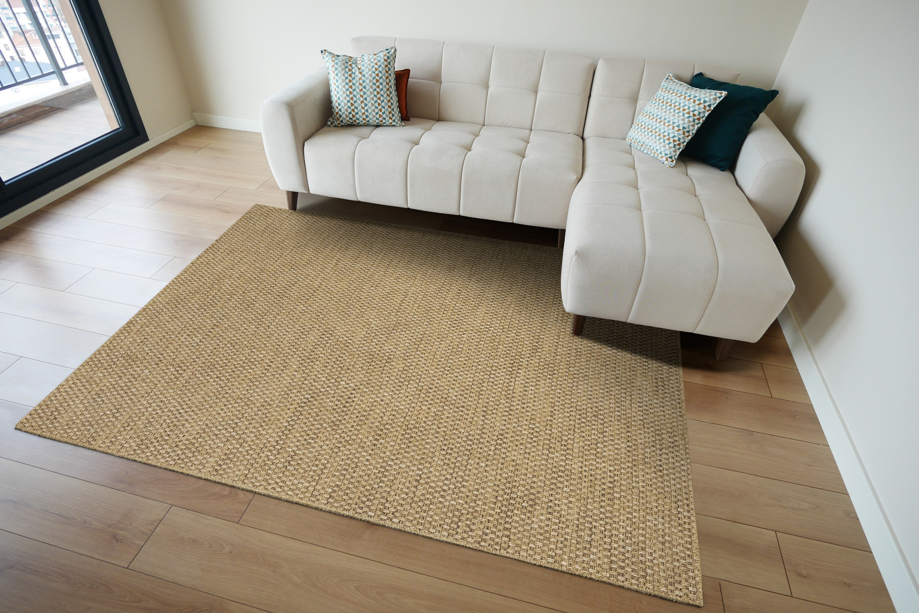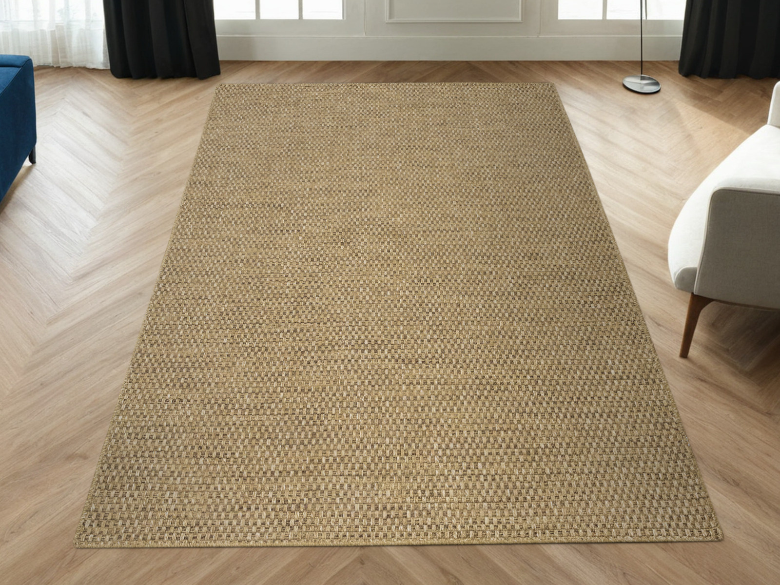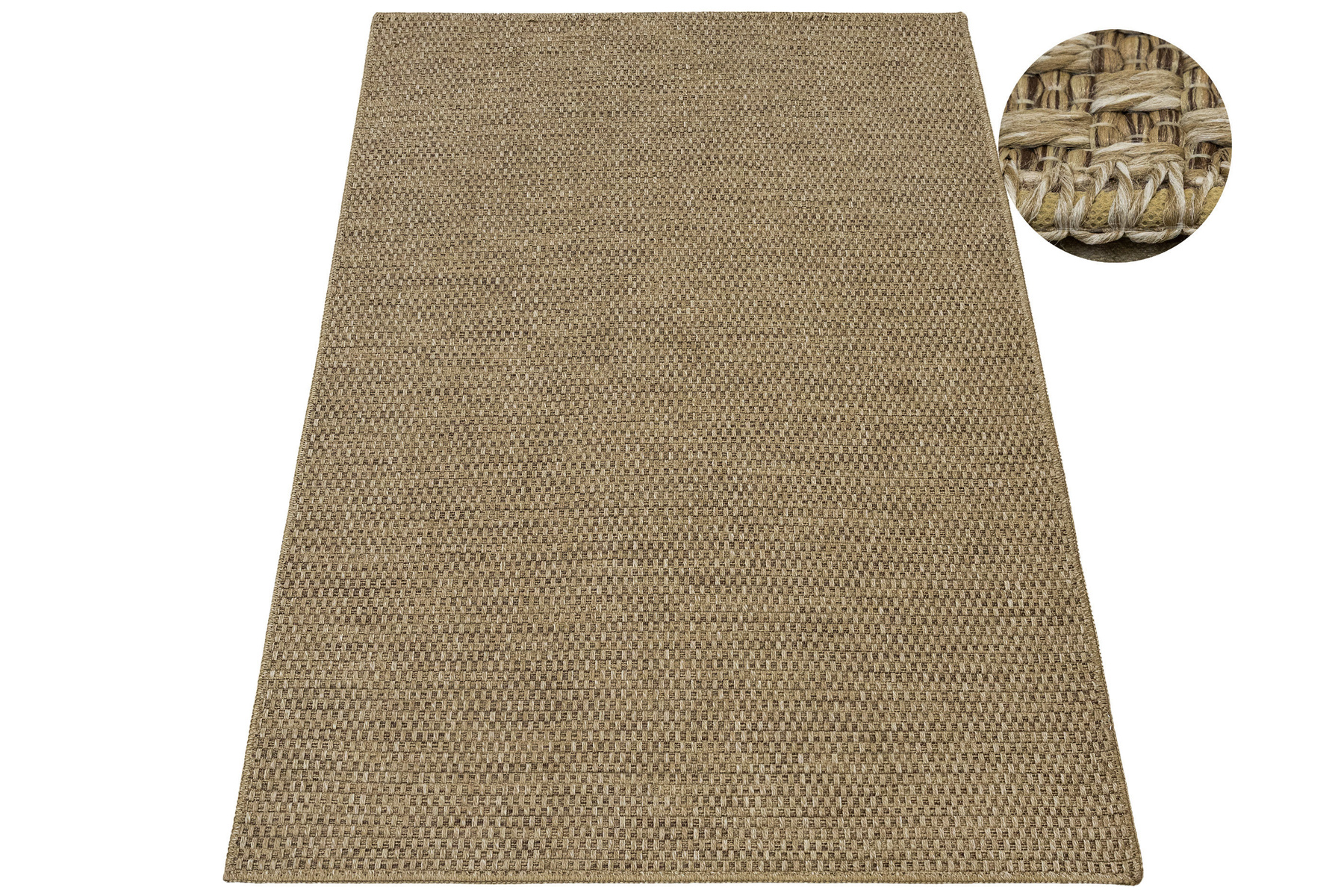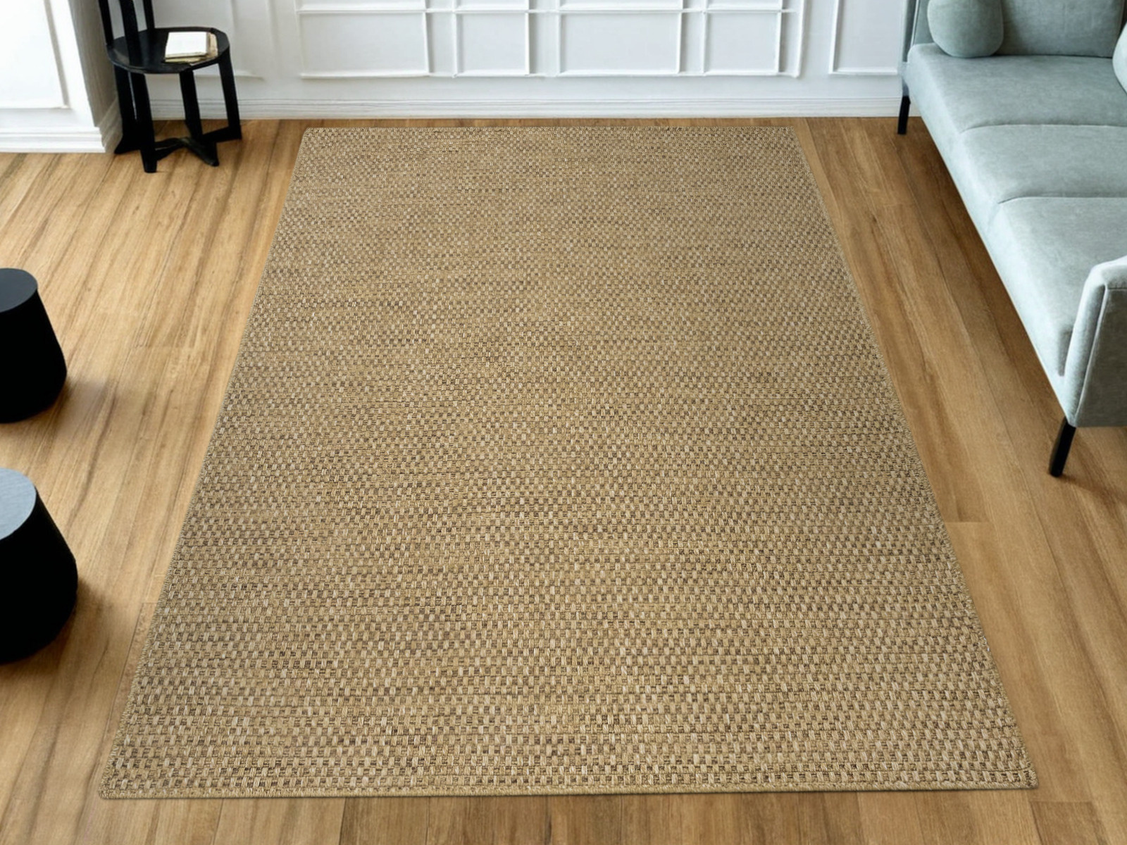- Dywan sznurkowy Ella z plecionym runem, geometrycznym wzorem w kratkę w odcieniach beżu, brązu i kremu, antypoślizgowym spodem, który może być stosowany zarówno wewnątrz jak i na zewnątrz.