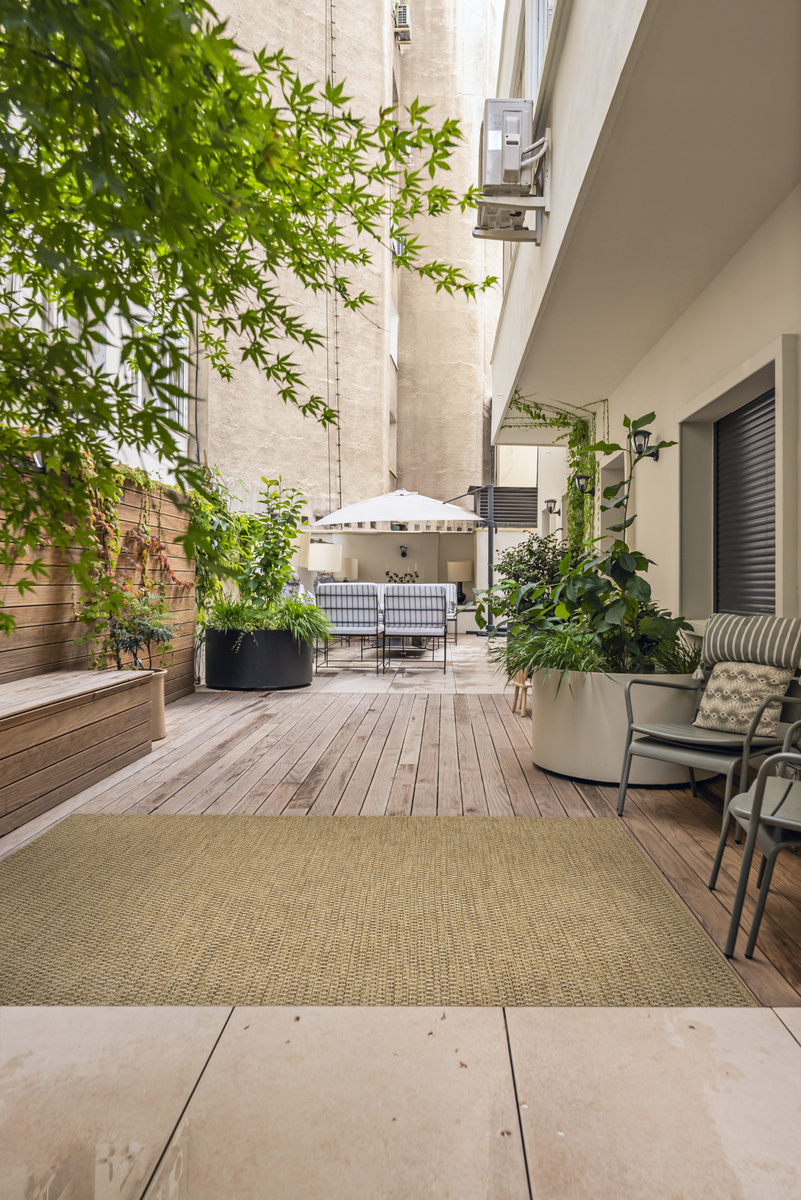 Nowoczesna technologia tkania pozwala używać dywany ELLA także na dworze, na tarasach, balkonach czy na działce.