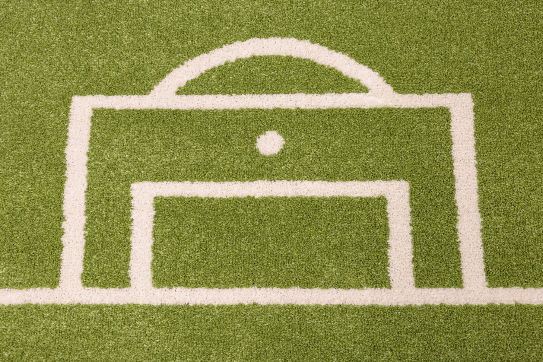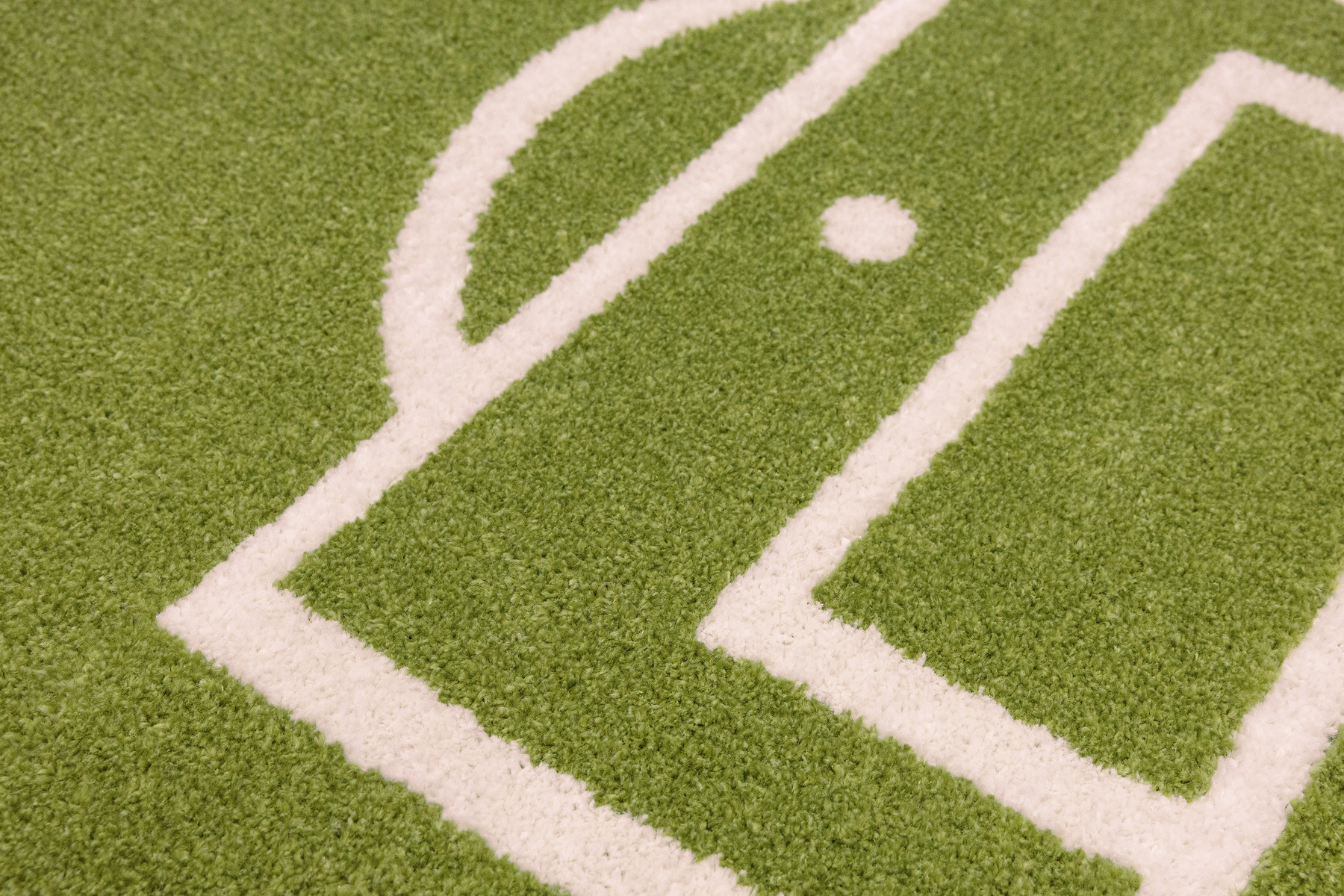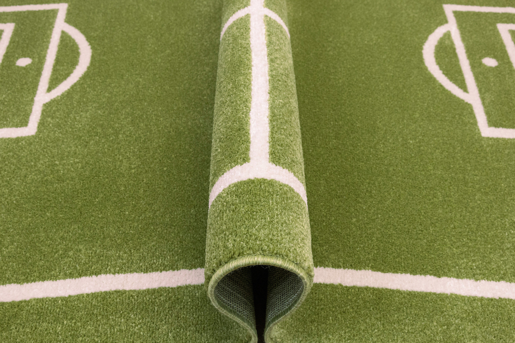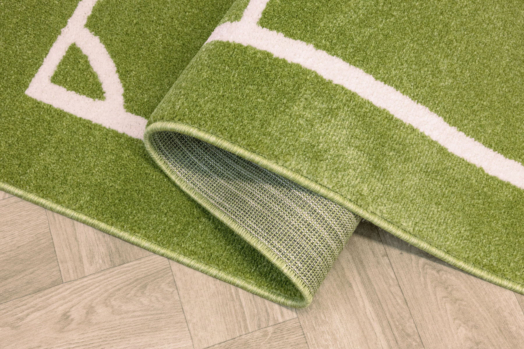 - Dziecięcy dywan Clara Kids o mięciutkim runie ze wzorem boiska do piłki nożnej w odcieniach żywej zieleni i kremu i spodem wykończonym jutą.