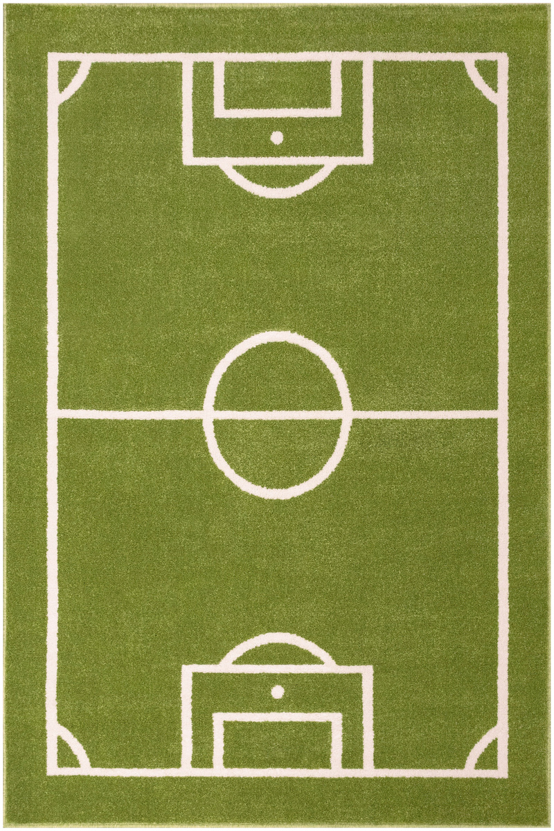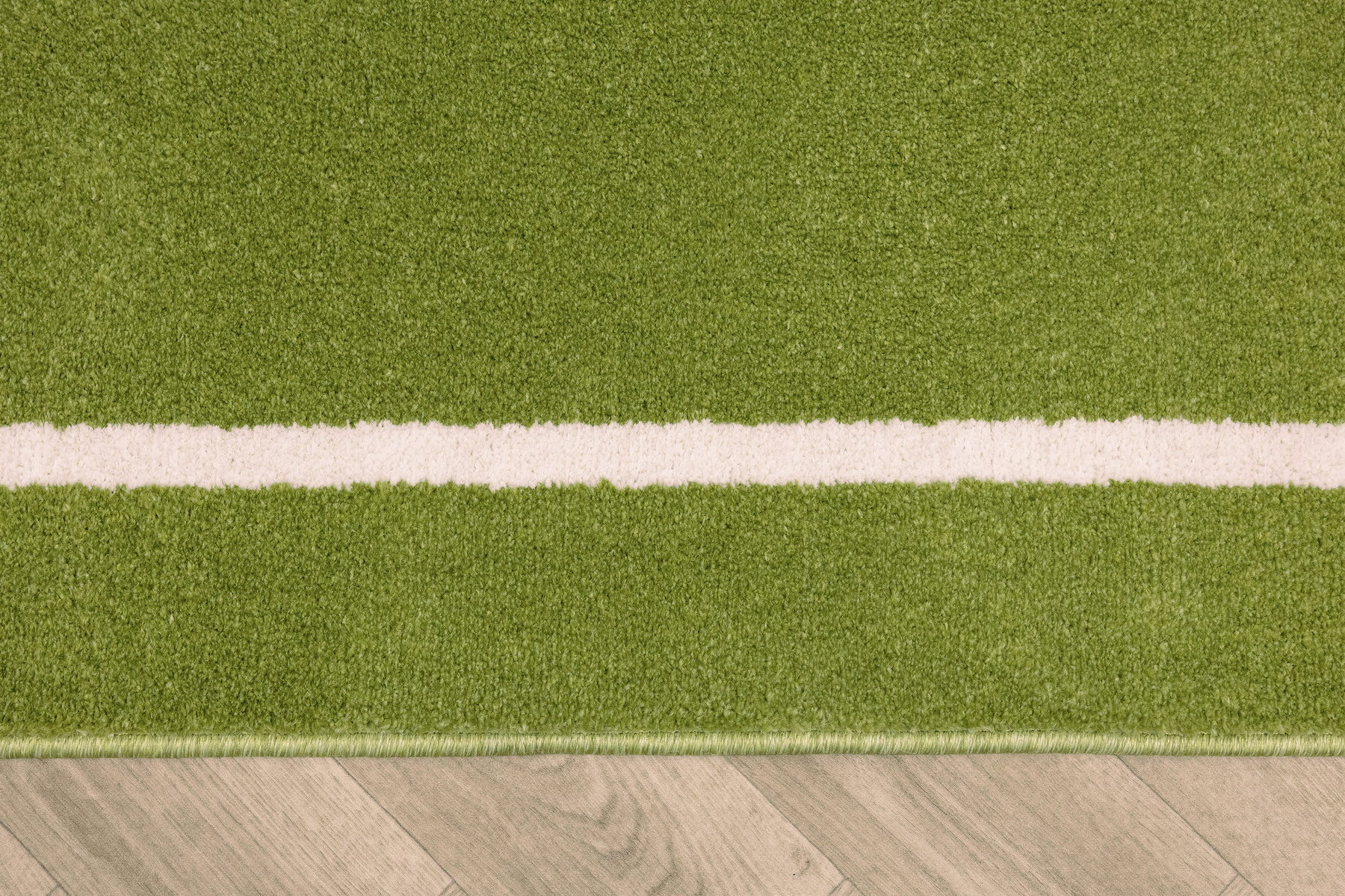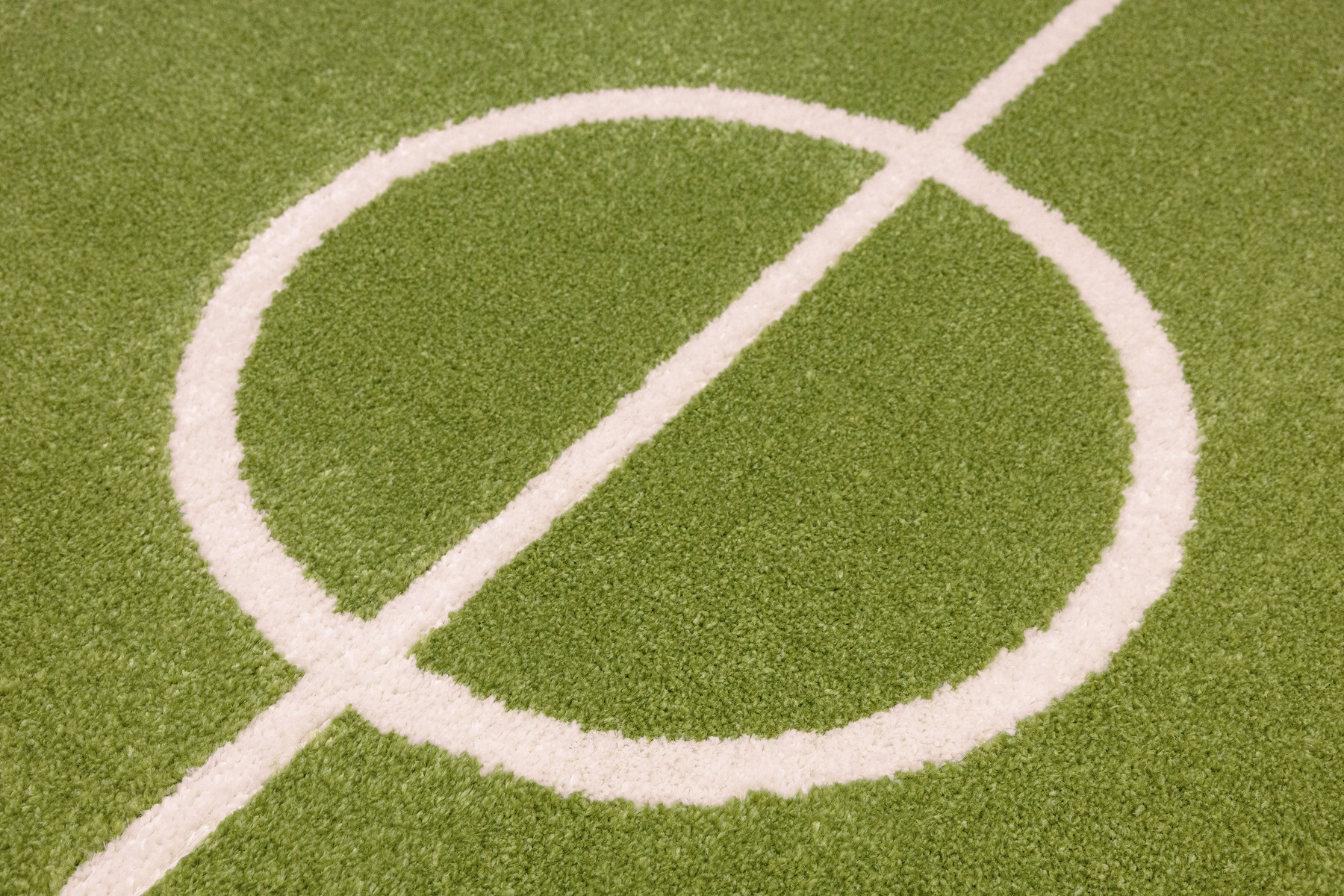 - Dziecięcy dywan Clara Kids o mięciutkim runie ze wzorem boiska do piłki nożnej w odcieniach żywej zieleni i kremu i spodem wykończonym jutą.