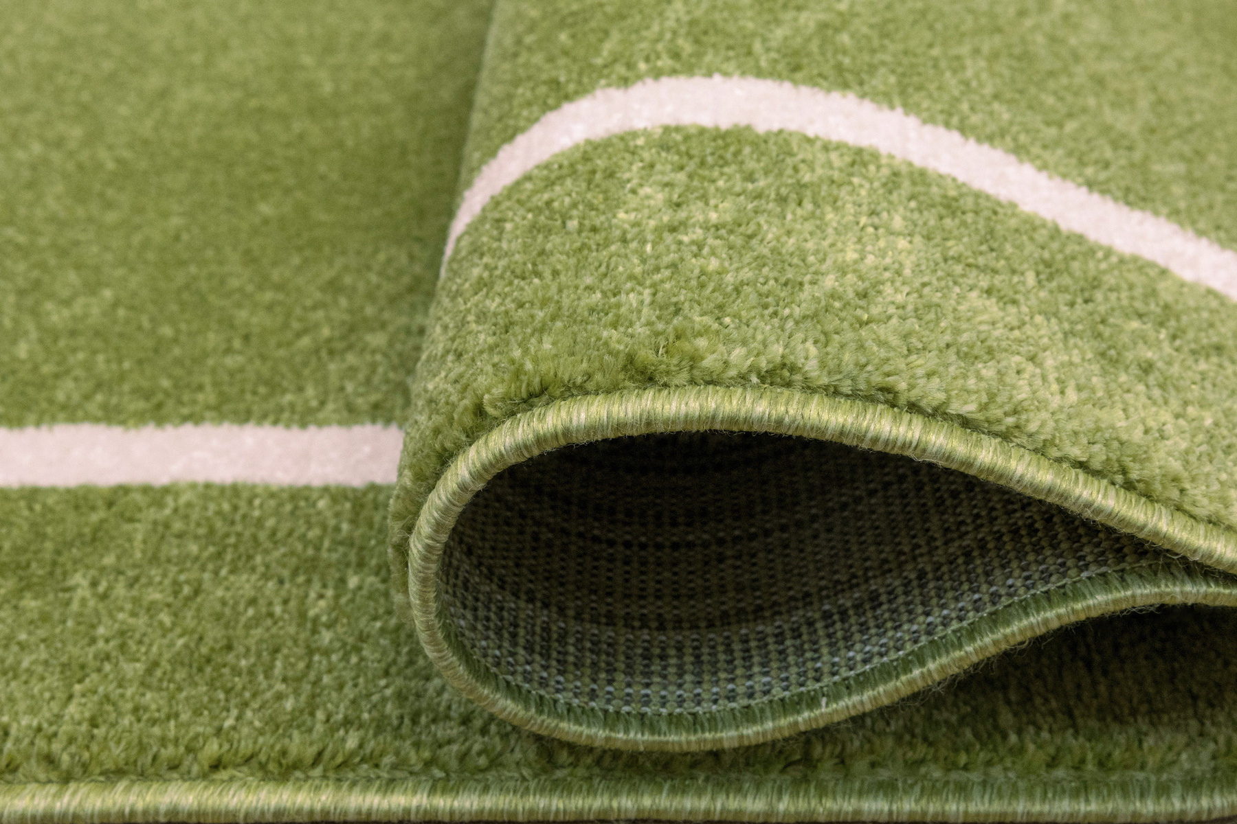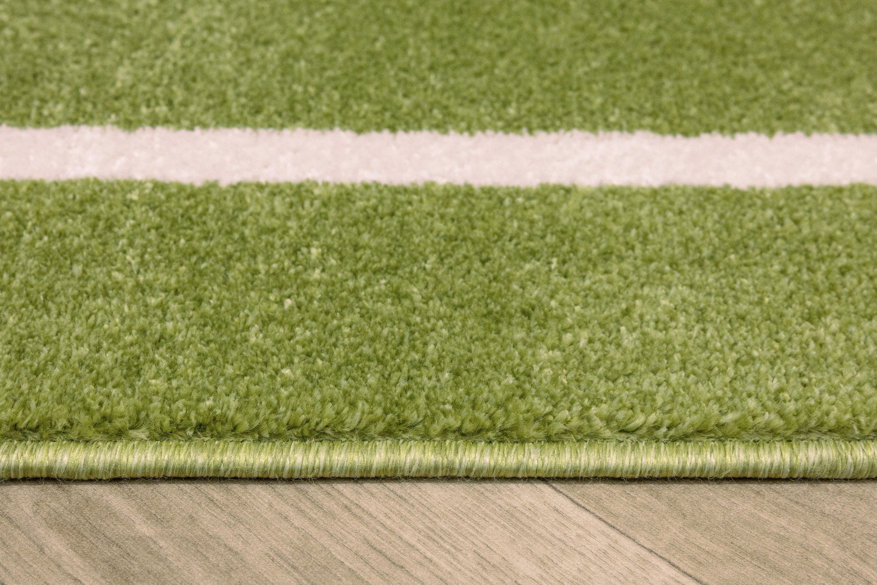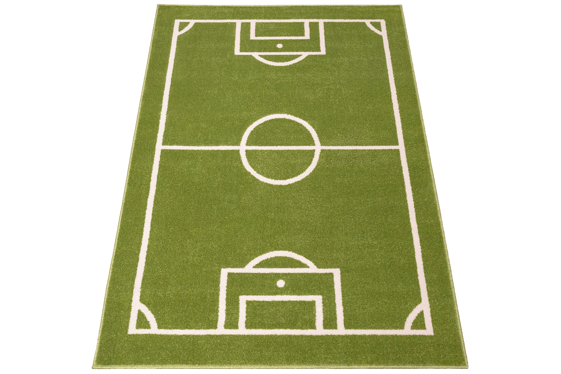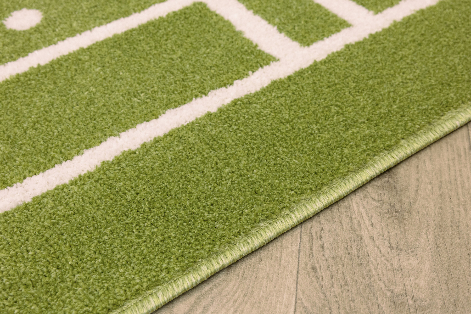 - Dziecięcy dywan Clara Kids o mięciutkim runie ze wzorem boiska do piłki nożnej w odcieniach żywej zieleni i kremu i spodem wykończonym jutą.