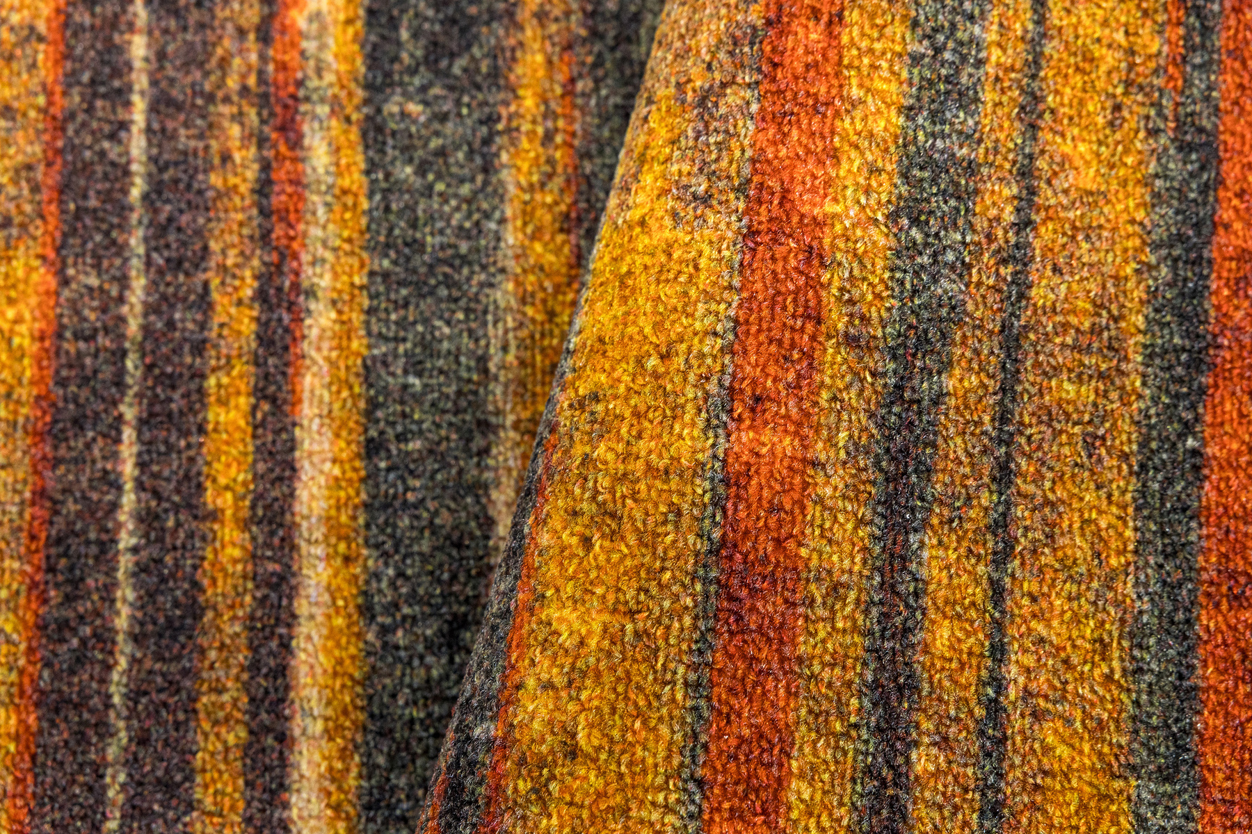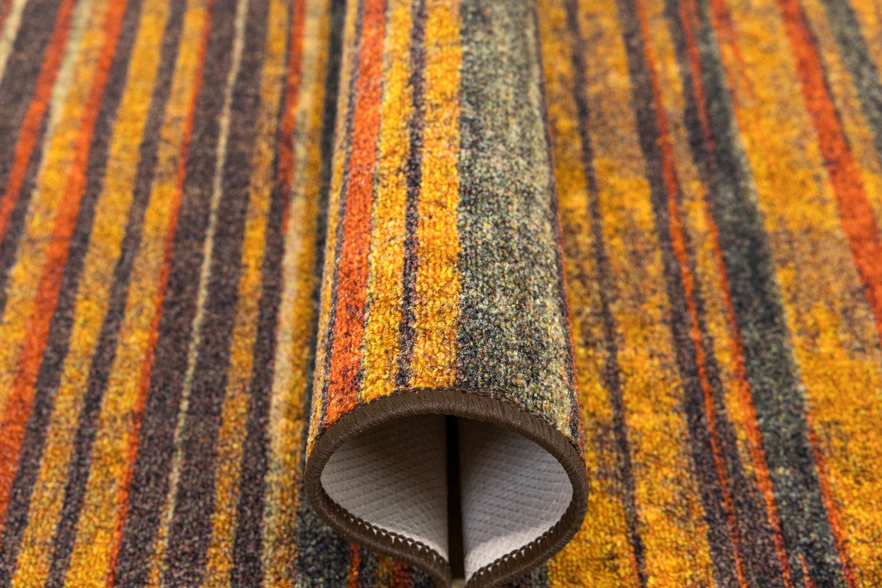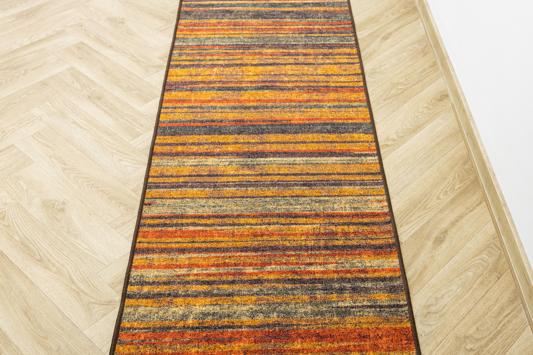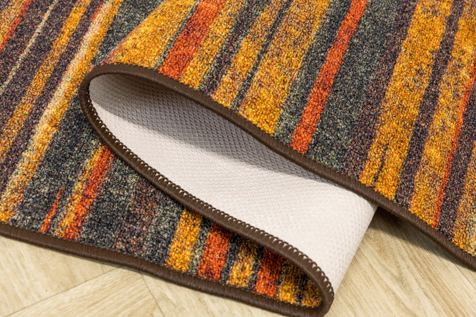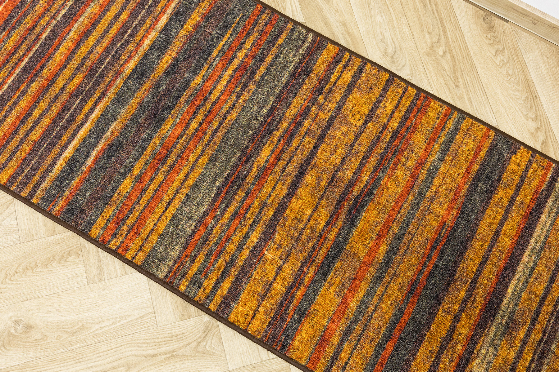 - Chodnik antypoślizgowy Fusion z niskim pętelkowym poliamidowym runem o wzorze w pasy w odcieniach szarościach, pomarańczowego z akcentami kremu i żółtego oraz podgumowanym spodem.